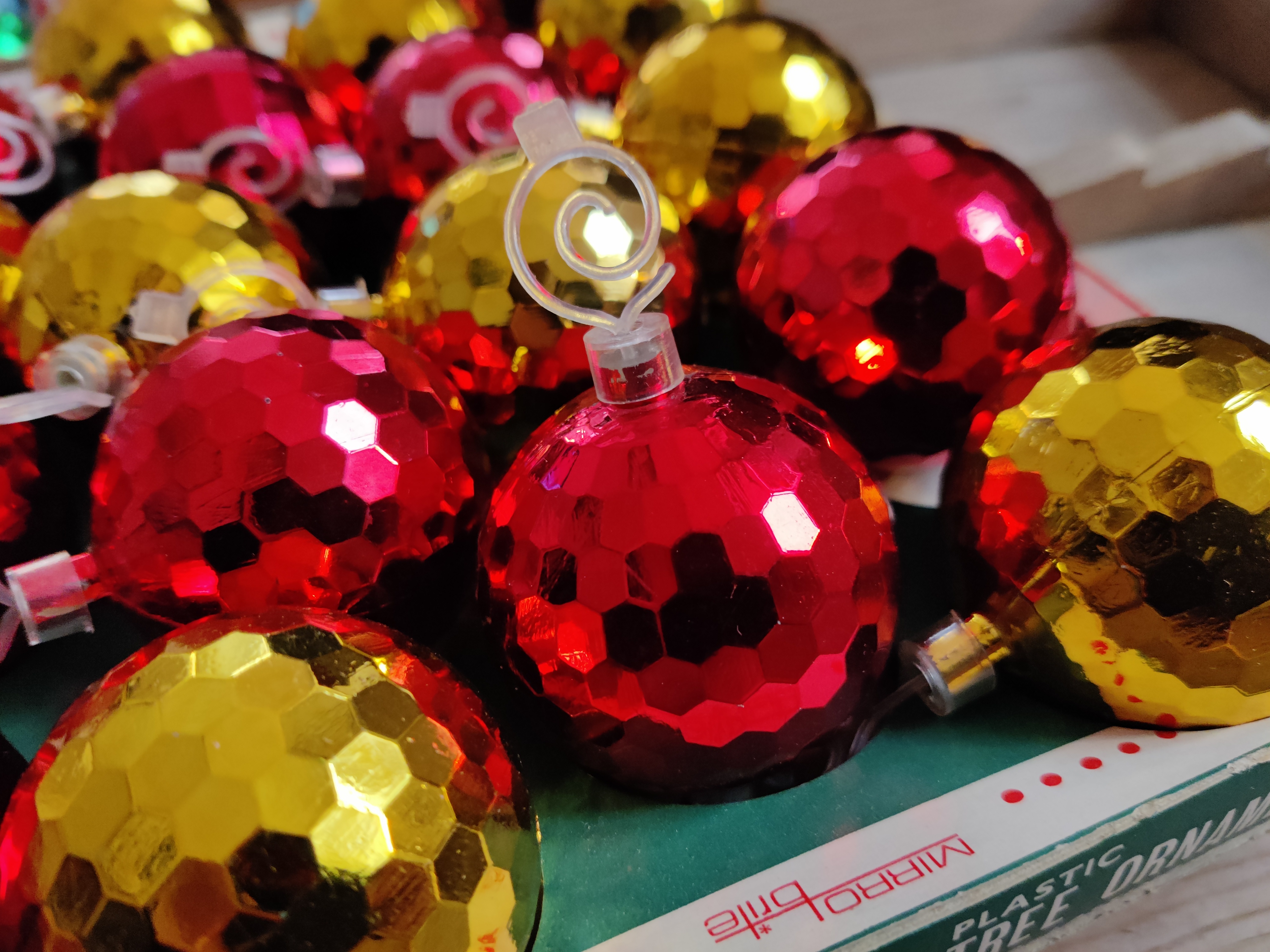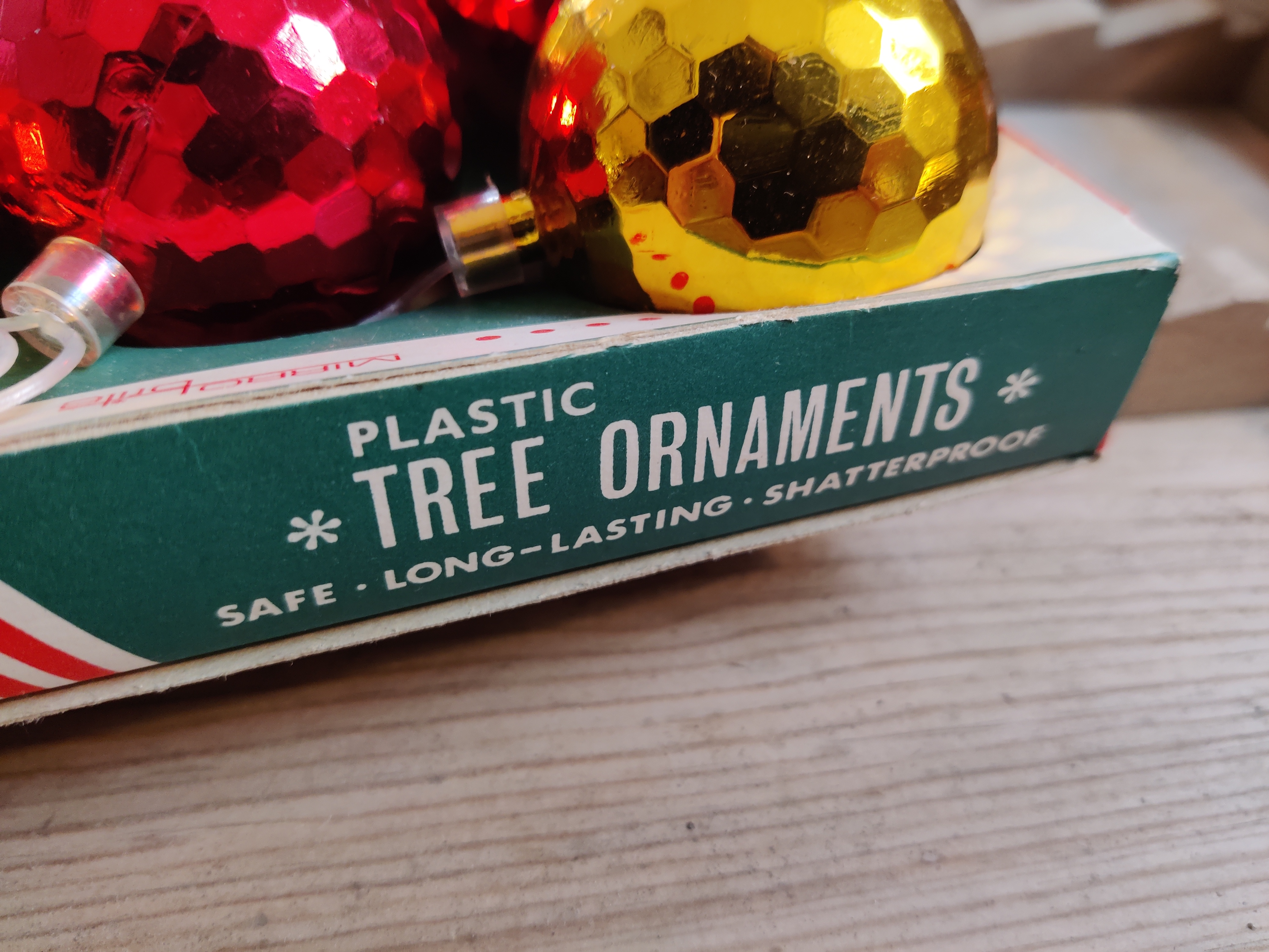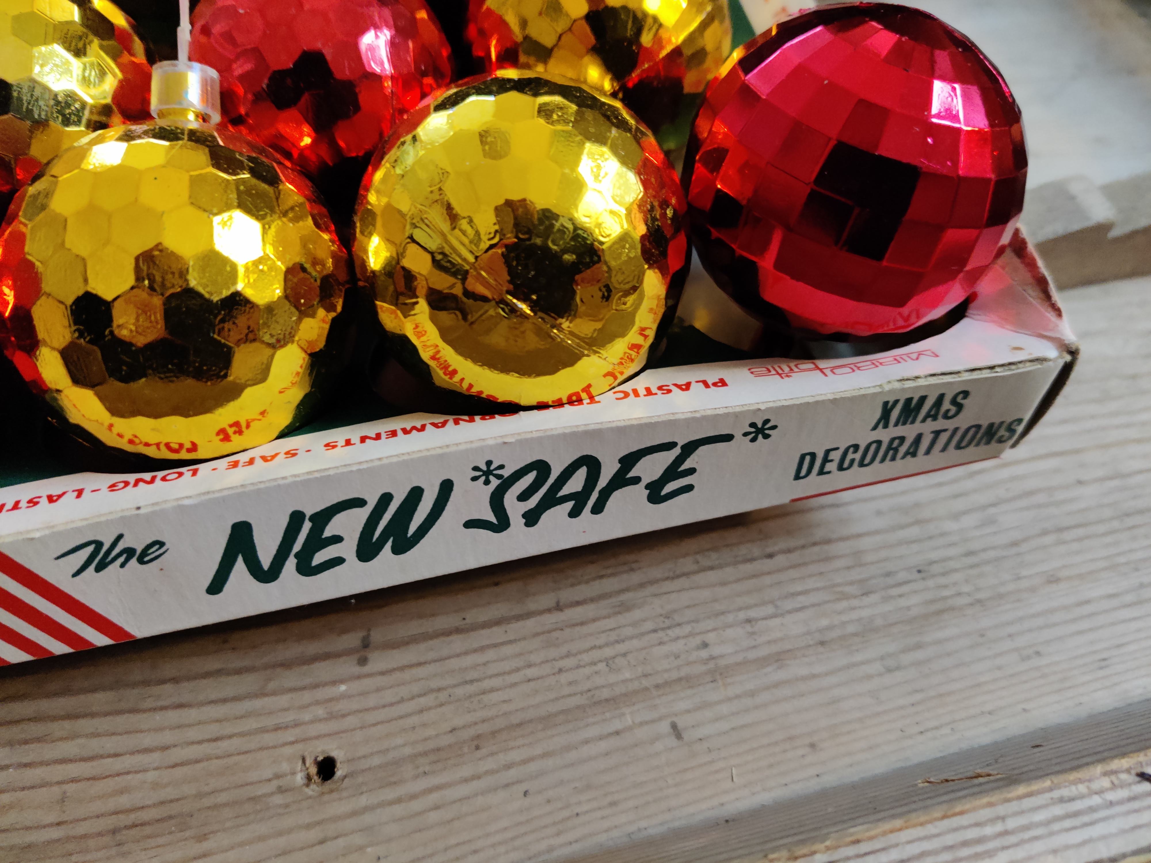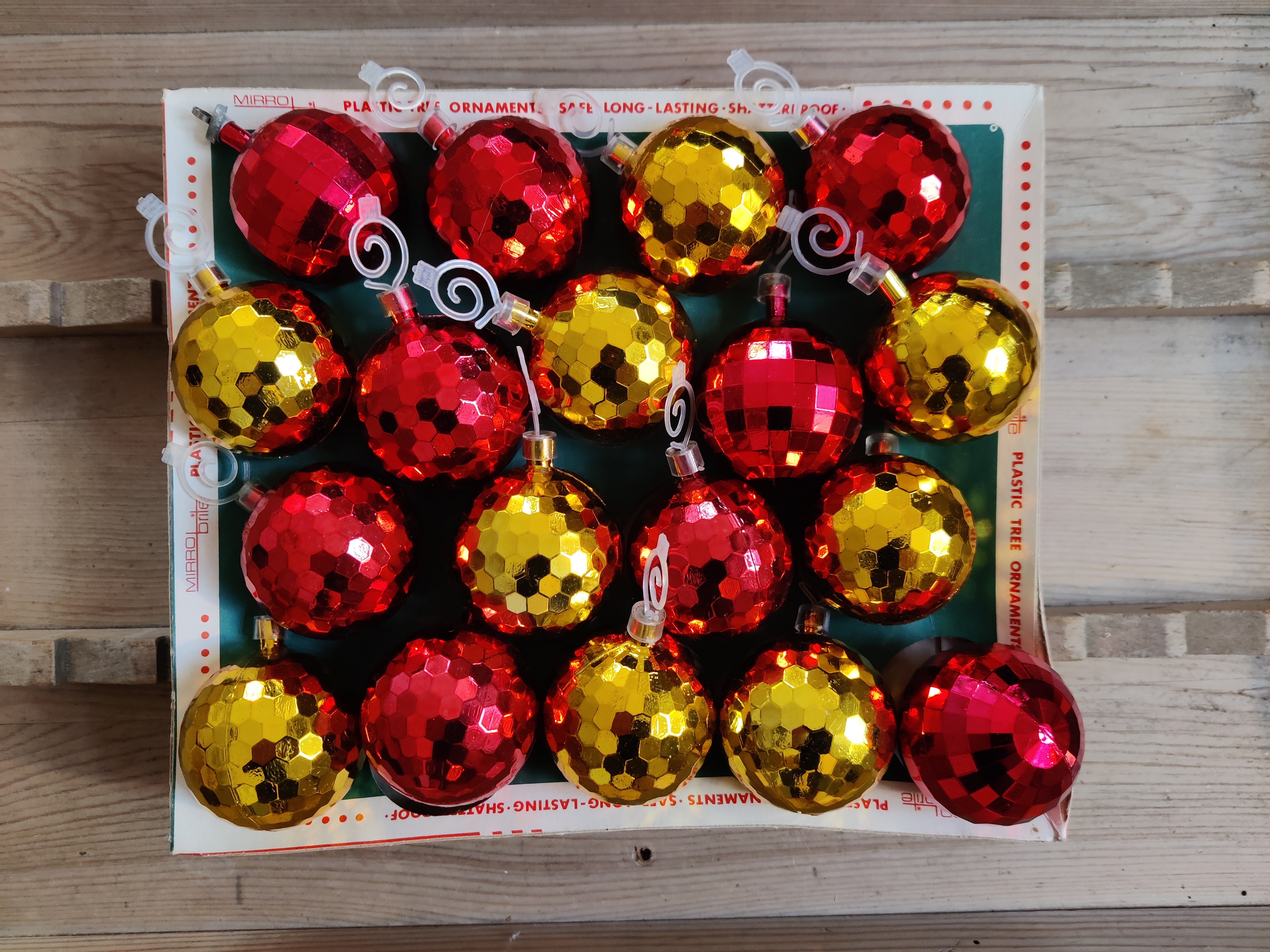 Engelsk æske med 18 glade plastik-disko-julekugler i guld og rød. 2 stk har ikke original holder og 3 stk har ikke samme mønster som de andre. Æsken er 25 x 22 cm og kuglerne er 5 cm.