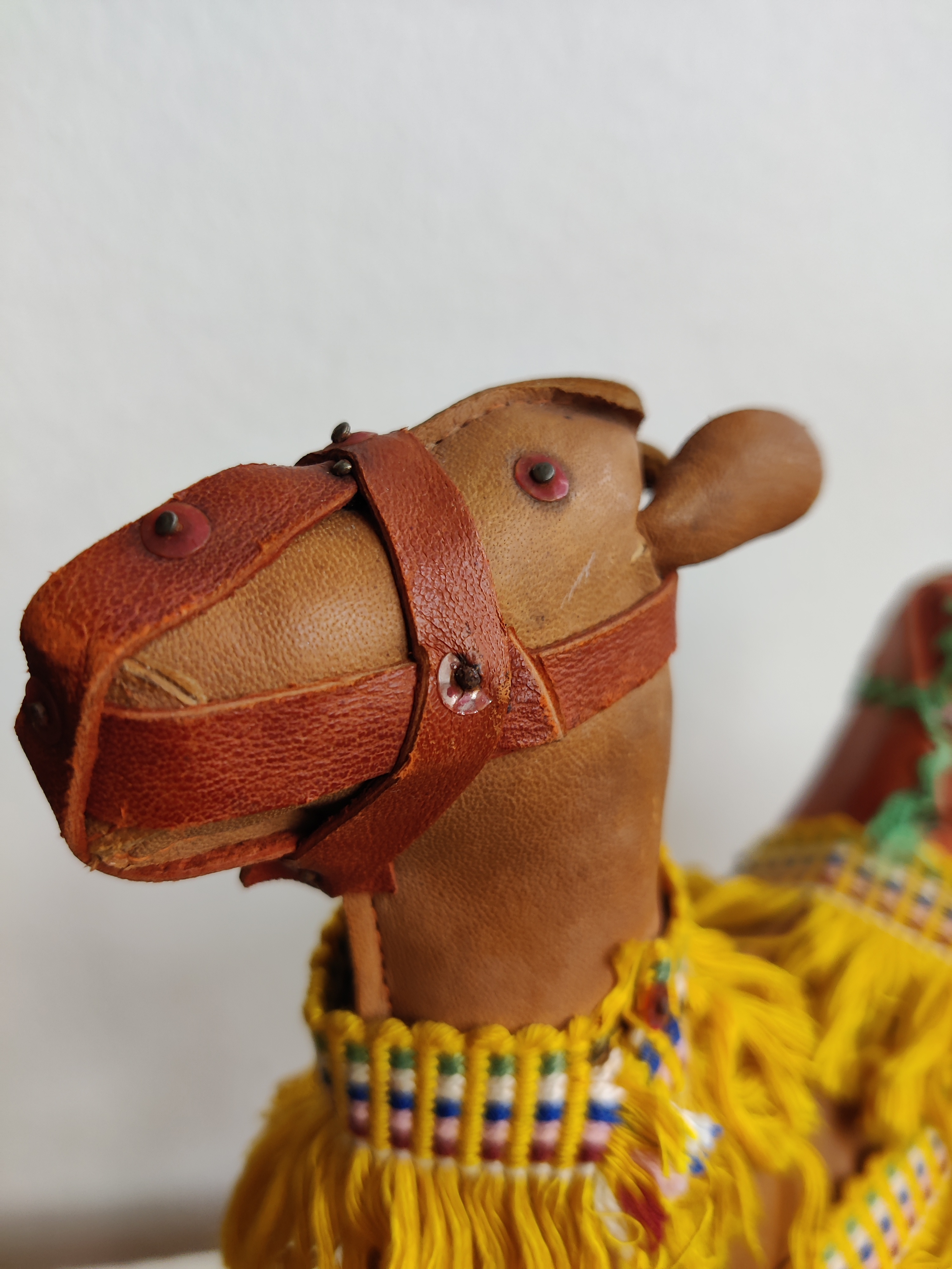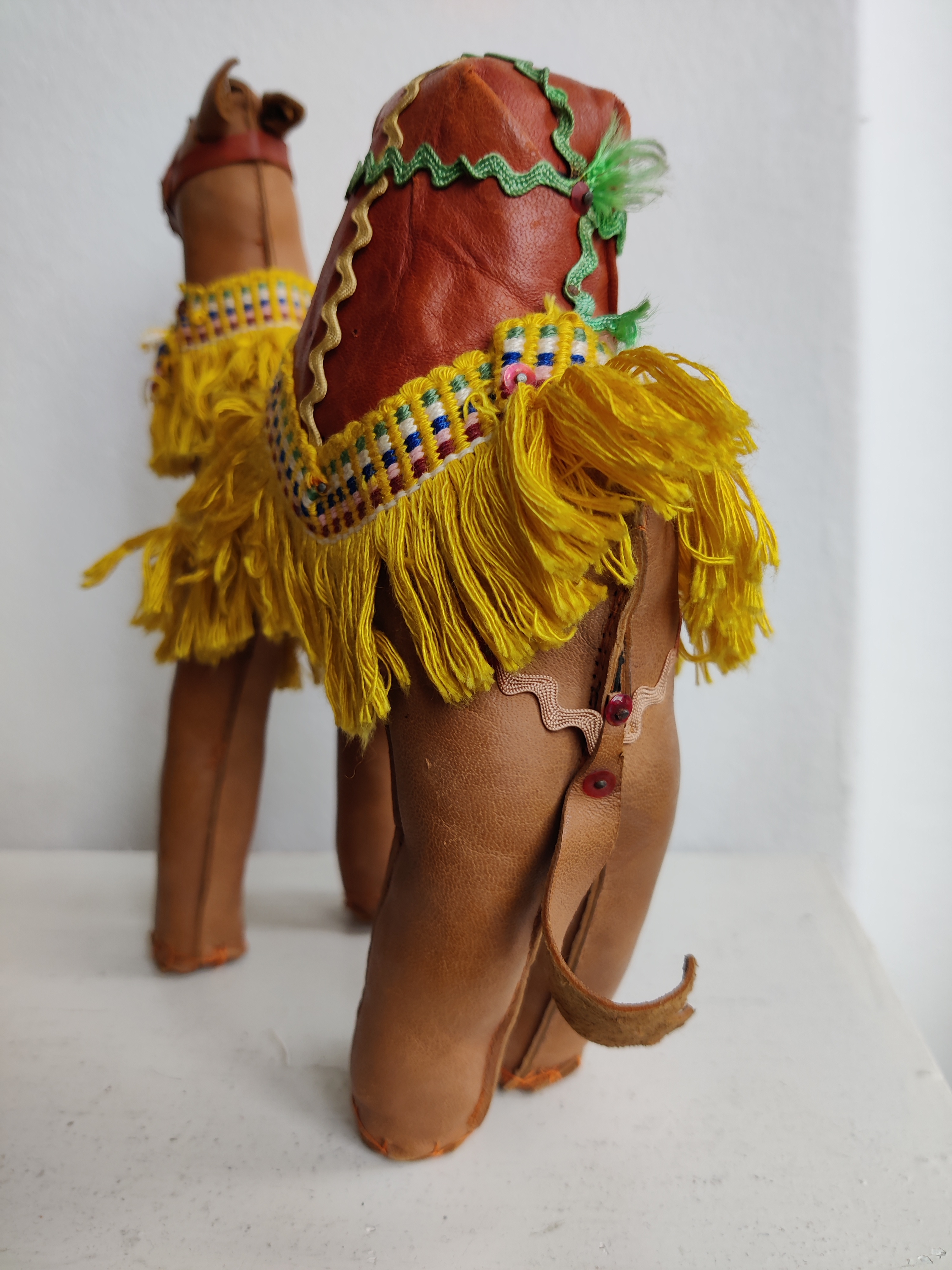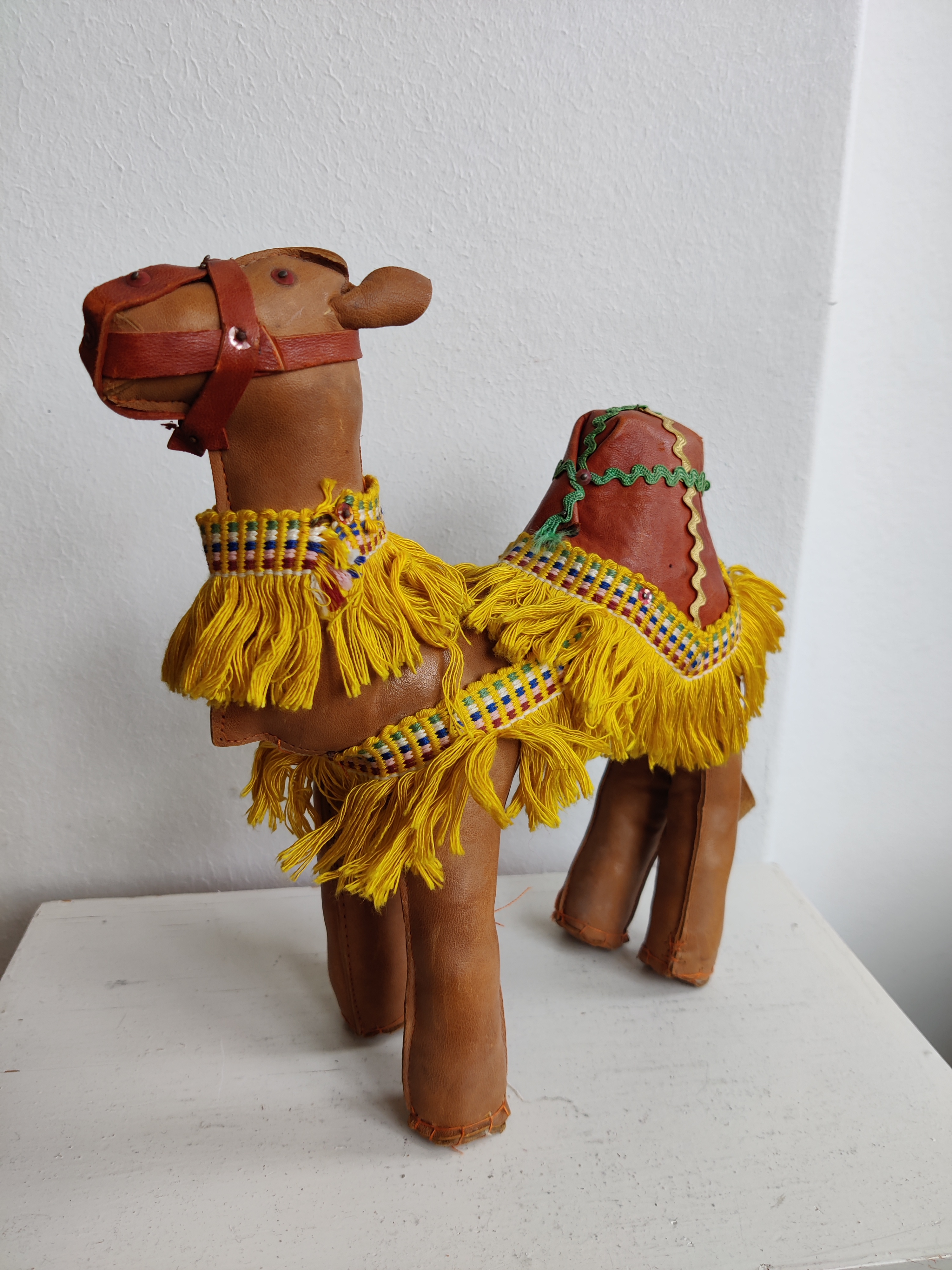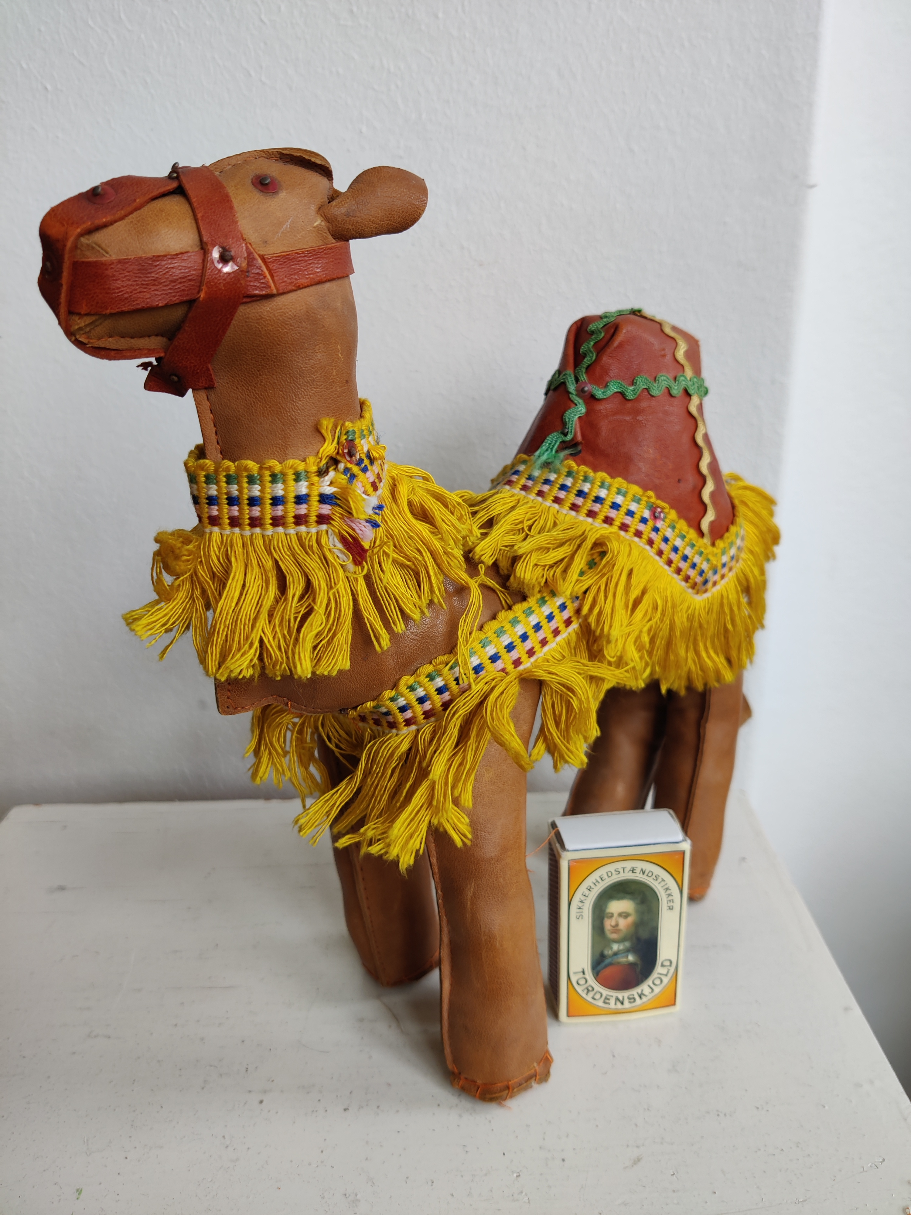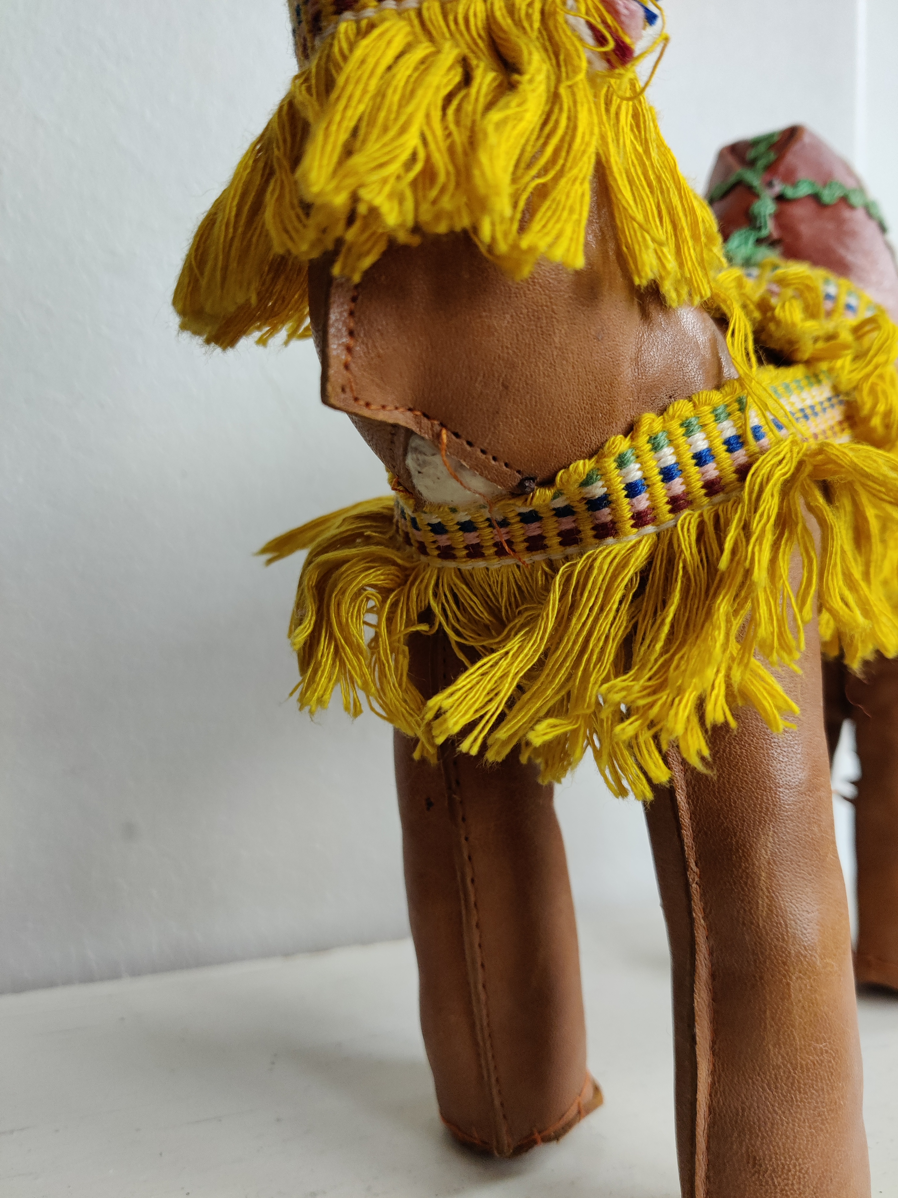 Sød, stor dromedar i læder og med frynser. Meget flot fyr. Brug ham til et hjemmelavet krybbespil eller bare som pynt eller legetøj. Mål ca 25 cm.