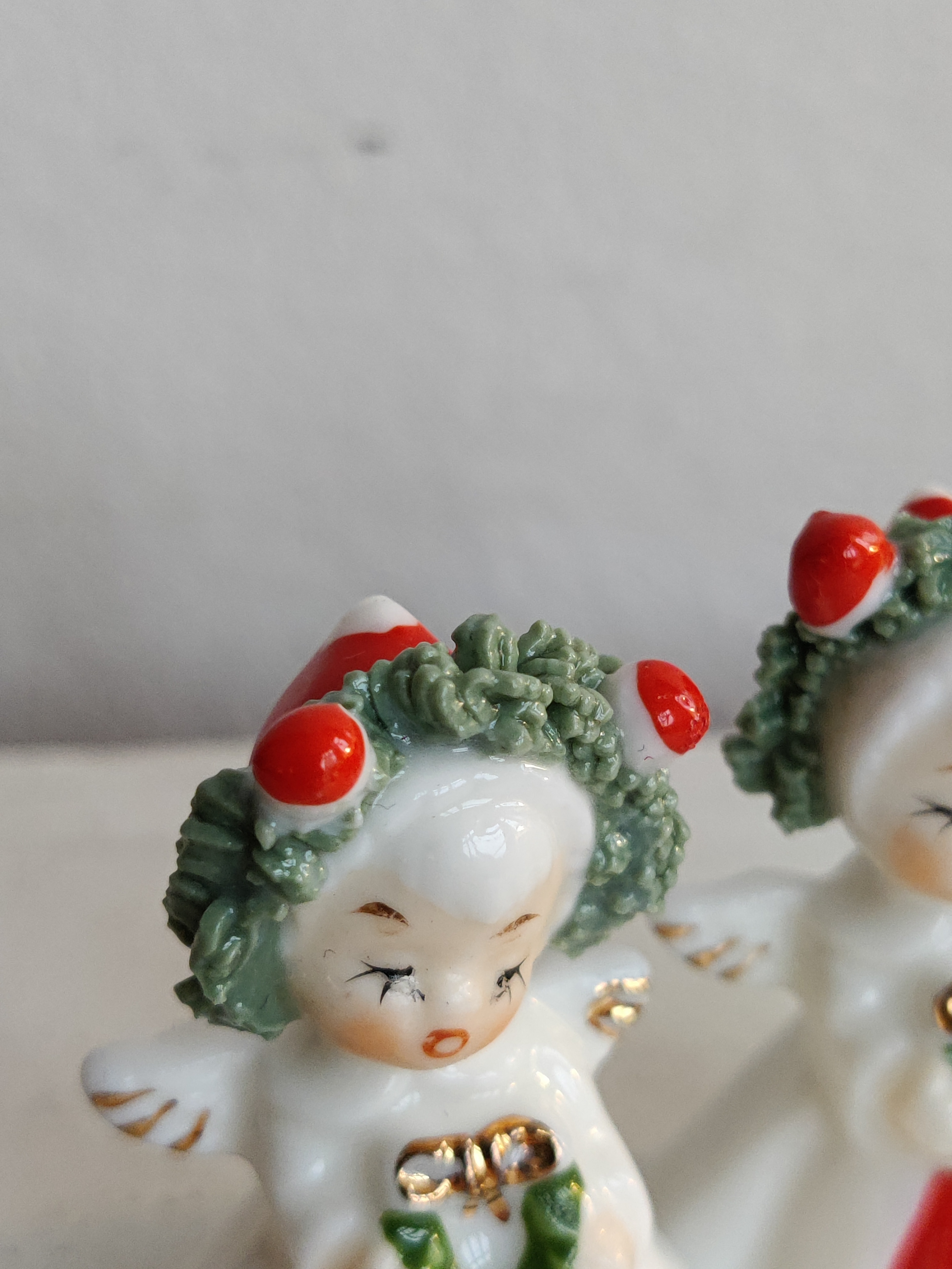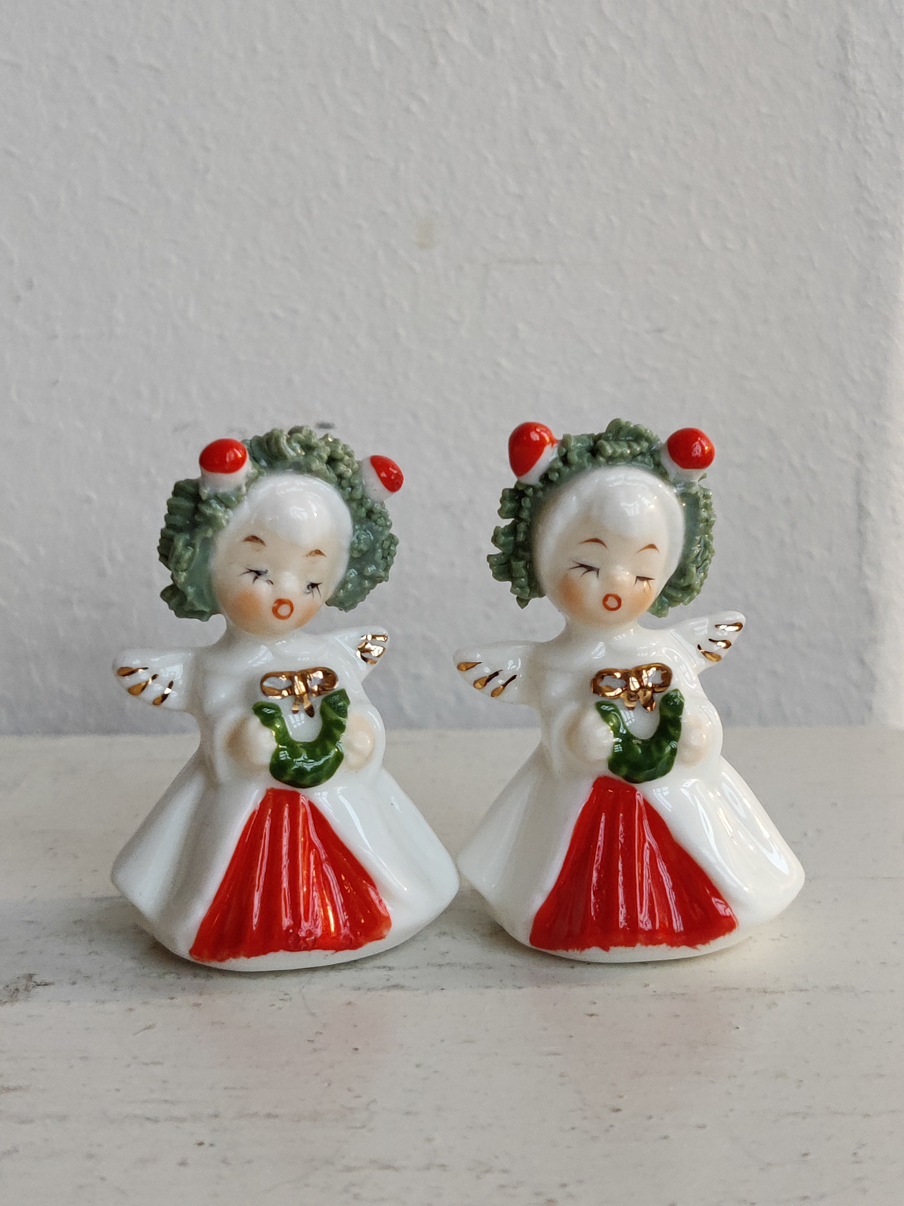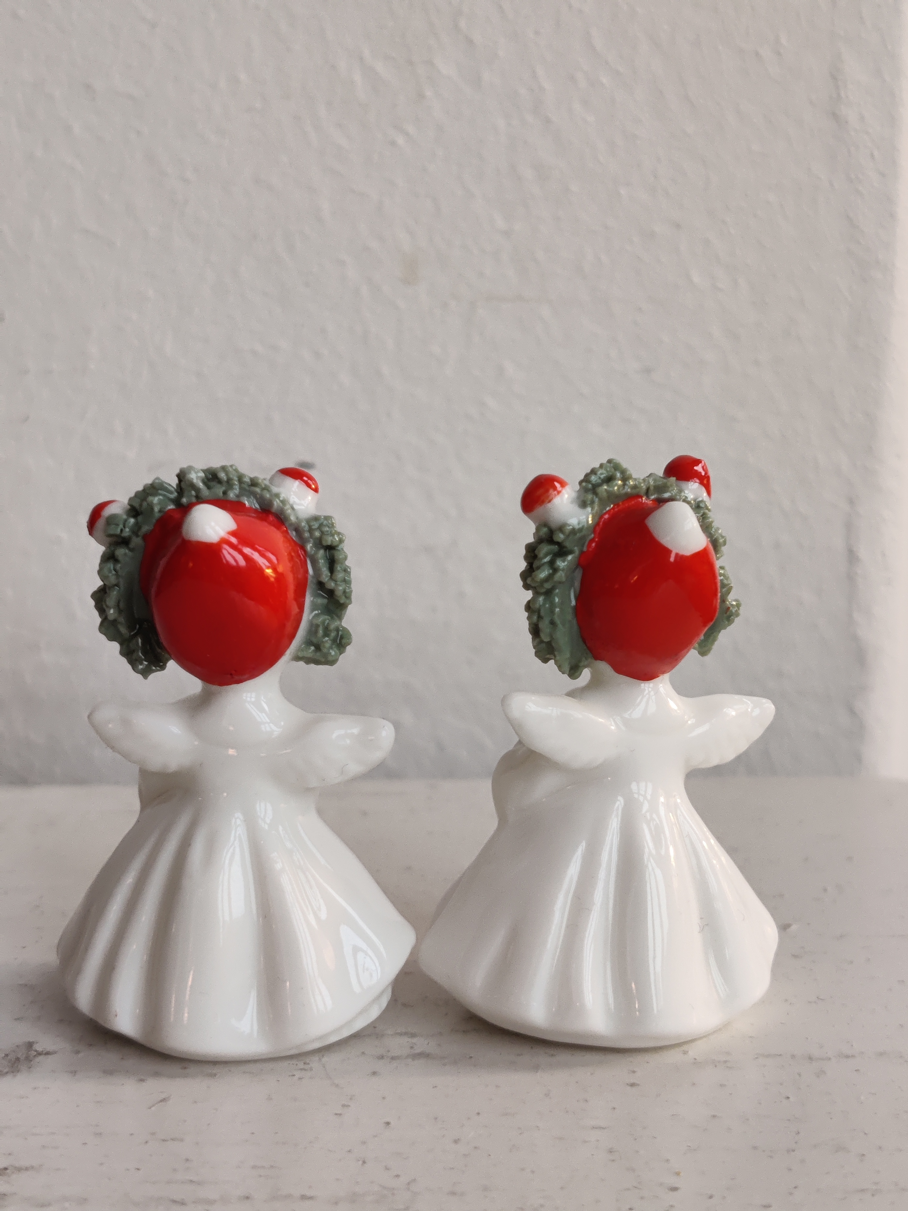 Et par søde porcelænsengle fra amerikanske Napco, der i 1950'erne og 1960'erne importerede figurer og pynt fra Japan til det sultne marked for nuttede ting. De er intakte og så fint detaljerede. Mål 5 x 3 cm.