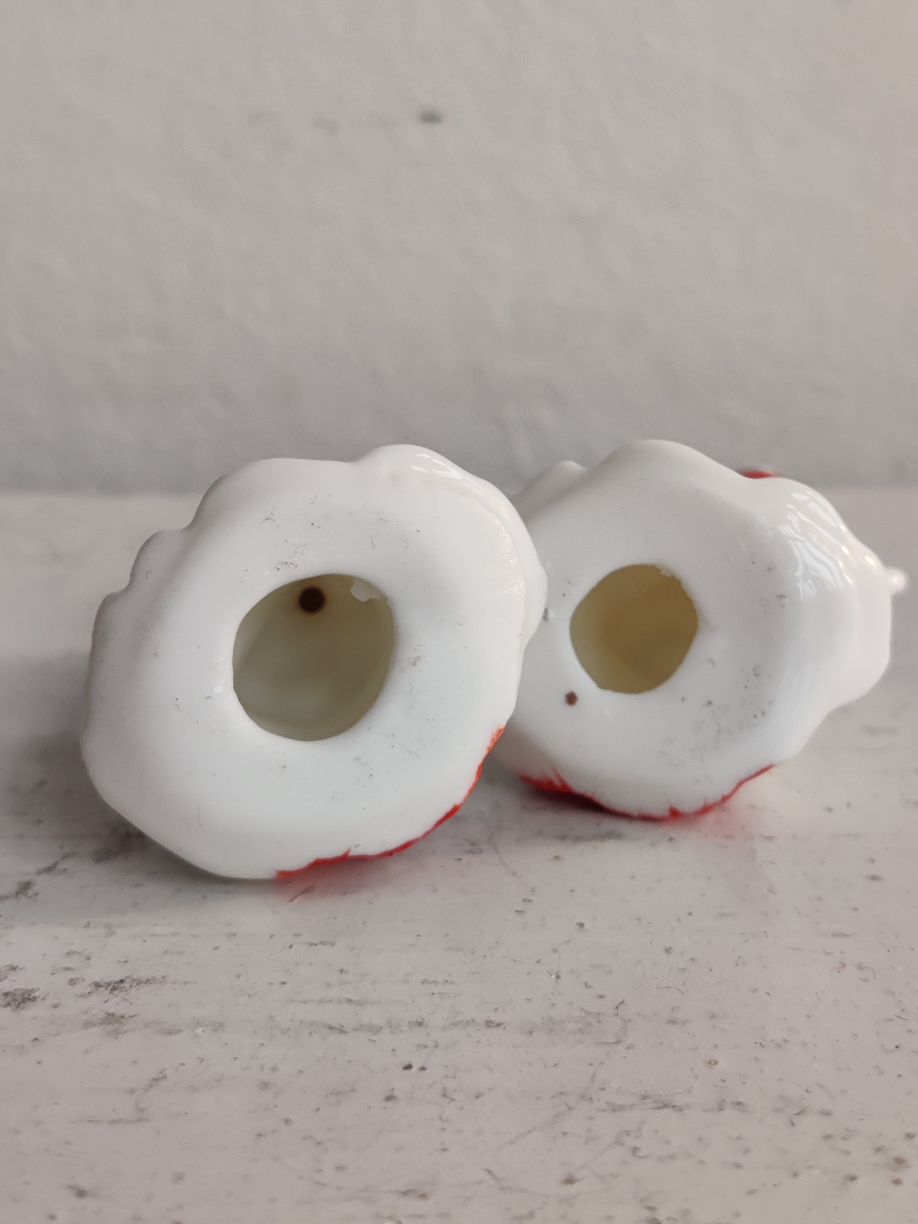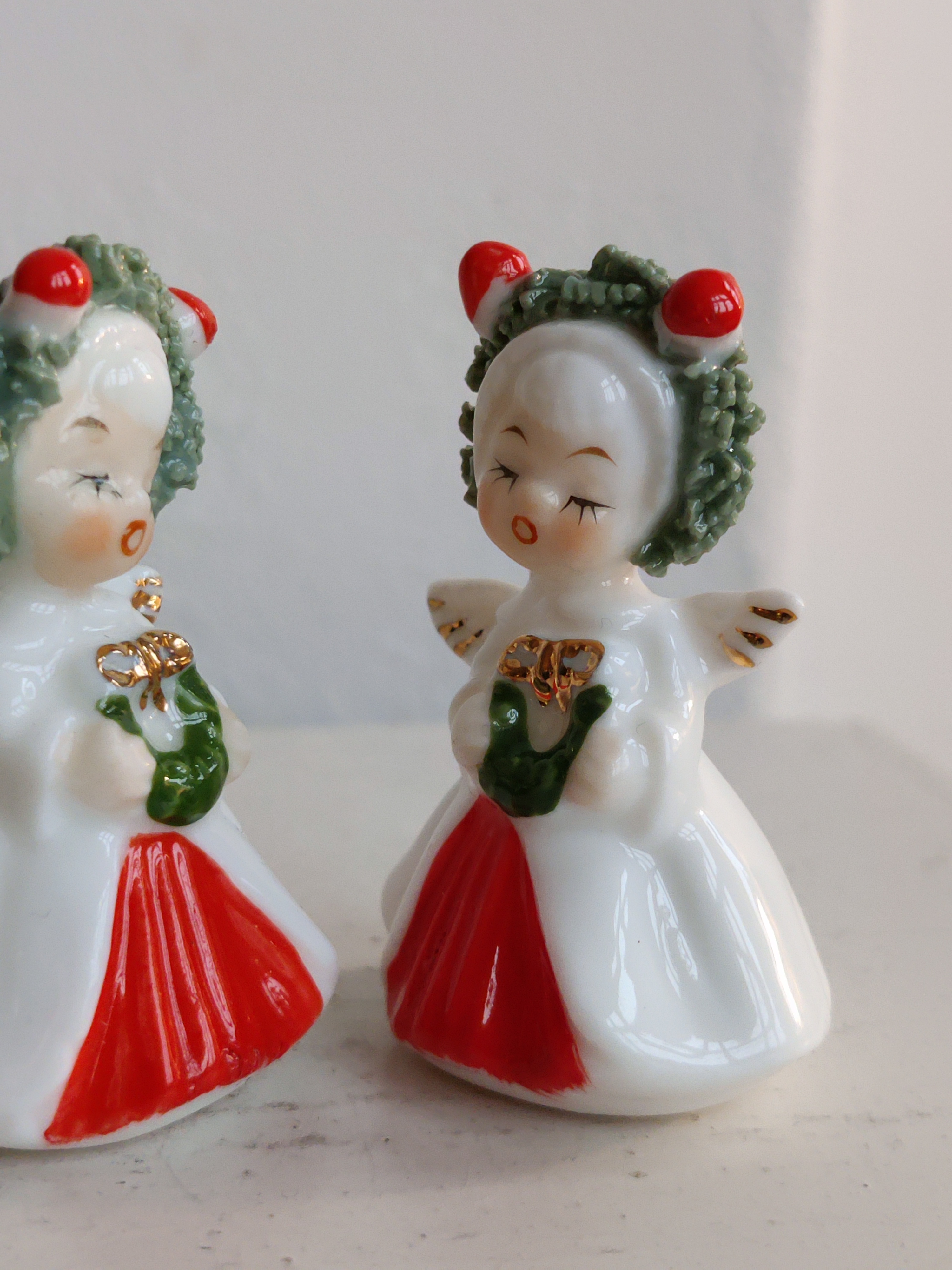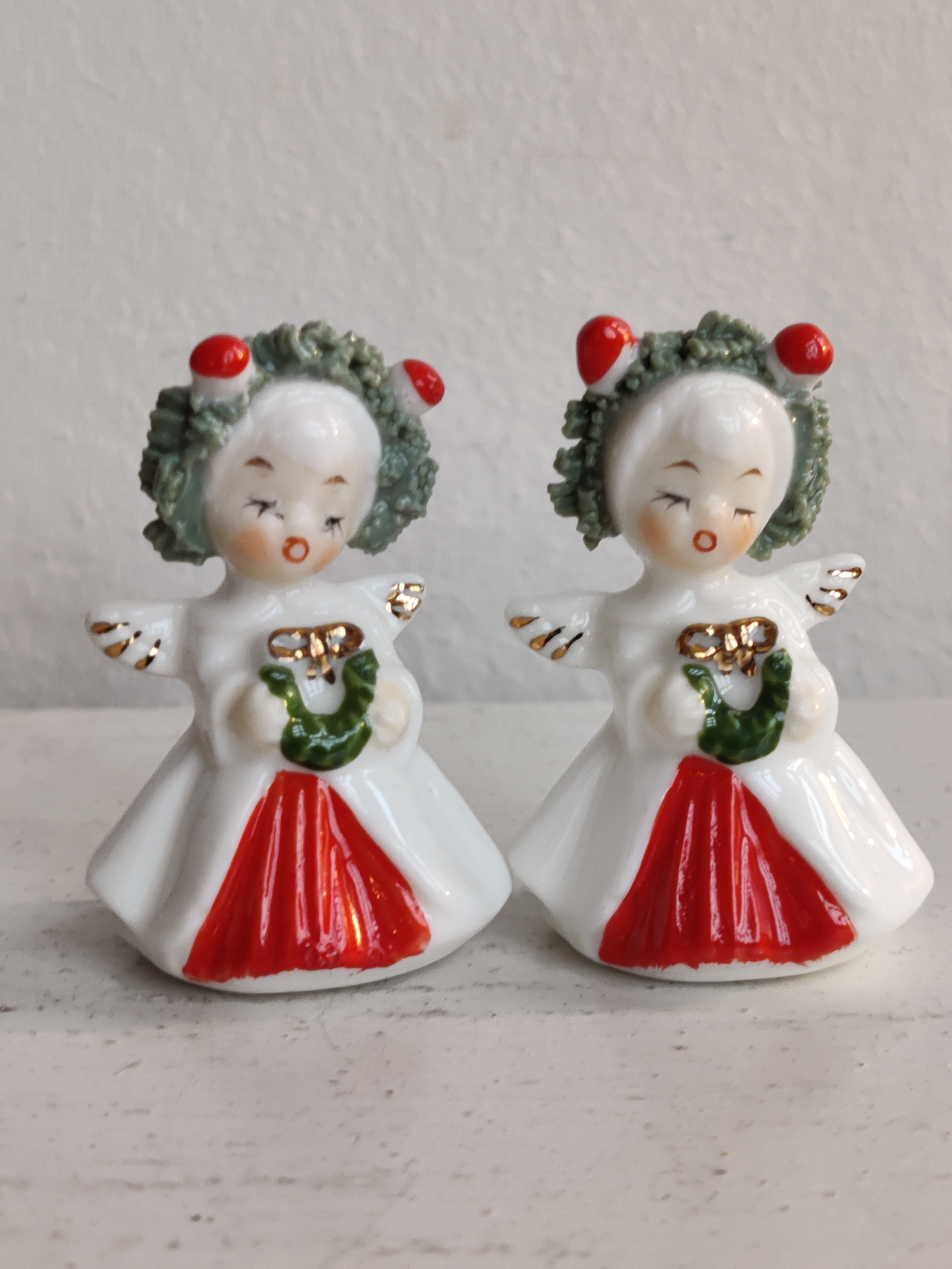 Et par søde porcelænsengle fra amerikanske Napco, der i 1950'erne og 1960'erne importerede figurer og pynt fra Japan til det sultne marked for nuttede ting. De er intakte og så fint detaljerede. Mål 5 x 3 cm.
