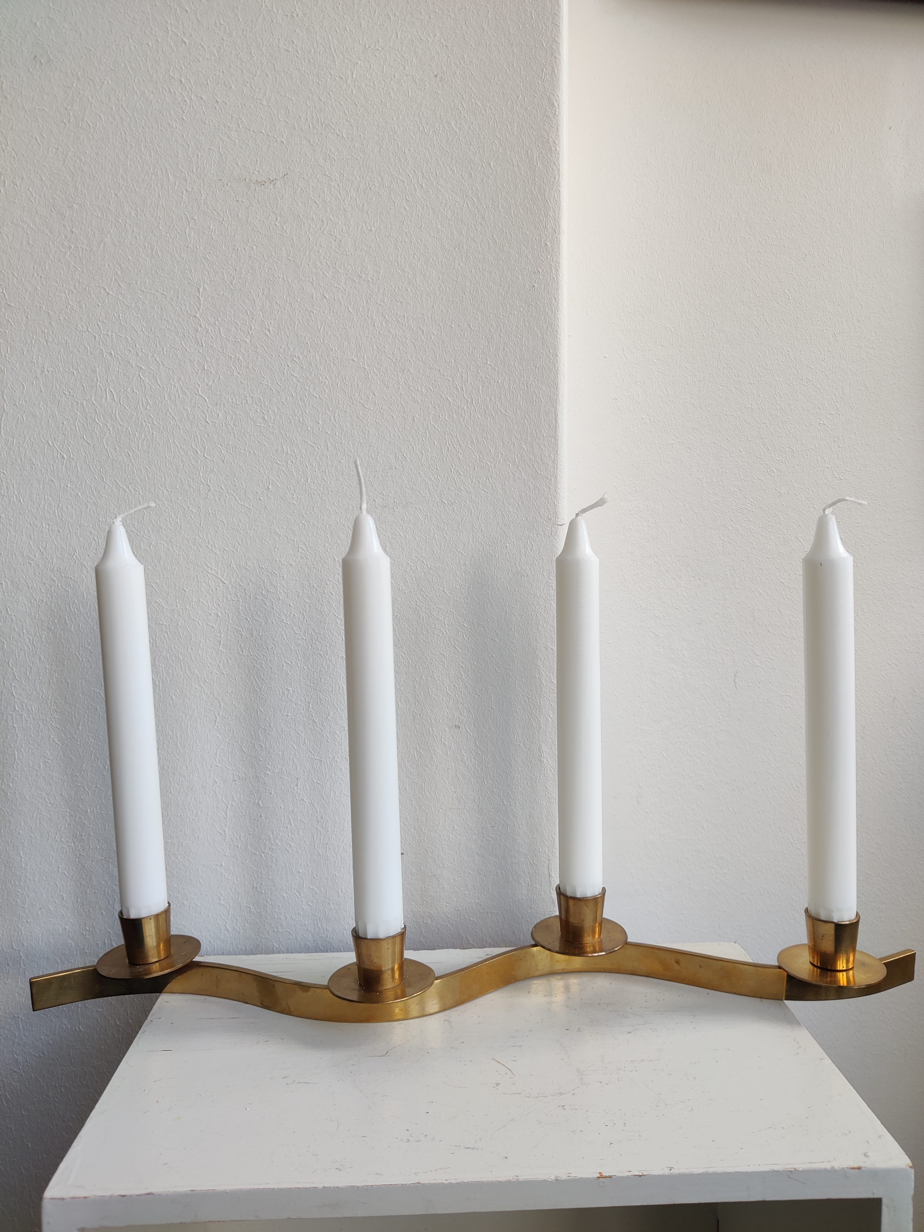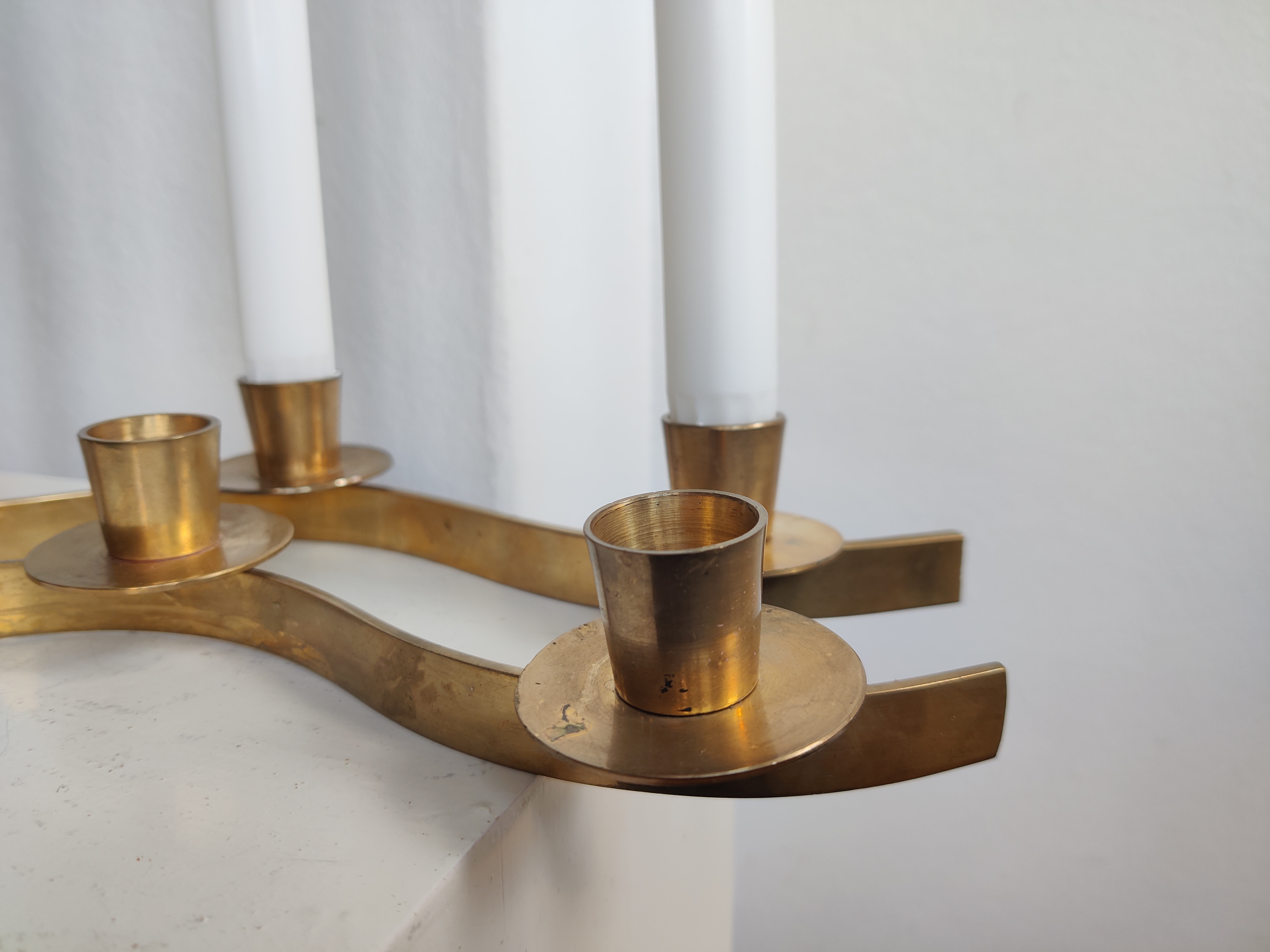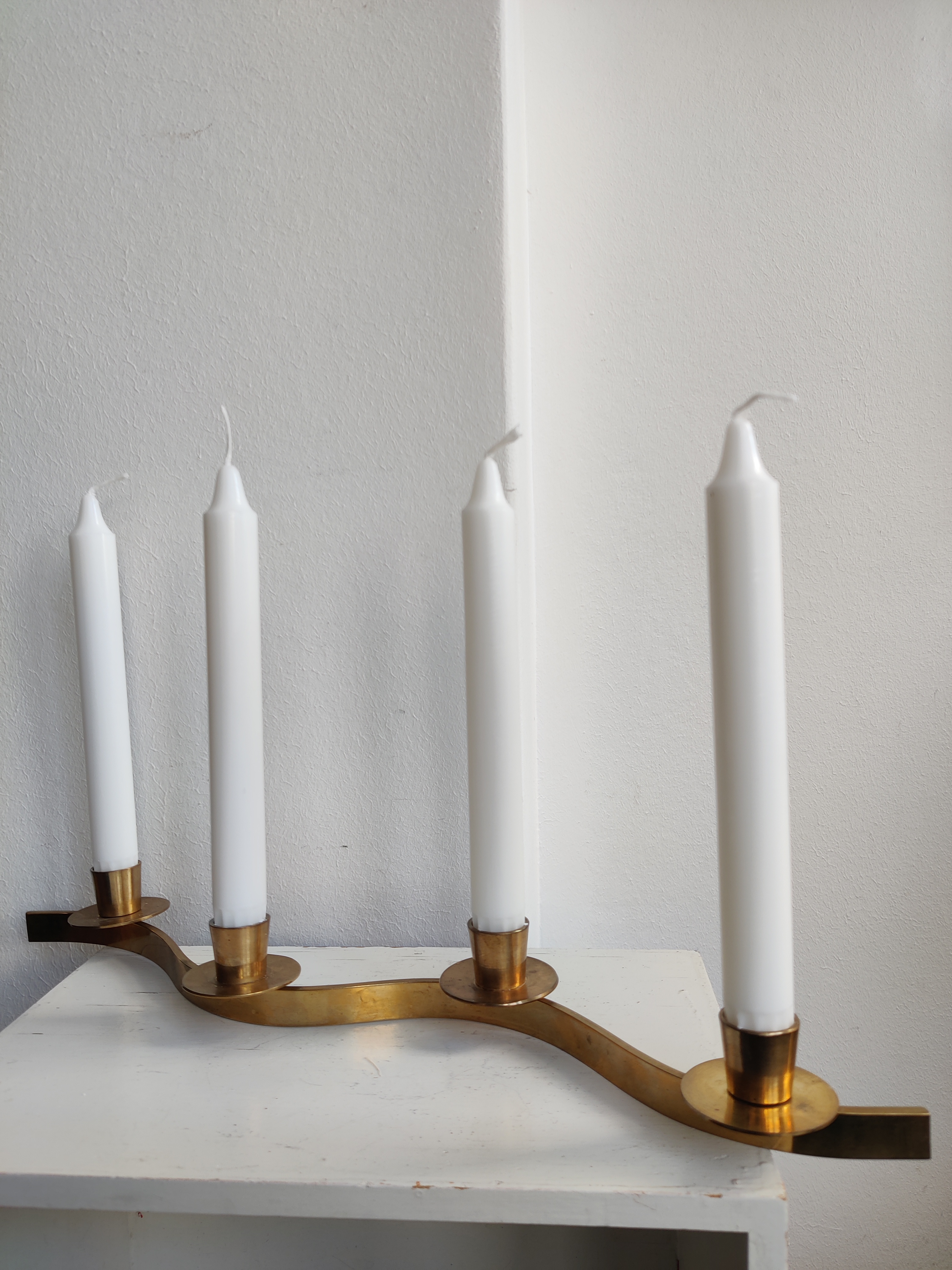 Smukke messingstager der slanger sig hen over bordet. Brug dem som adventsstager eller sæt dem i forlængelse af hinanden midt på julebordet. Passer til kronelys. Mål 42 cm. Pris pr stk.