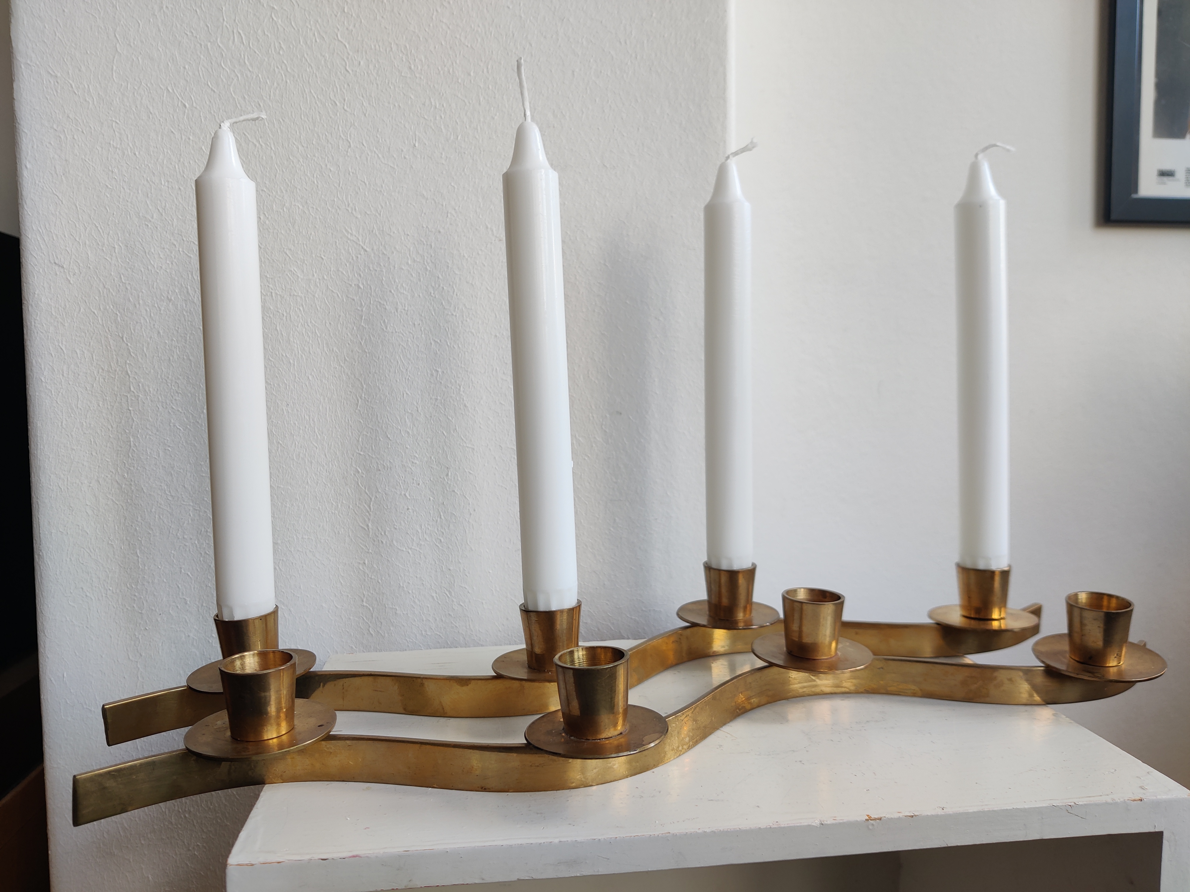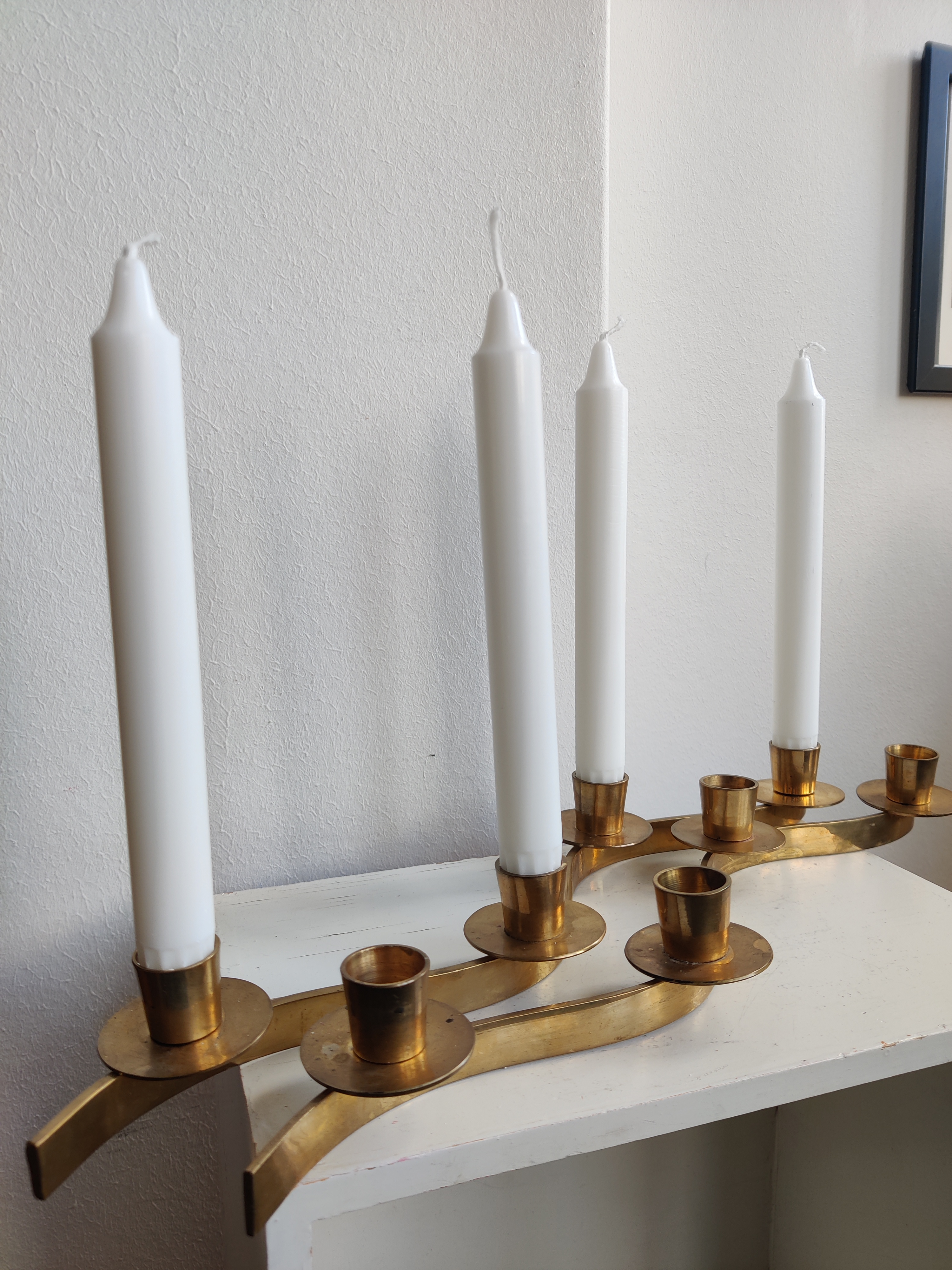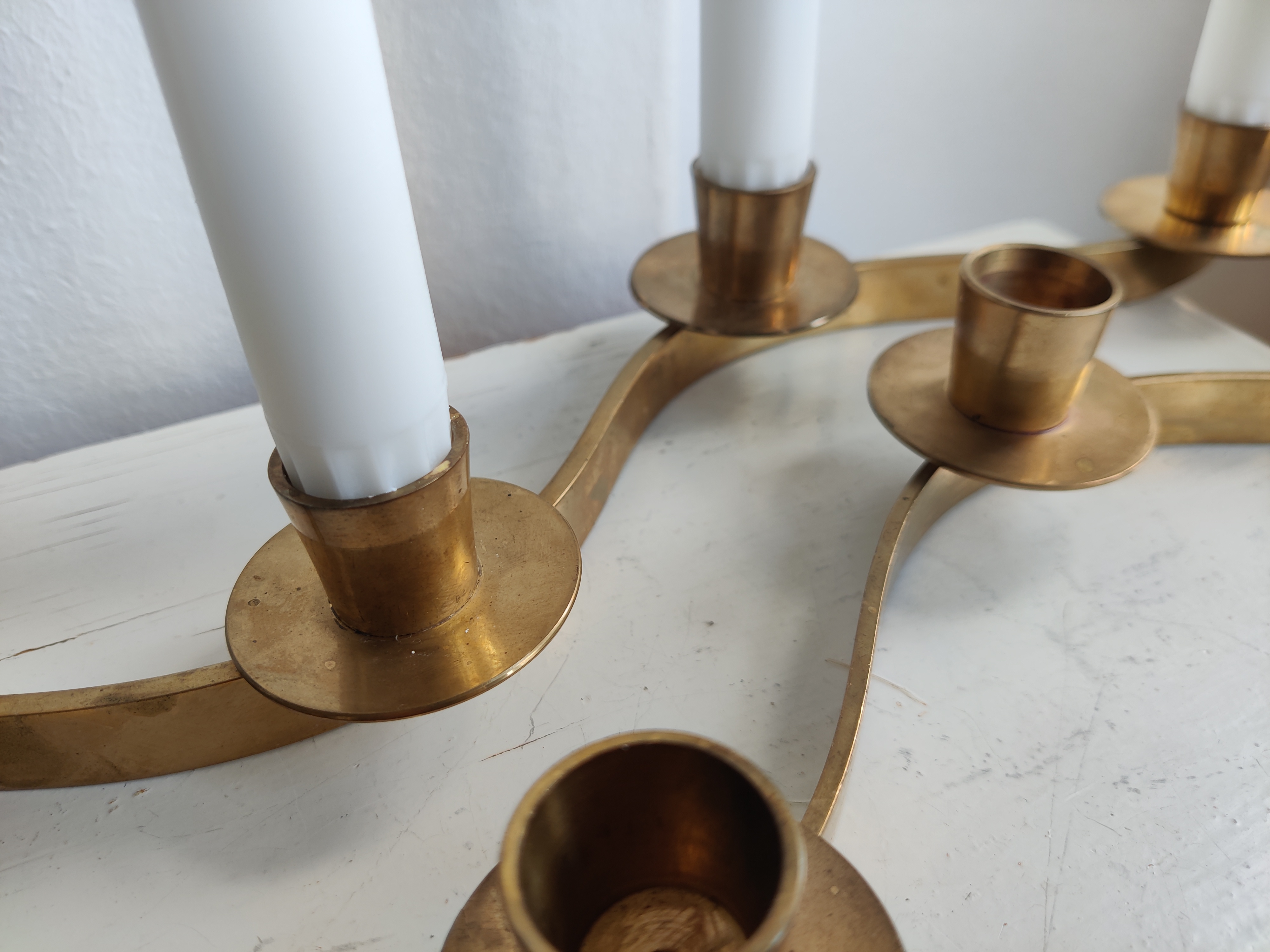 Smukke messingstager der slanger sig hen over bordet. Brug dem som adventsstager eller sæt dem i forlængelse af hinanden midt på julebordet. Passer til kronelys. Mål 42 cm. Pris pr stk.