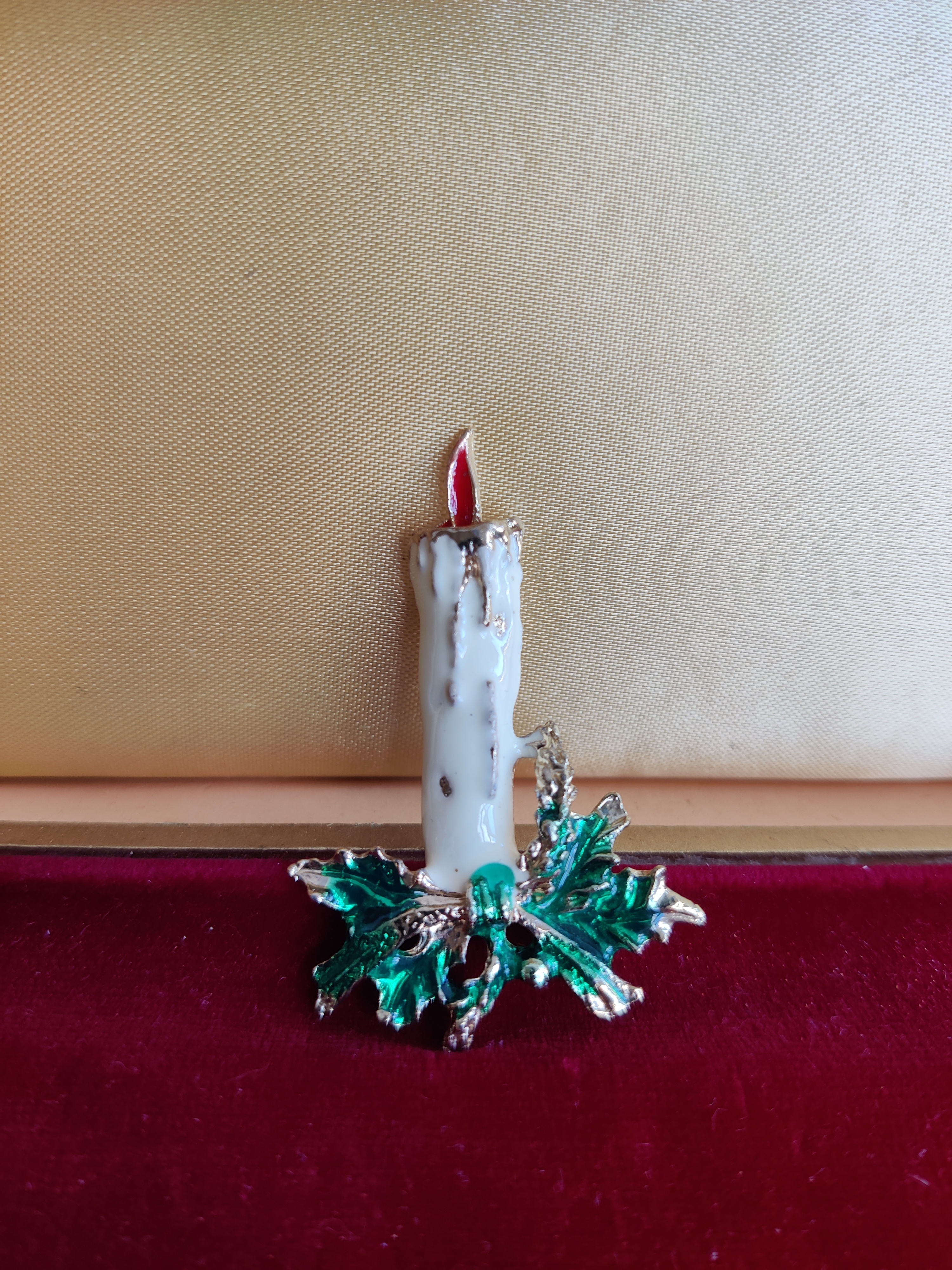 Fineste julebroche med et tændt lys i mørket. Mål 5 x 3 cm.