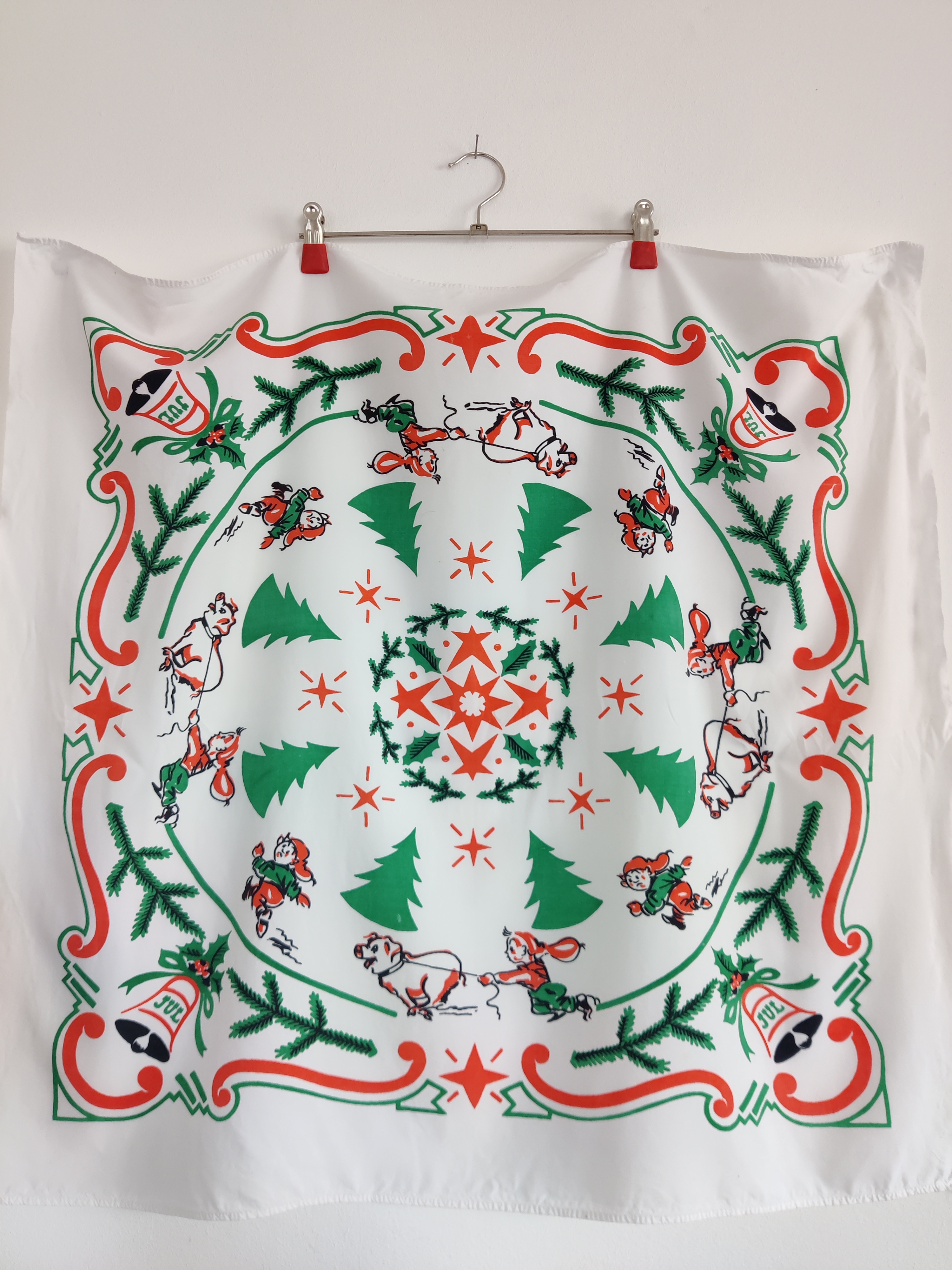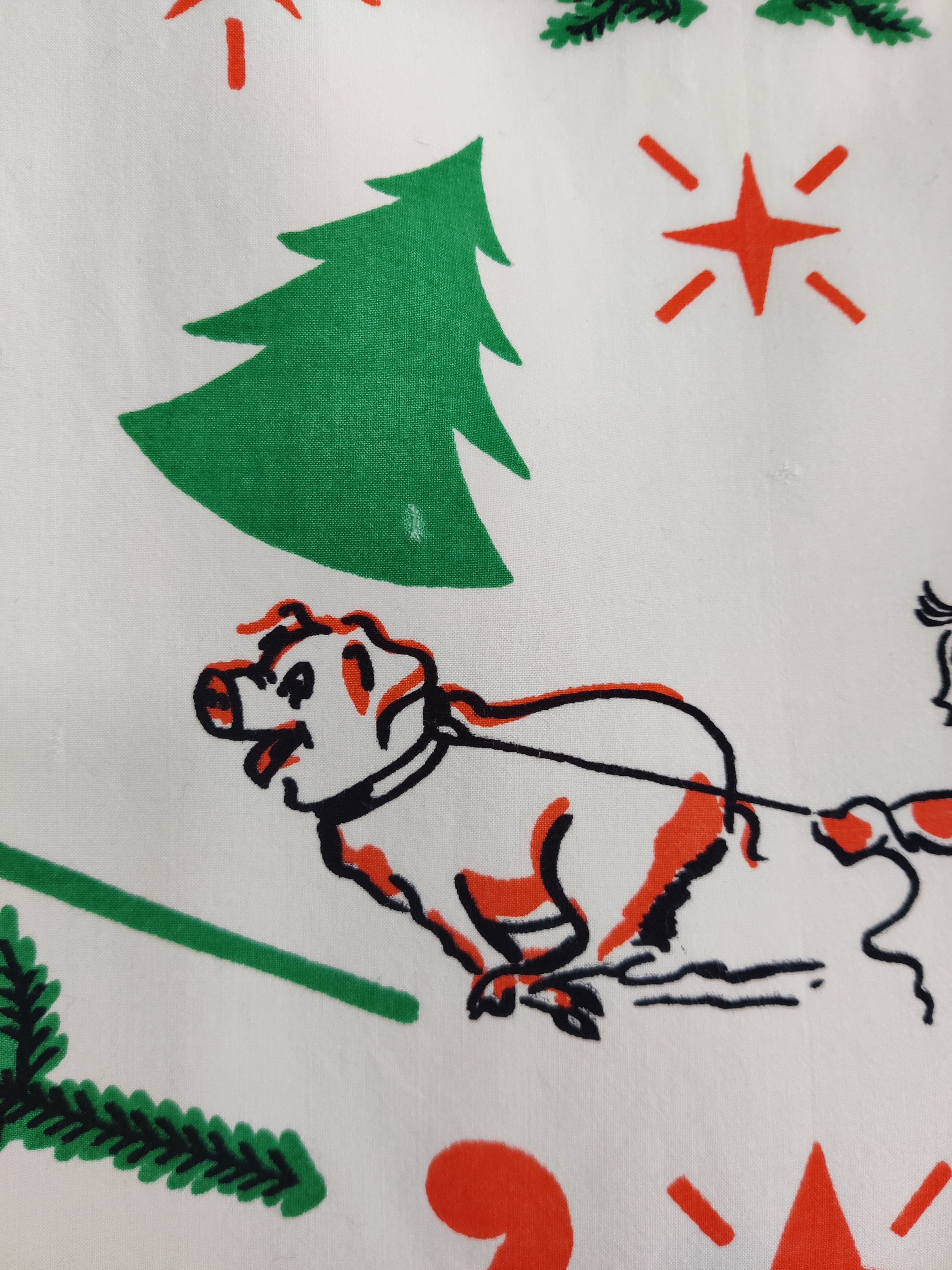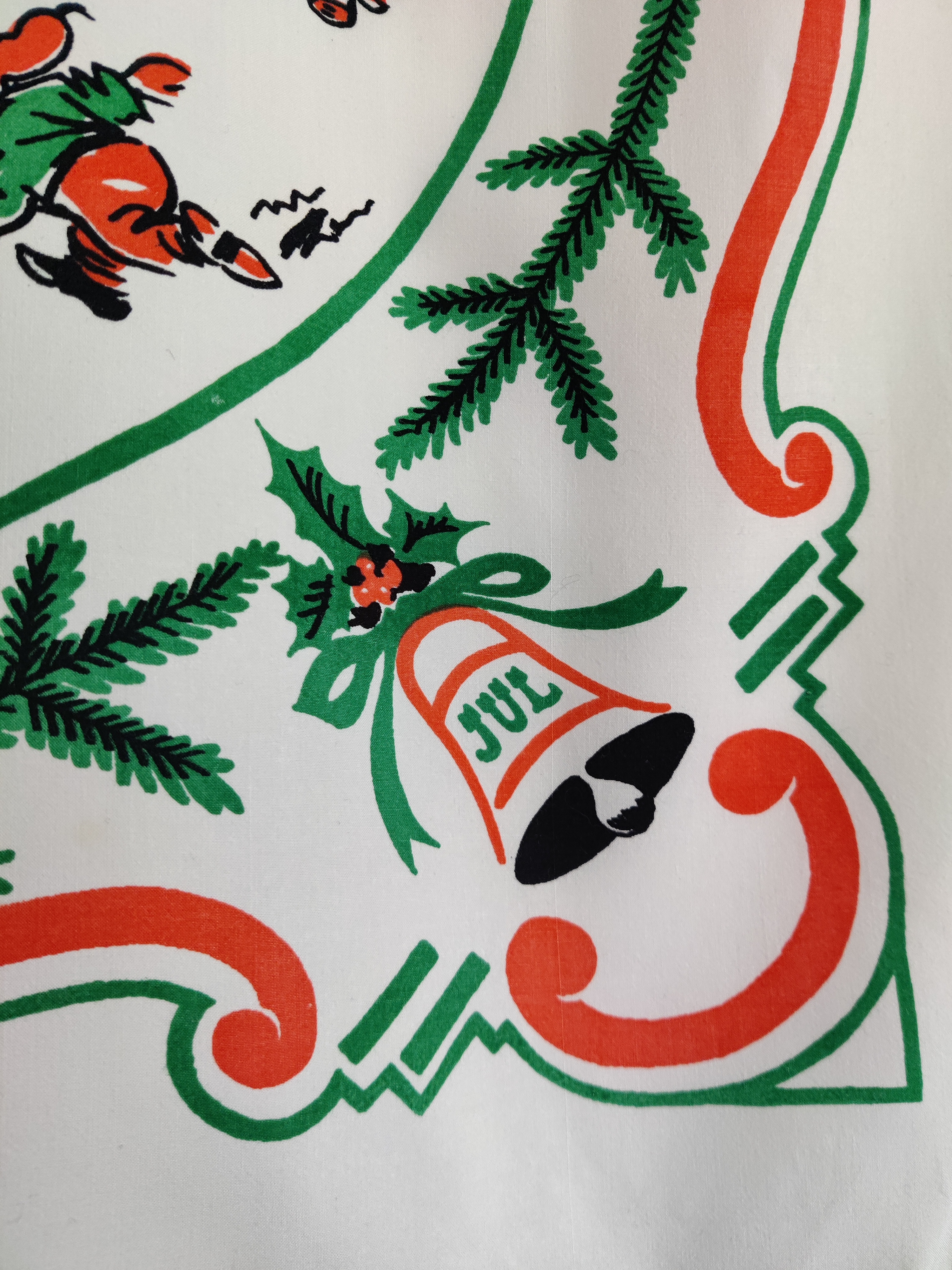 Fantastisk juledug fra 1950'erne med nisser og grise i vild galop rundt om kaffebordet. Stoffet falder tungt, er meget blødt, og har ikke en eneste plet - ret utroligt. Mål 78 x 84 cm.