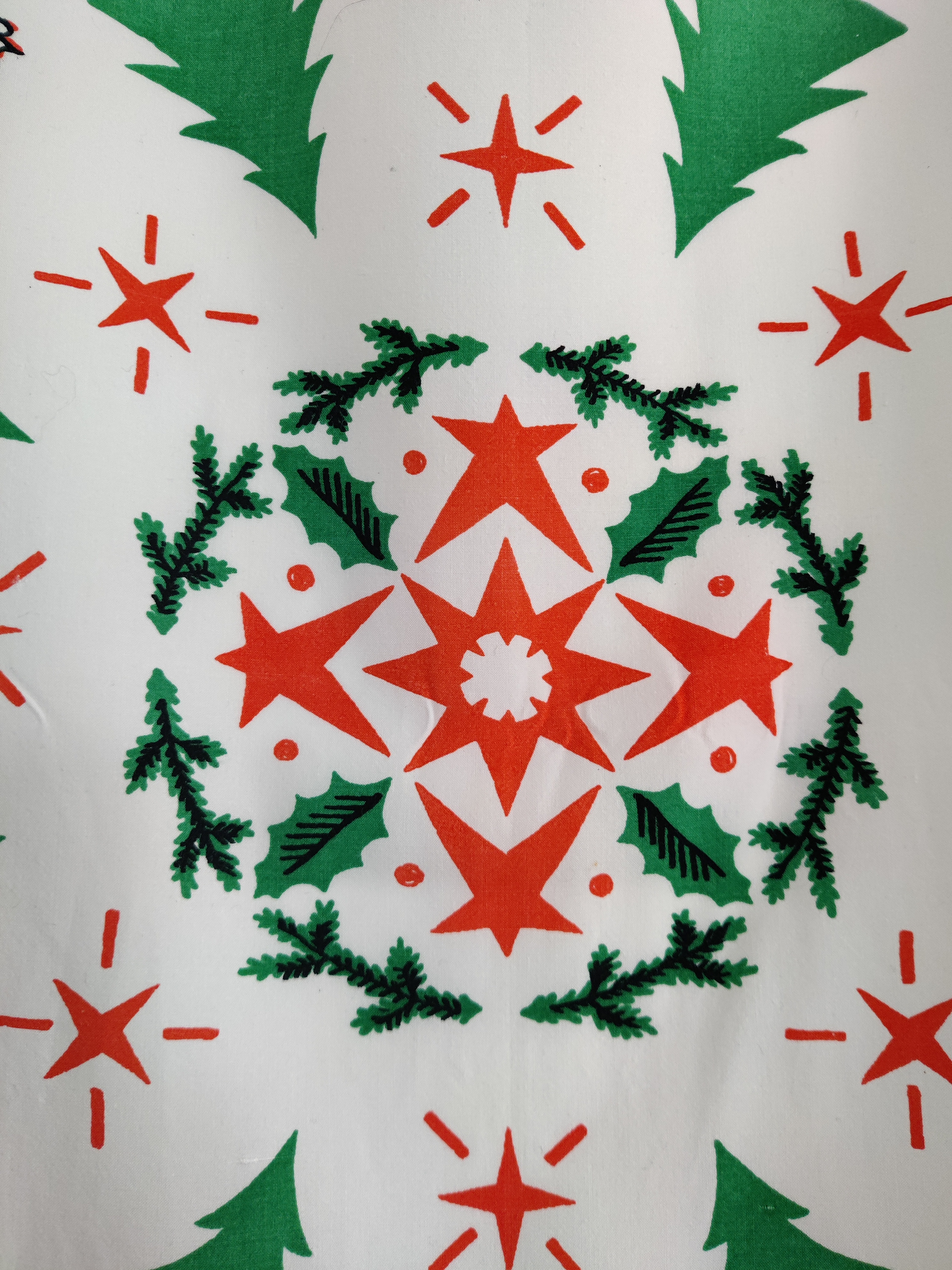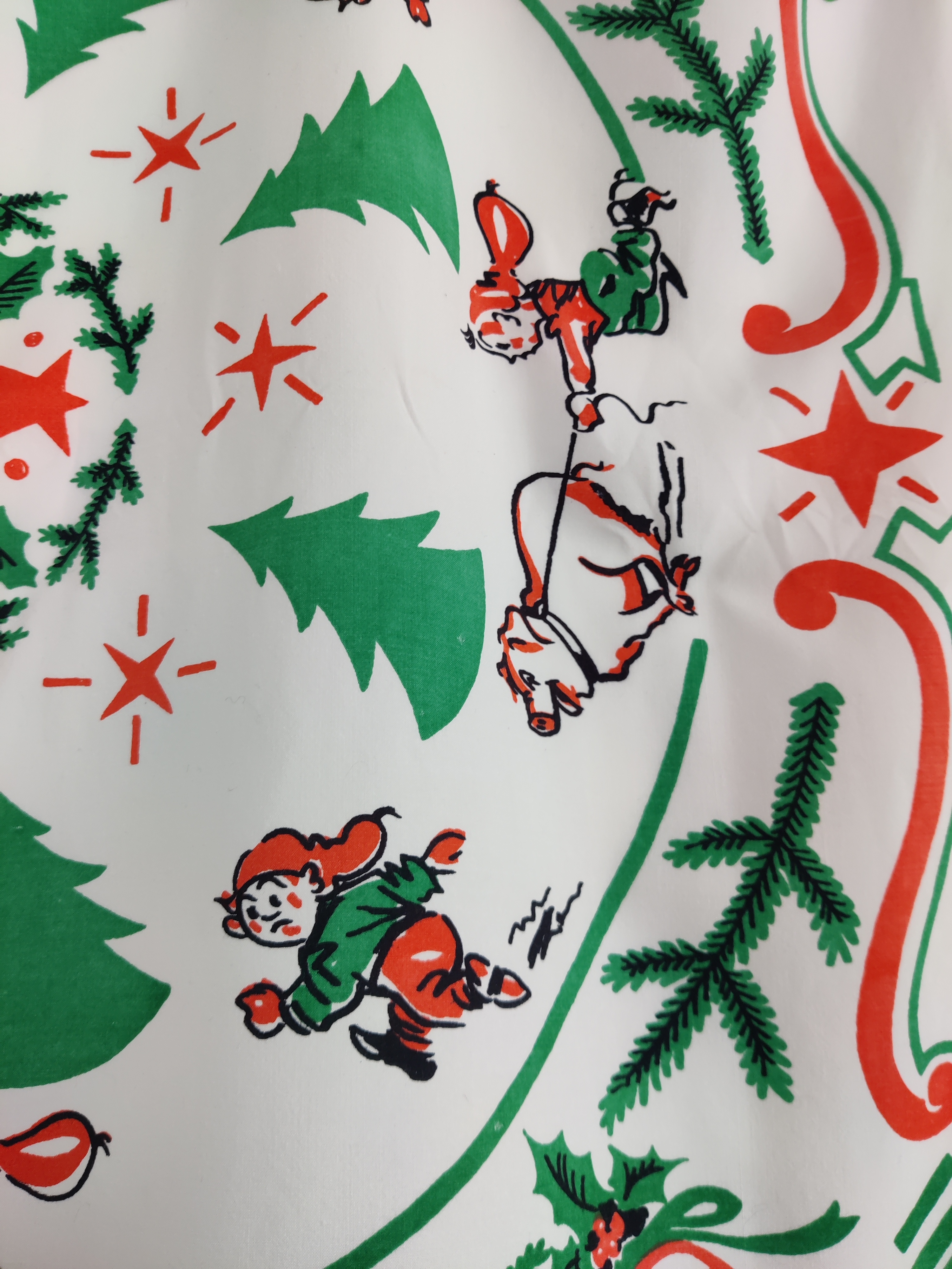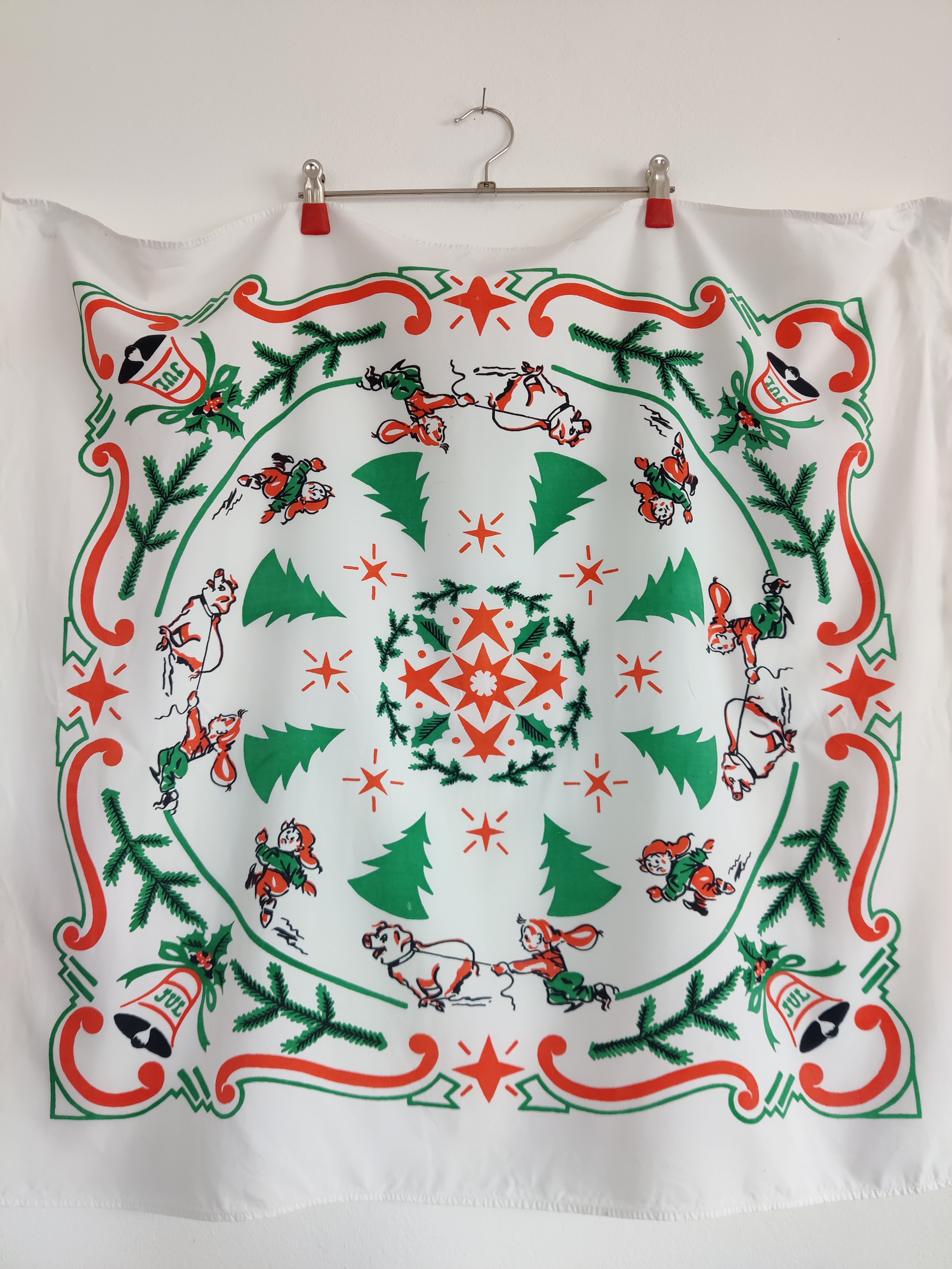 Fantastisk juledug fra 1950'erne med nisser og grise i vild galop rundt om kaffebordet. Stoffet falder tungt, er meget blødt, og har ikke en eneste plet - ret utroligt. Mål 78 x 84 cm.