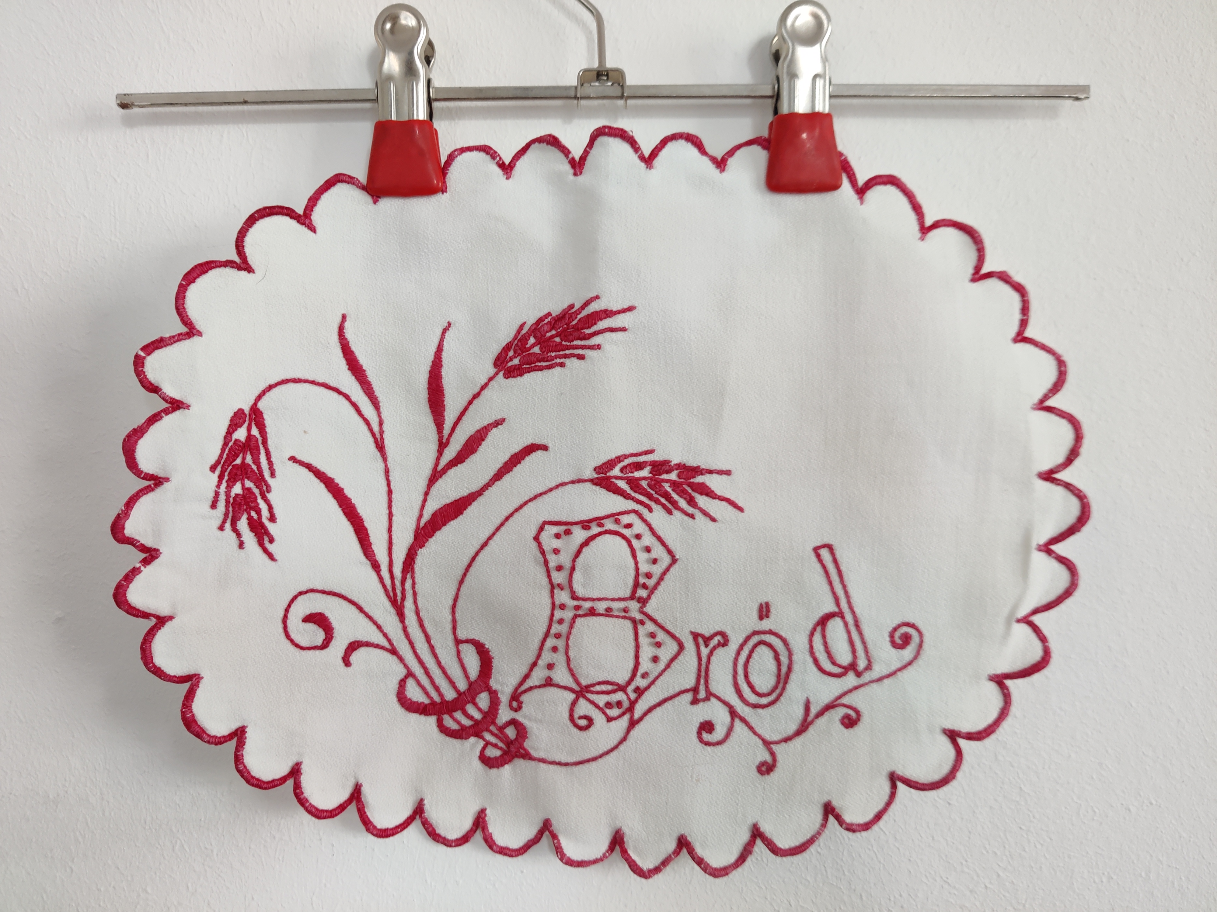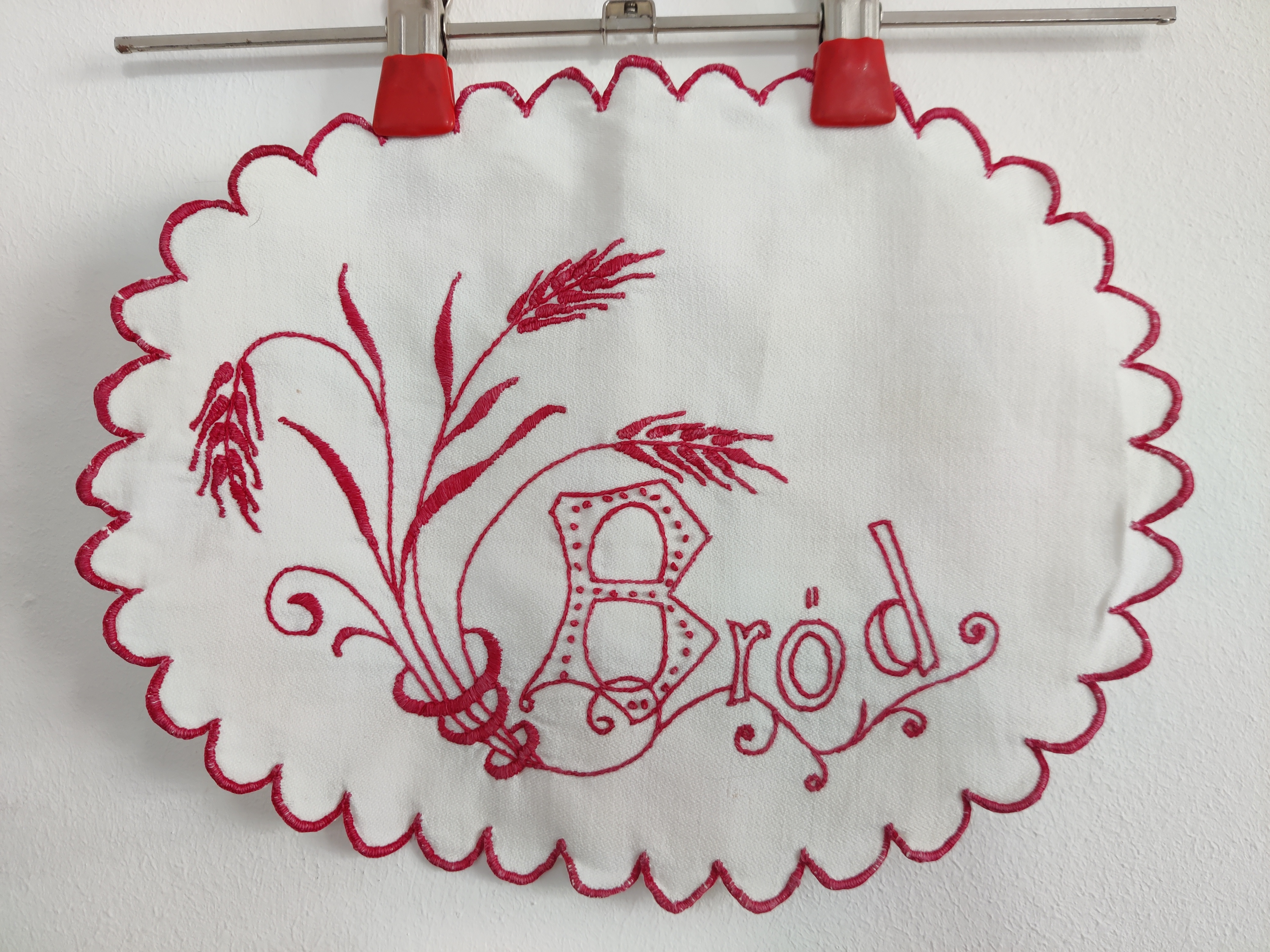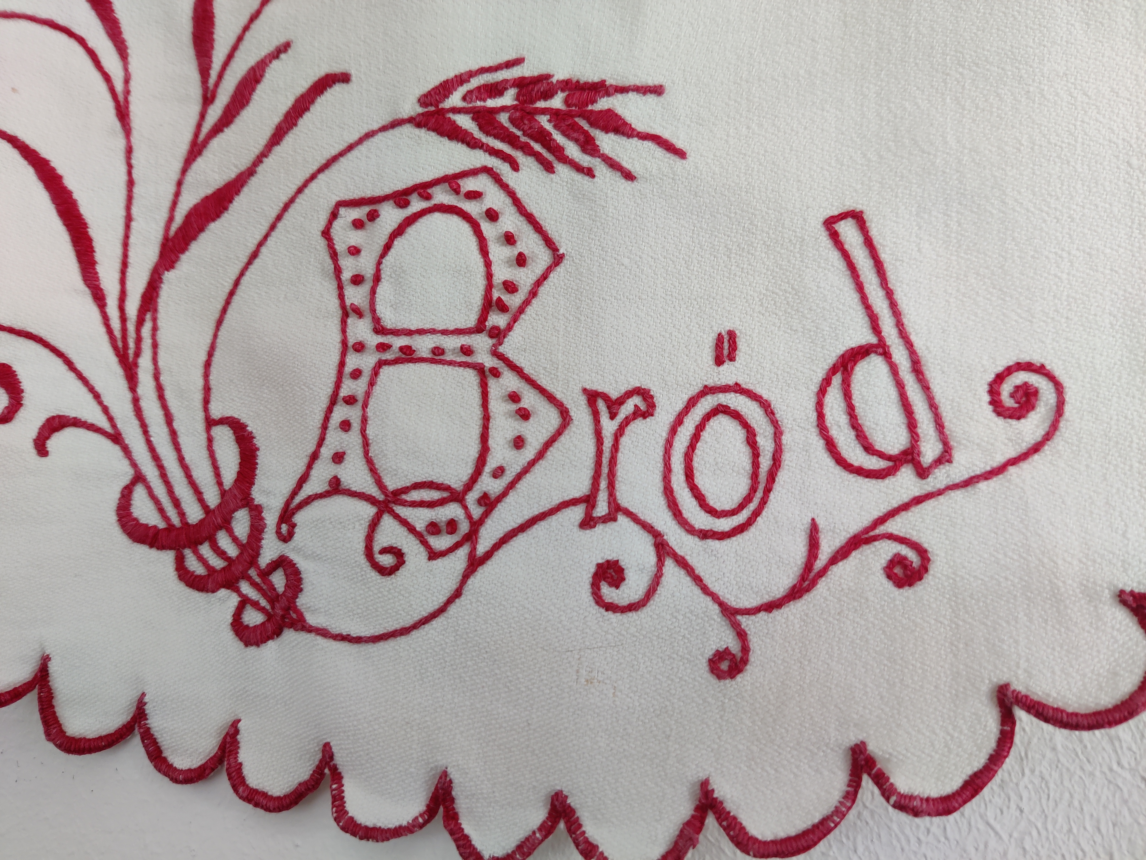Fin gammel håndsyet serviet til brødkurven - selvom der ikke er nogen, der klager, hvis du bruger den til småkager. Mål 28 x 22 cm.