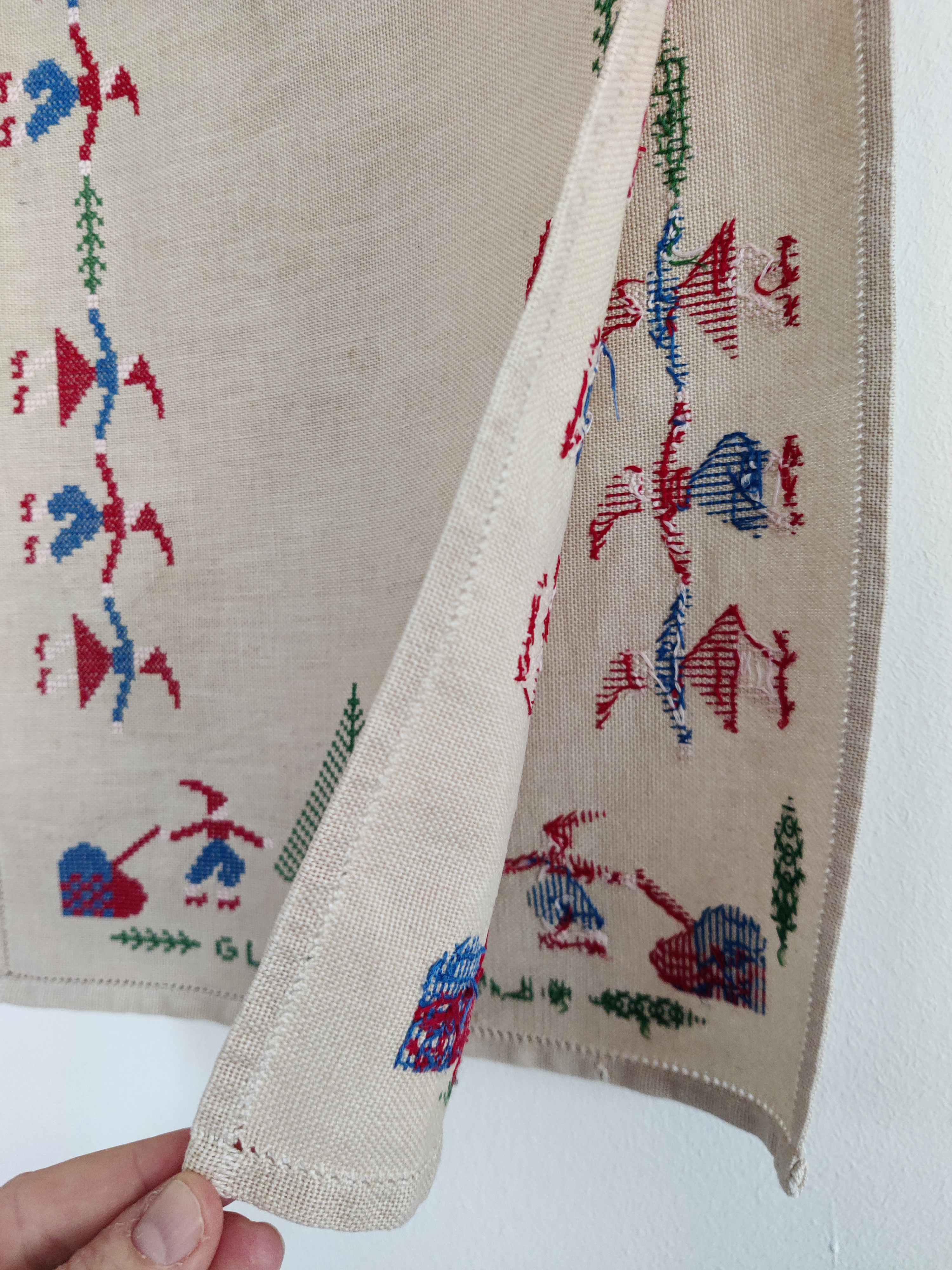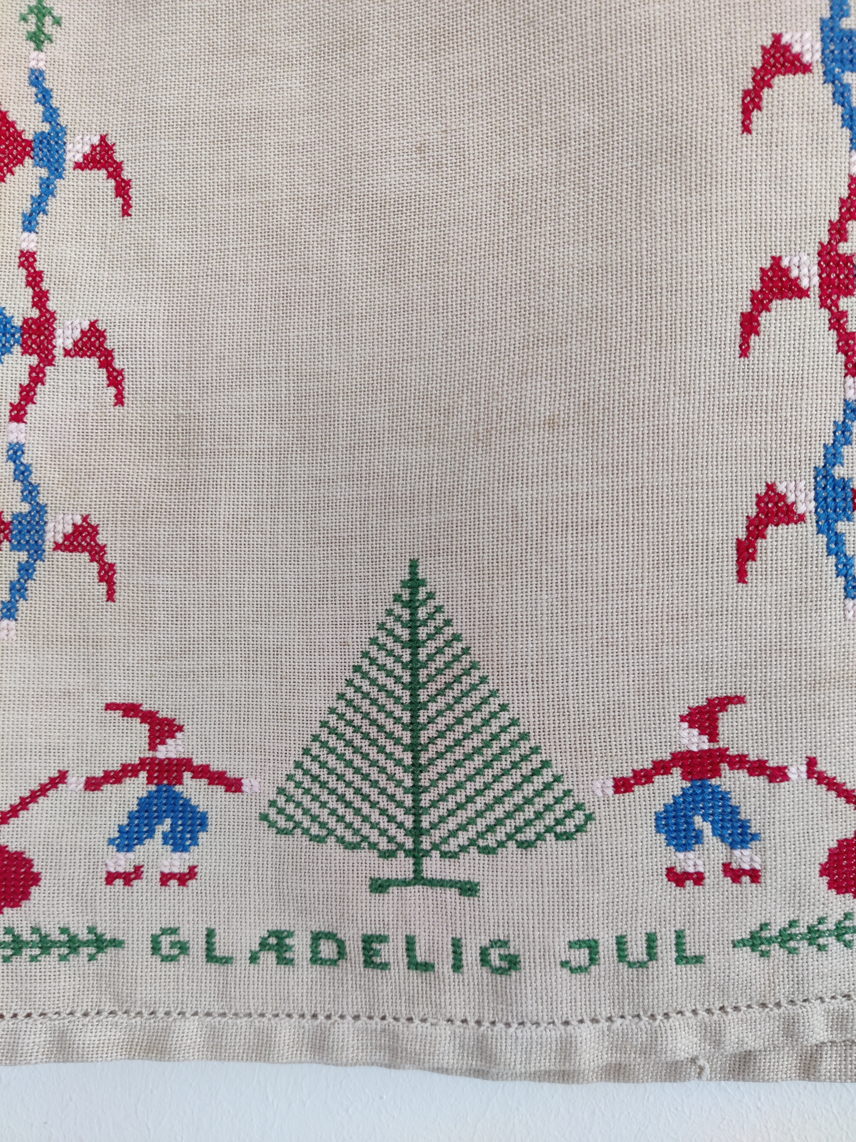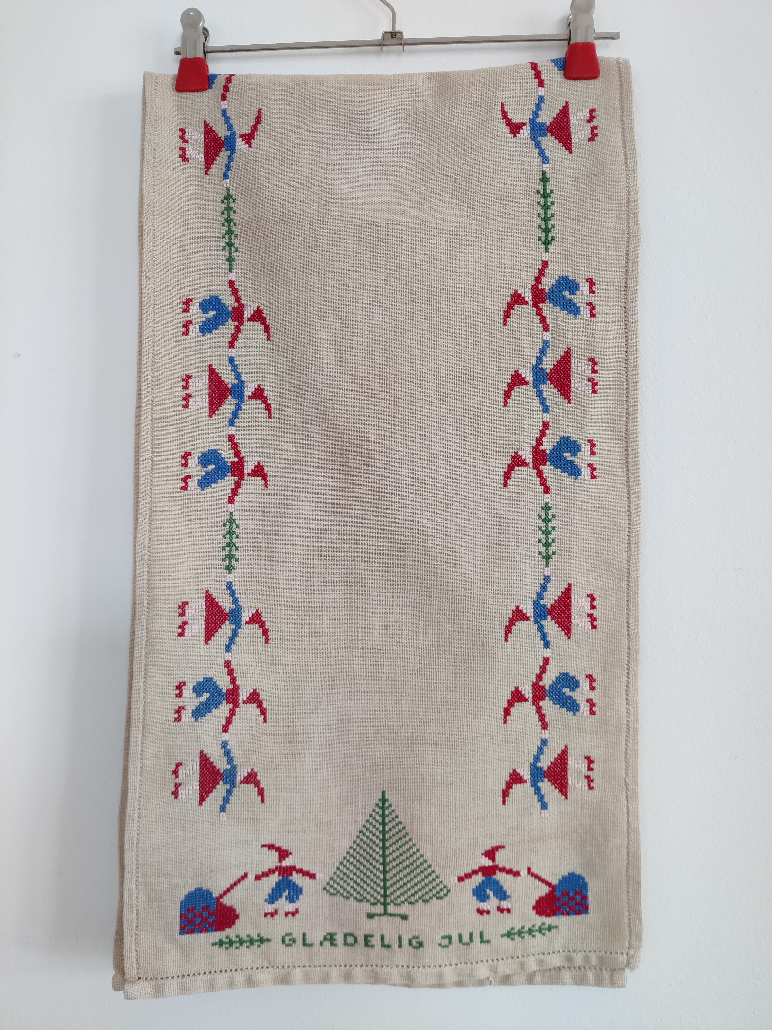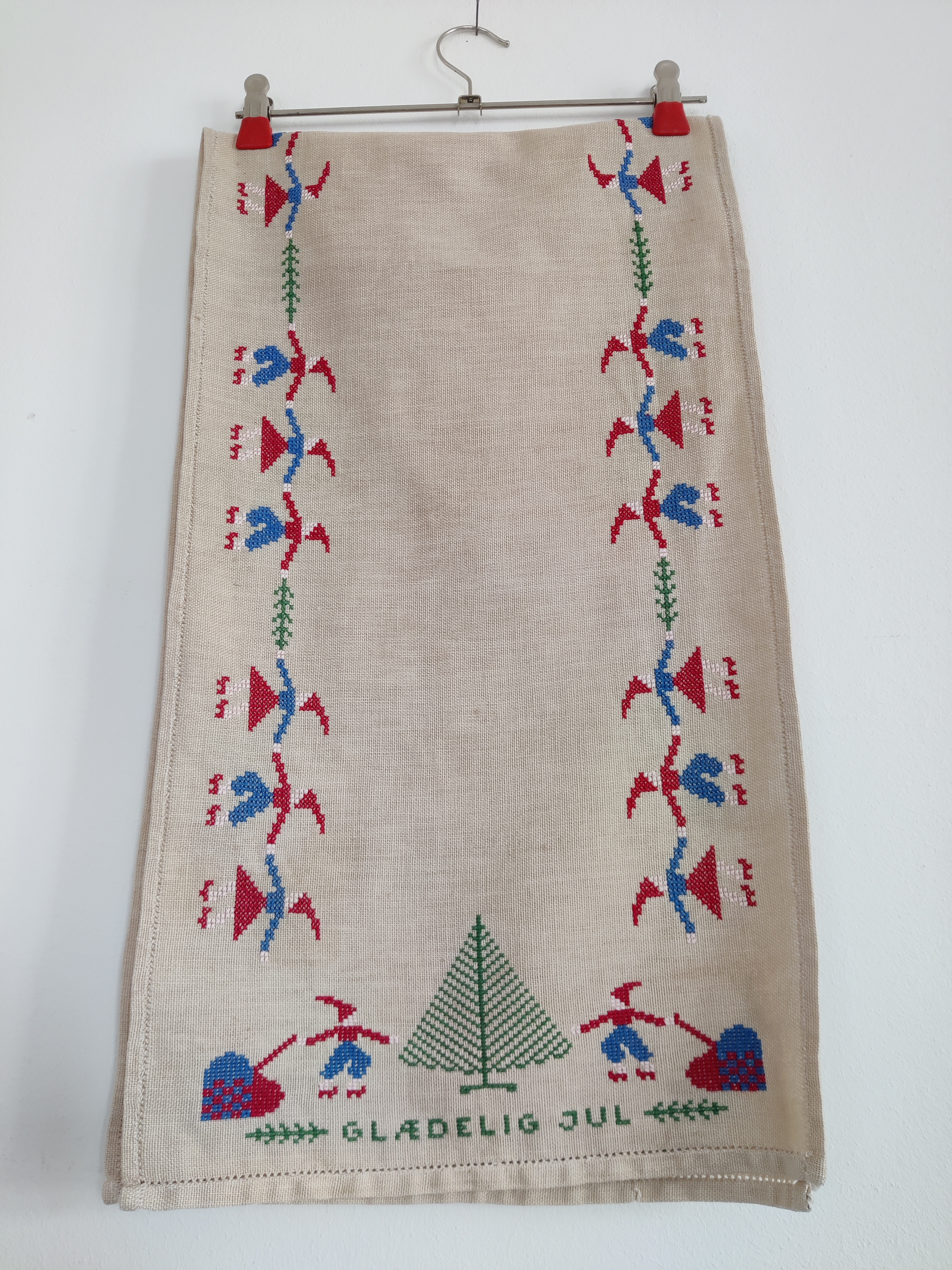 Lang vintage bordløber på 120 cm med en hel masse søde nisser og et juletræ i hver ende. Perfekt på julebordet eller som underlag til dekorationer, sy-projekter mm. Mål 120 x 33 cm.