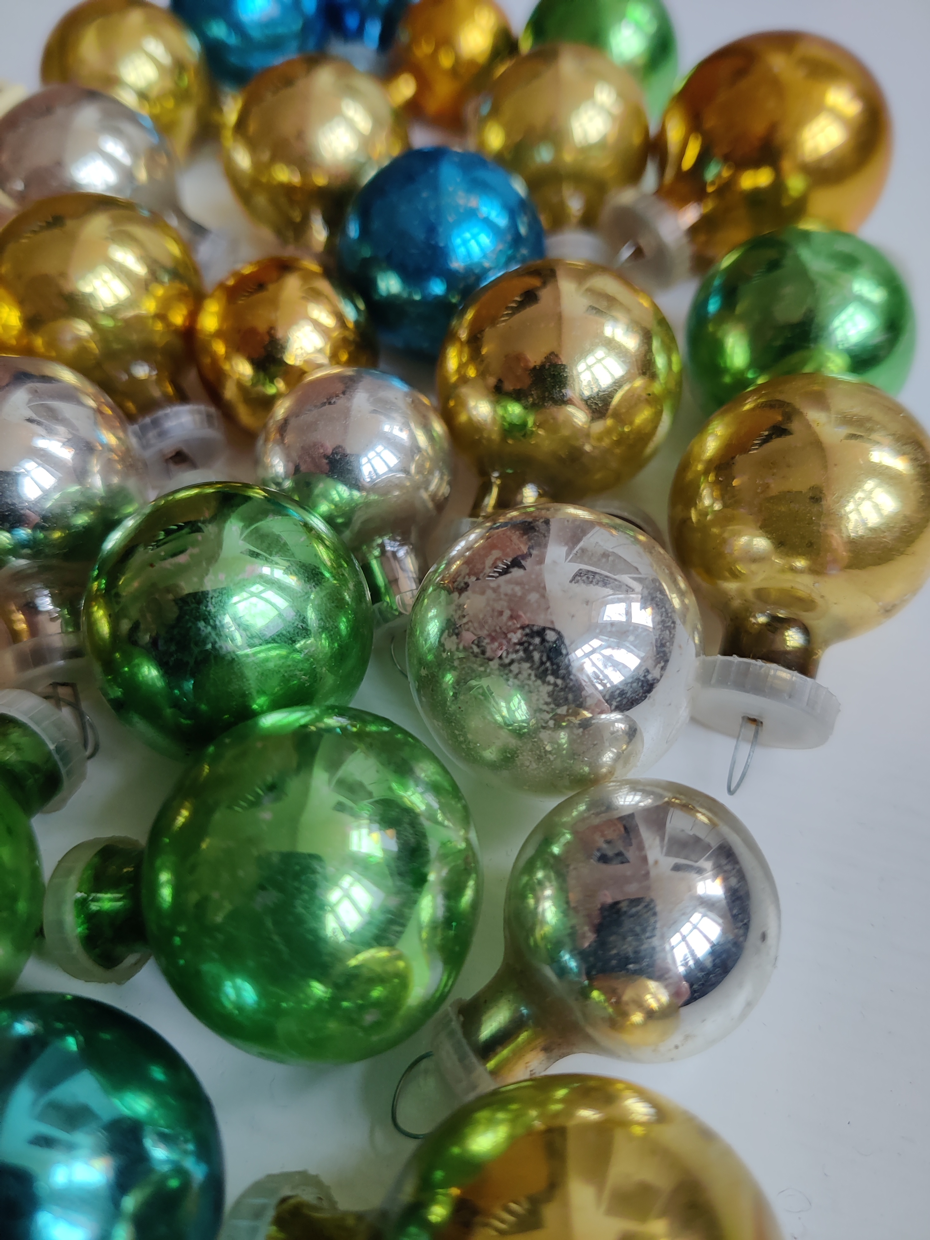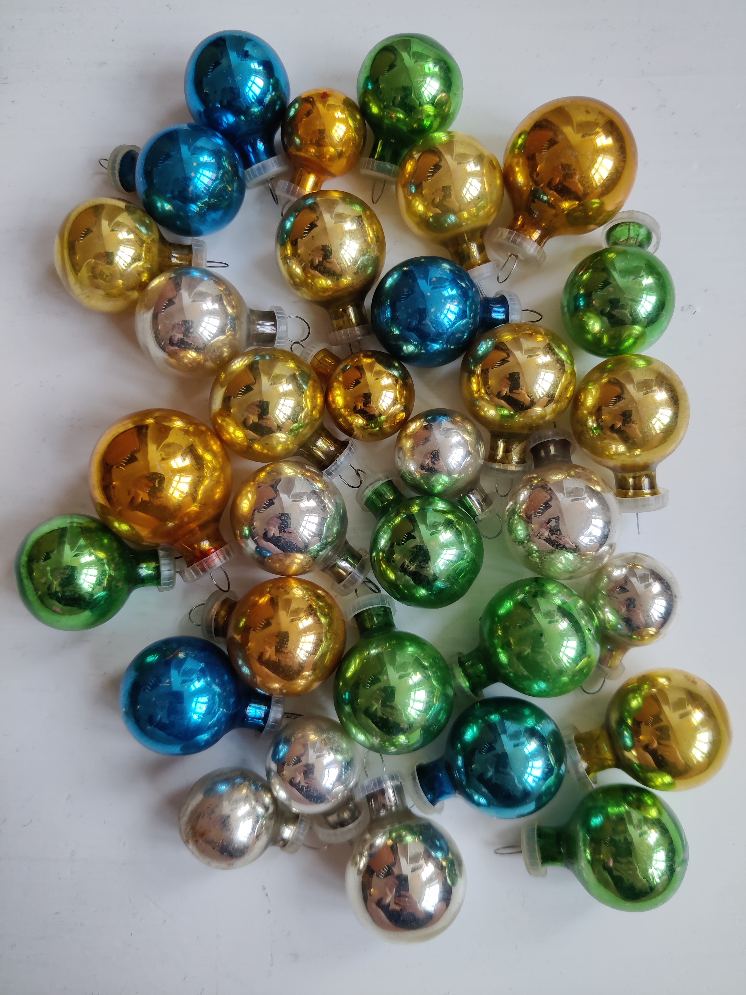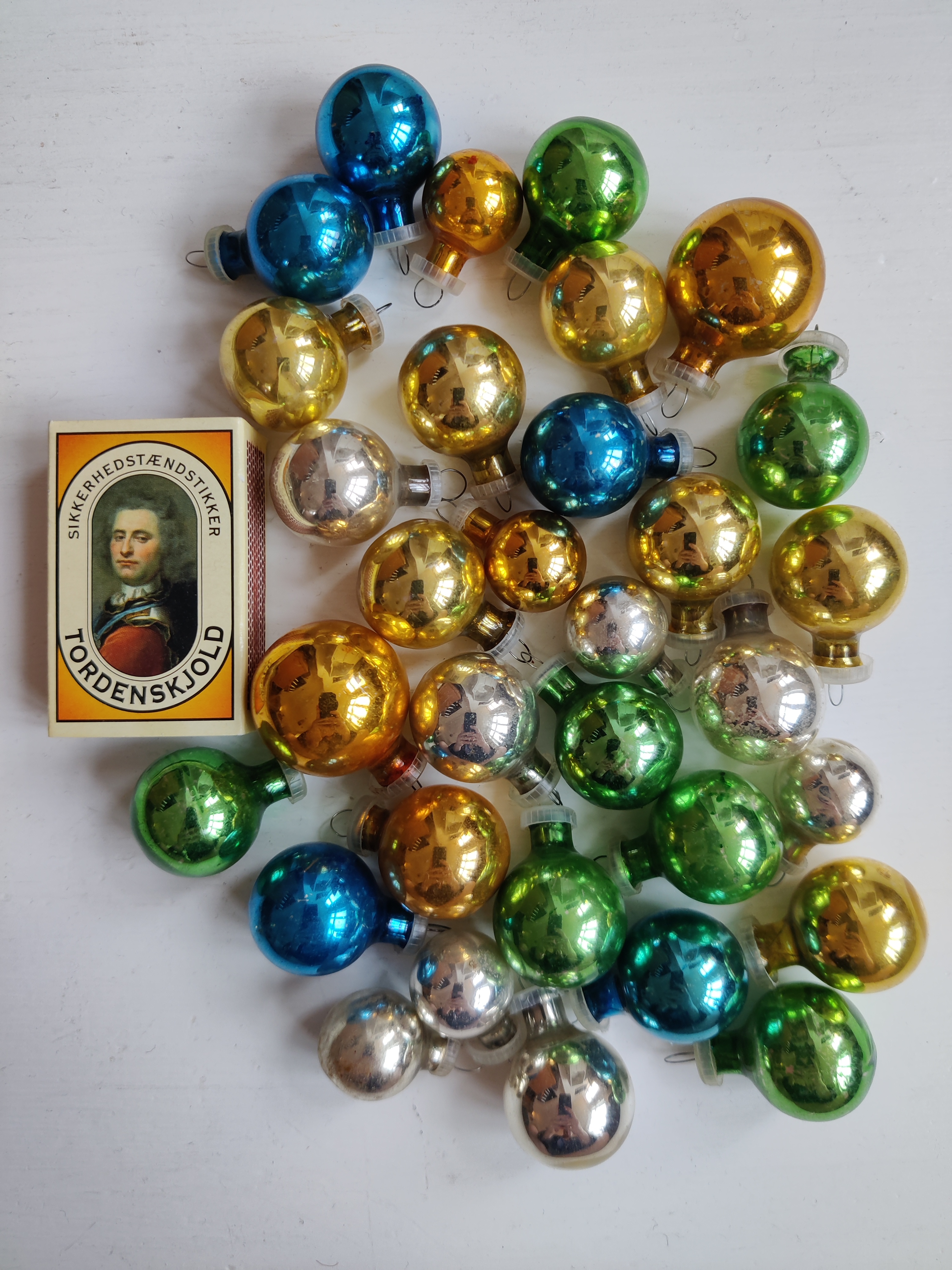32 blandede små gamle glaskugler, som vil være rigtig fine på en snor eller grene i en stor vase. De måler mellem 2,5 og 3,5 cm.