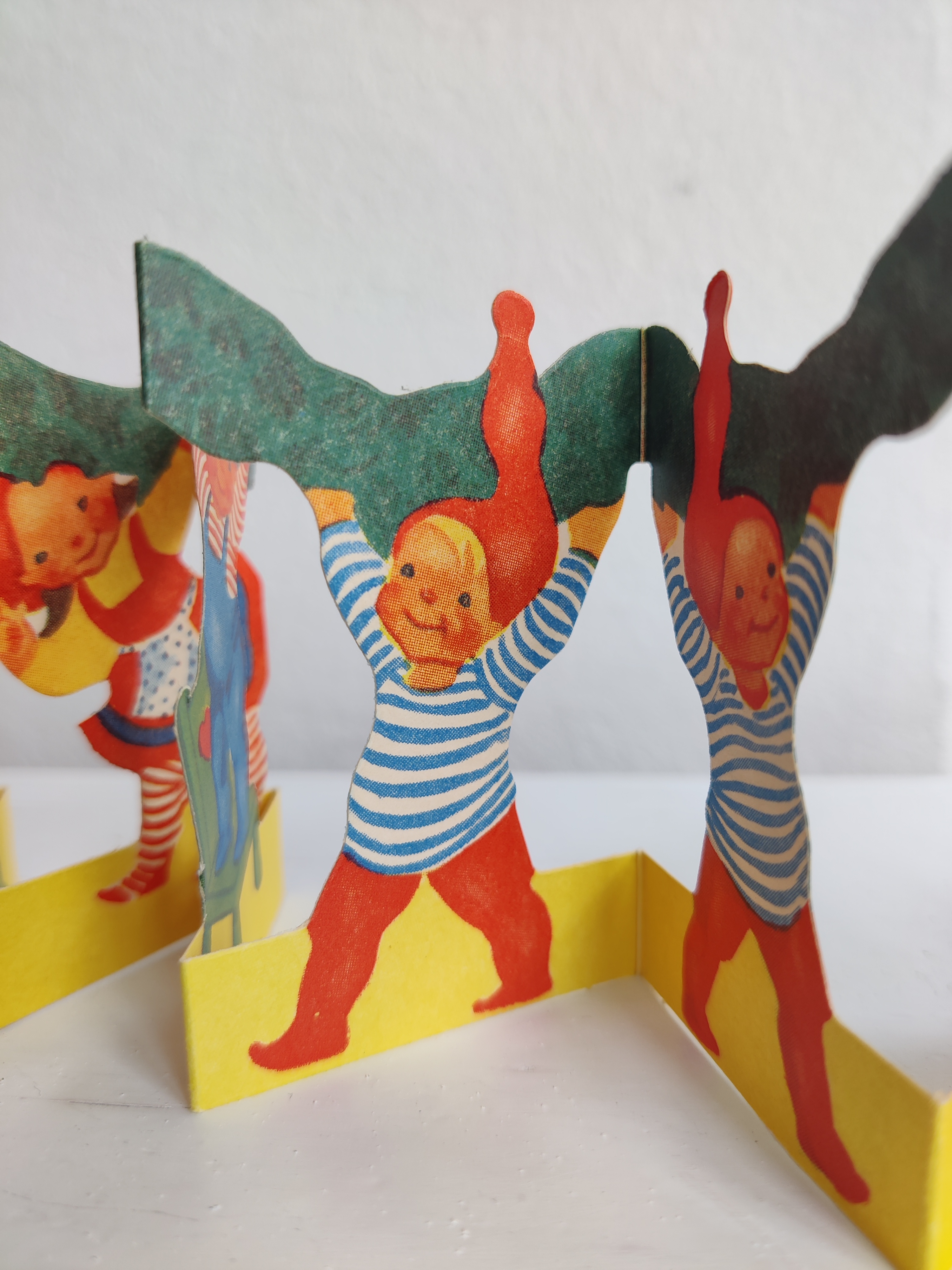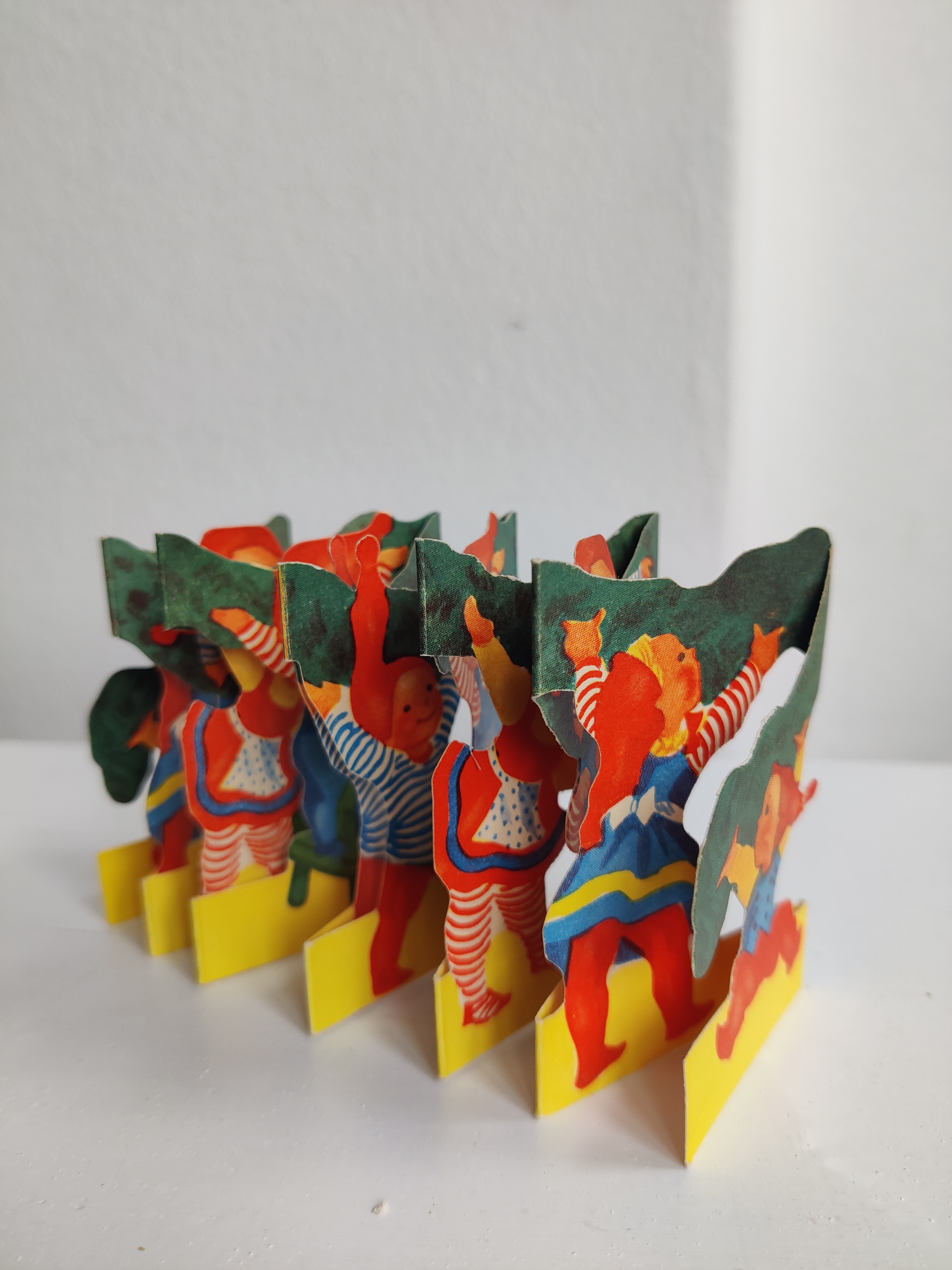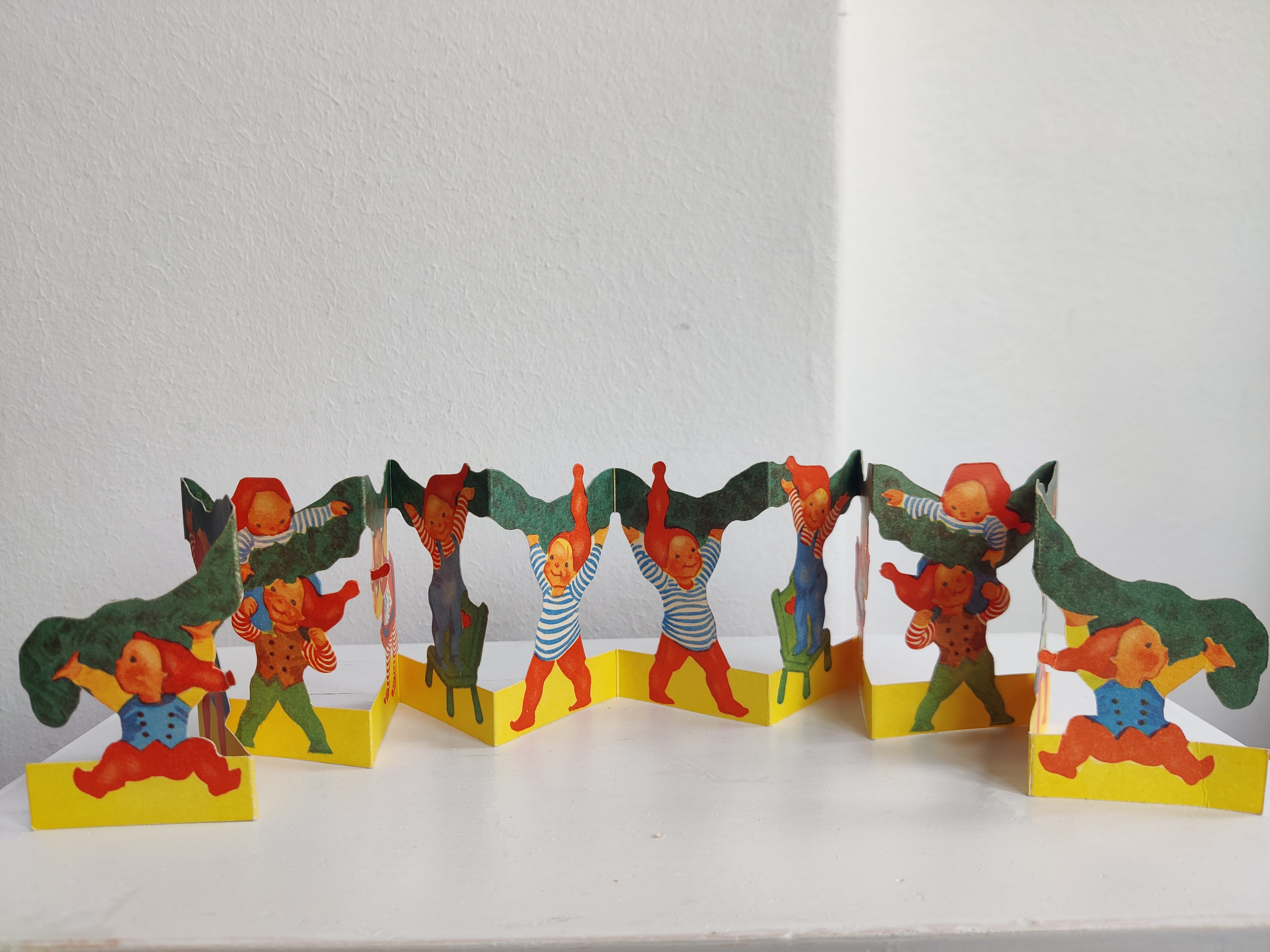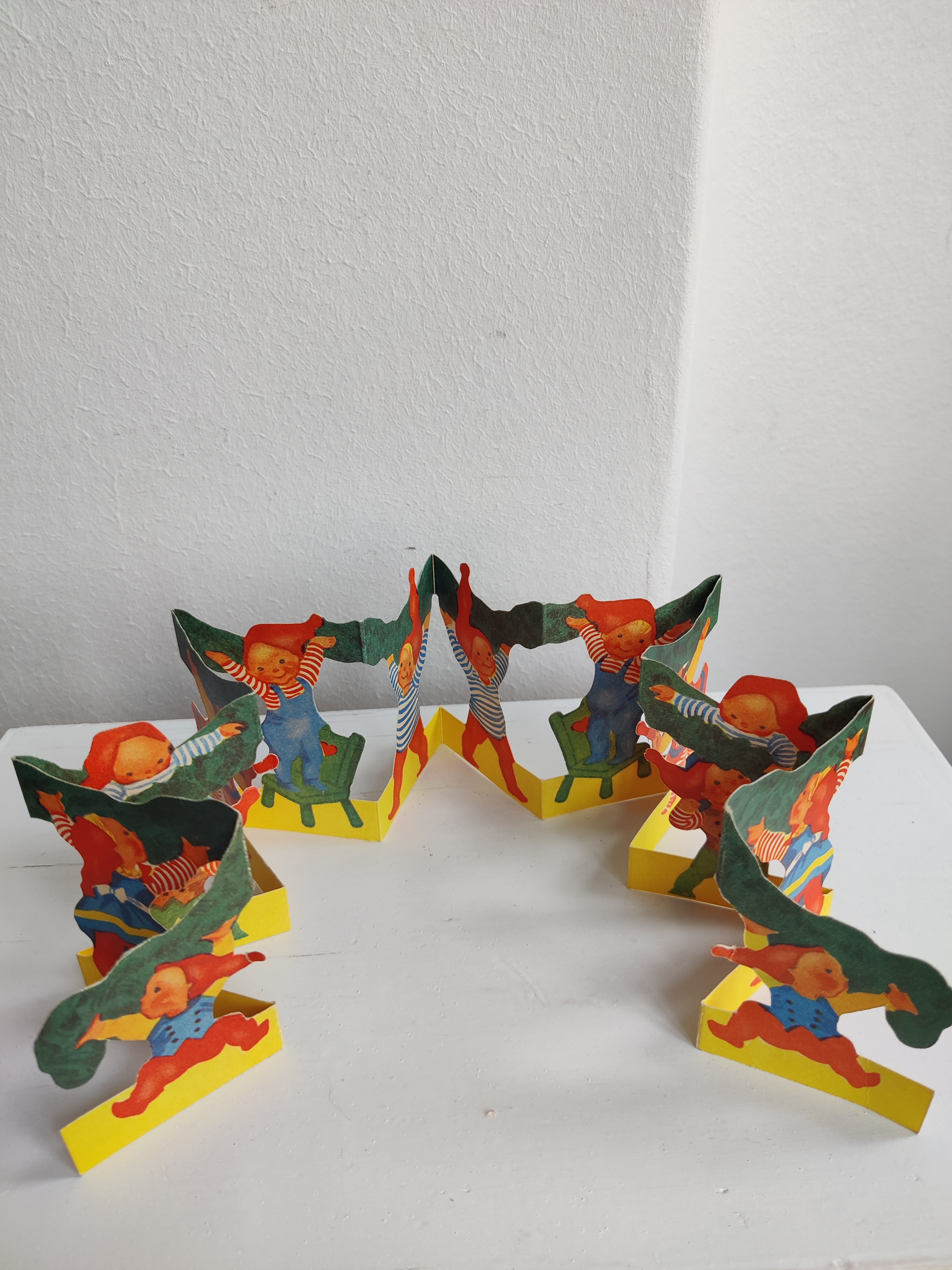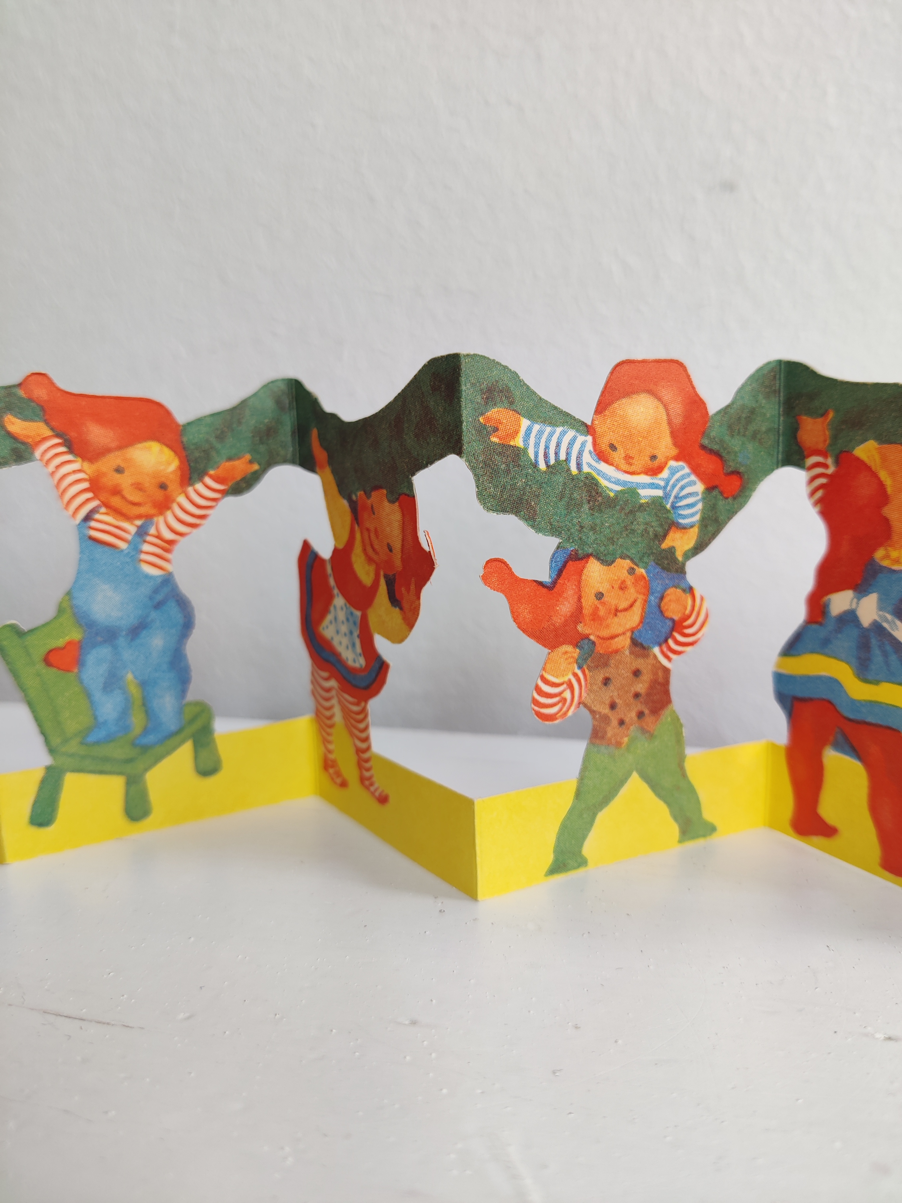 Sød gammel velholdt remse med nissebørn, der bakser med en granguirlande. Ens på begge sider. Måler i alt 60 cm x 7 cm.