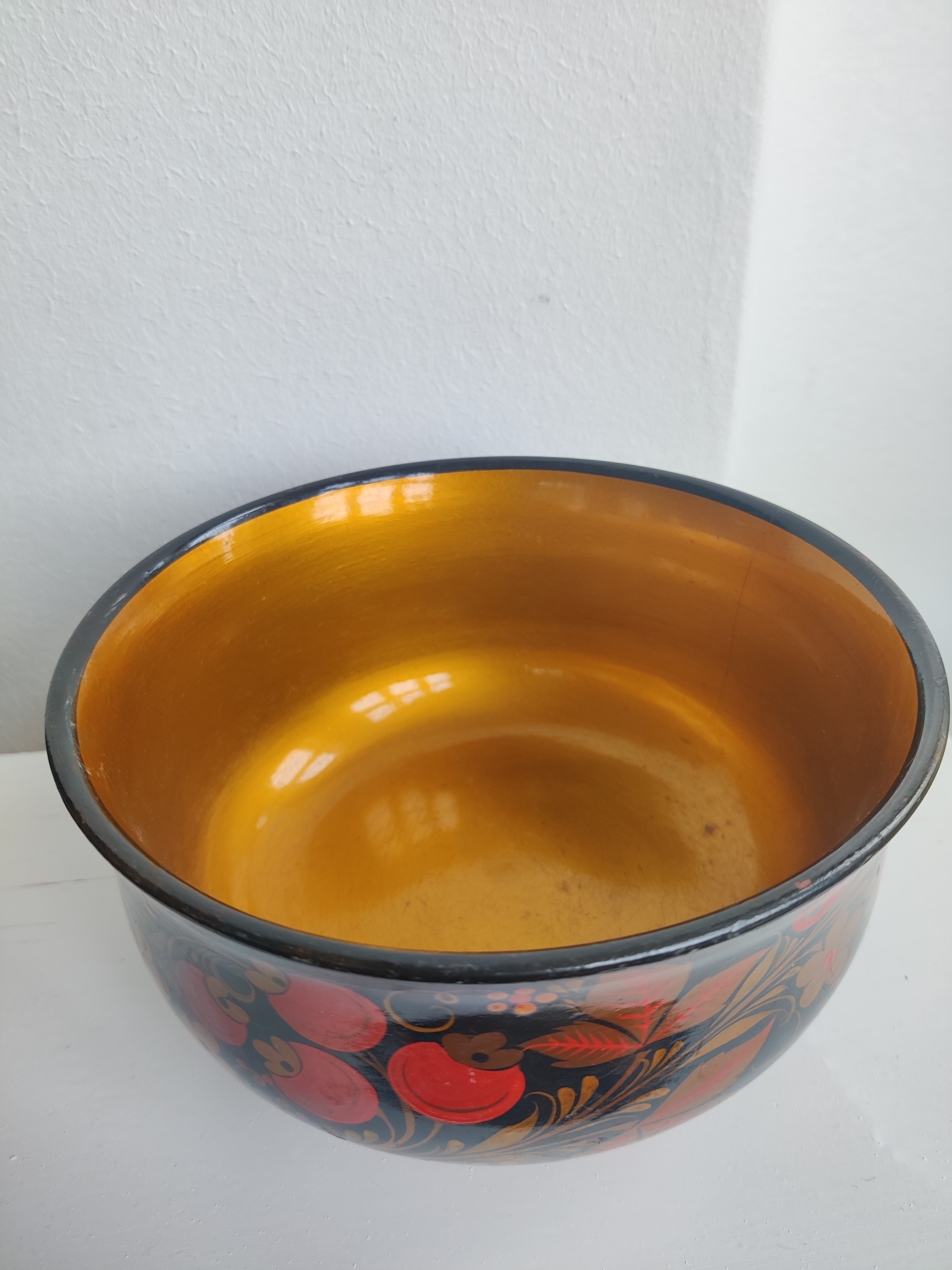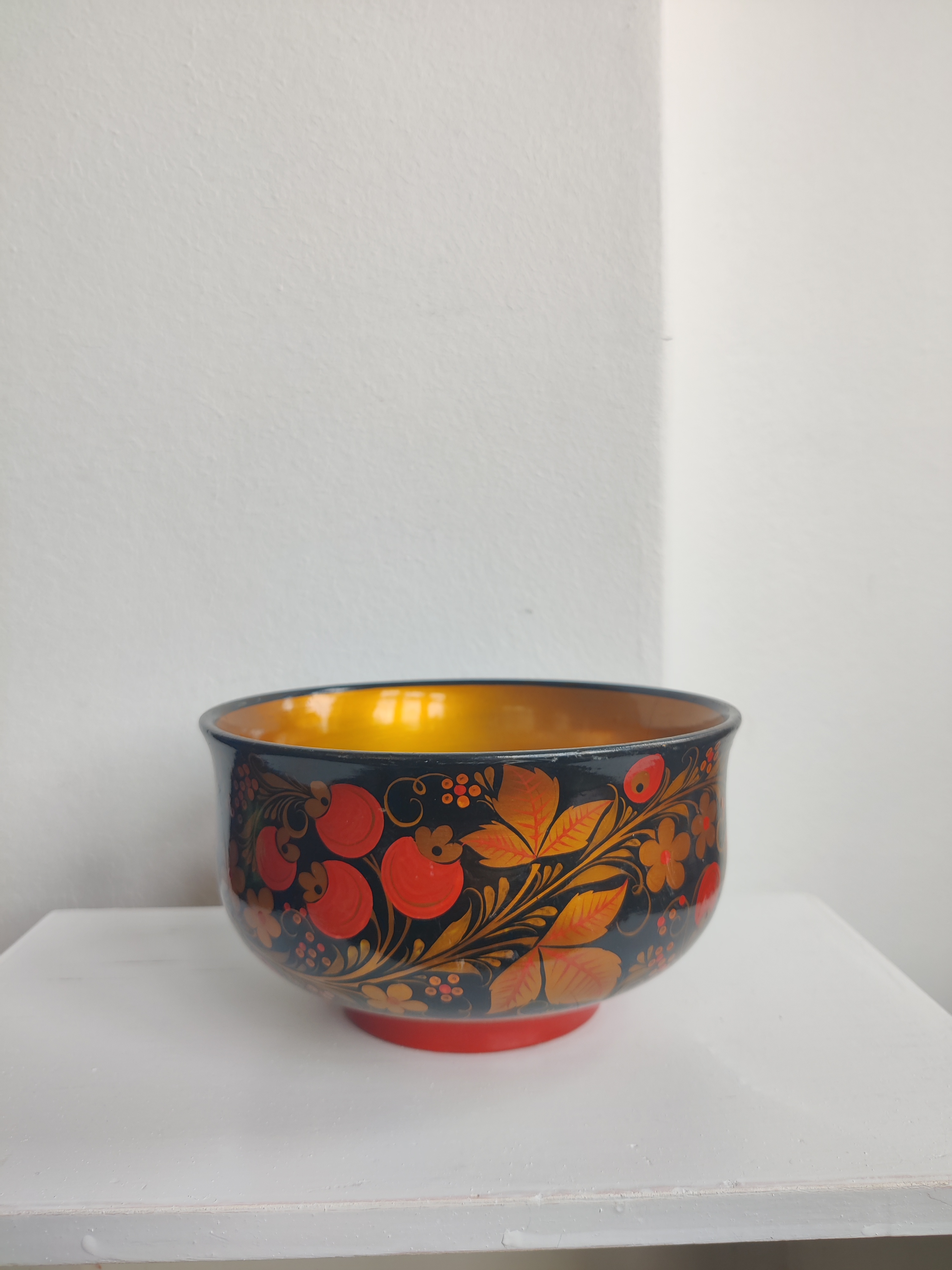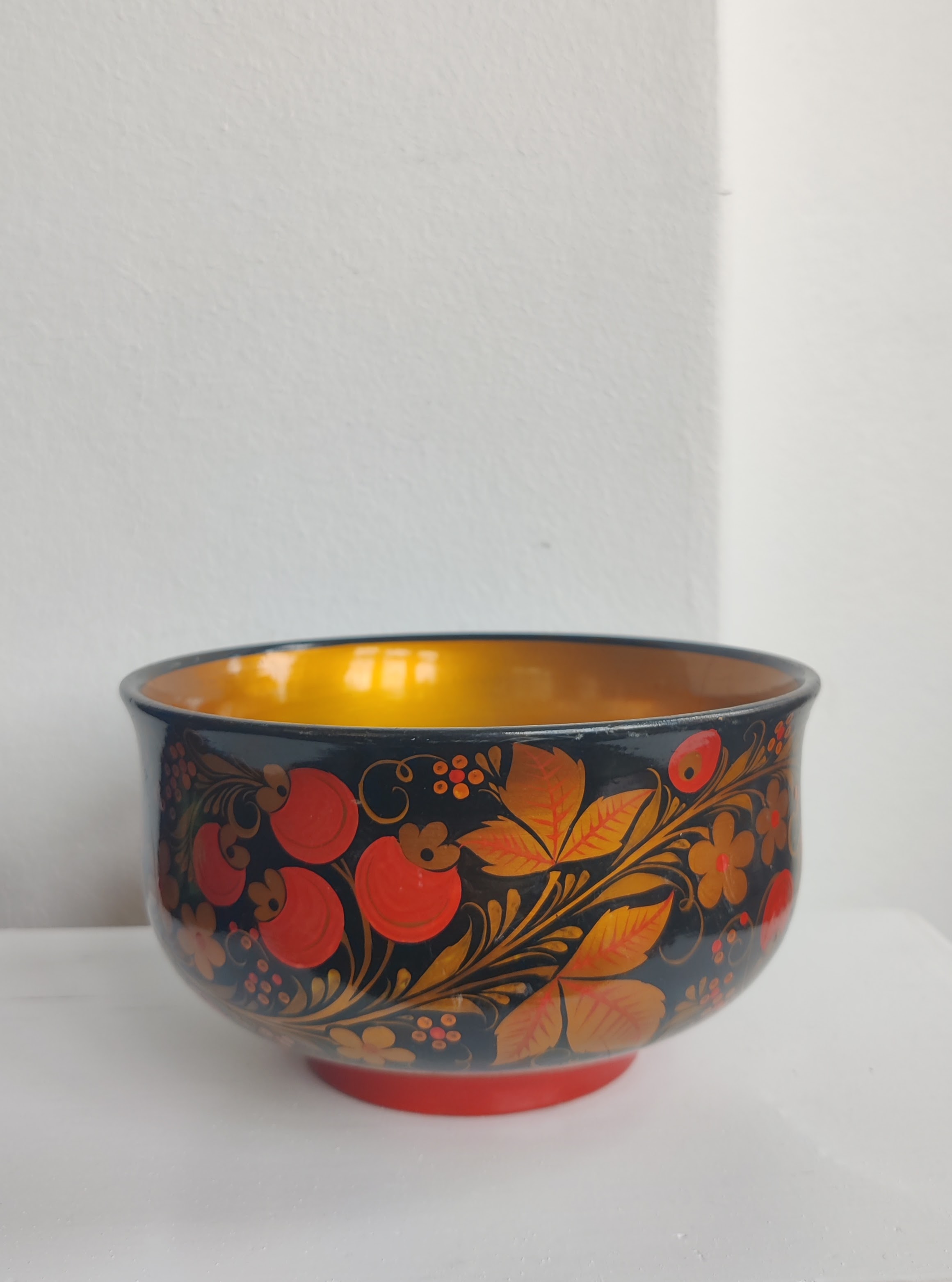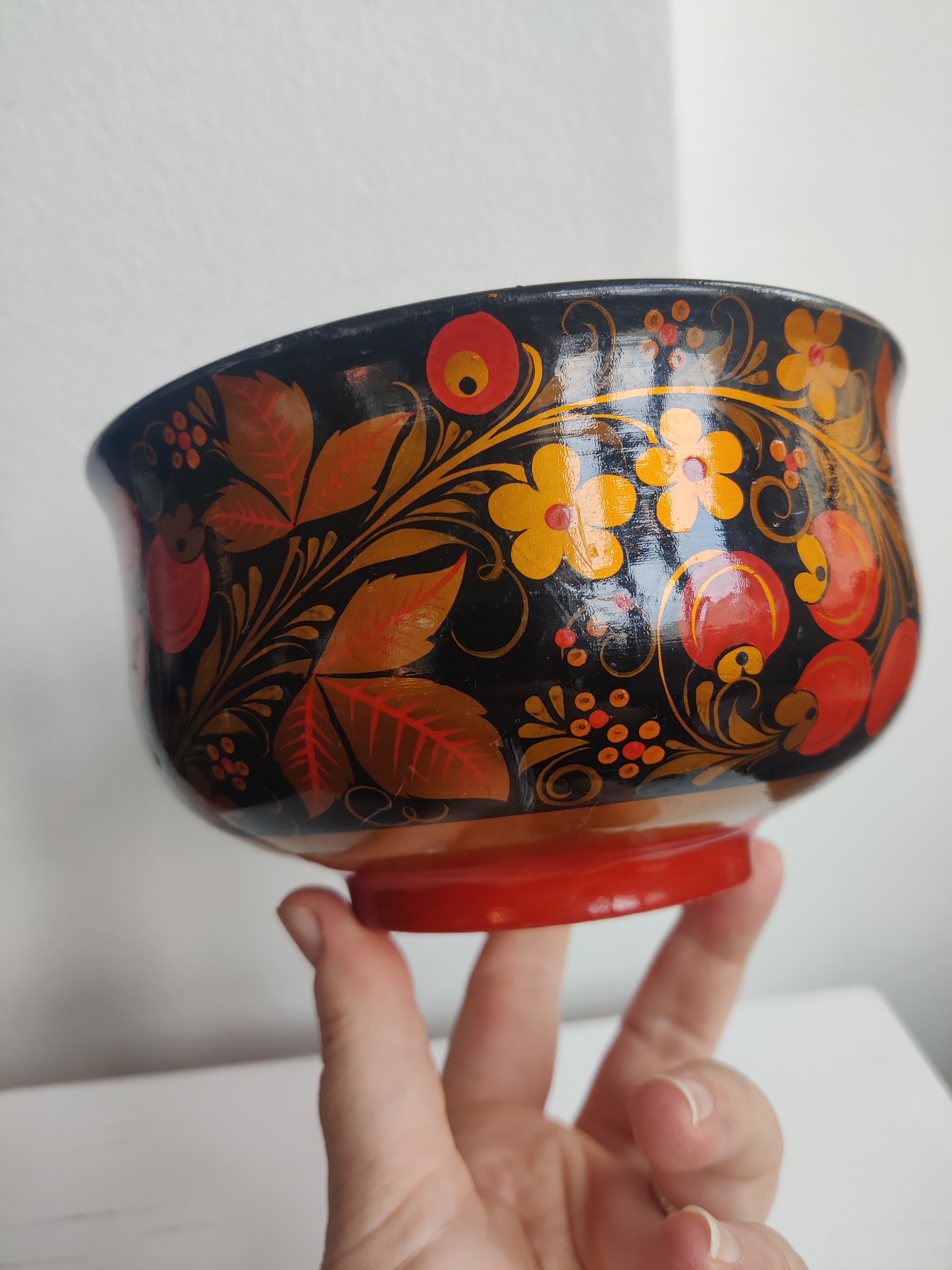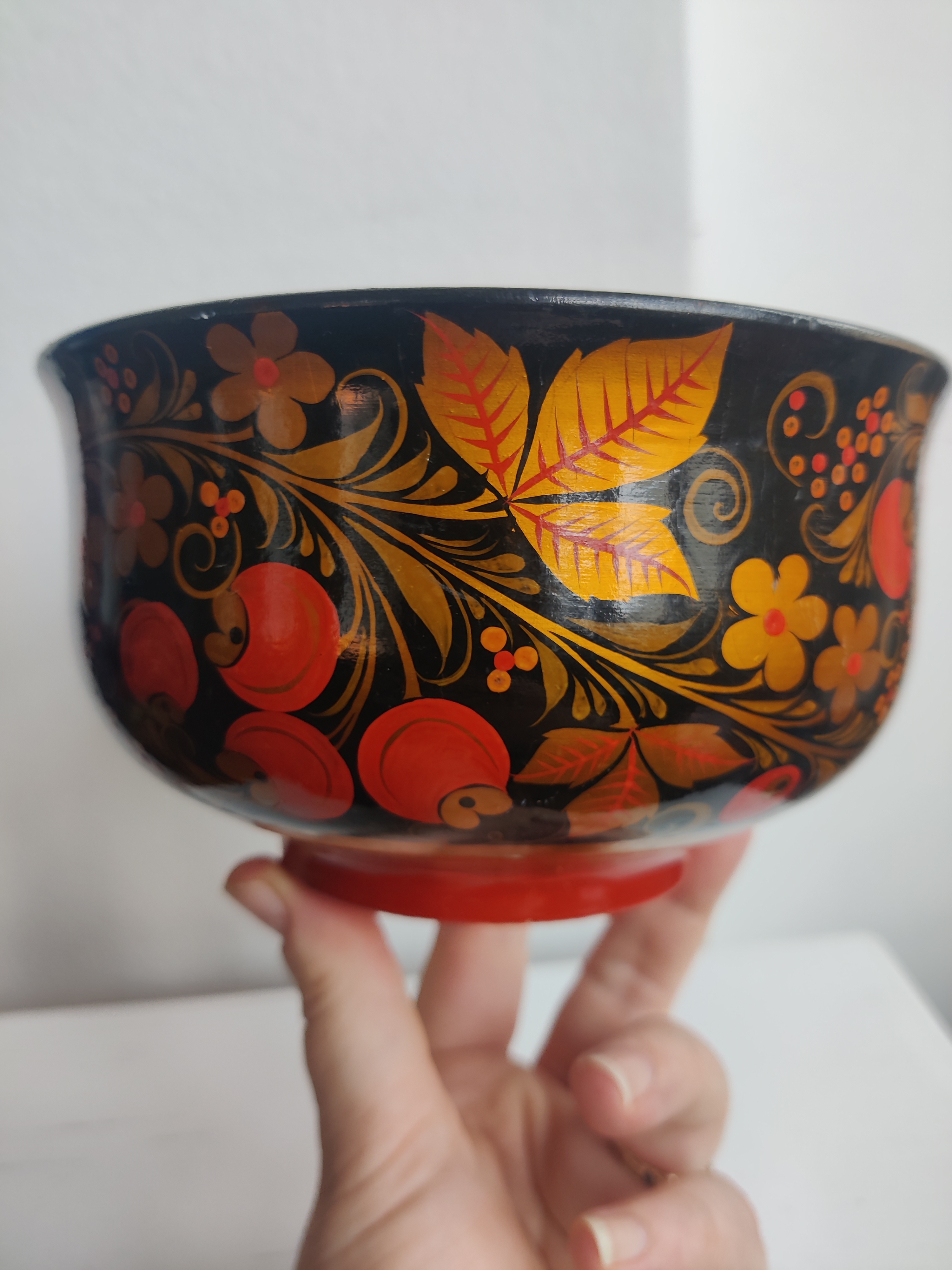 Smuk lakeret, håndmalet russisk skål med blade, bær og blomster. Den er perfekt til nødder og frugt, eller måske en vinterdekoration af en slags. Mål 16 x 9 cm.
