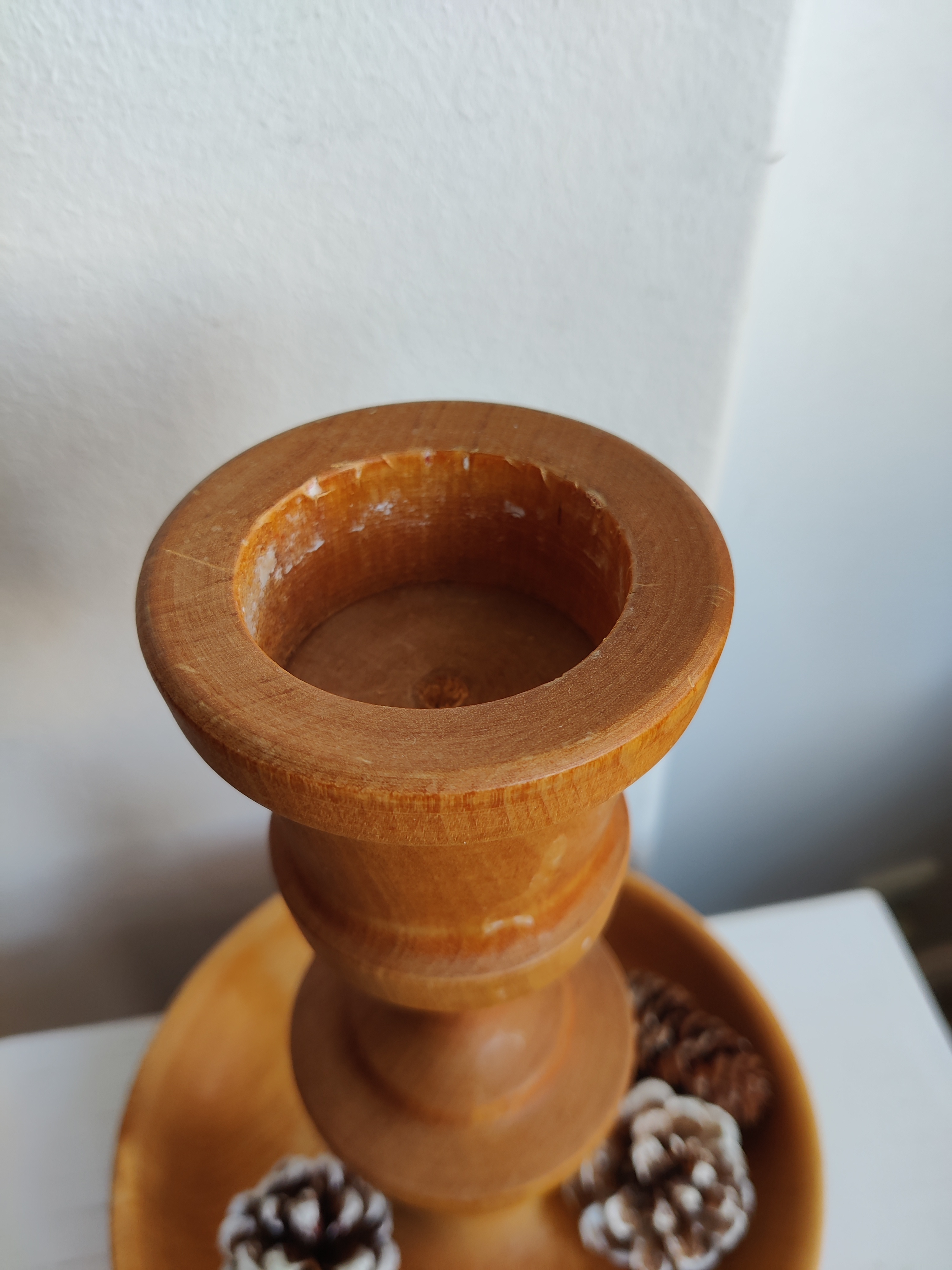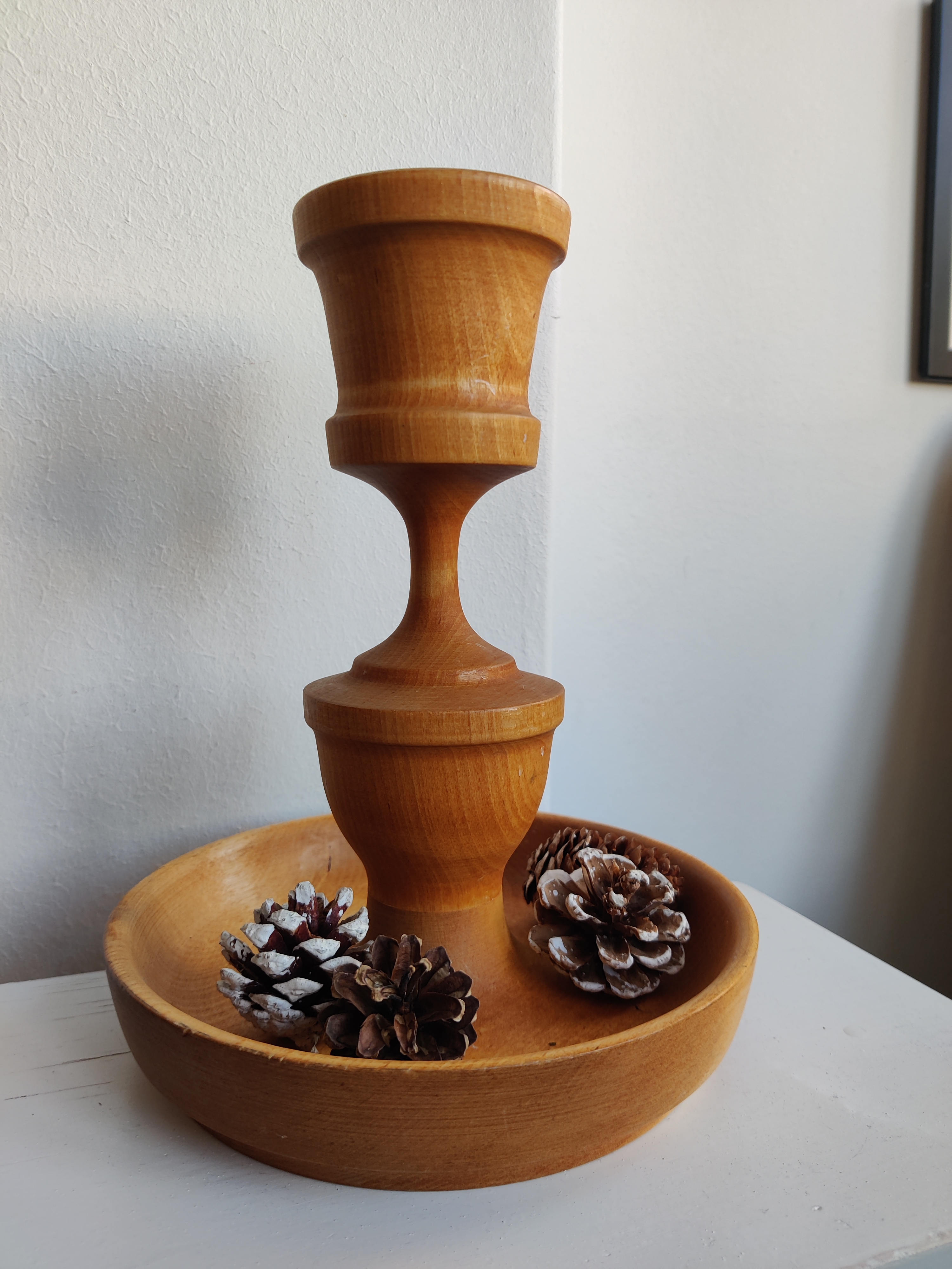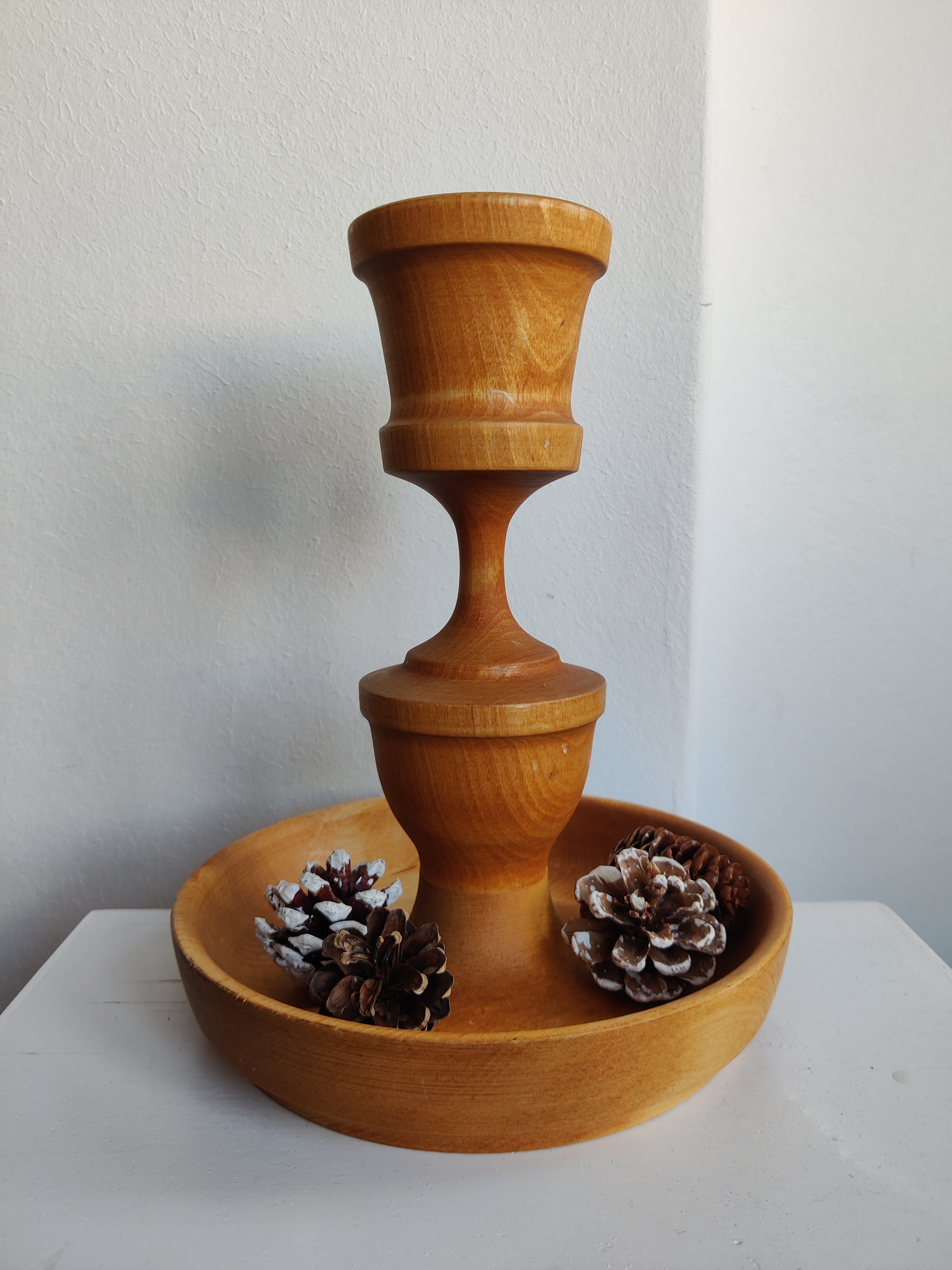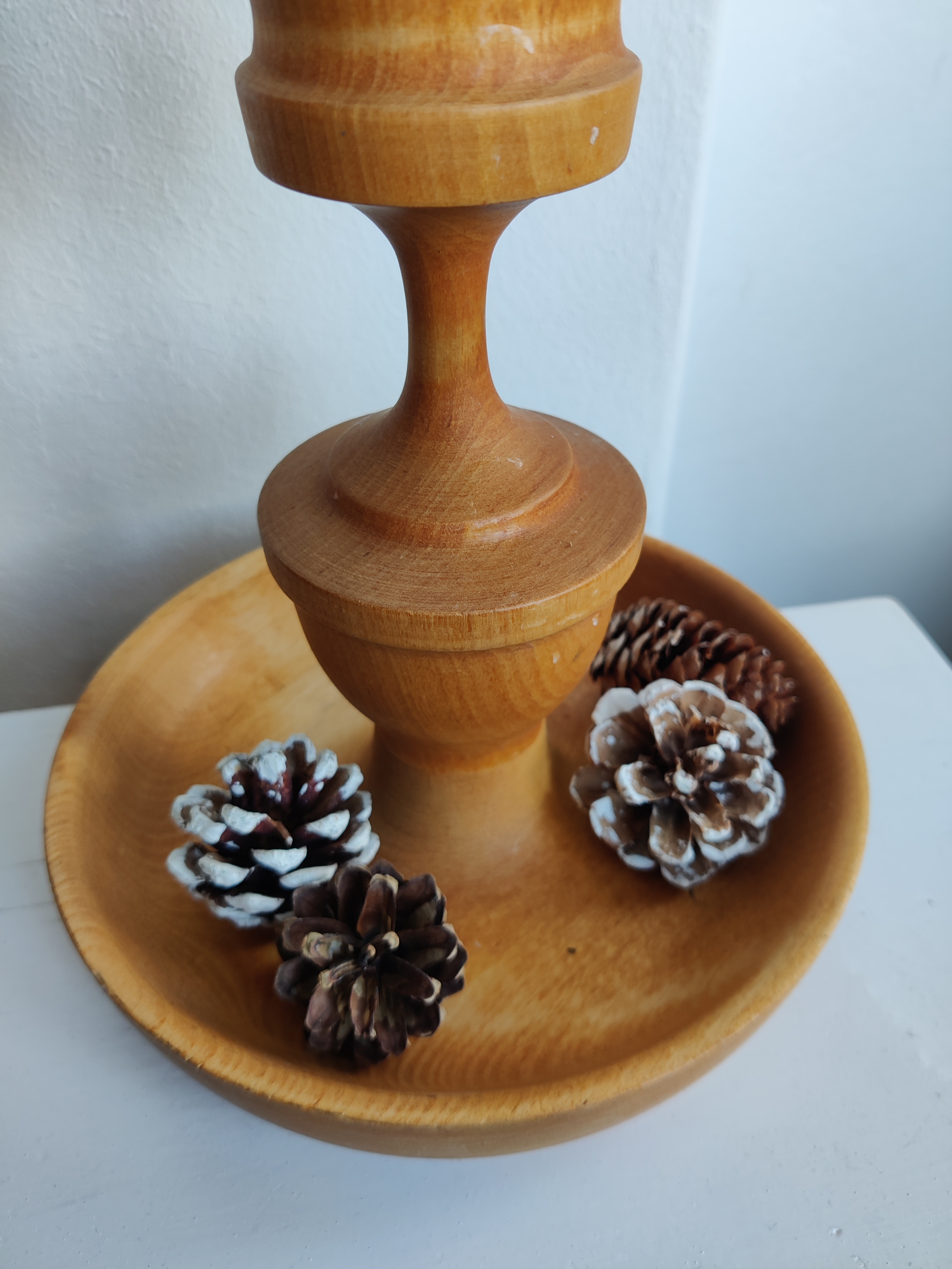 Stor og flot drejet træstage til bloklys eller årets kalenderlys - og med plads til fine pyntesager, nødder eller måske lidt juleslik. Den måler 23 x 18 cm cm og lyset kan have en diameter på 4 cm.