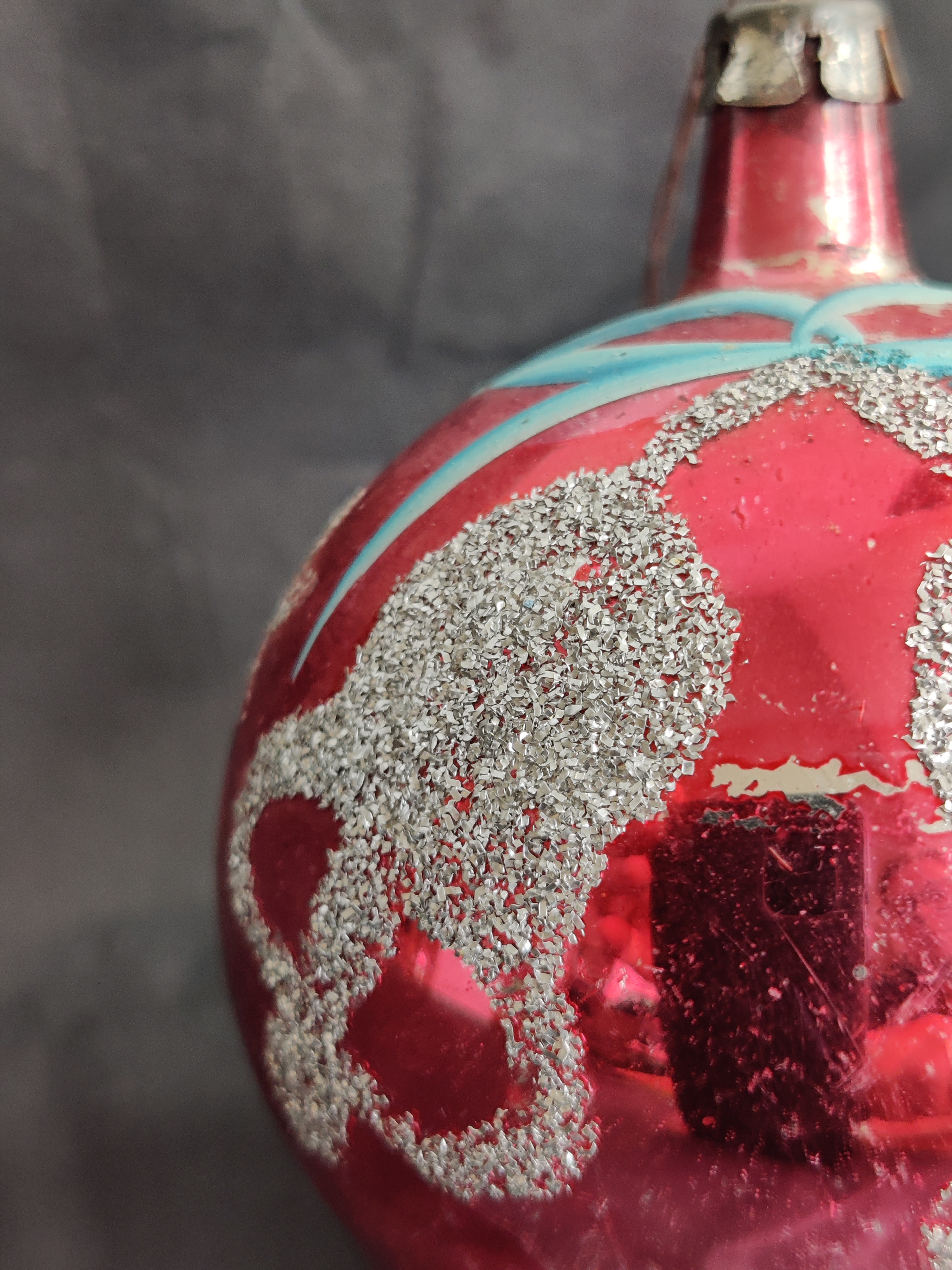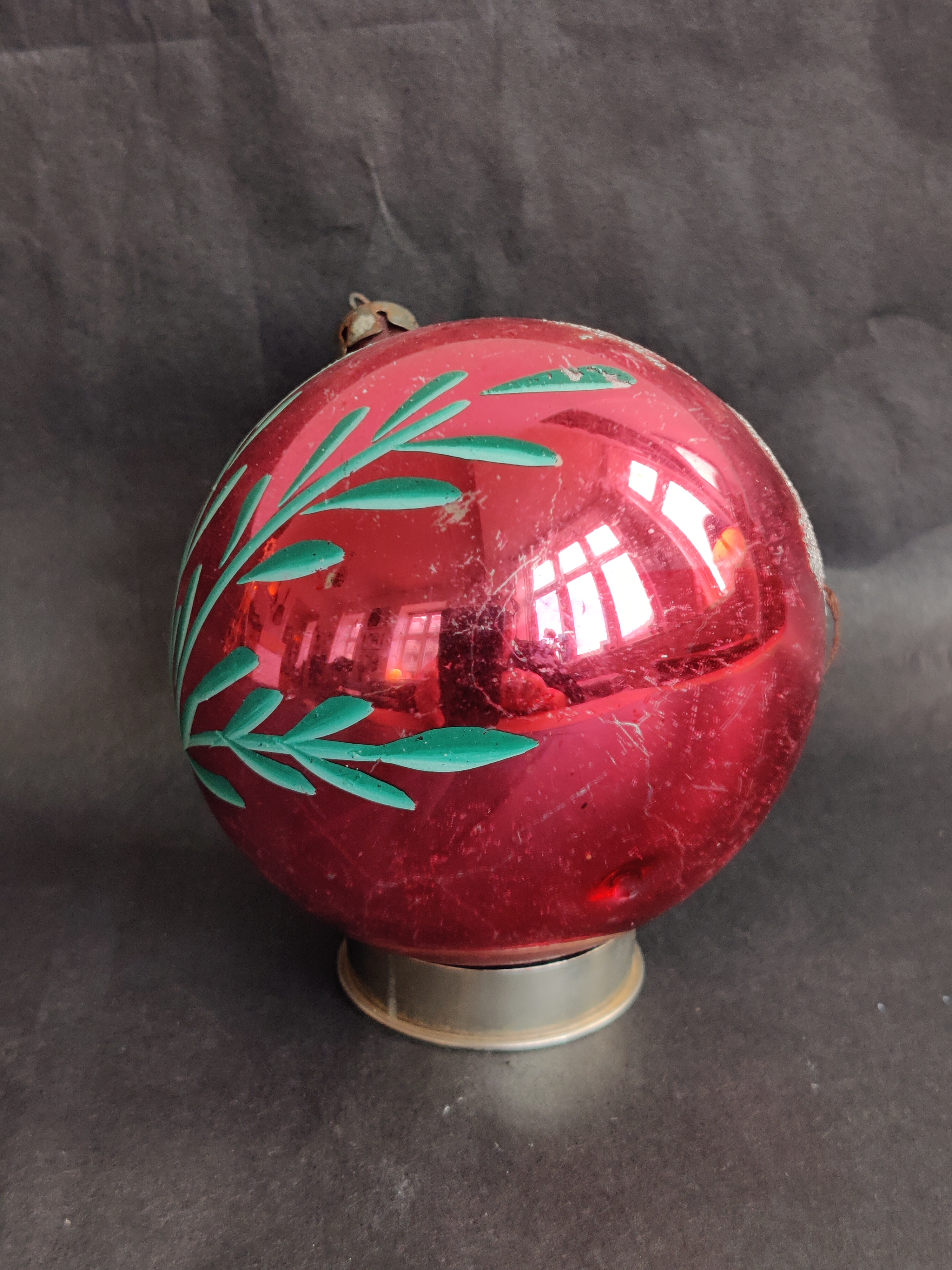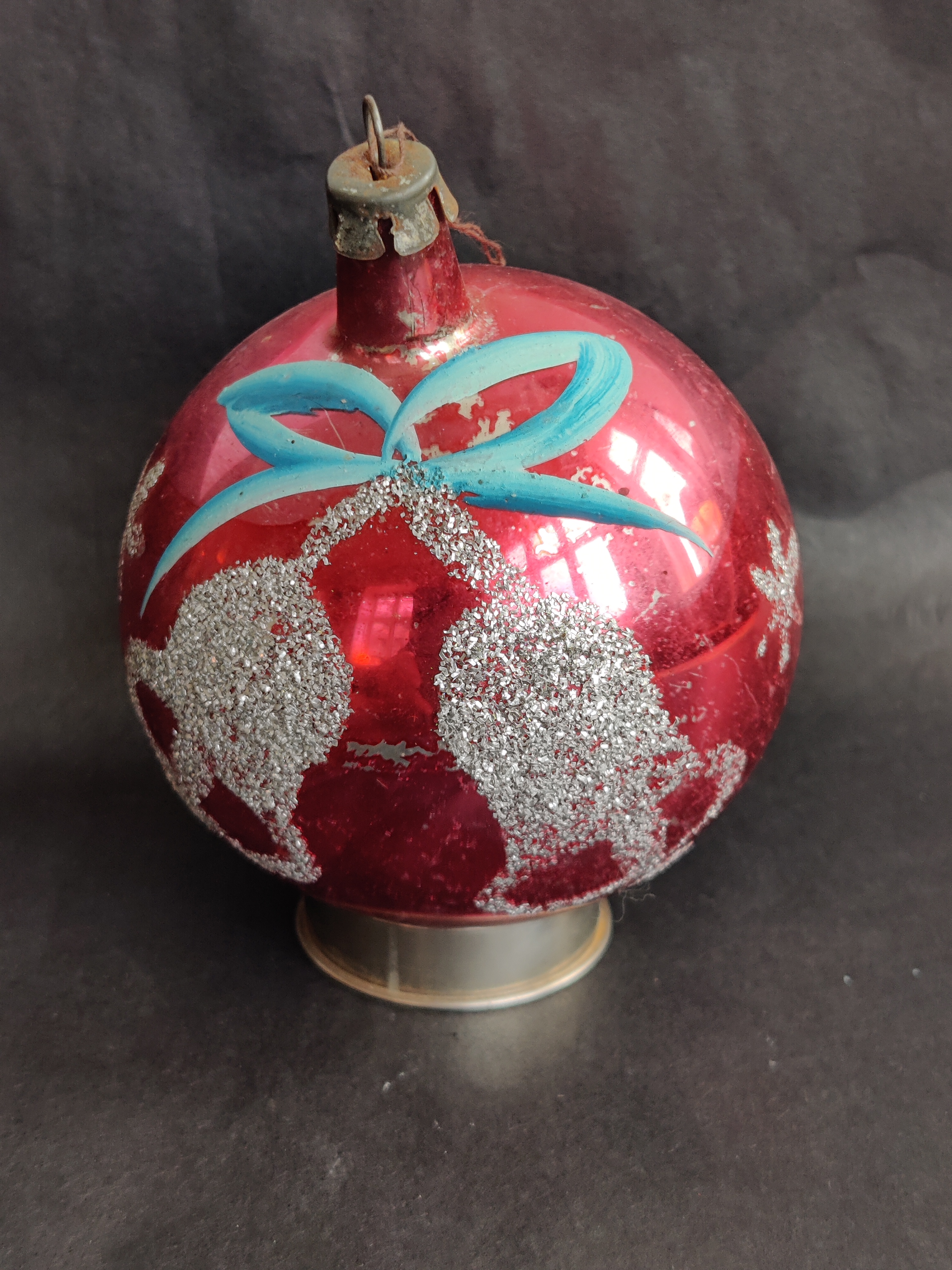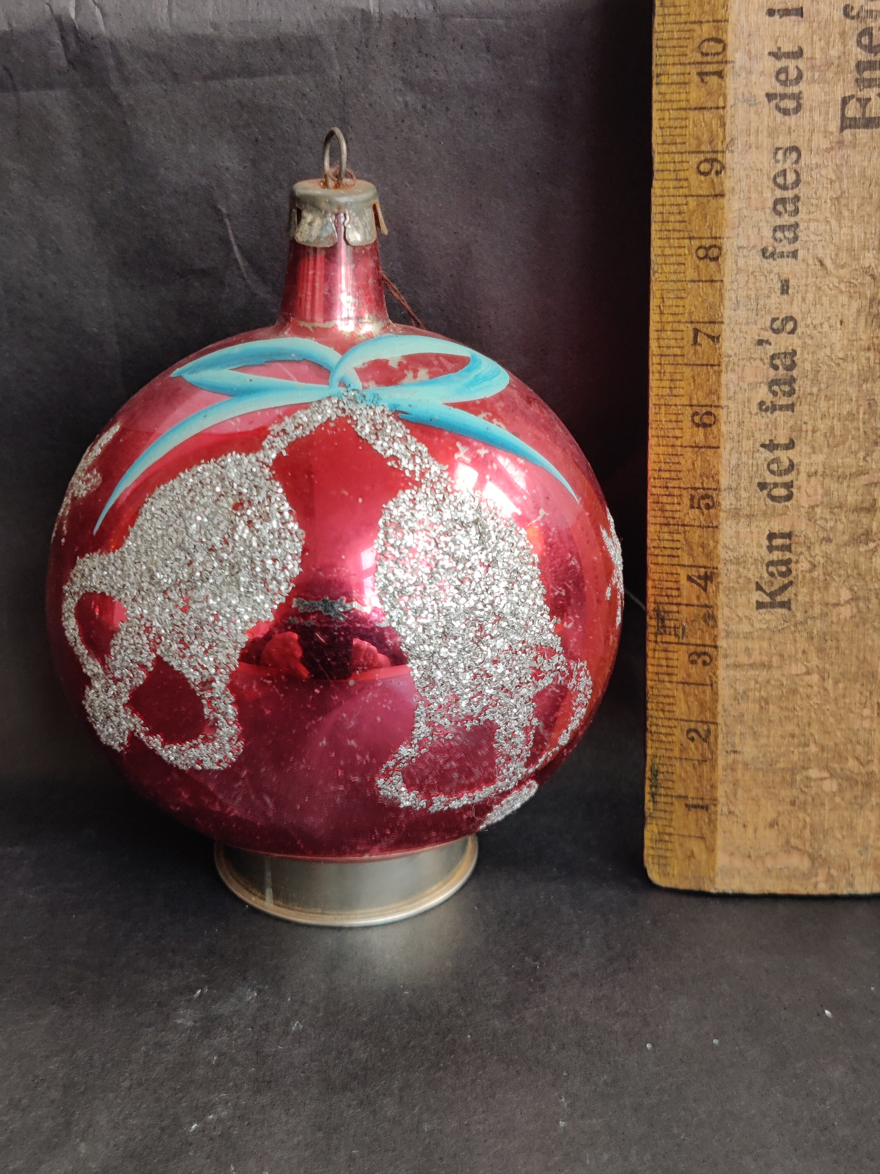 Rød/pink gammel julekugle med lækre sølvglimrende klokker, bånd og grene. Fra 1960'erne. Se mål på billede.