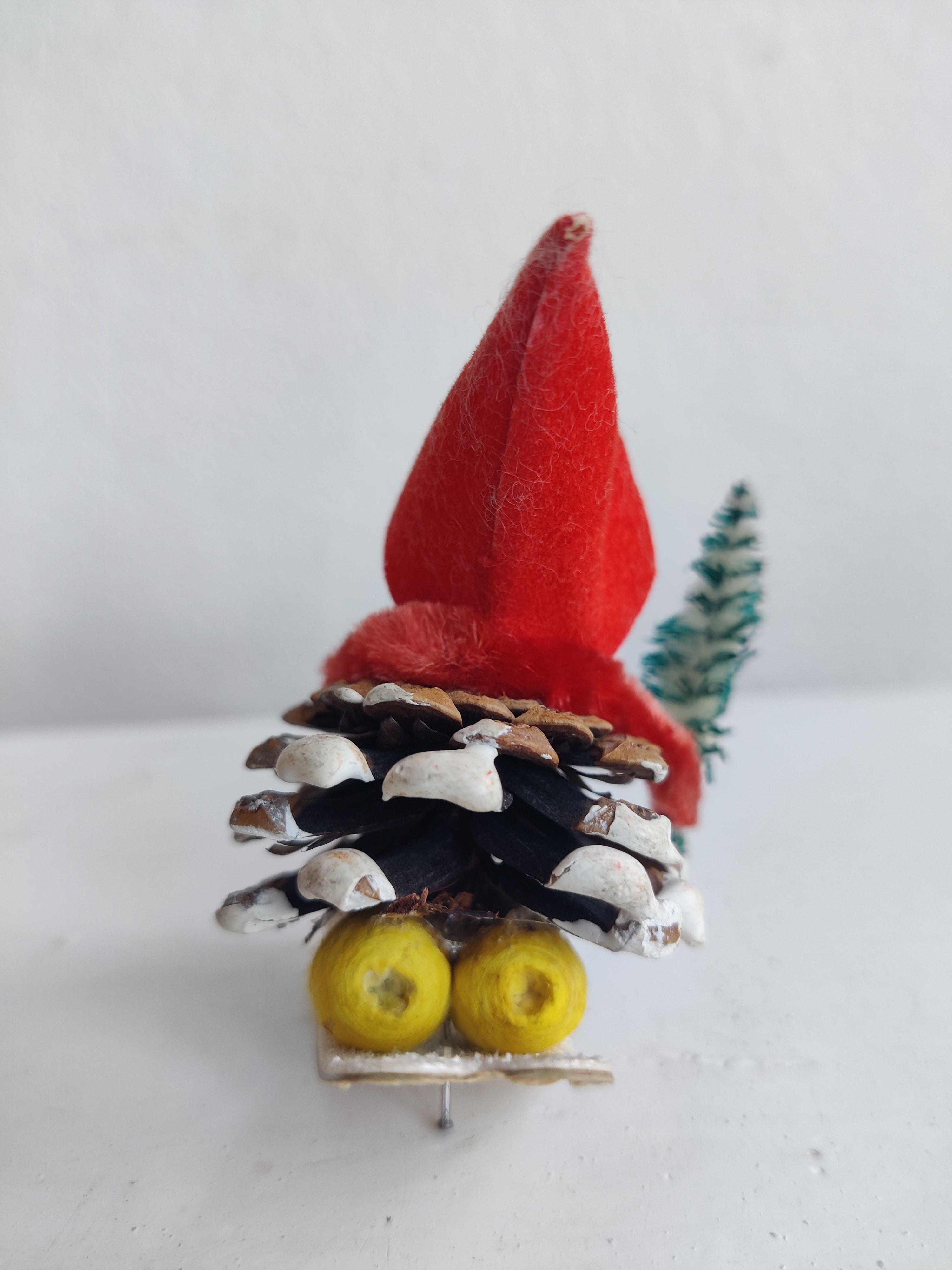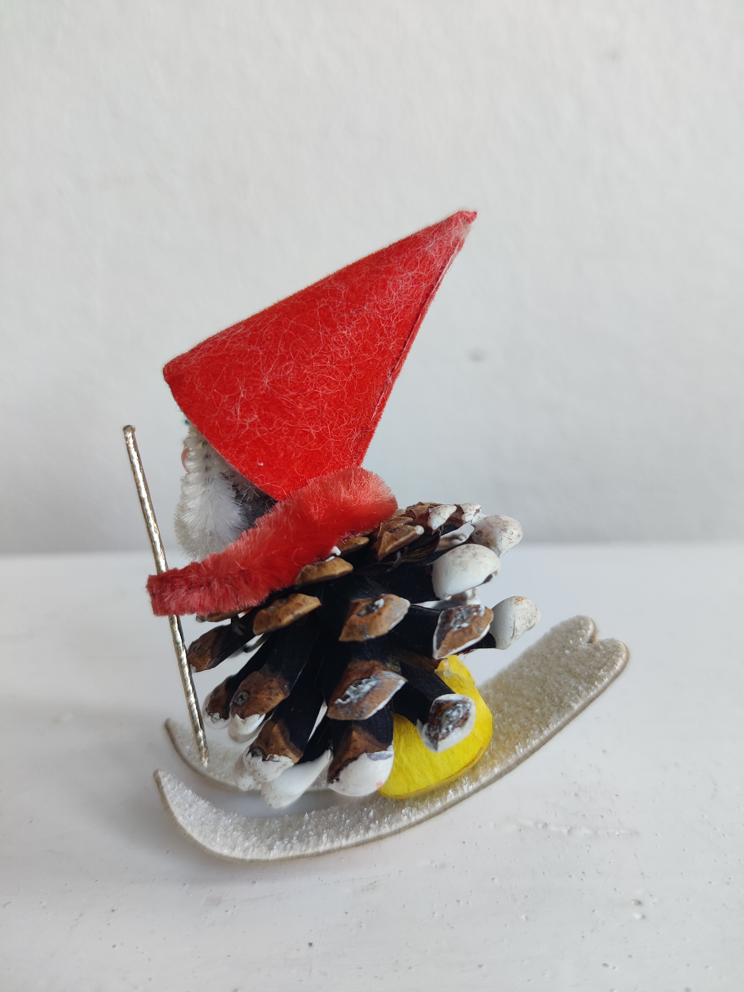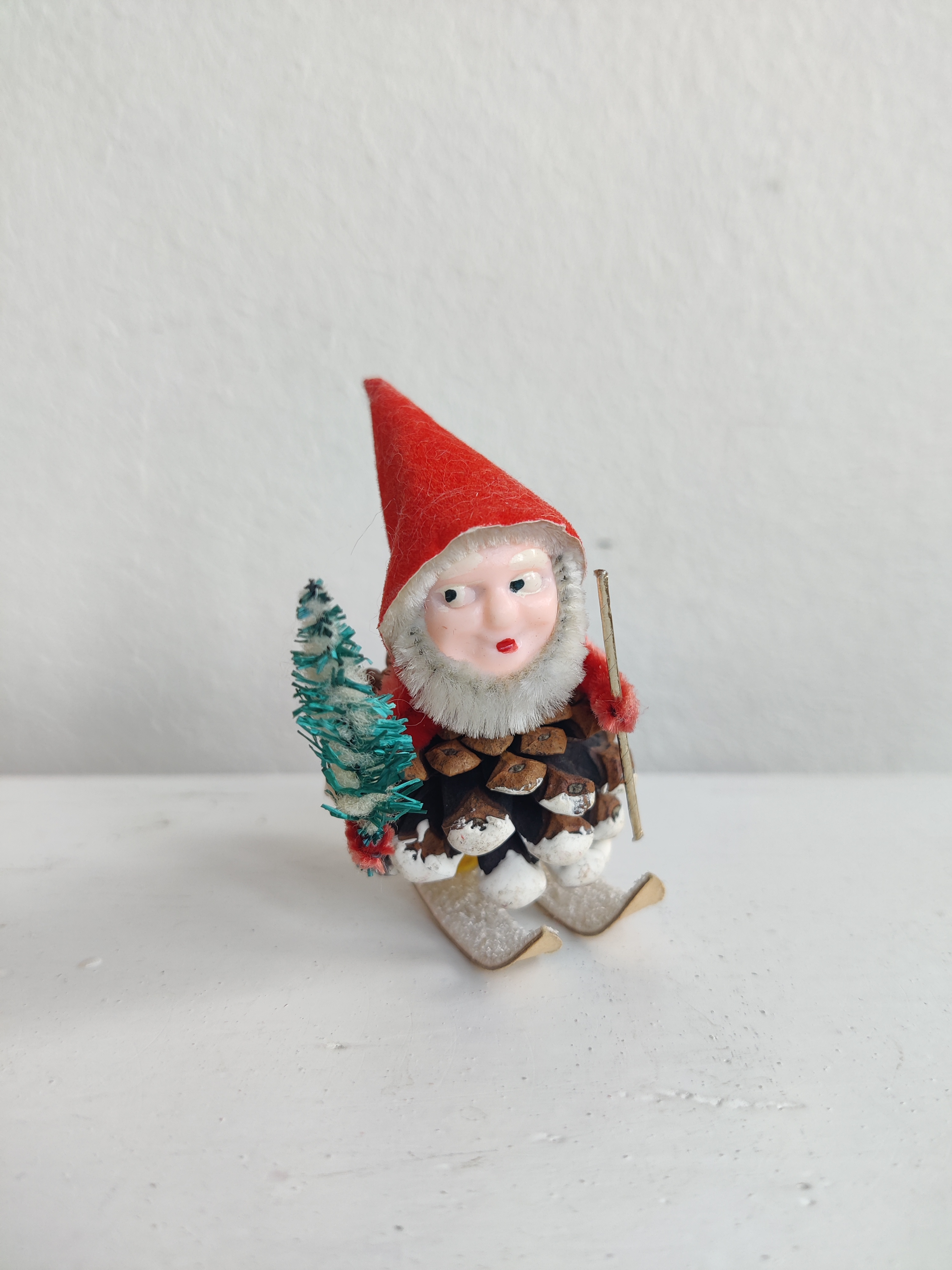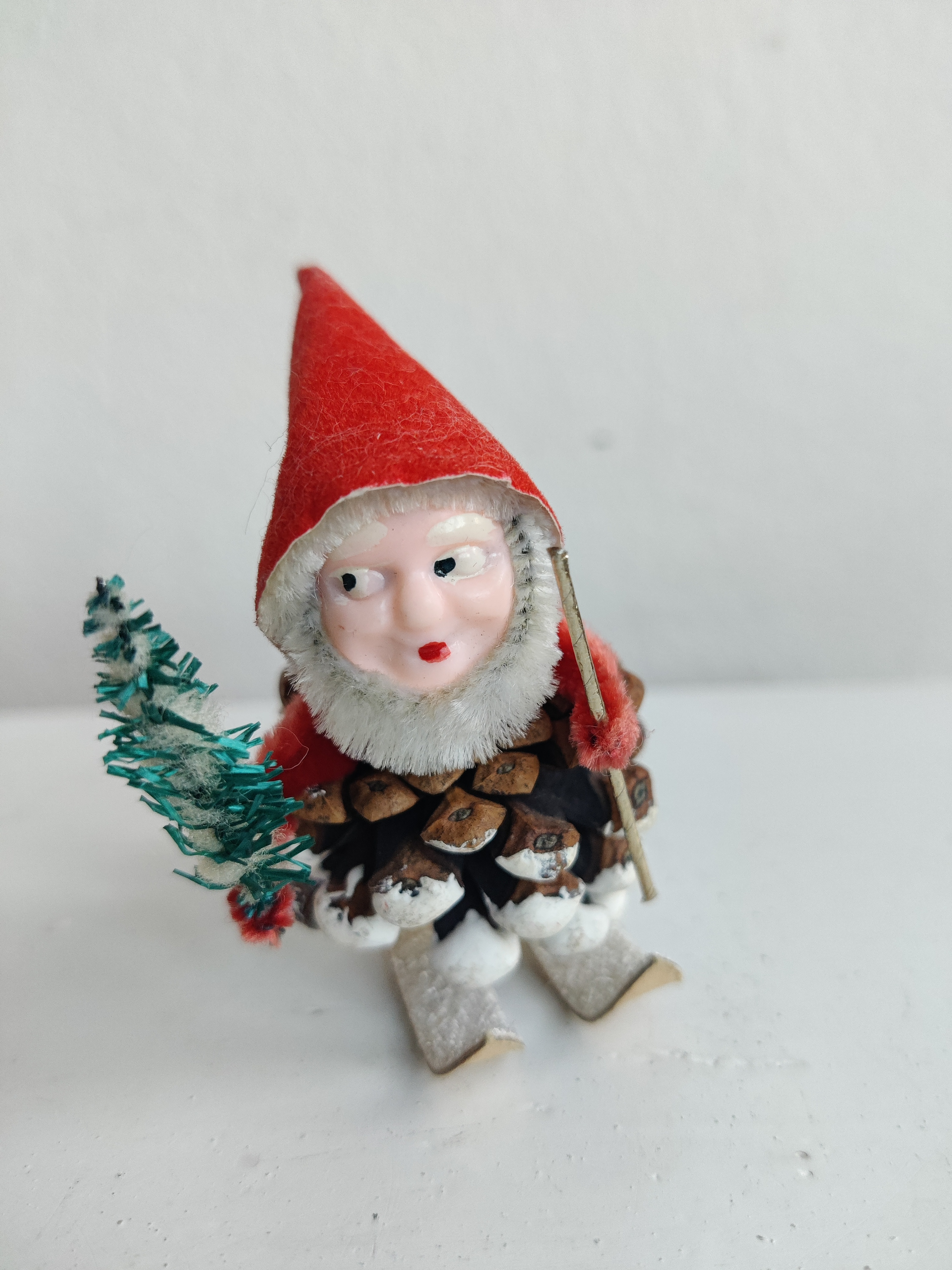 Gammel nissemand på ski med juletræet i den ene hånd. Han er lavet i Japan og importeret til Europa i 1950-1960'erne. Mål ca 6 x 6 cm.