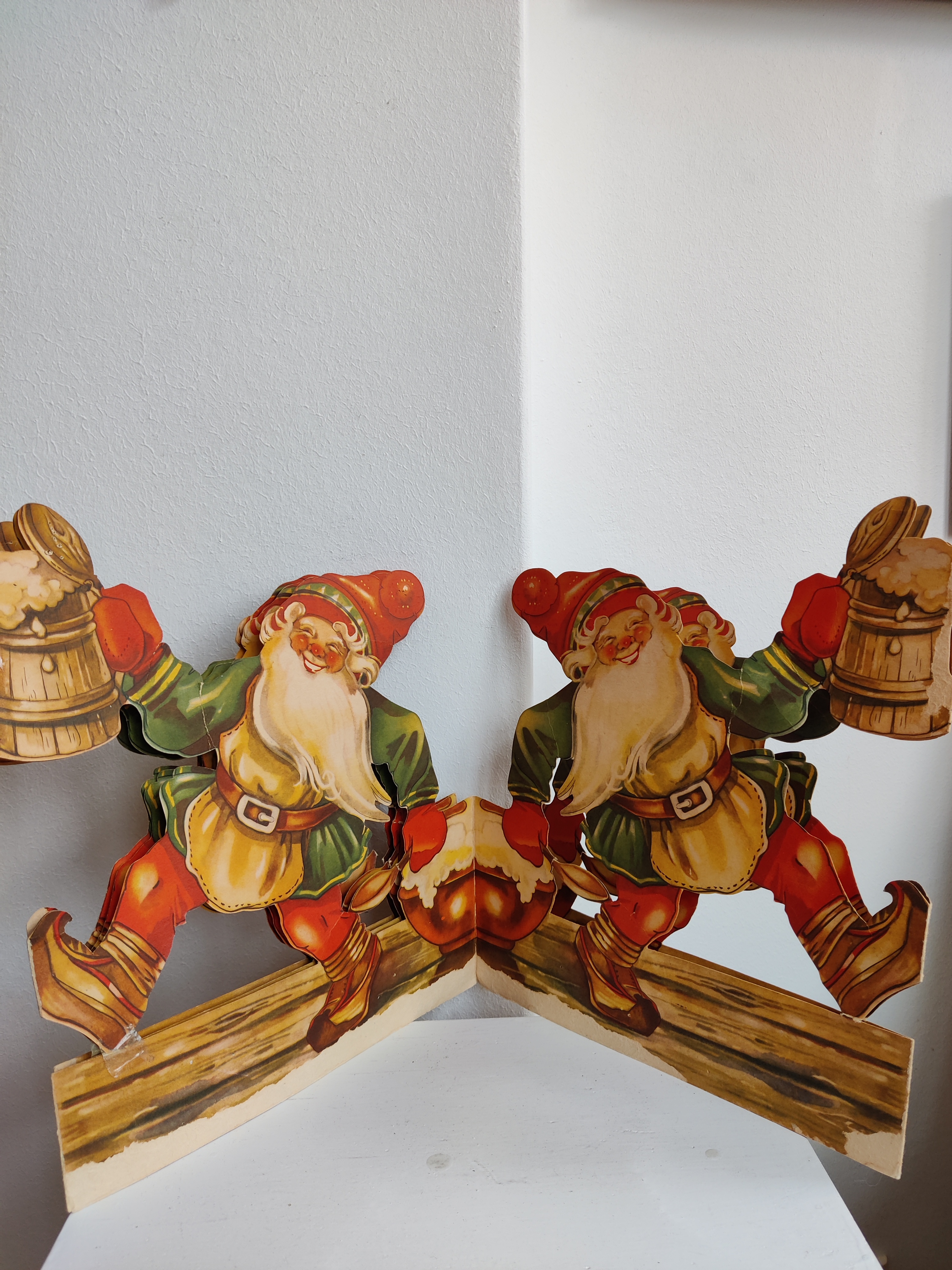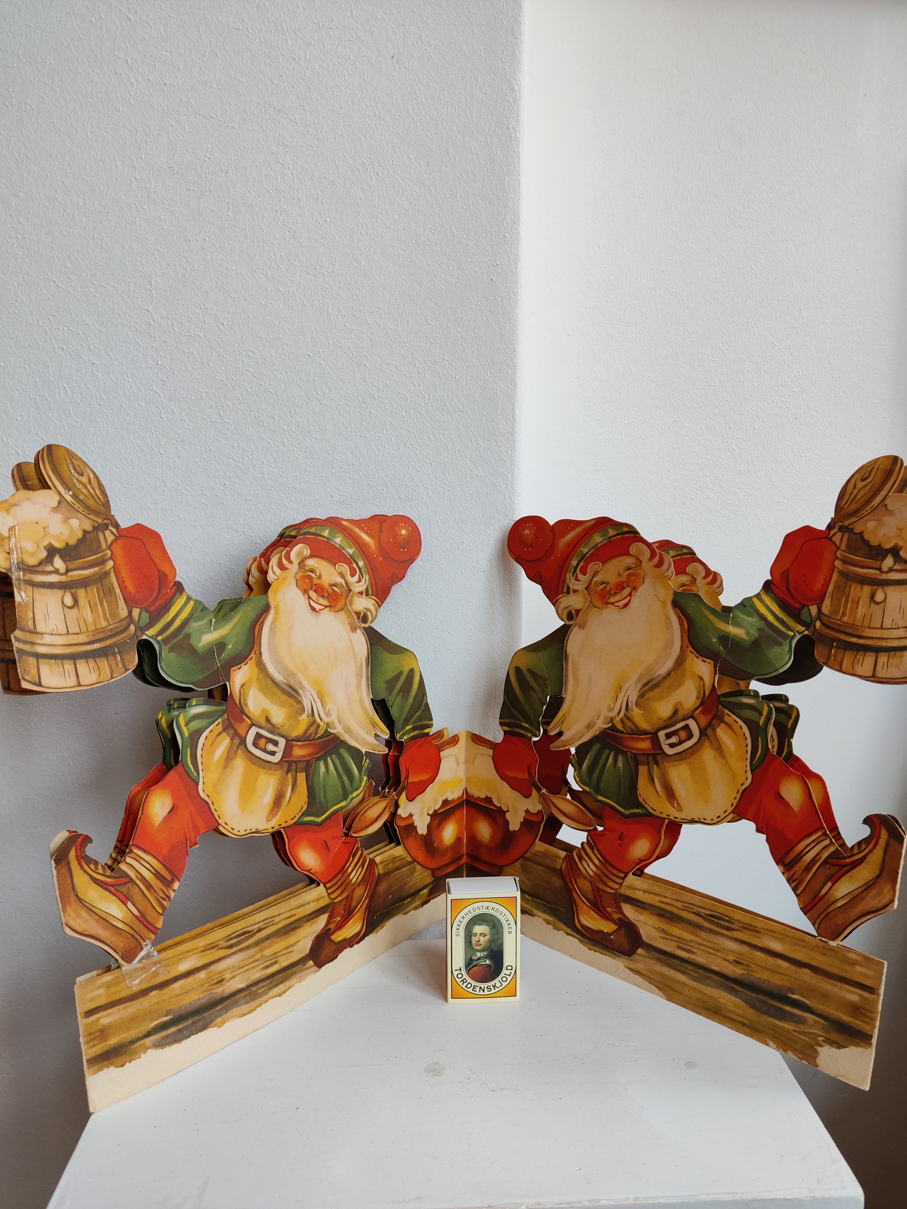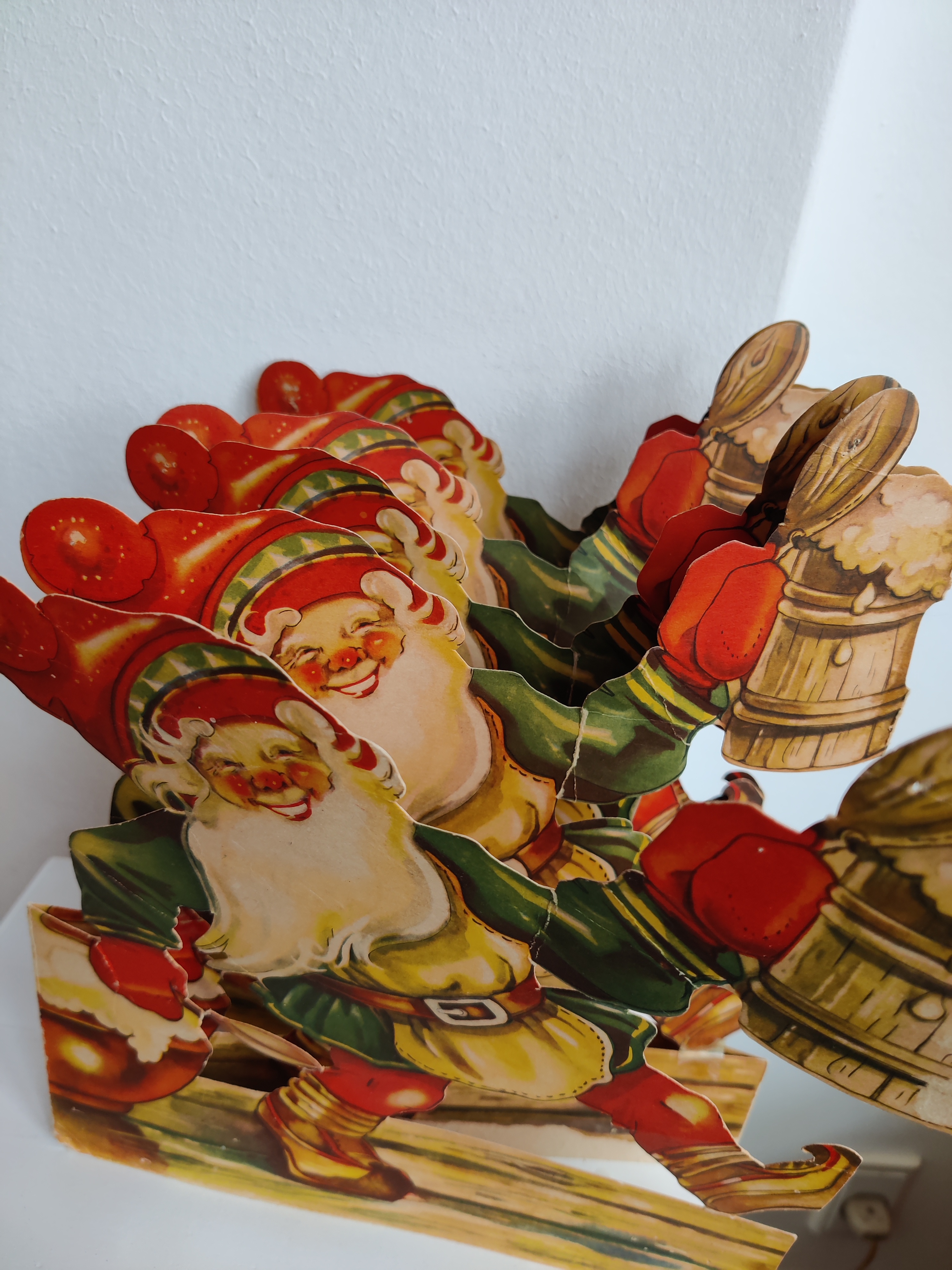 Fantastisk svensk nisseremse i en sjældent stor størrelse - med fuld fart på julefesten. Den har patina og reperationer, men er noget så flot. Mål 28 i højden, 24 i bredden. Folder ud til fuld længde af 120 cm.
