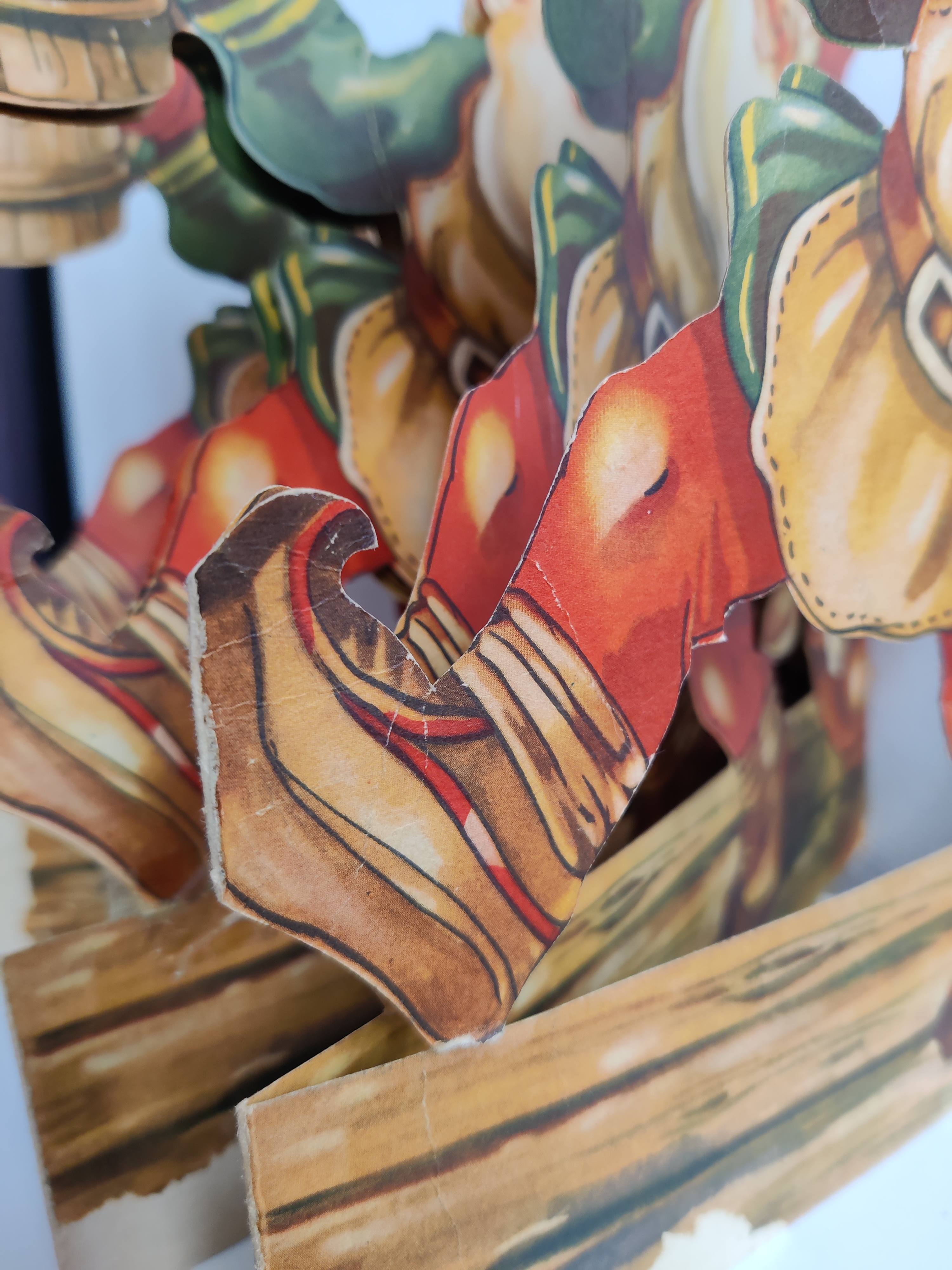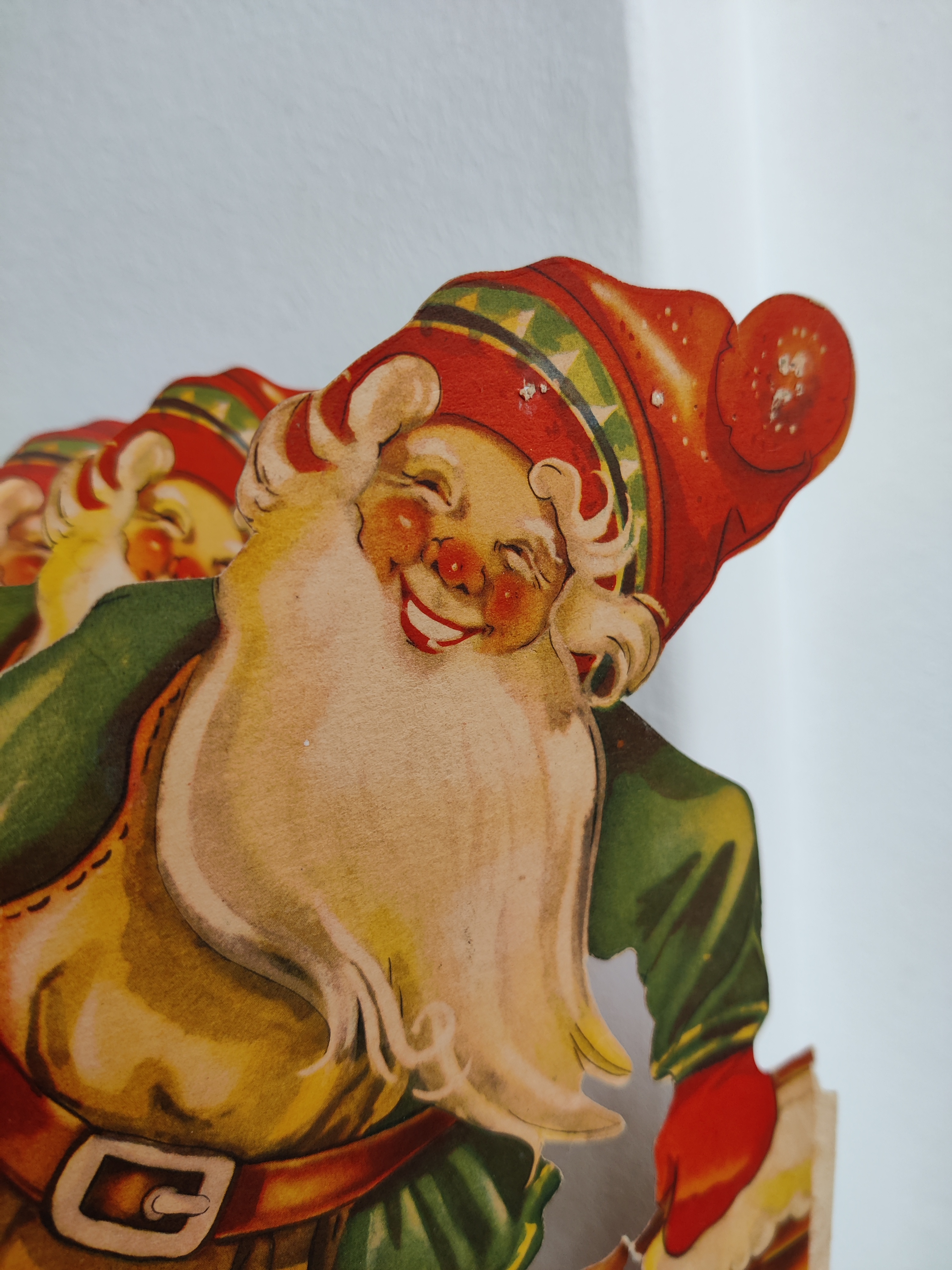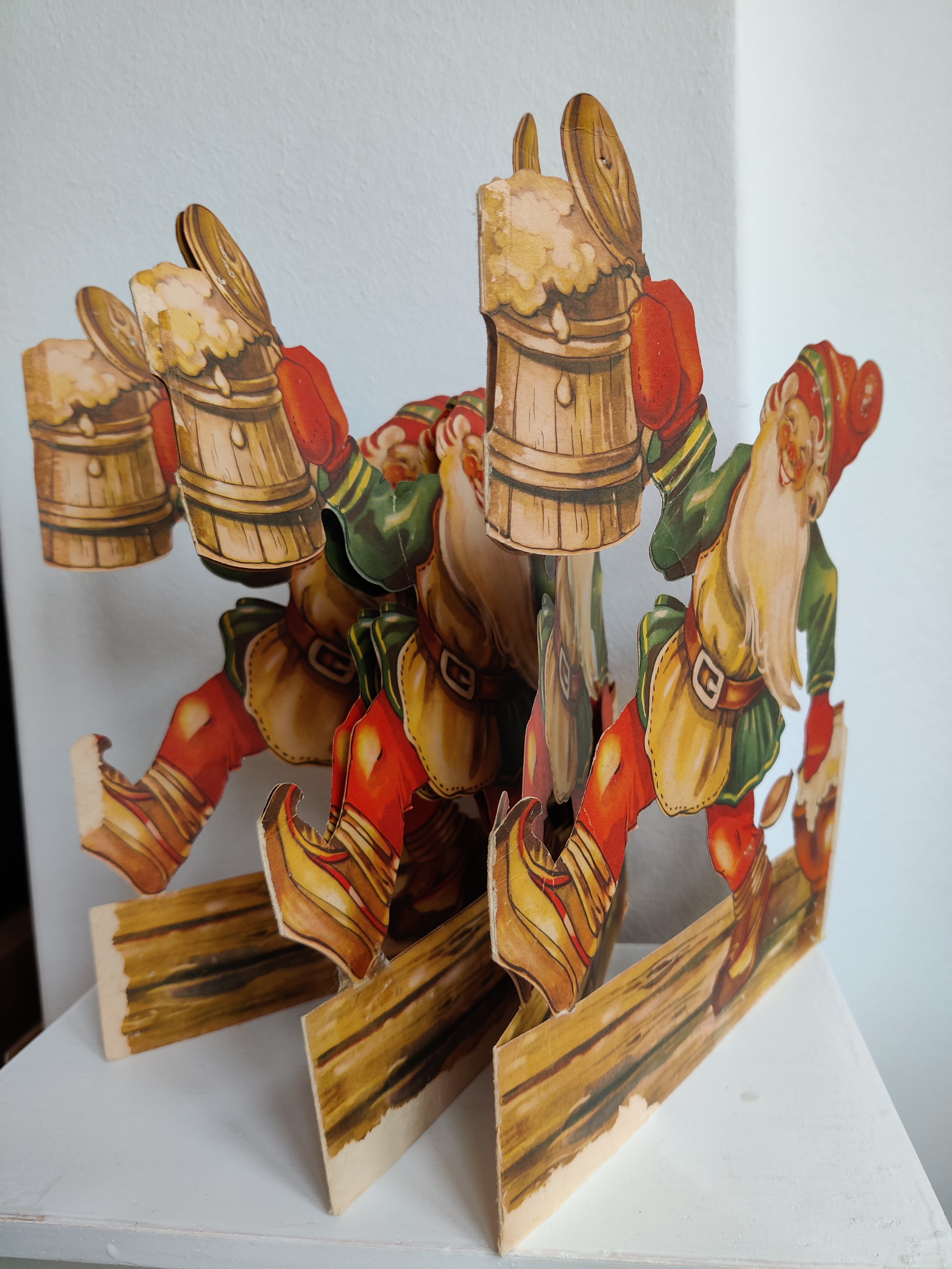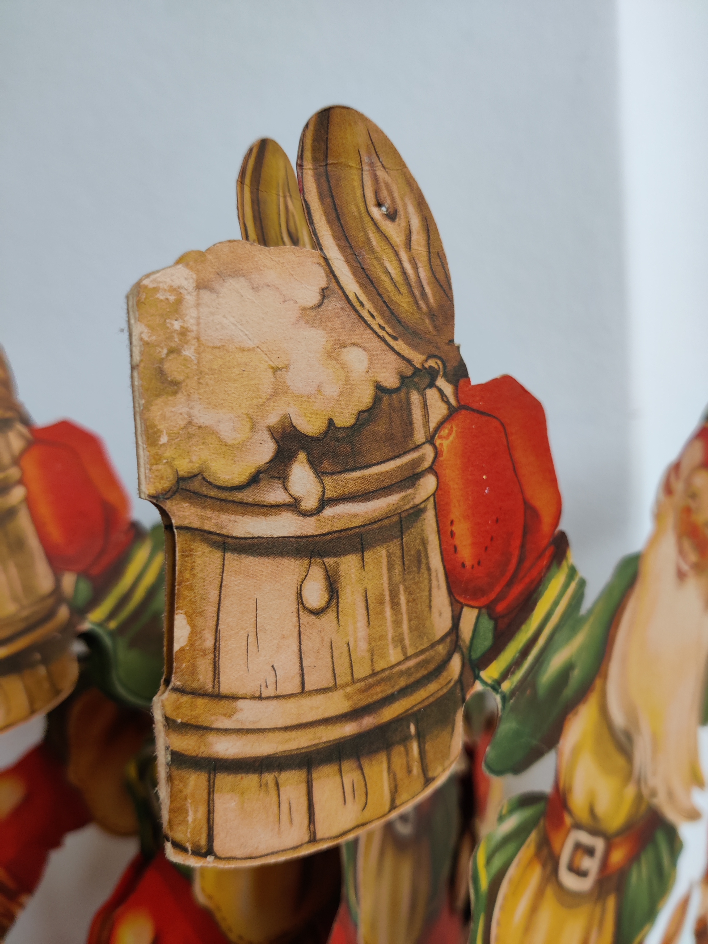 Fantastisk svensk nisseremse i en sjældent stor størrelse - med fuld fart på julefesten. Den har patina og reperationer, men er noget så flot. Mål 28 i højden, 24 i bredden. Folder ud til fuld længde af 120 cm.