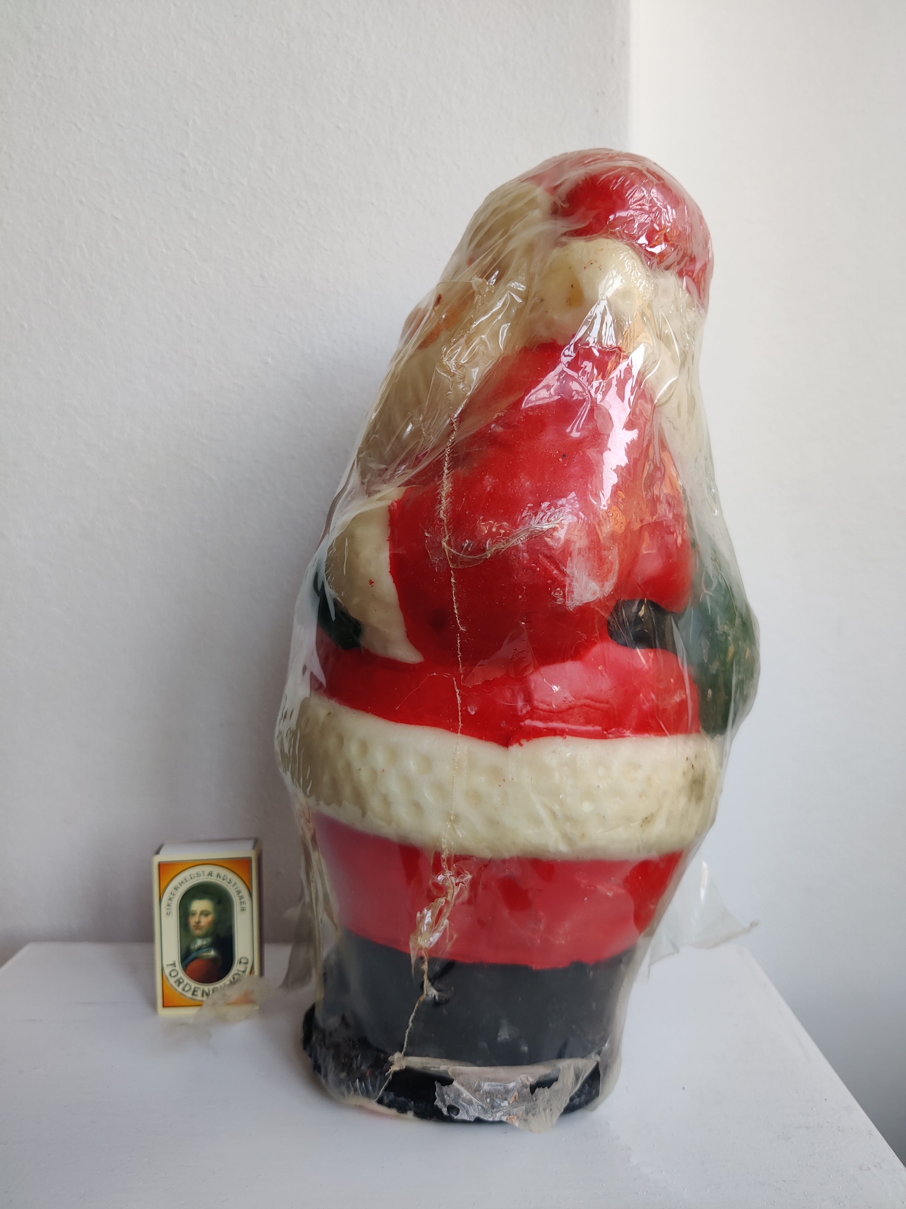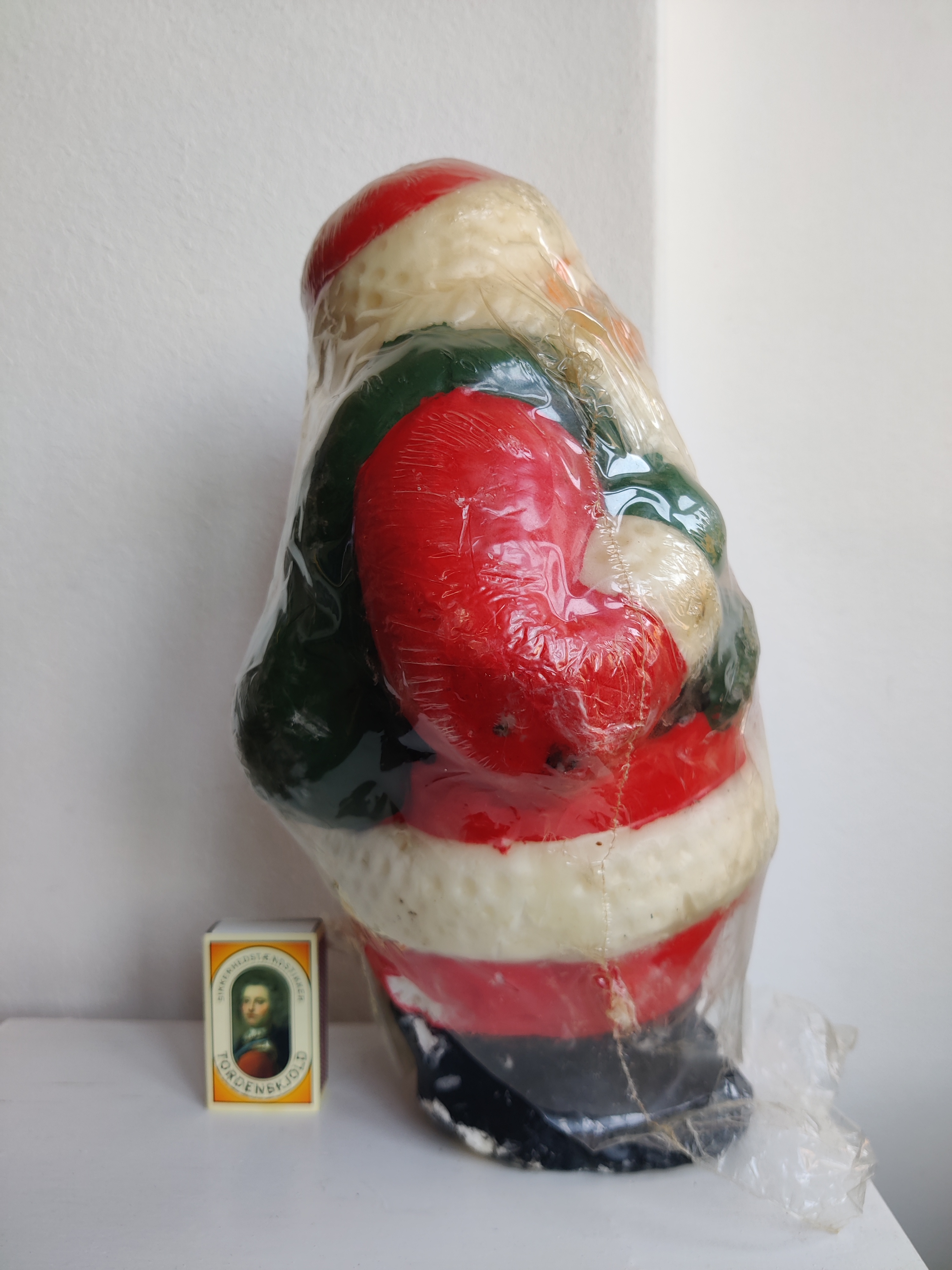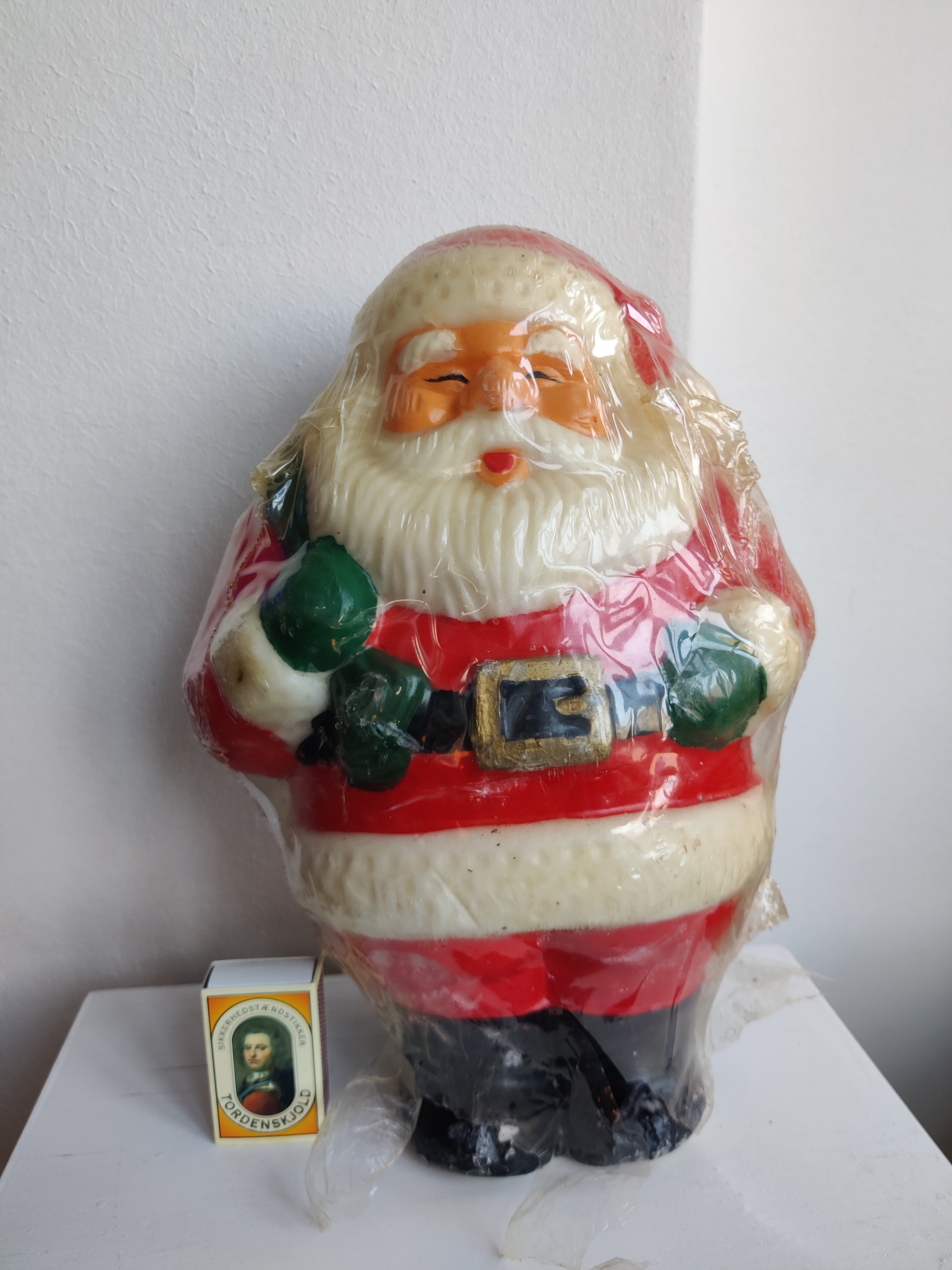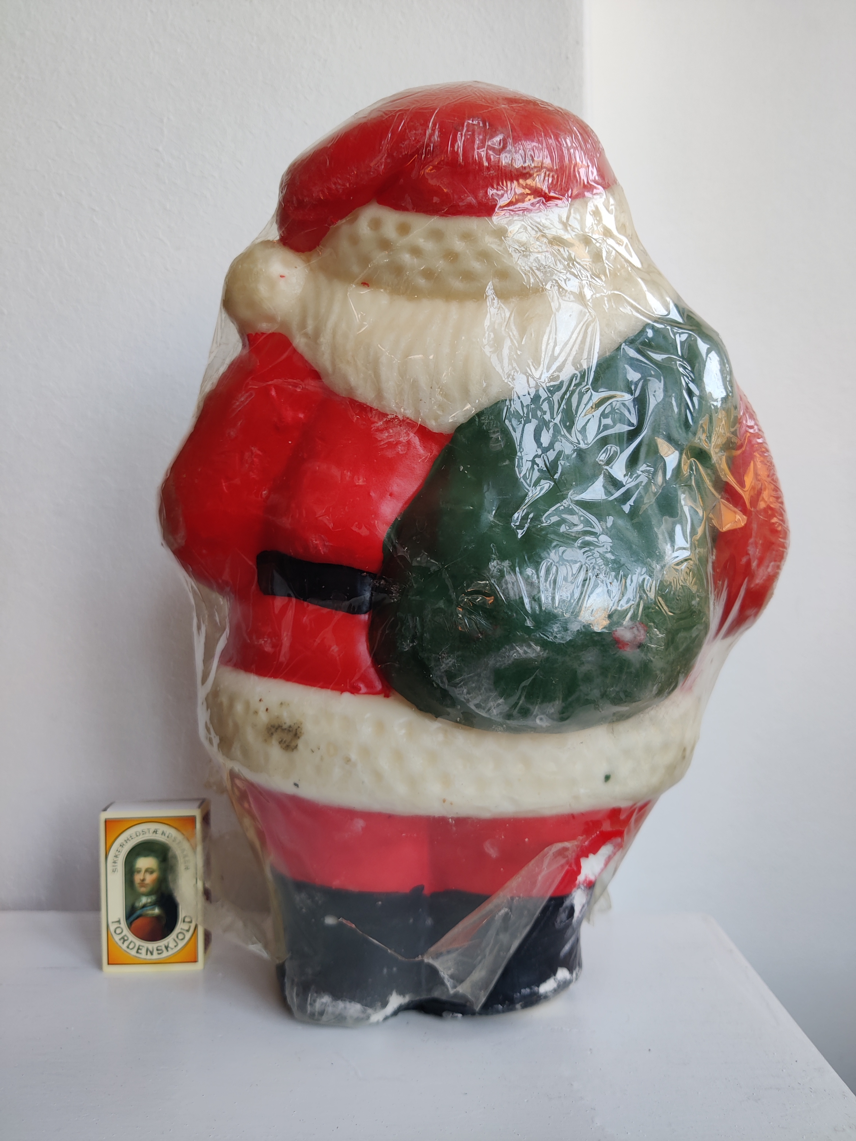Engang i 1970'erne eller 1980'erne har nogen købt denne enorme julemand i stearin, men ikke nænnet at tænde vægen. Derfor findes han endnu i sin folie, med et par skrammer, som kan ses på fotos, men stadig stor og hyggelig. Figurlys var ikke normalt så store, så det er seriøst imponerende. Højde 30 cm, bredde 23 cm.