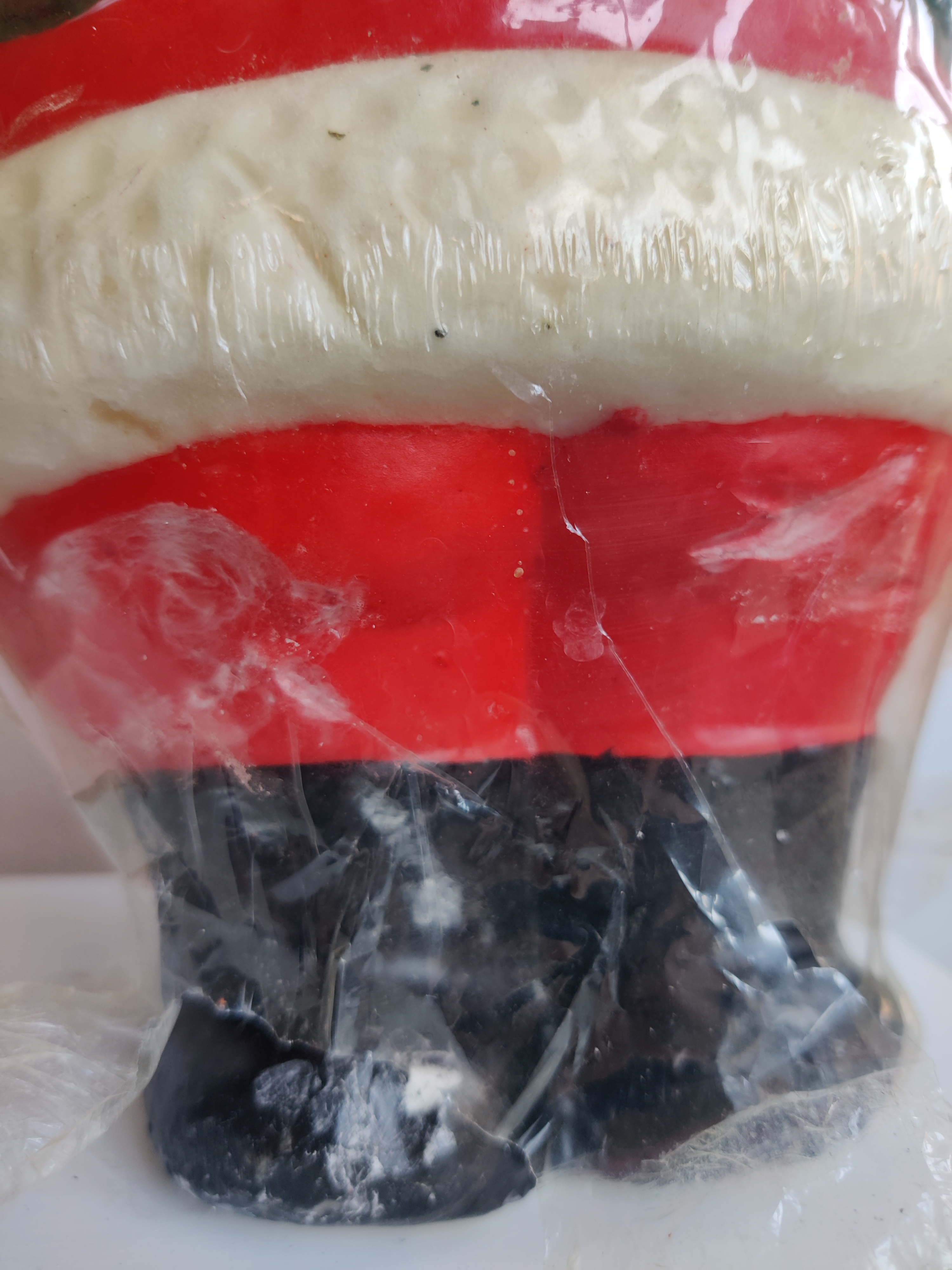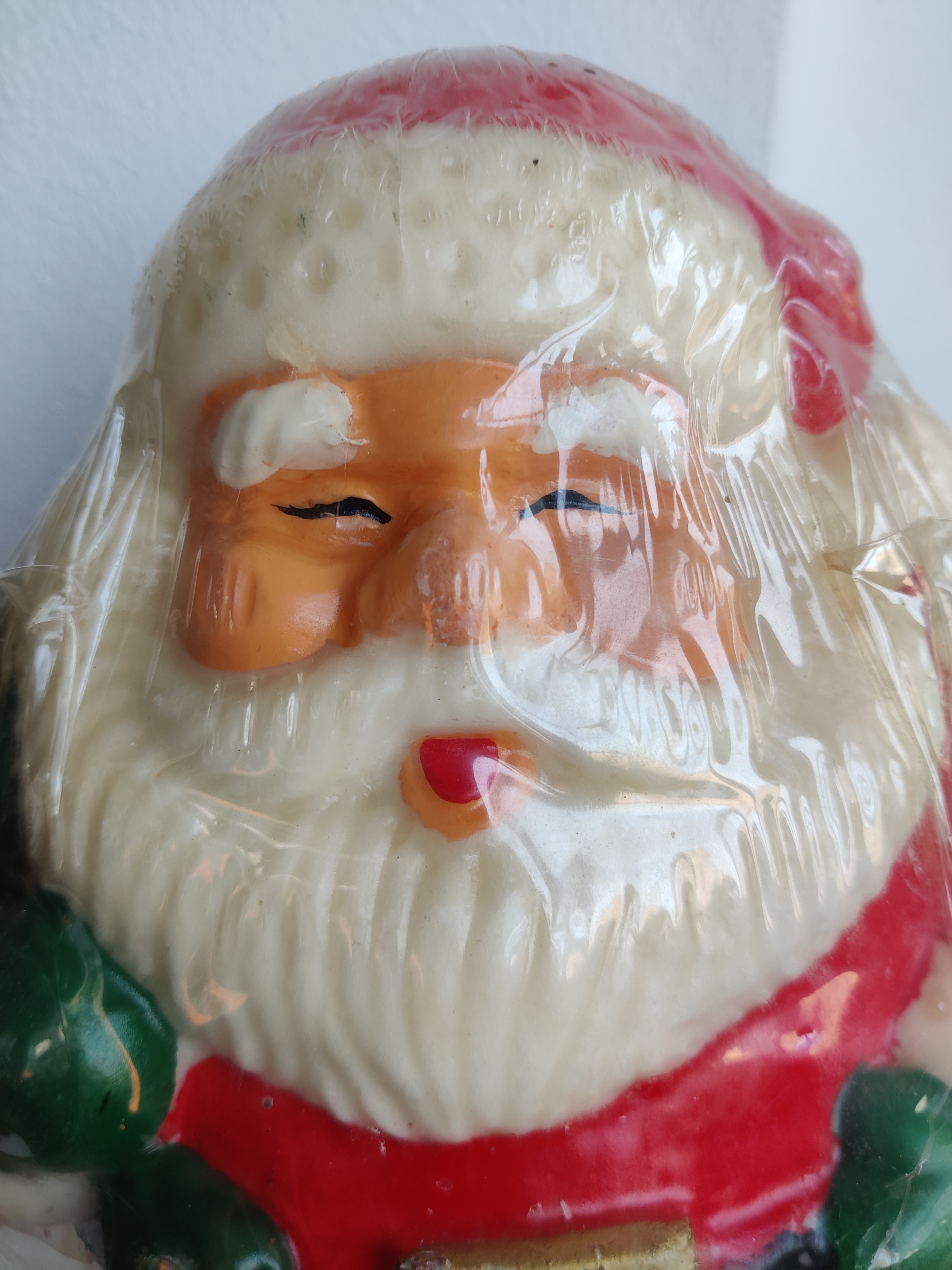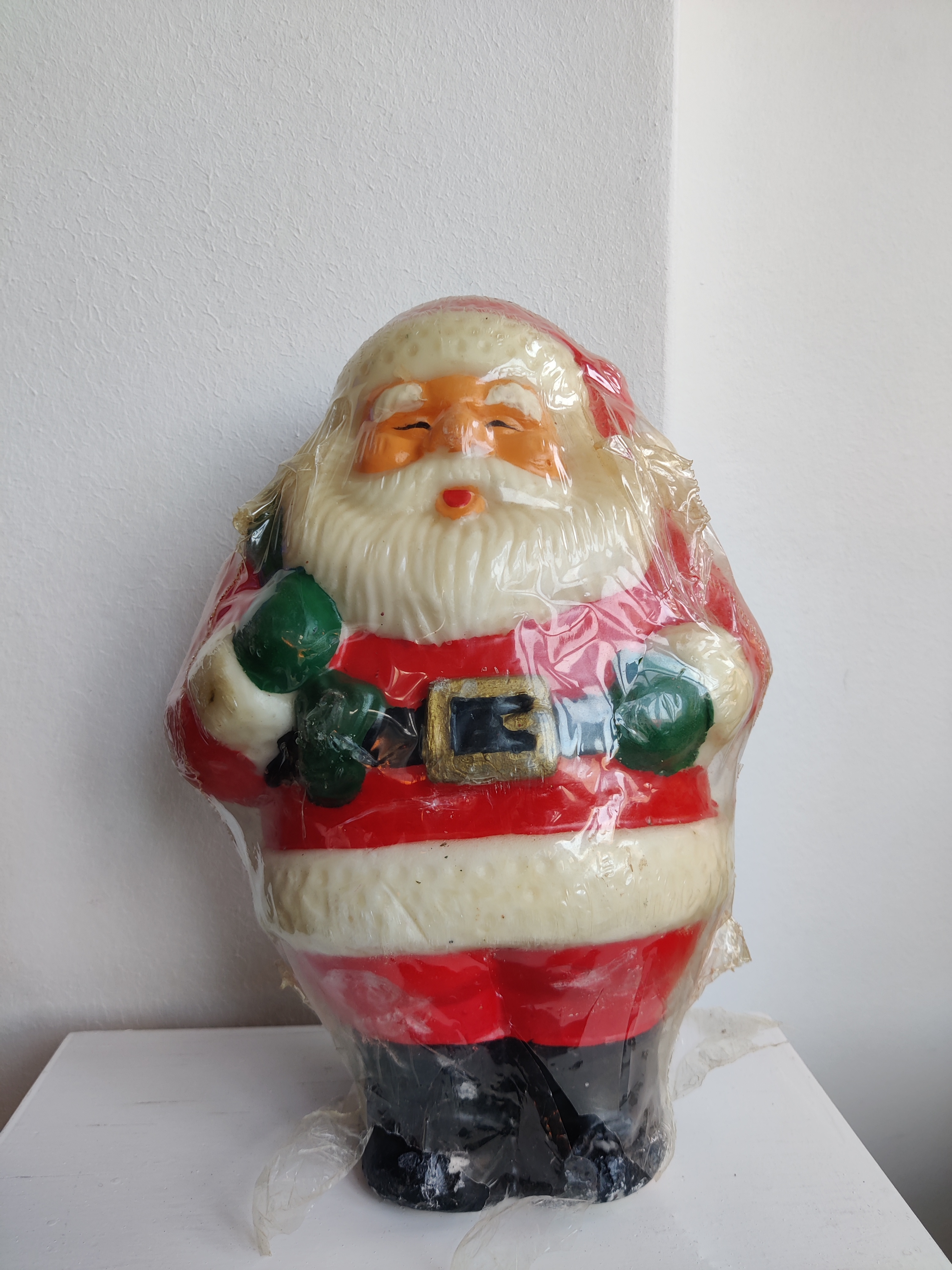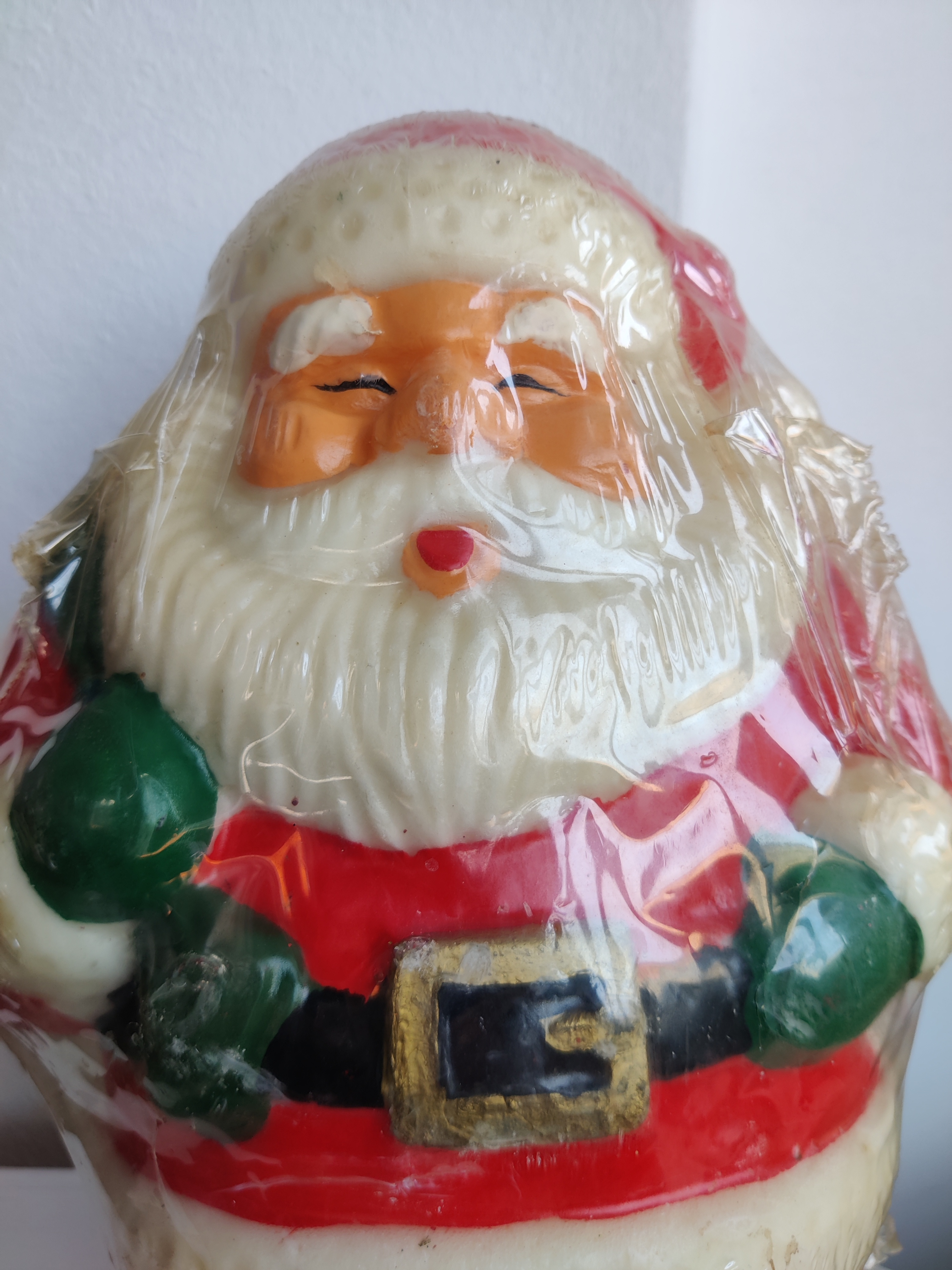 Engang i 1970'erne eller 1980'erne har nogen købt denne enorme julemand i stearin, men ikke nænnet at tænde vægen. Derfor findes han endnu i sin folie, med et par skrammer, som kan ses på fotos, men stadig stor og hyggelig. Figurlys var ikke normalt så store, så det er seriøst imponerende. Højde 30 cm, bredde 23 cm.