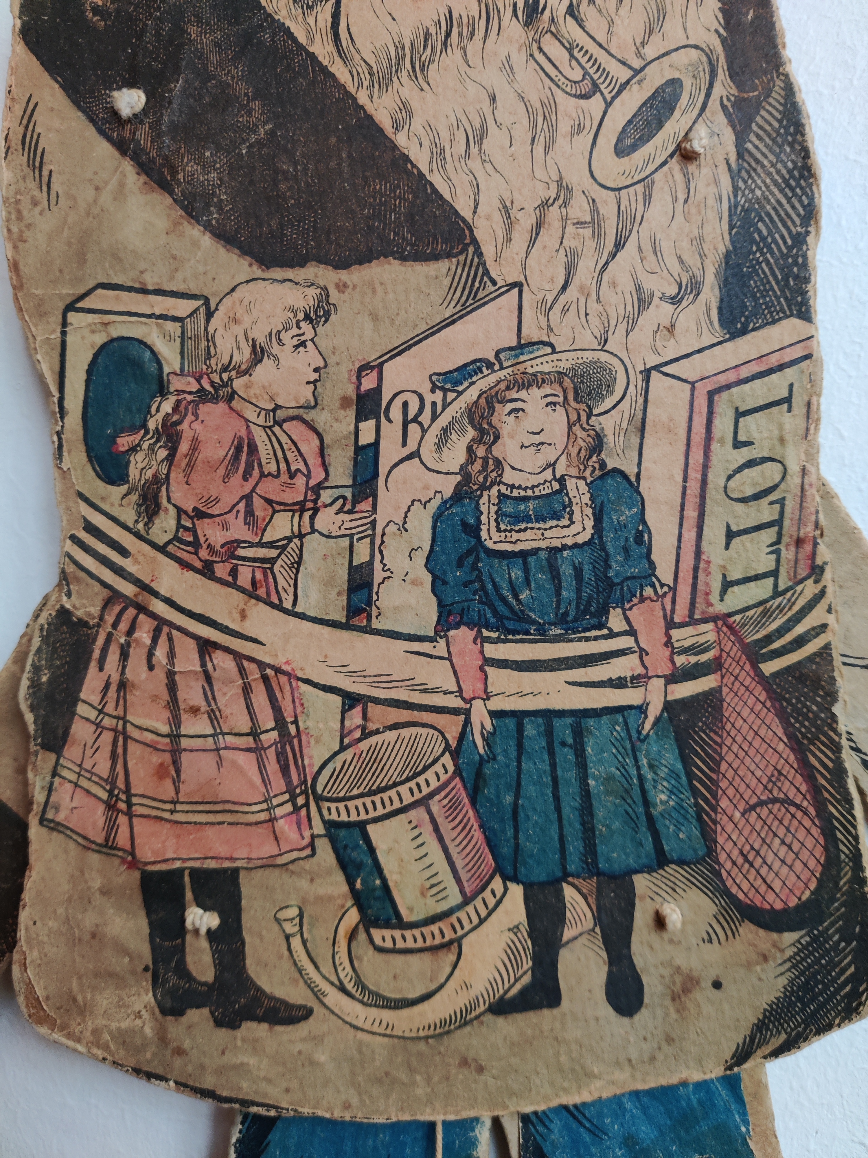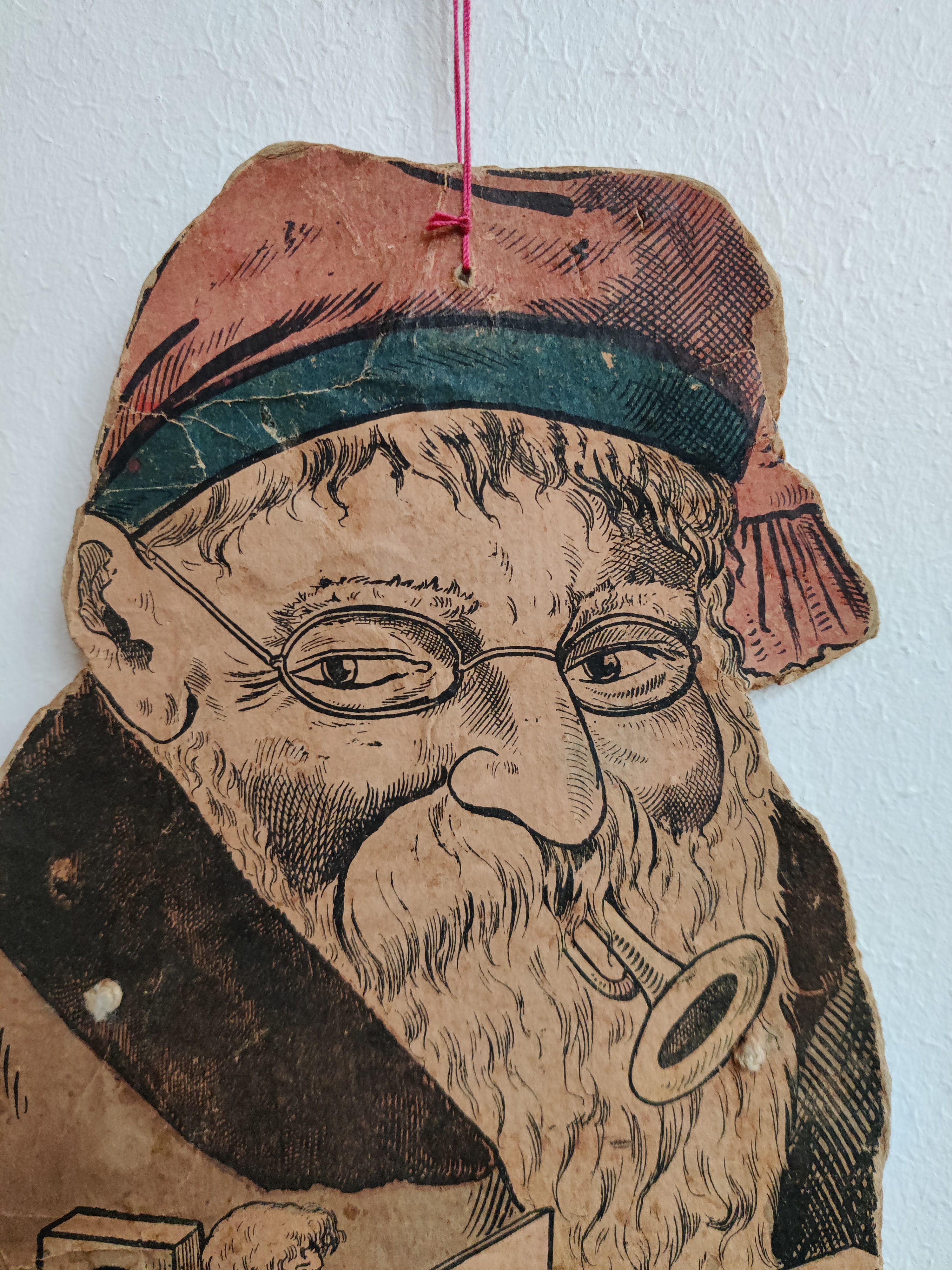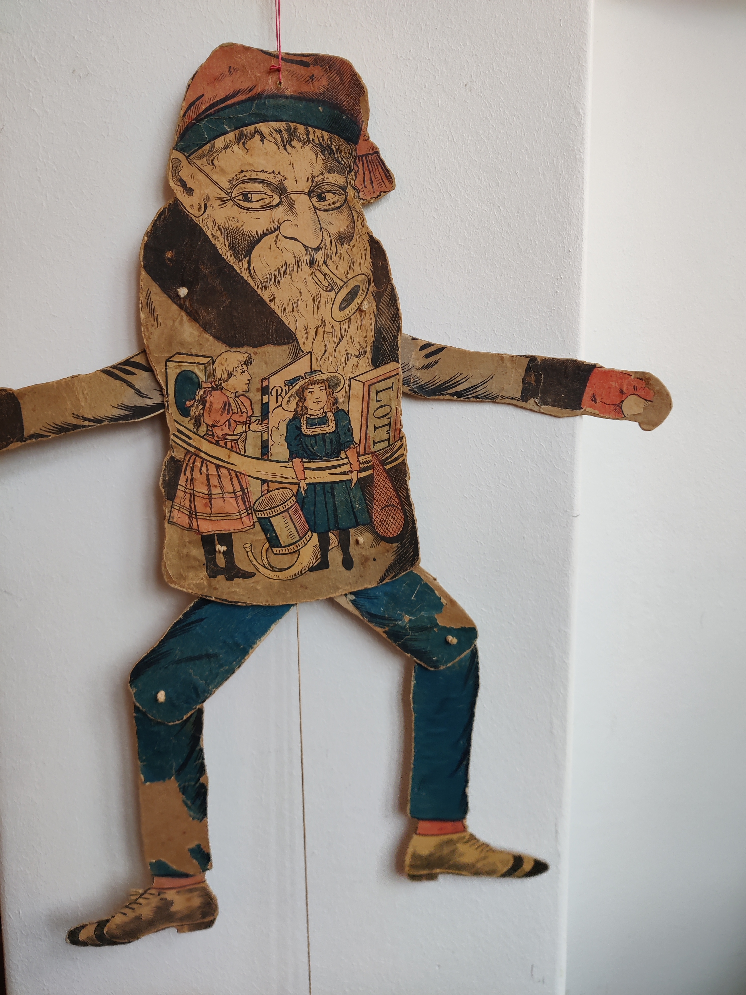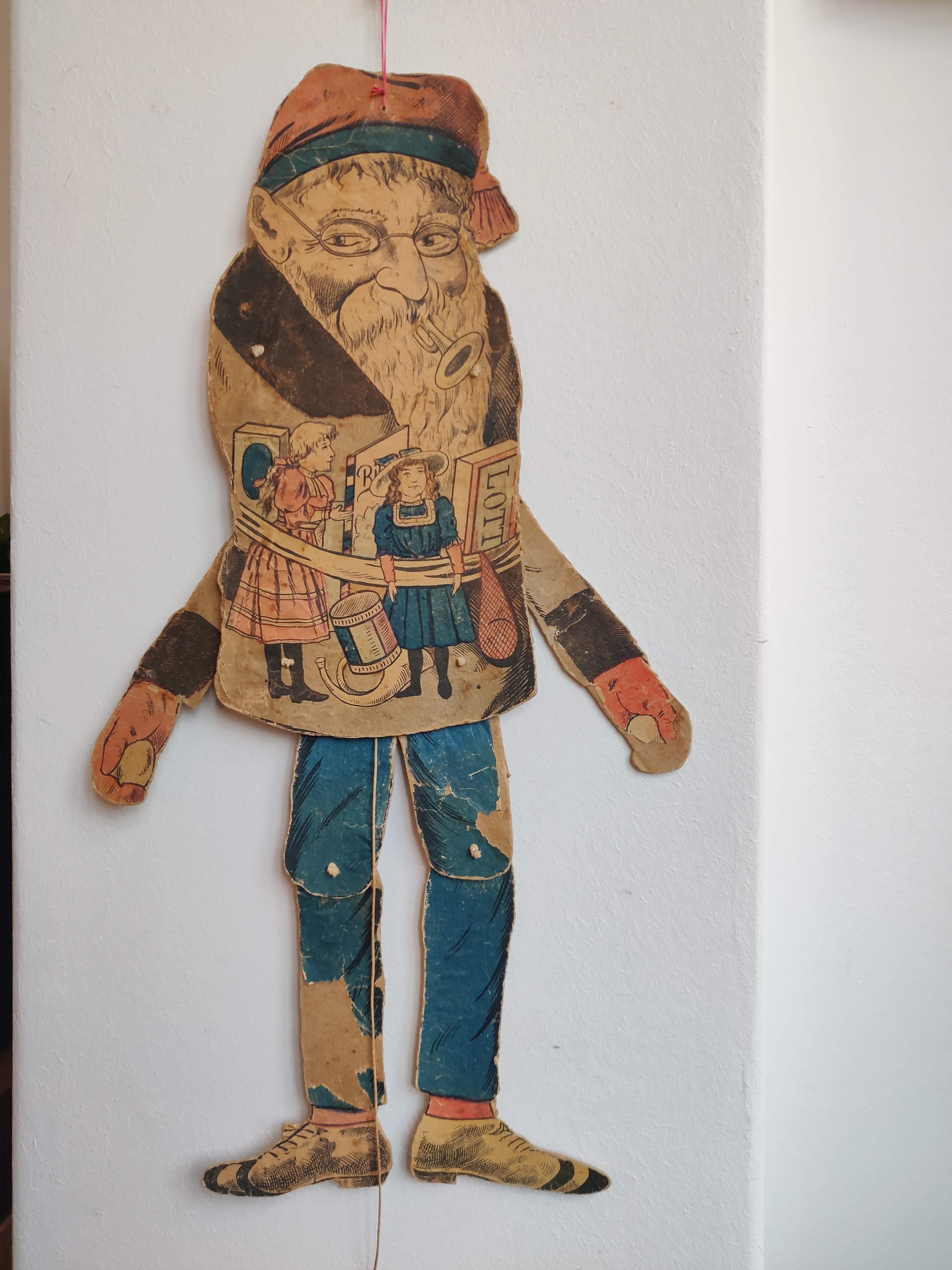 Antik sprællejulemand med intet mindre end 112 år på bagen. Der er mange genoptryk derude, men kun meget sjældent den ægte vare som her: Han var en gave til Anebirgitte fra Morfar 1913, står der på bagsiden, altså et godt stykke tid før, der gik coca-cola i julemandens udseende. Han er en glad nisse med glimt i øjet, blå bukser og rød strikhue, og han er klar med en snebold i hver hånd. Han kommer med gaver i form af tidstypisk legetøj: Lotteri, dukker, en bold i net, en tromme, et horn og et billedalbum. På bukser og den ene vante er papiret slidt/faldet af visse steder, som det kan ses på billederne, men han kan stadig sprælle og har alle lemmer endnu. Materiale papir, pap, snor. Han måler 51 cm i højden.
