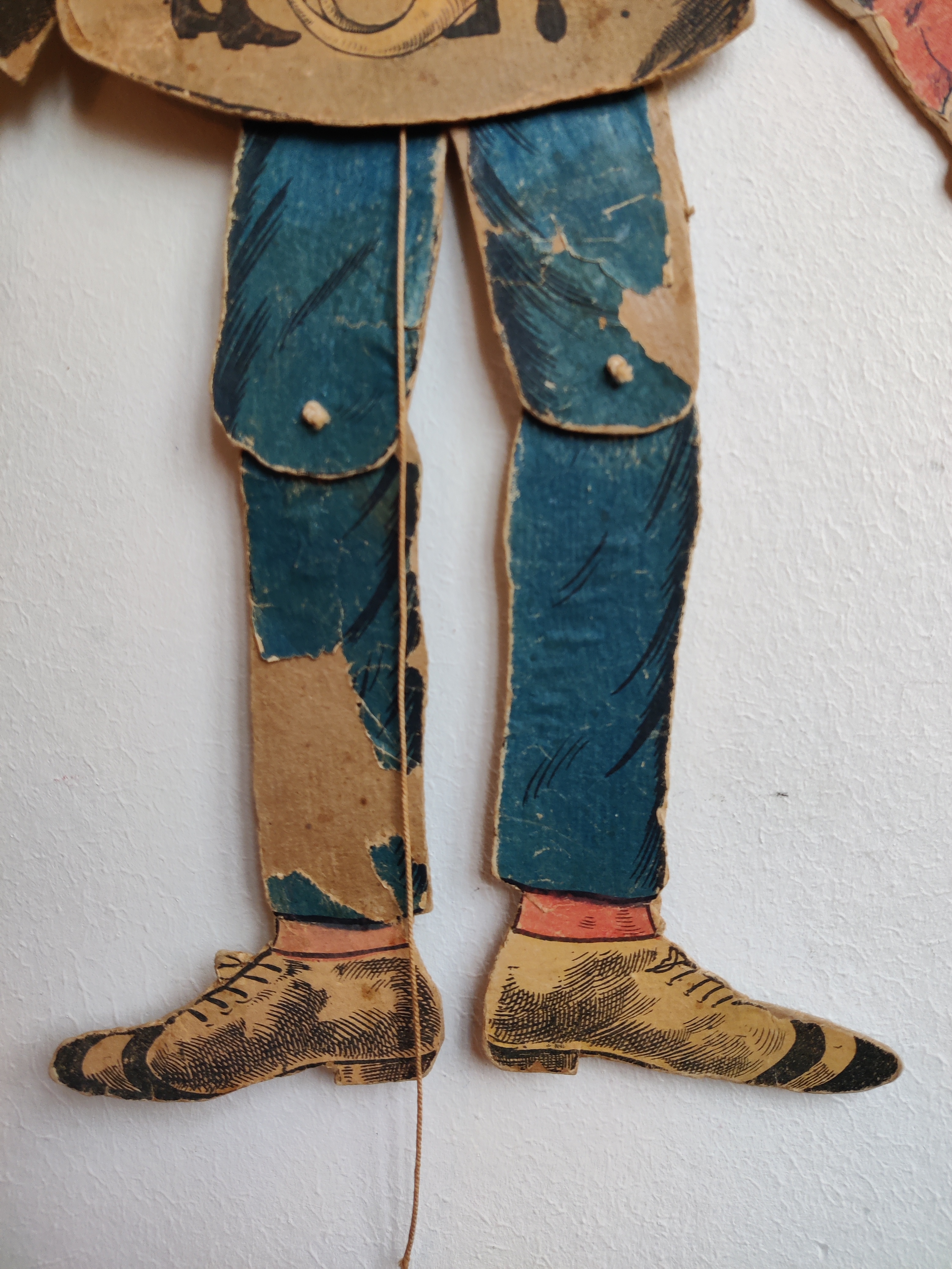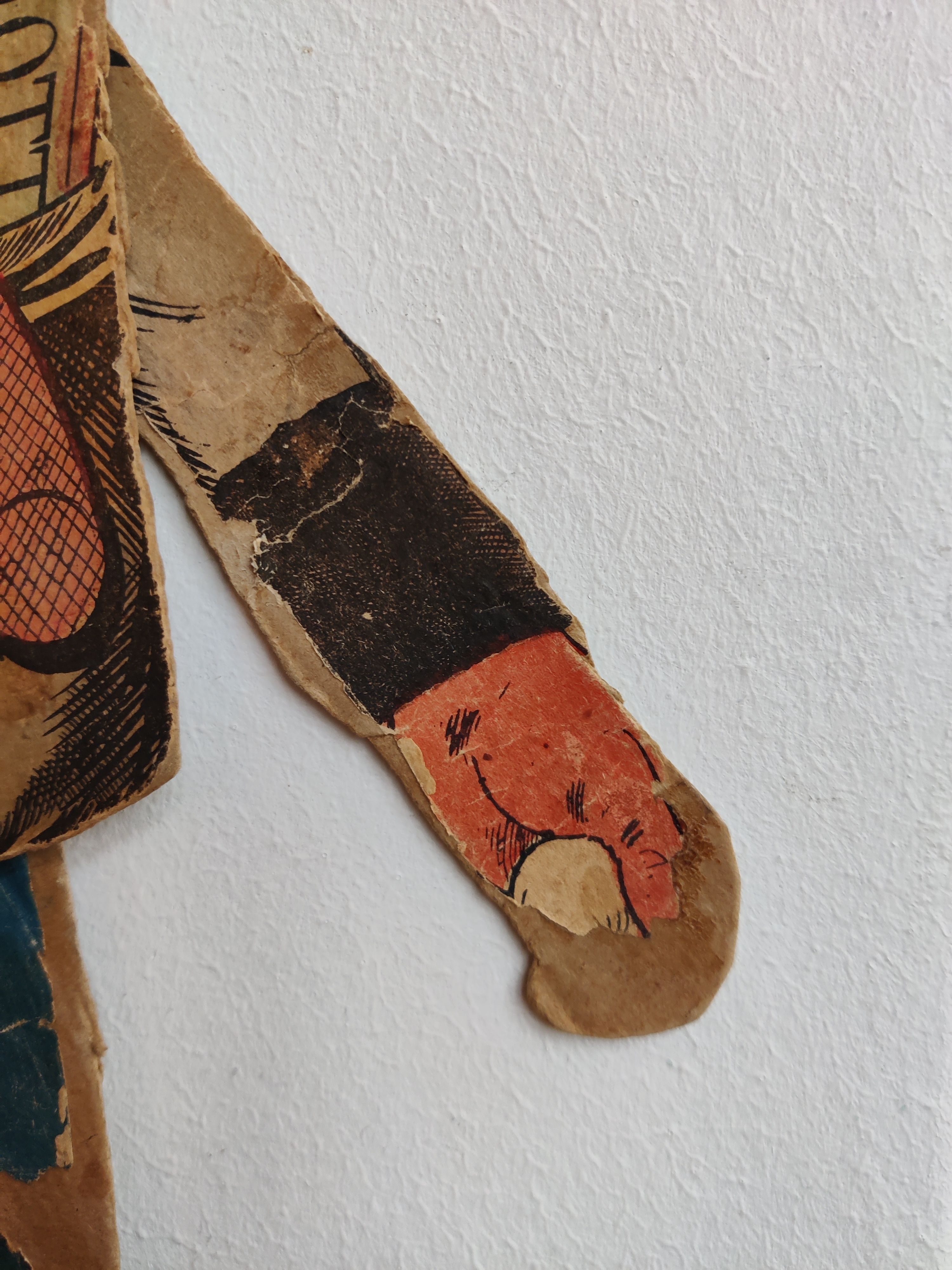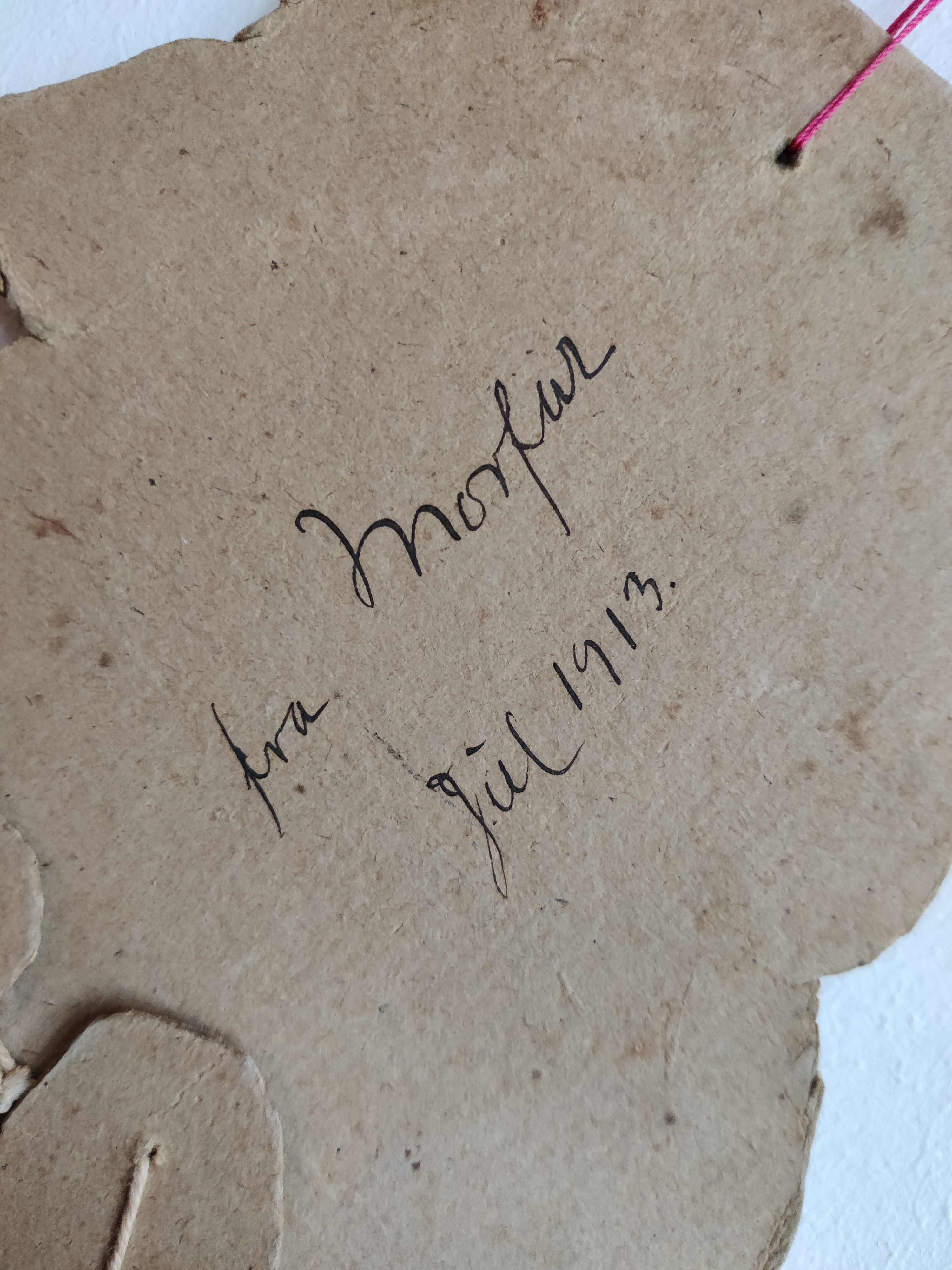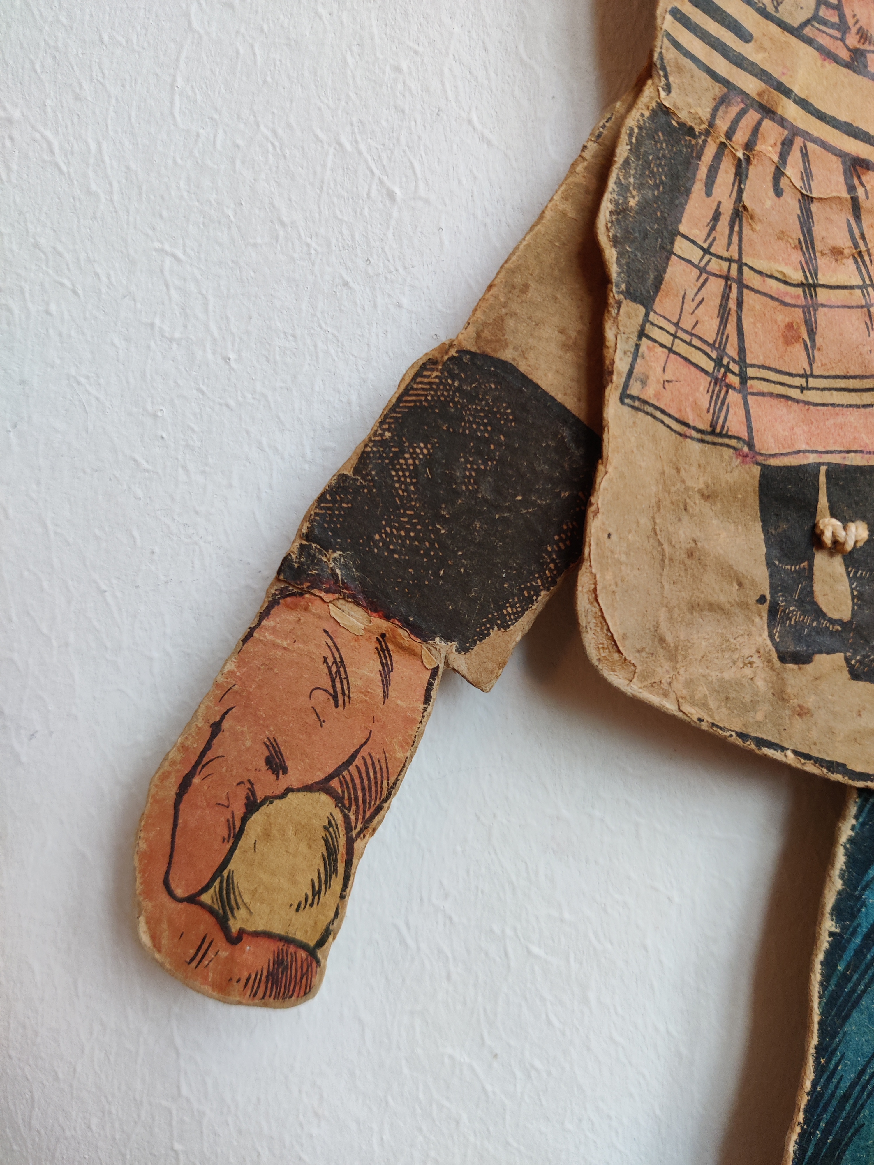 Antik sprællejulemand med intet mindre end 112 år på bagen. Der er mange genoptryk derude, men kun meget sjældent den ægte vare som her: Han var en gave til Anebirgitte fra Morfar 1913, står der på bagsiden, altså et godt stykke tid før, der gik coca-cola i julemandens udseende. Han er en glad nisse med glimt i øjet, blå bukser og rød strikhue, og han er klar med en snebold i hver hånd. Han kommer med gaver i form af tidstypisk legetøj: Lotteri, dukker, en bold i net, en tromme, et horn og et billedalbum. På bukser og den ene vante er papiret slidt/faldet af visse steder, som det kan ses på billederne, men han kan stadig sprælle og har alle lemmer endnu. Materiale papir, pap, snor. Han måler 51 cm i højden.