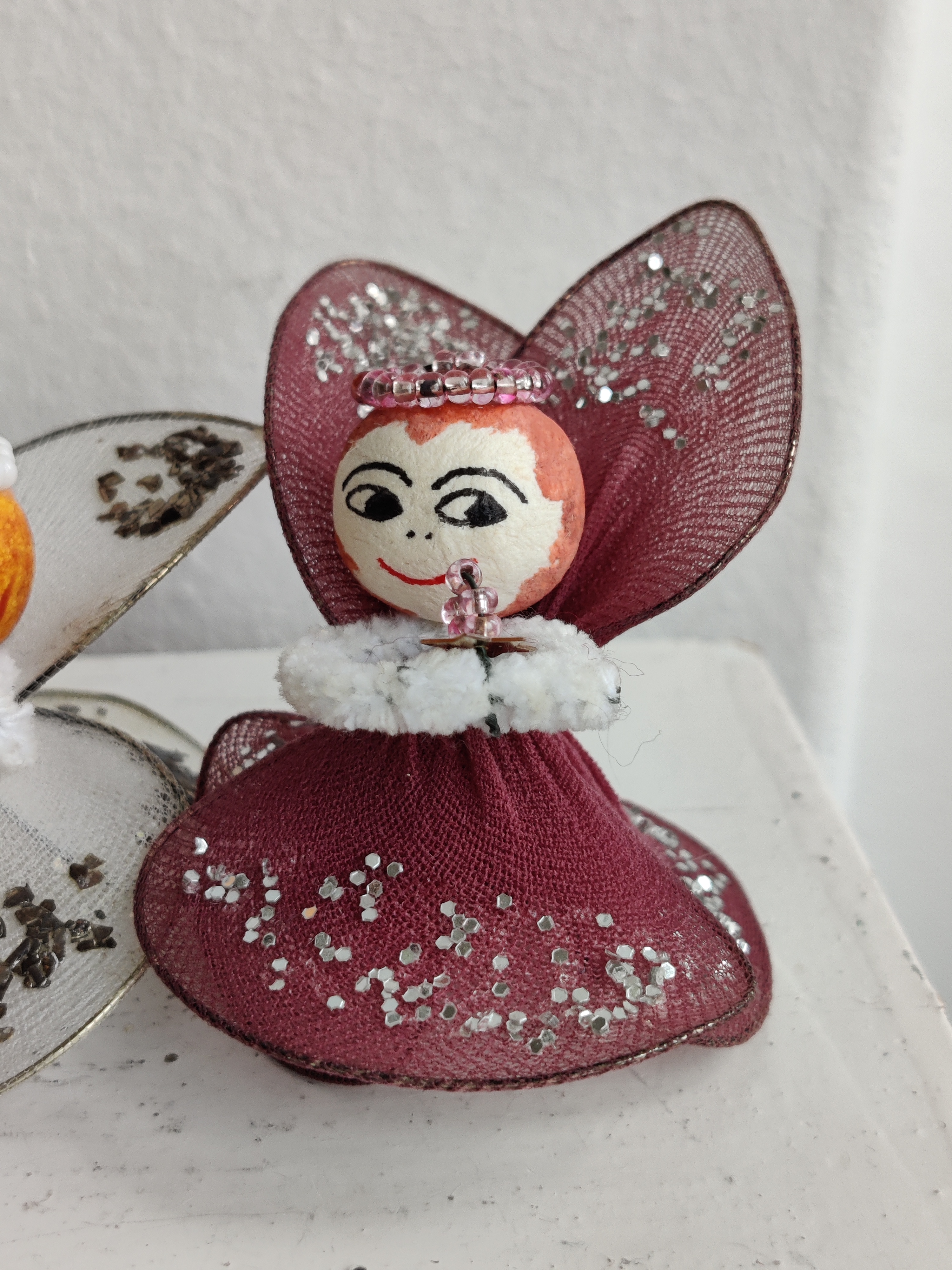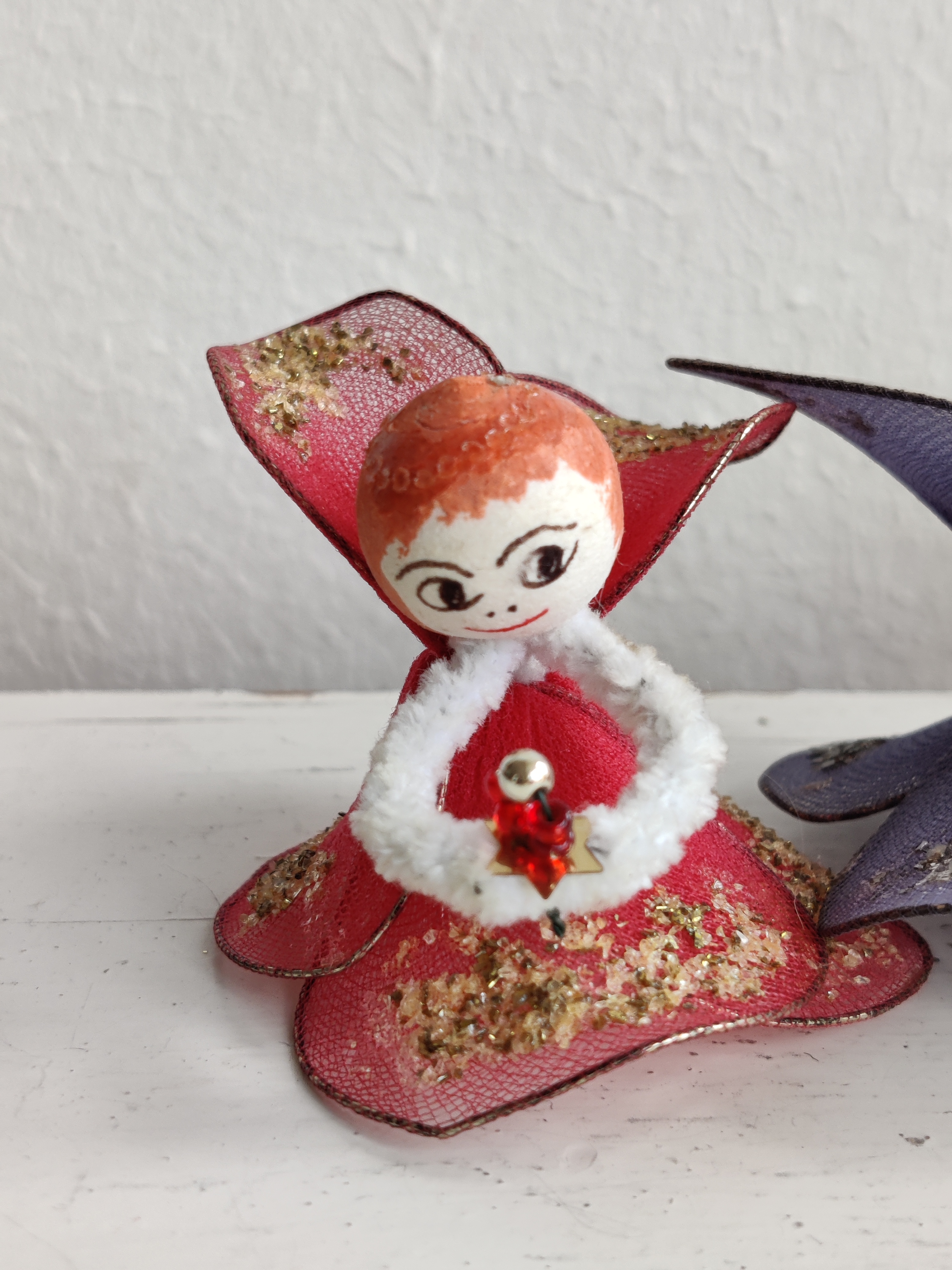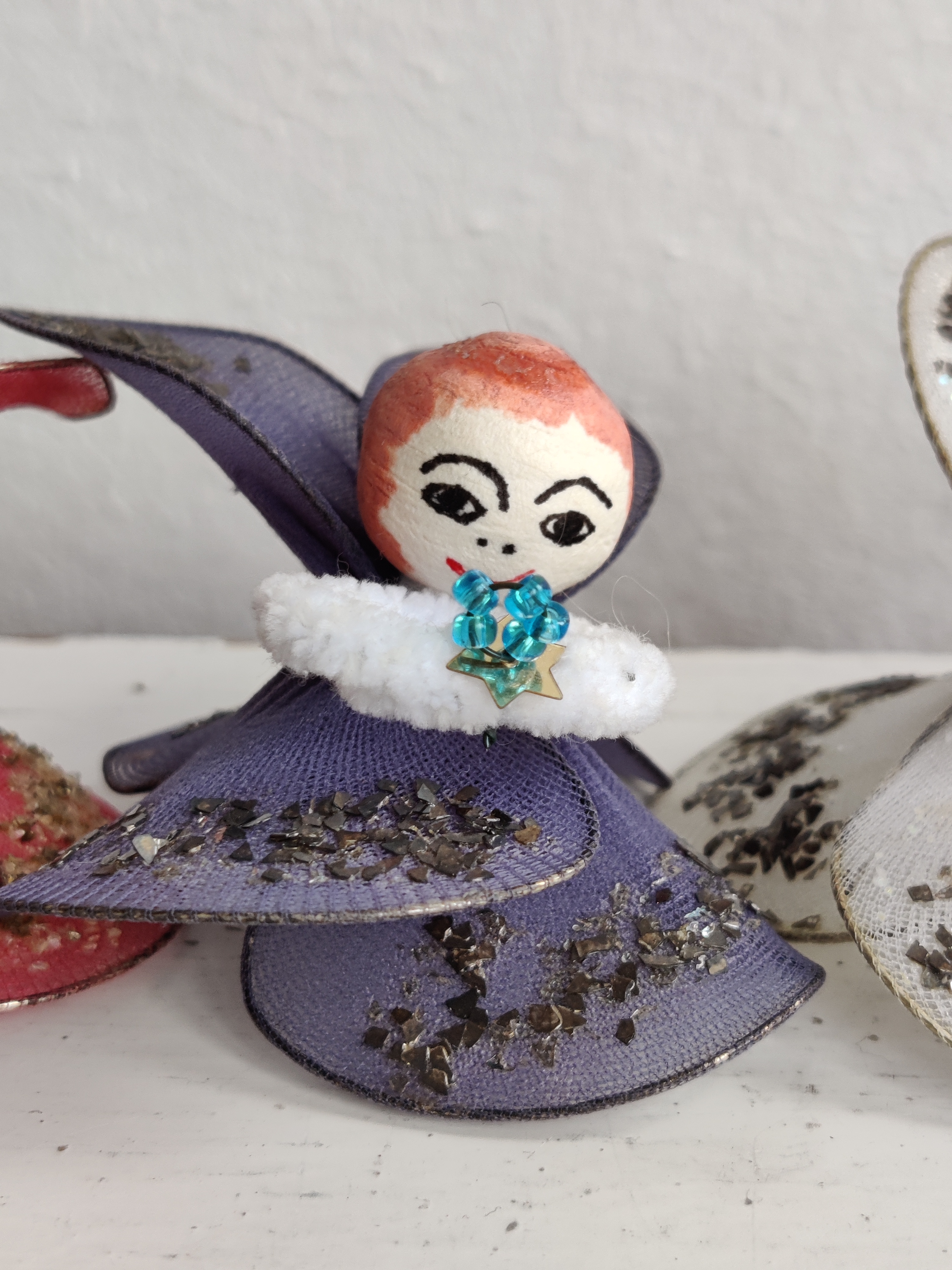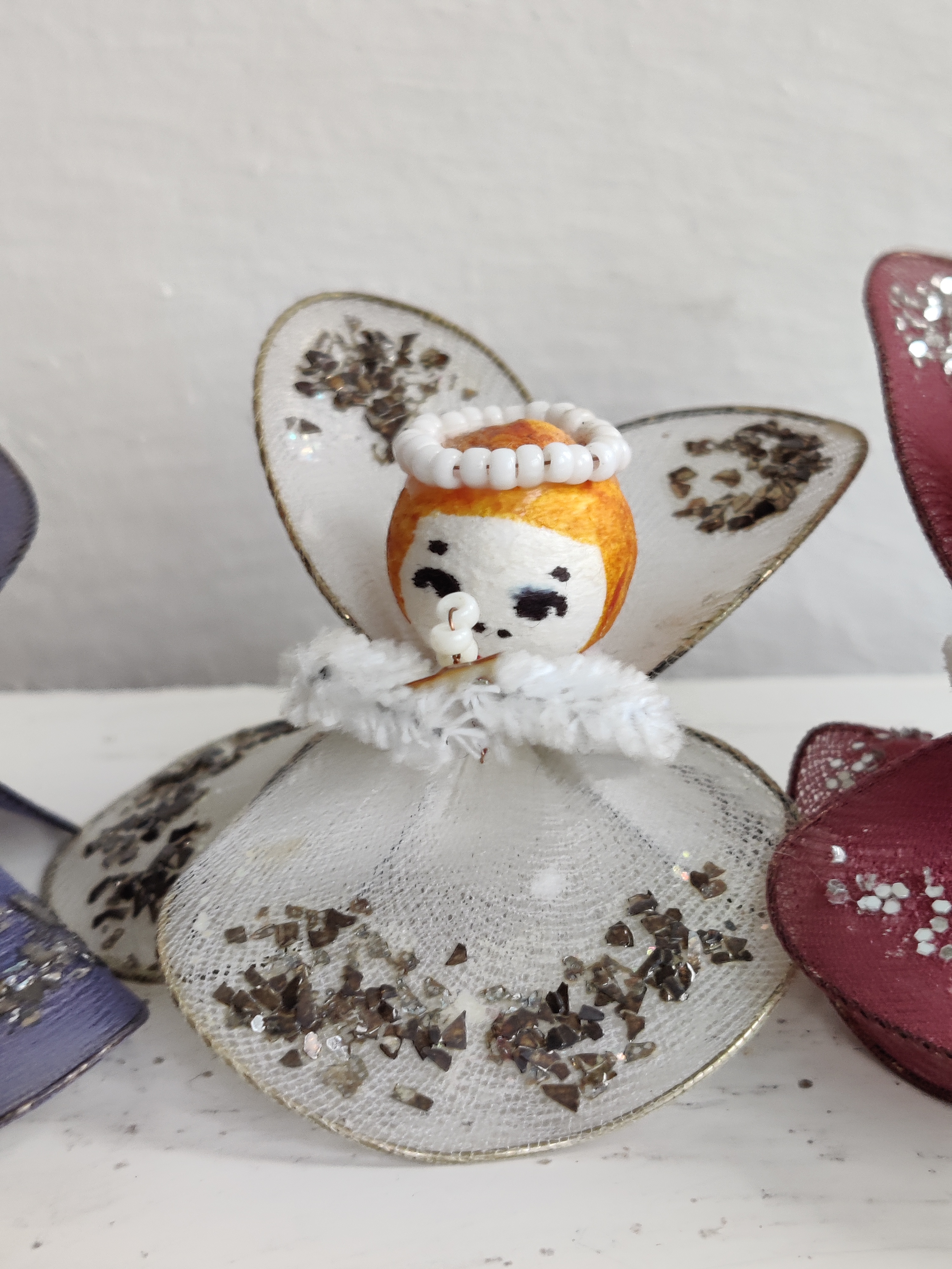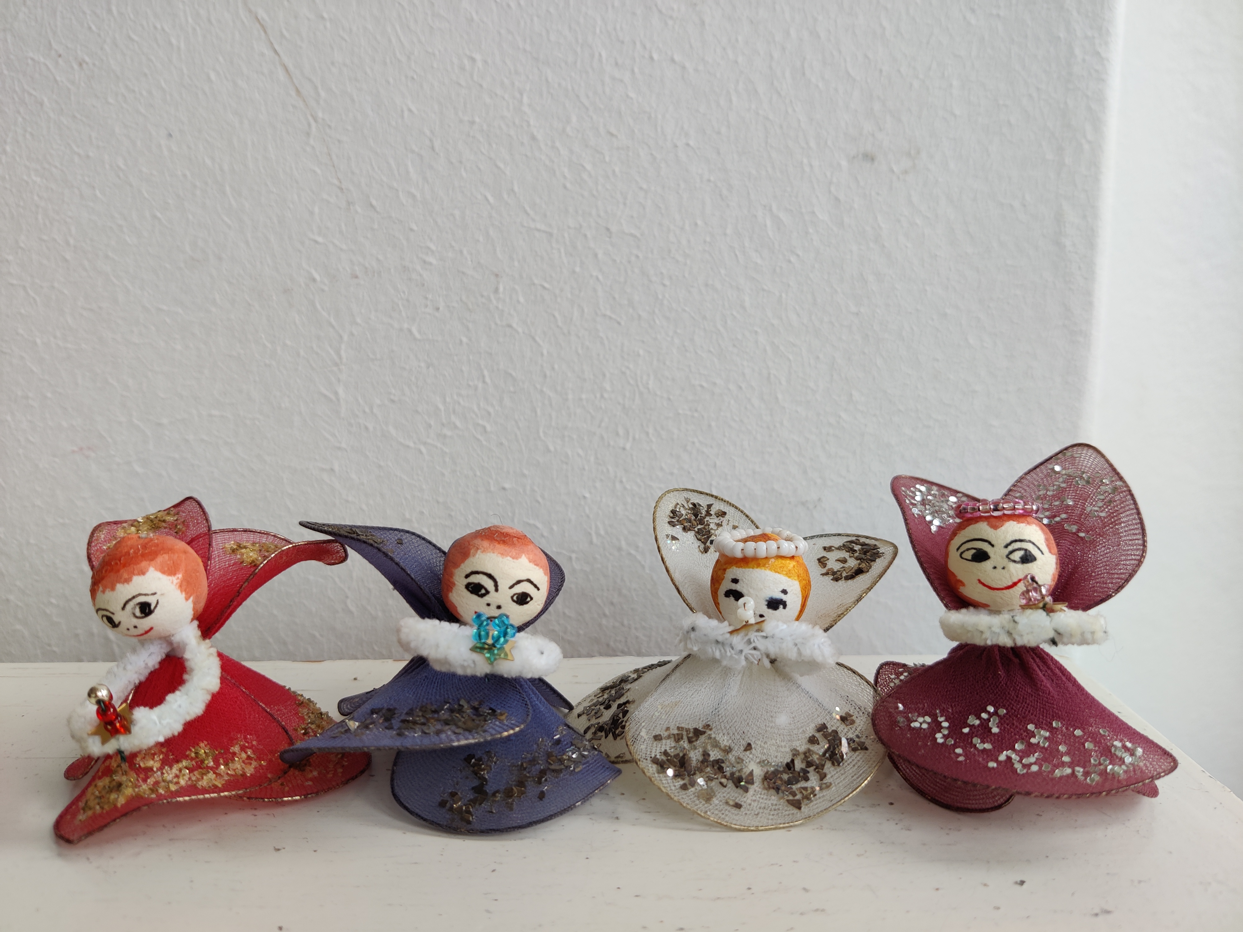 Fire søde englepiger fra 1960'erne/1970'erne af trådnet, glimmer og vatkugler. Lidt af en laber kvartet. Mål ca 5 x 6 cm.