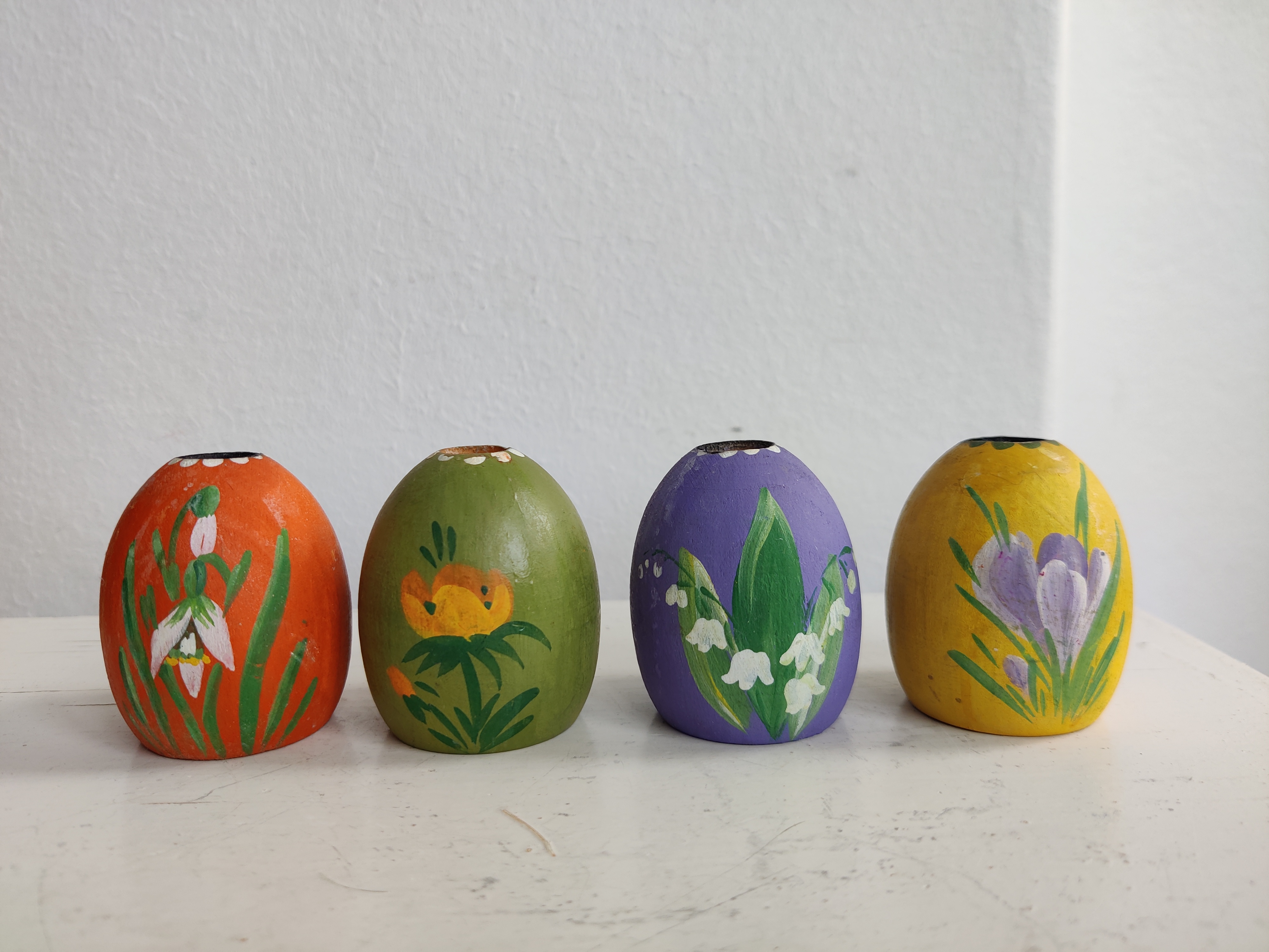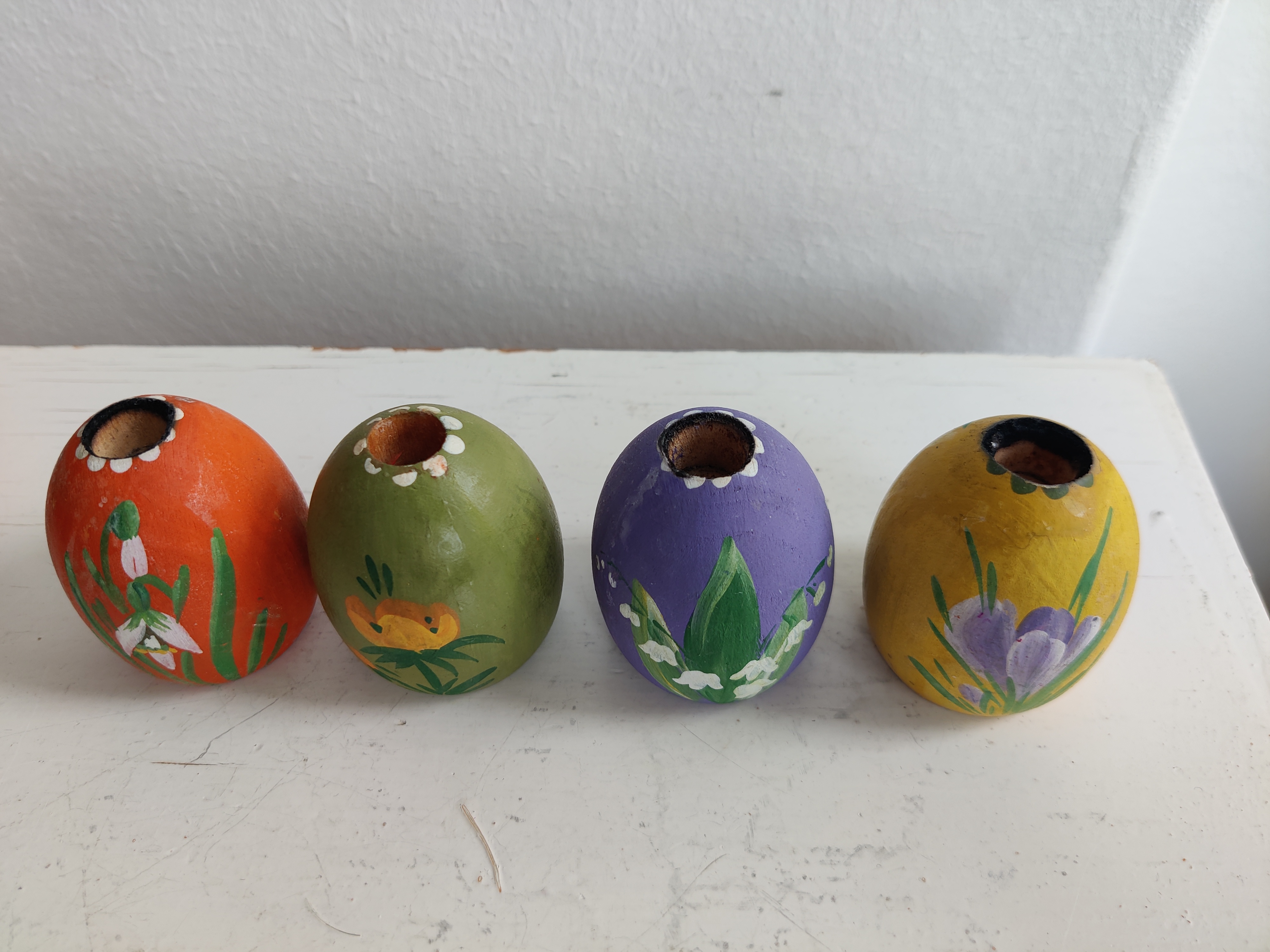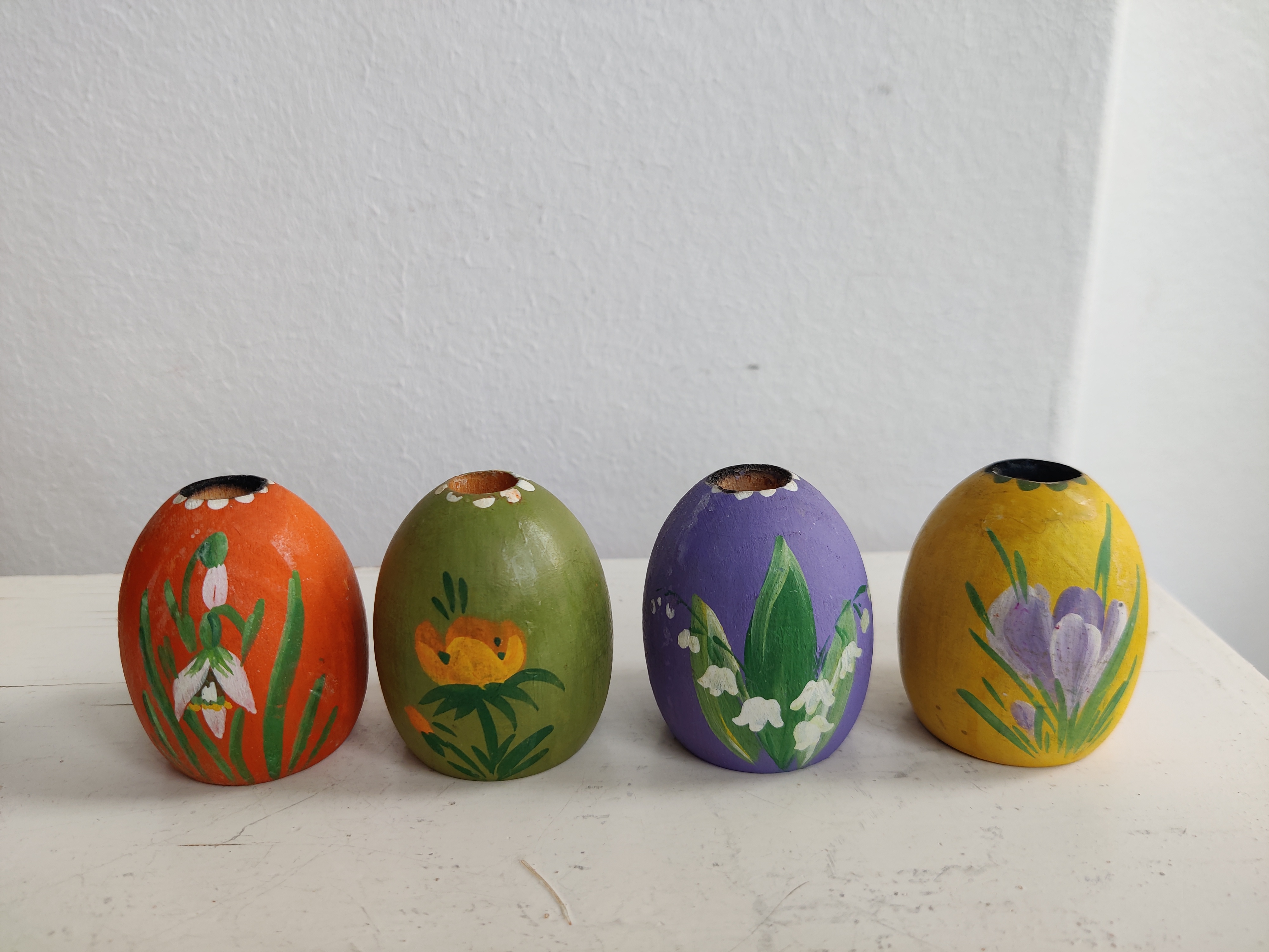 Kvartet af kertelysestager i træ fra Dansk Sløjd. Vintergæk, erantis, liljekonval og krokus. Mål 5 x 4 cm.
