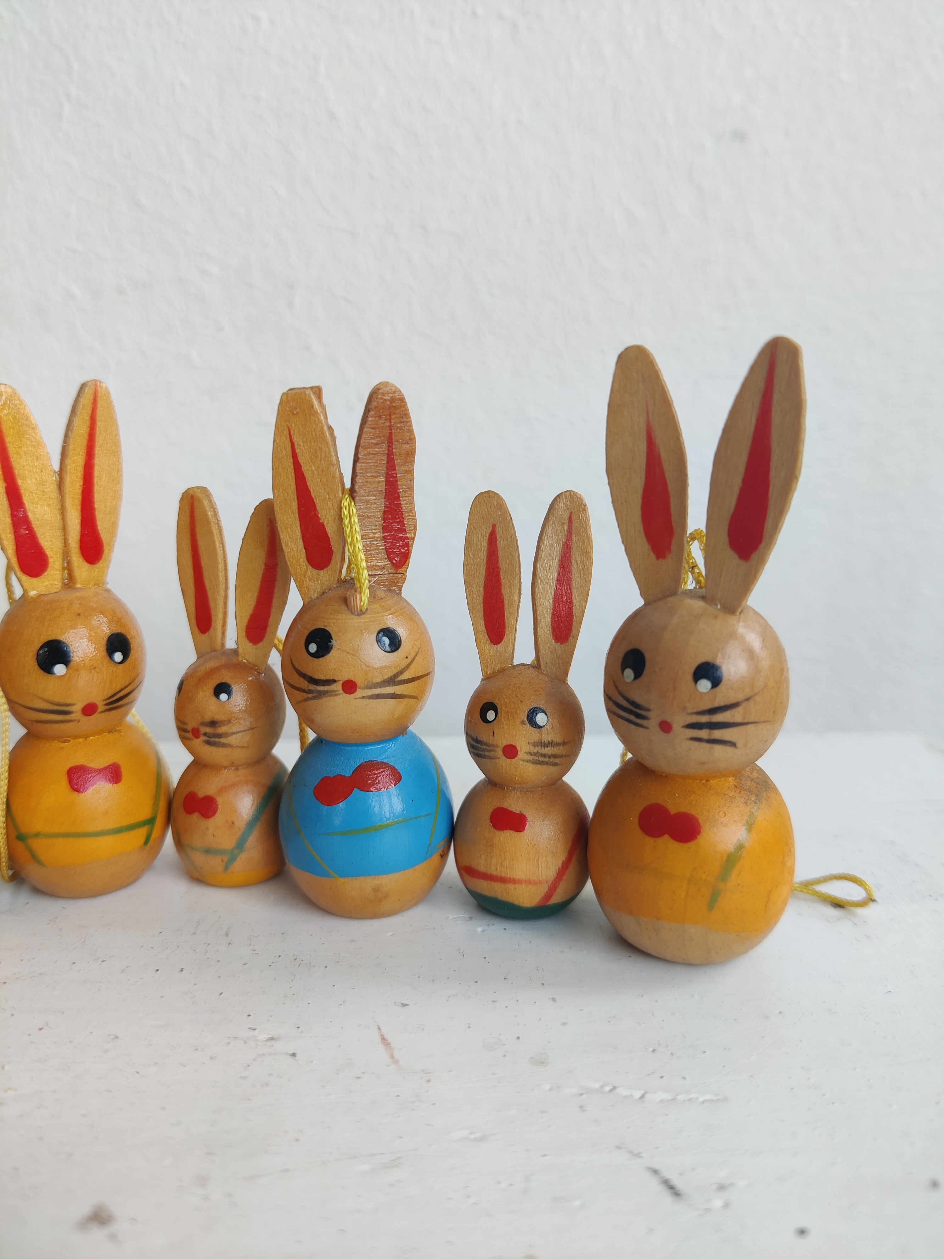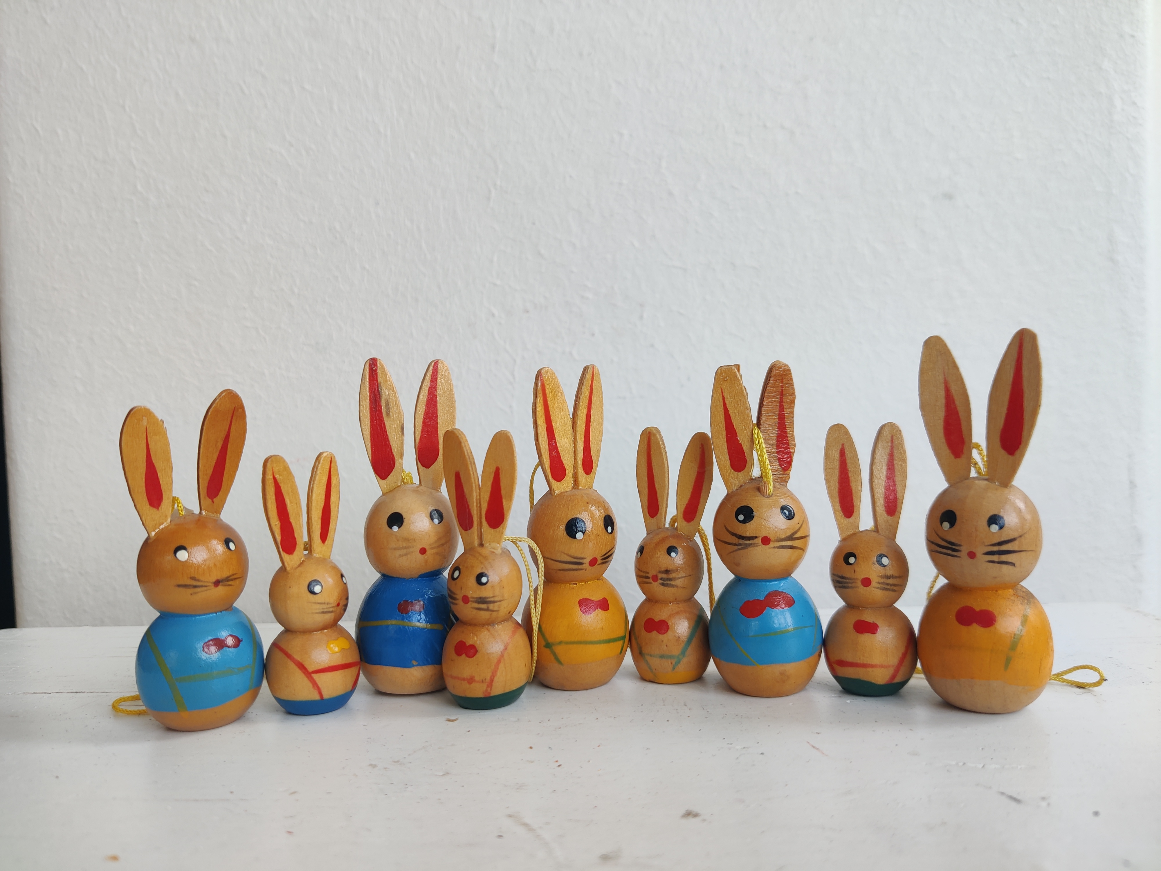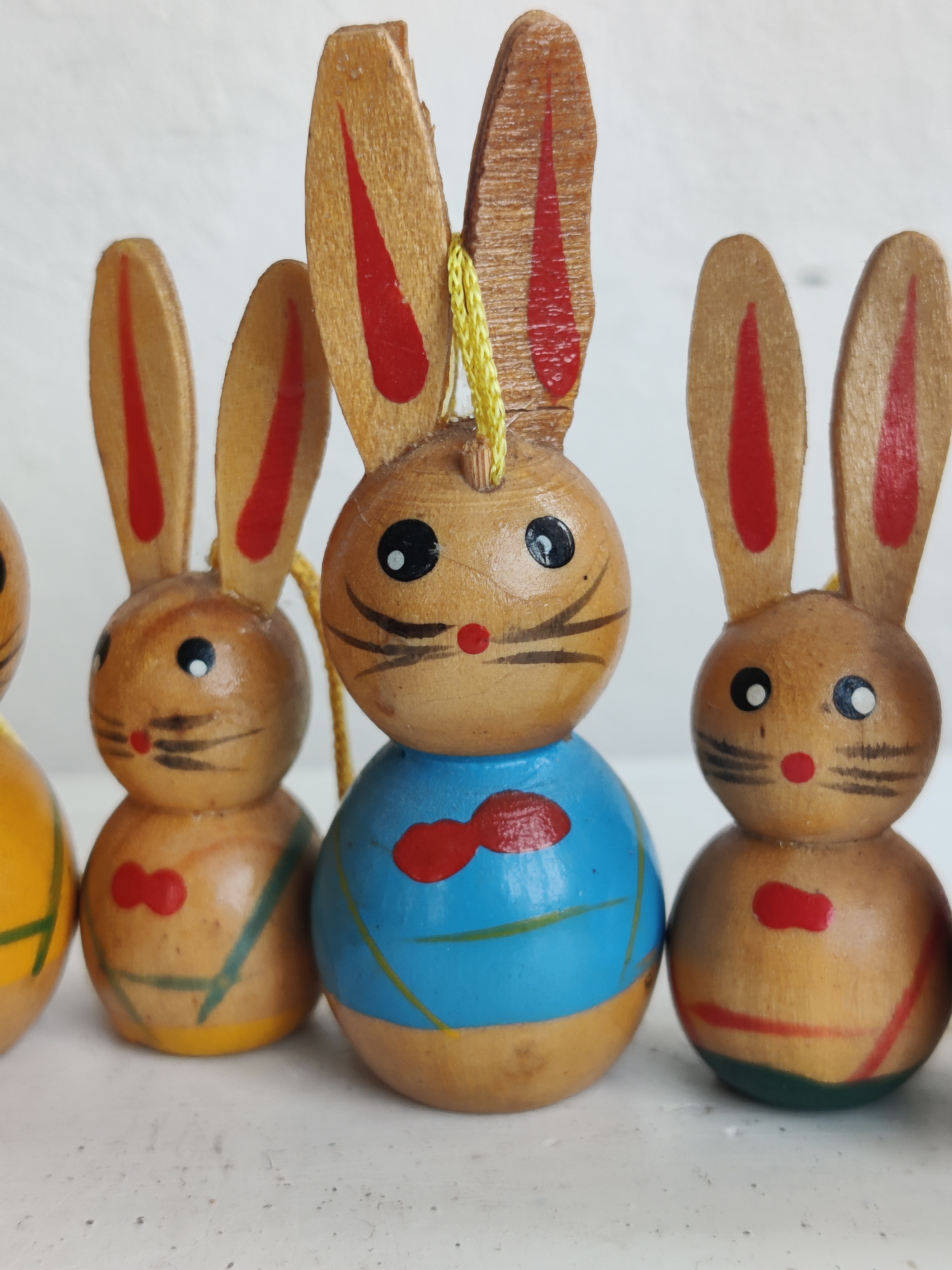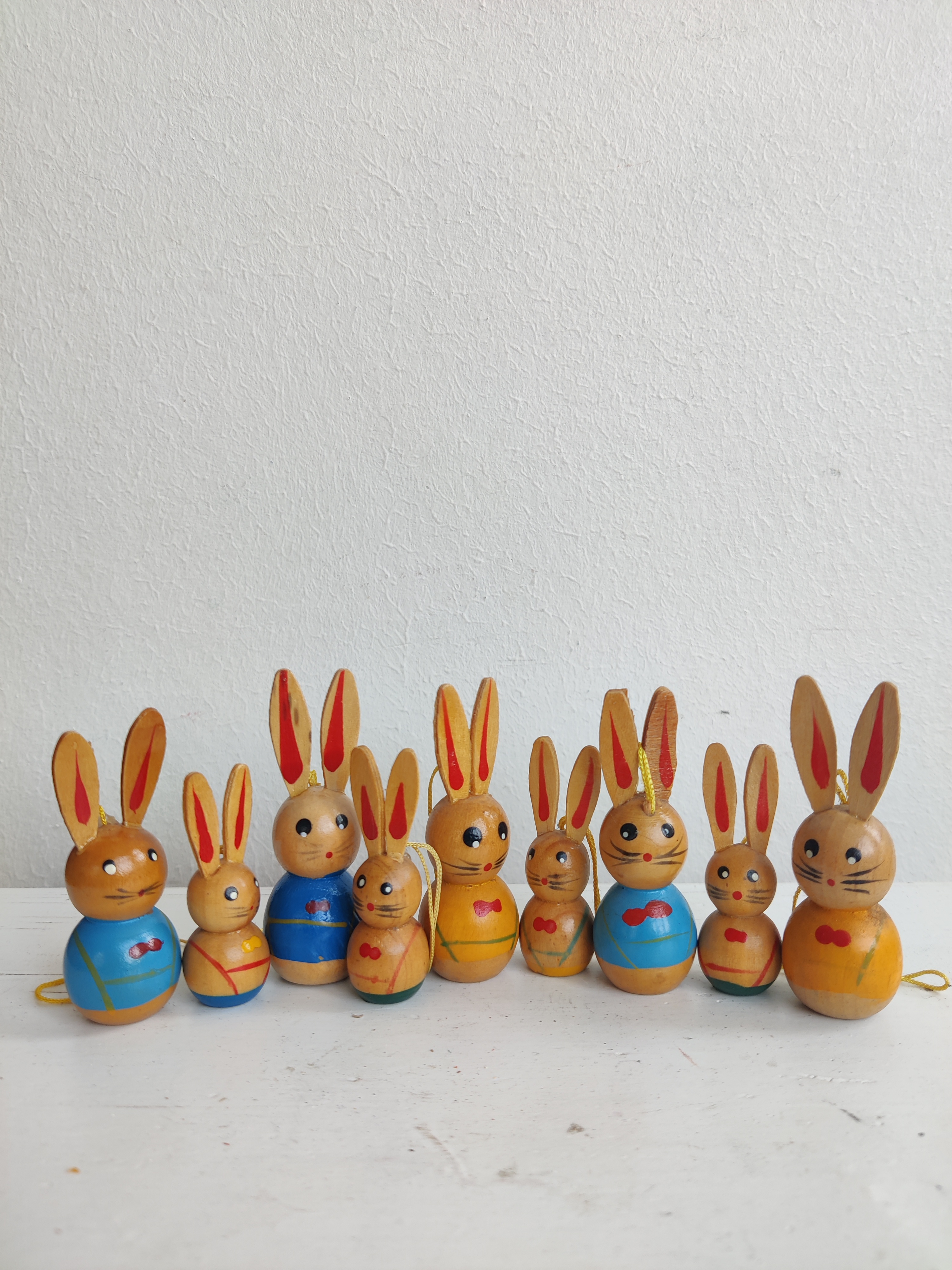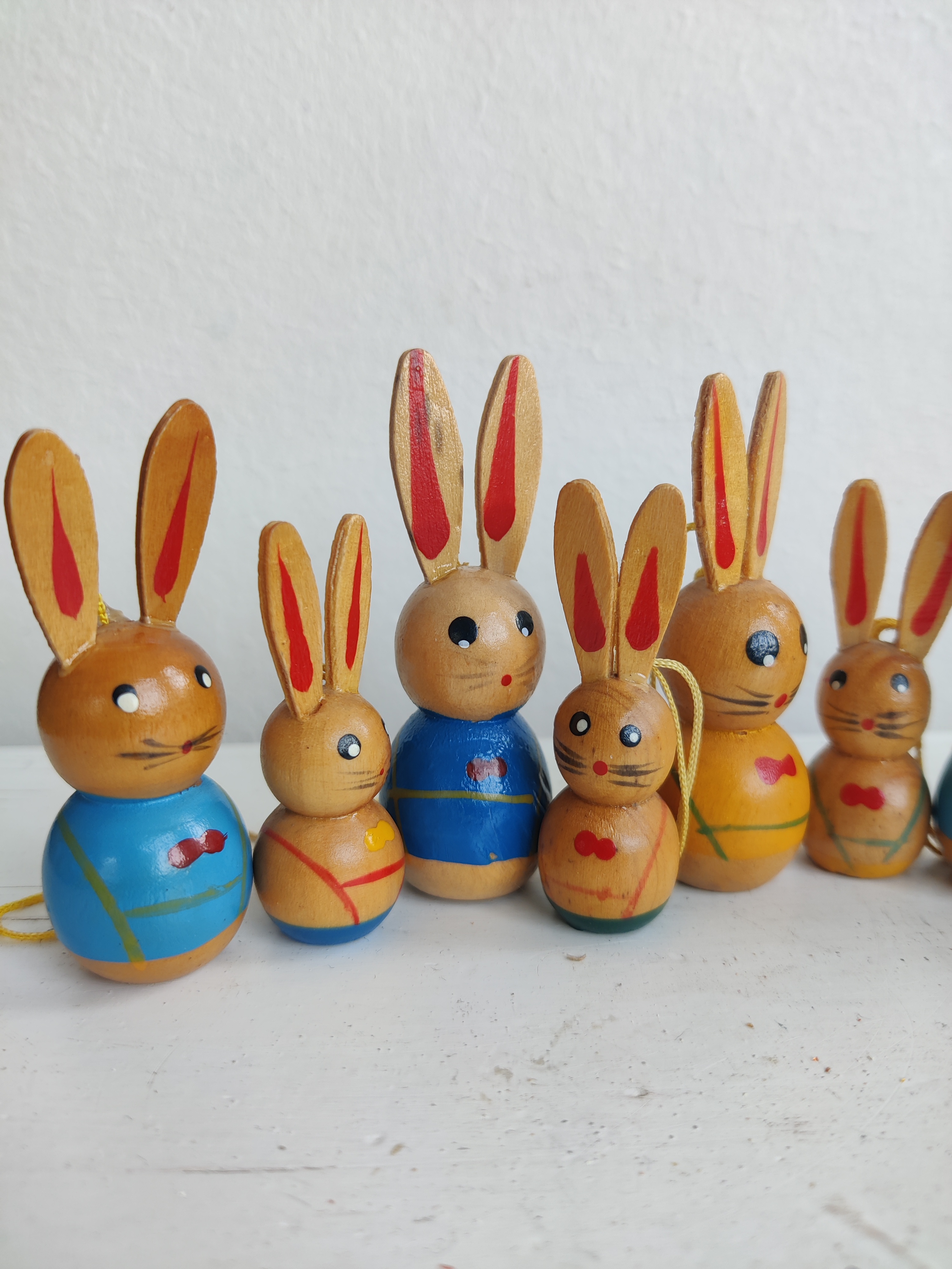 En hel flok ældre påskeharer i træ til at hænge på fine forårsgrene. De store er 6,5 cm og de små er 5 cm.