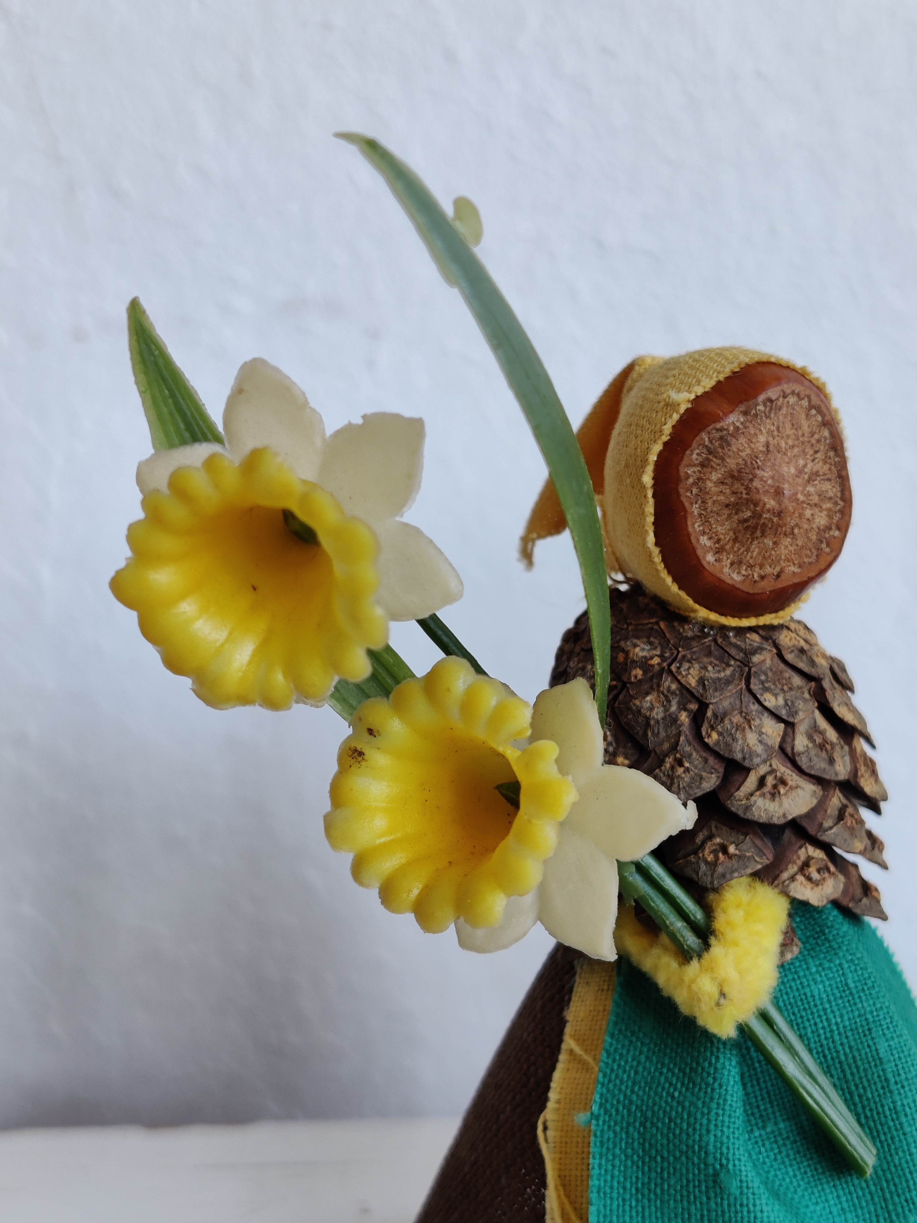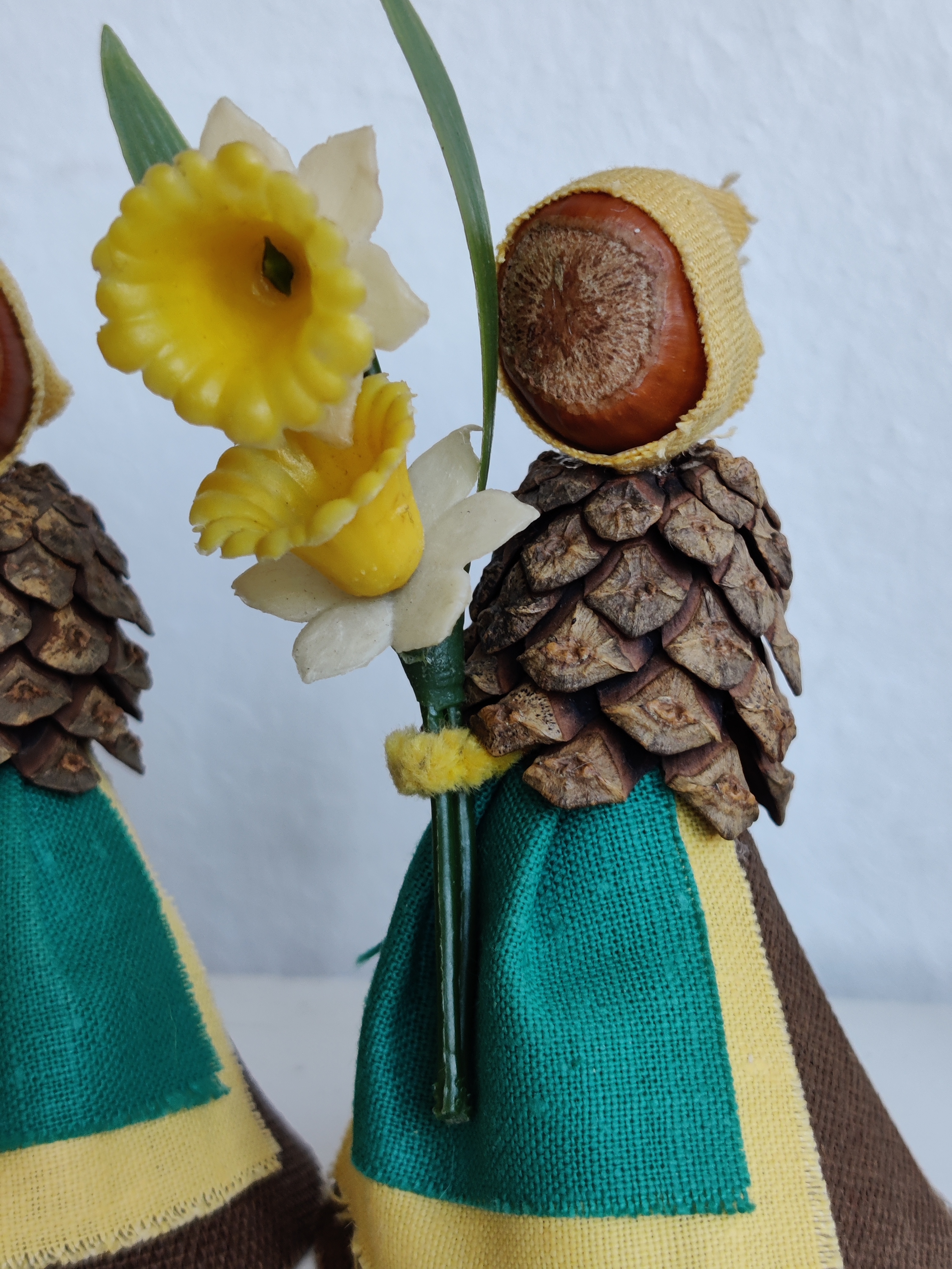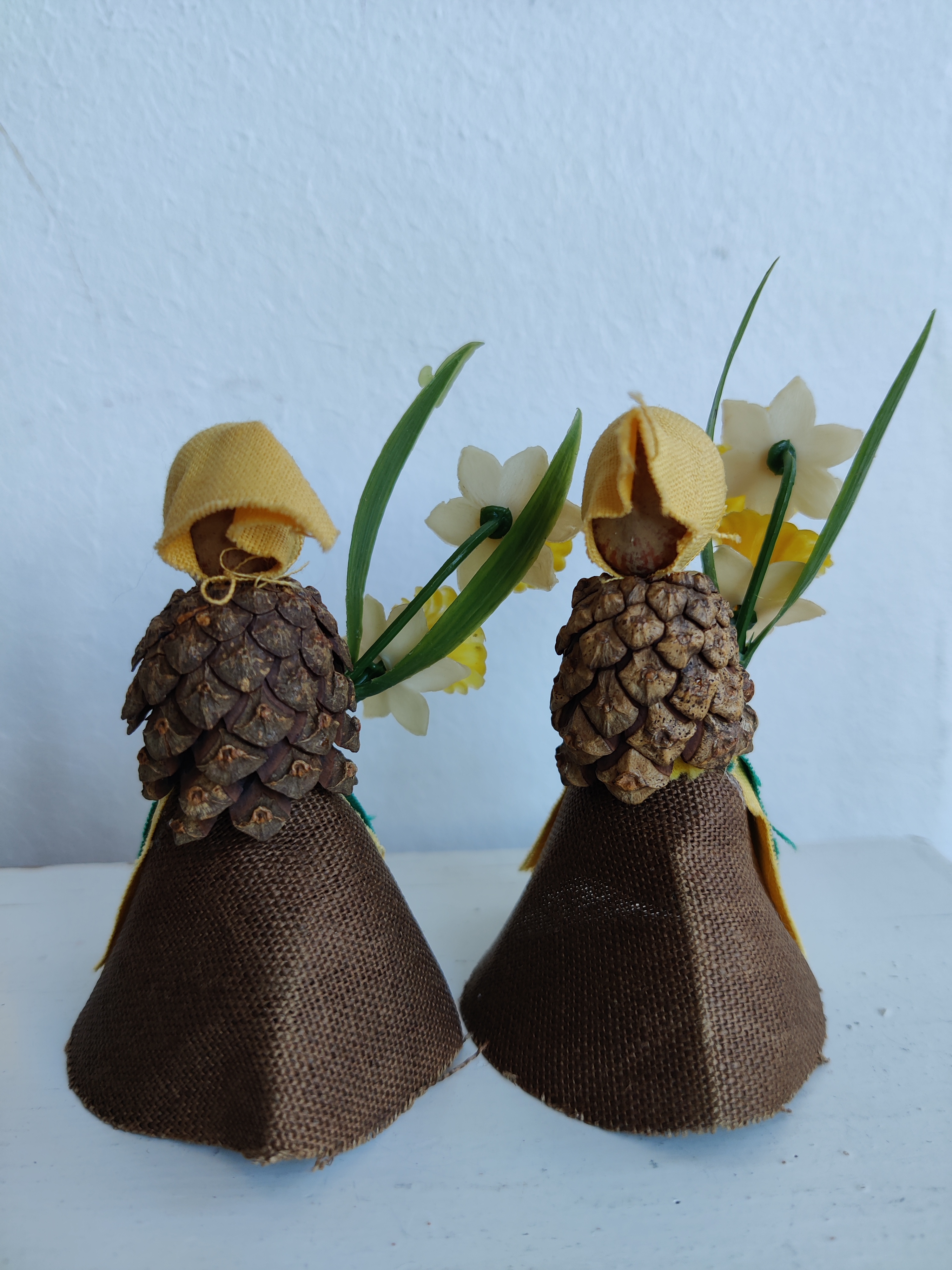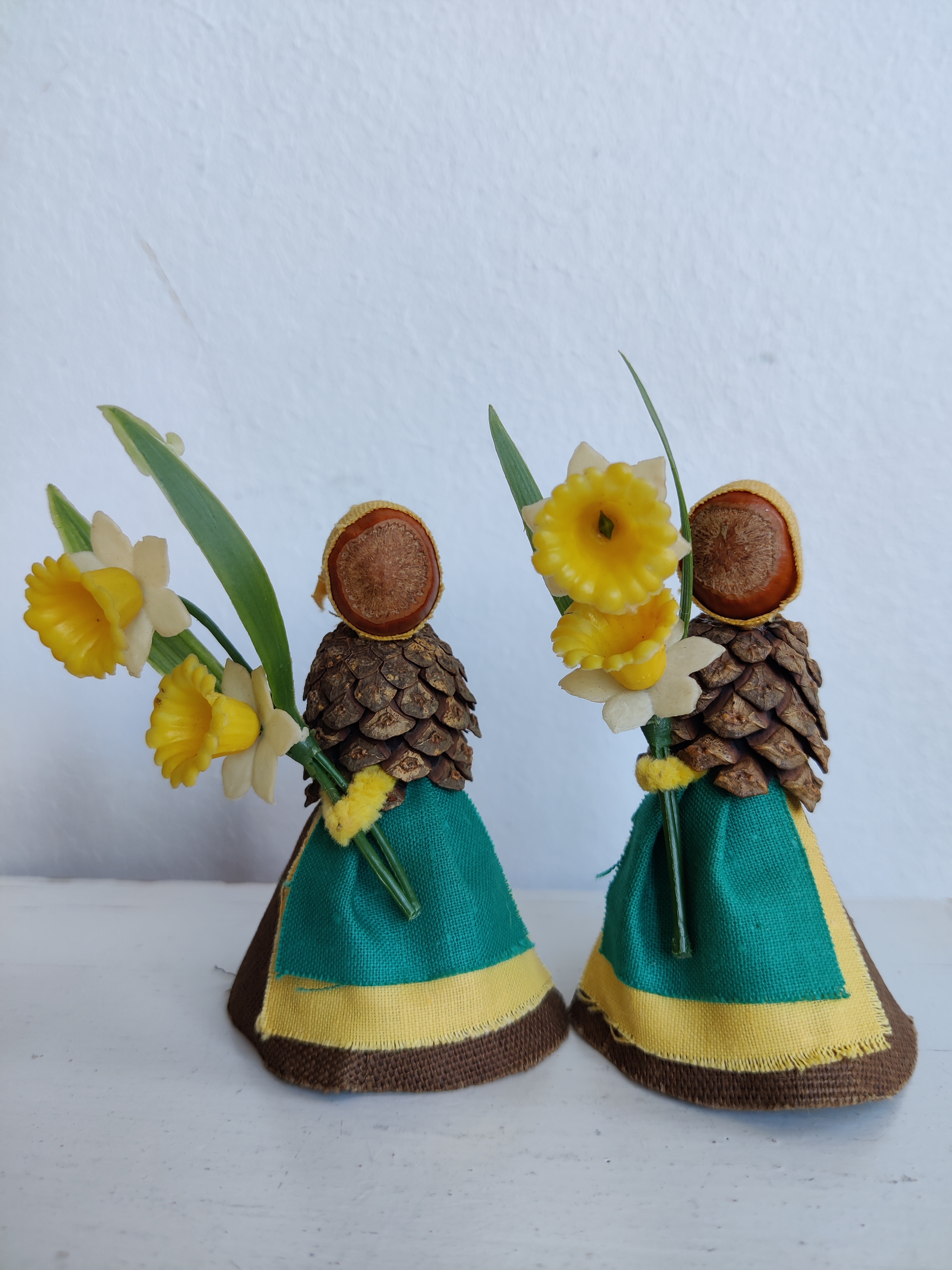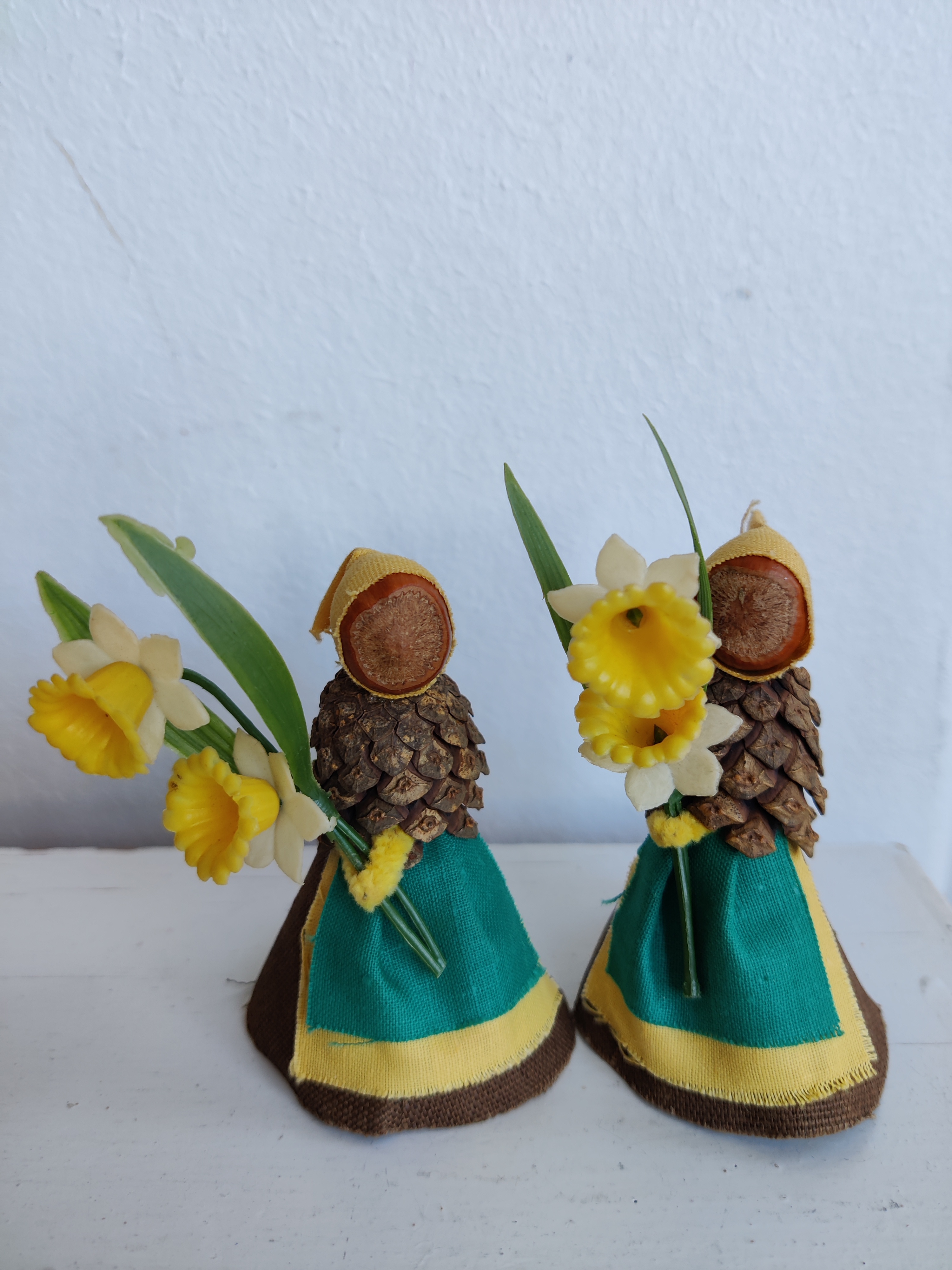 Et par søde retro forårsbebudere i form af påskepiger med hasselnøddehoveder, koglekrop, plastikpåskelijler og stofkjoler. Mål 8 cm.