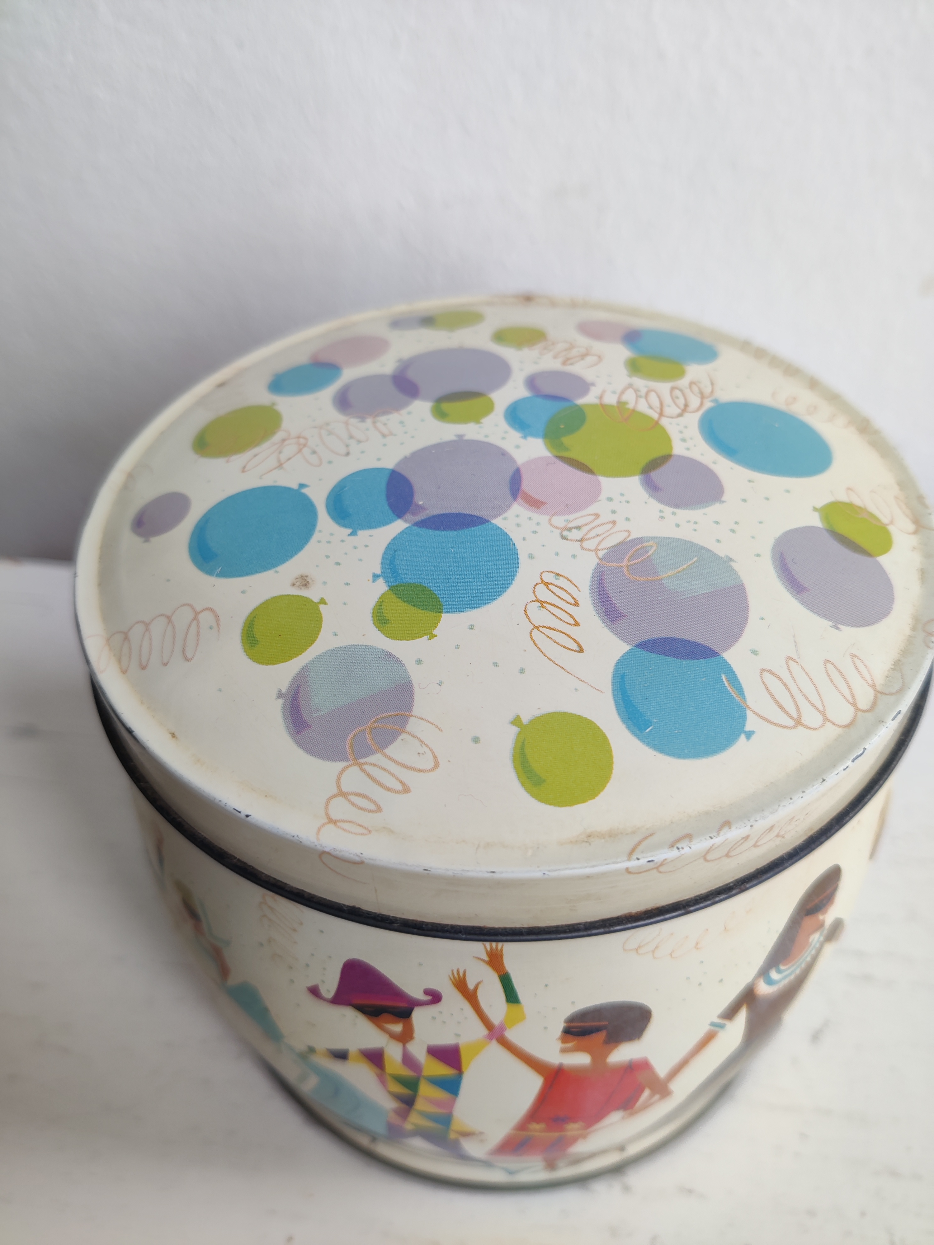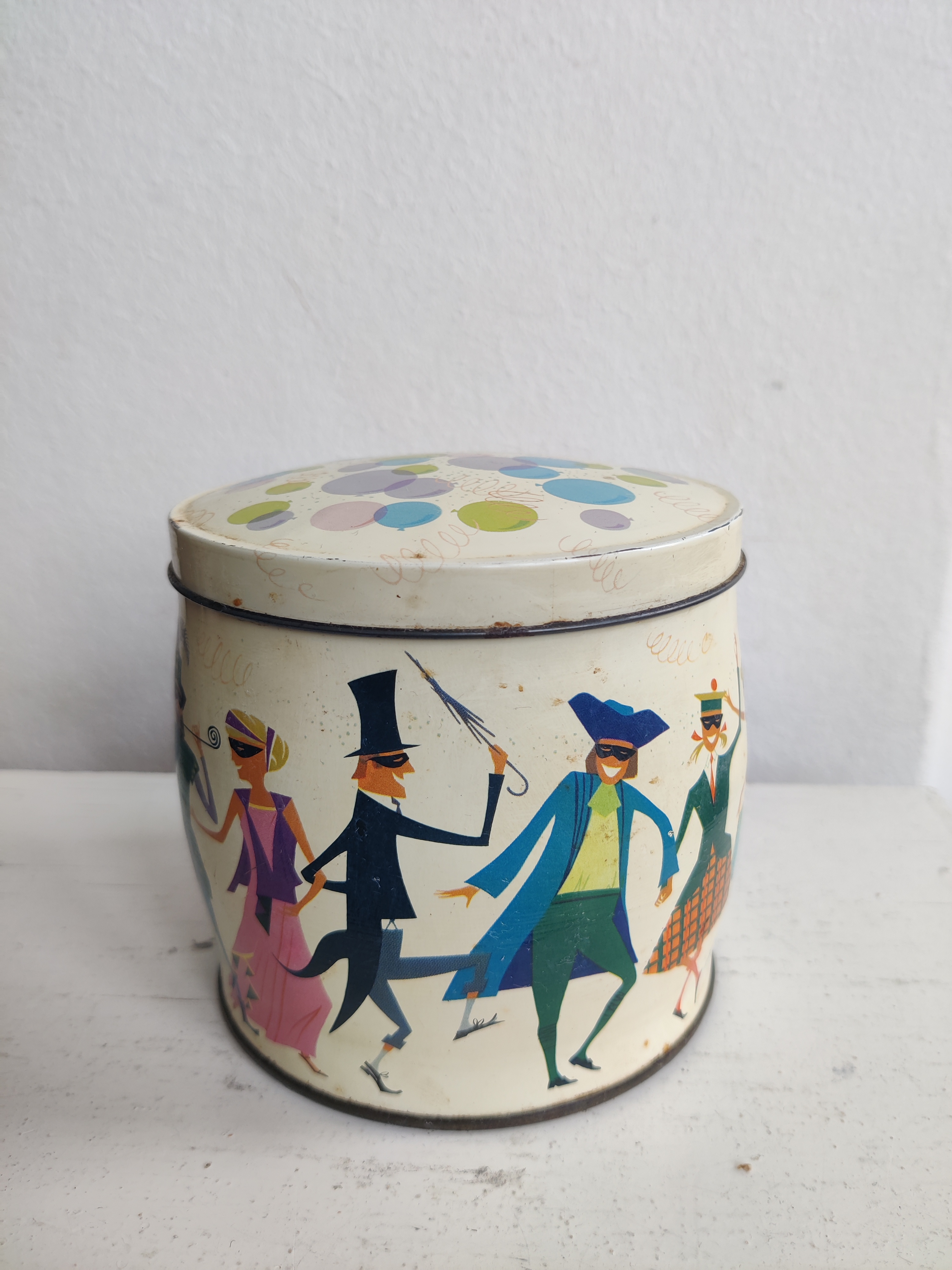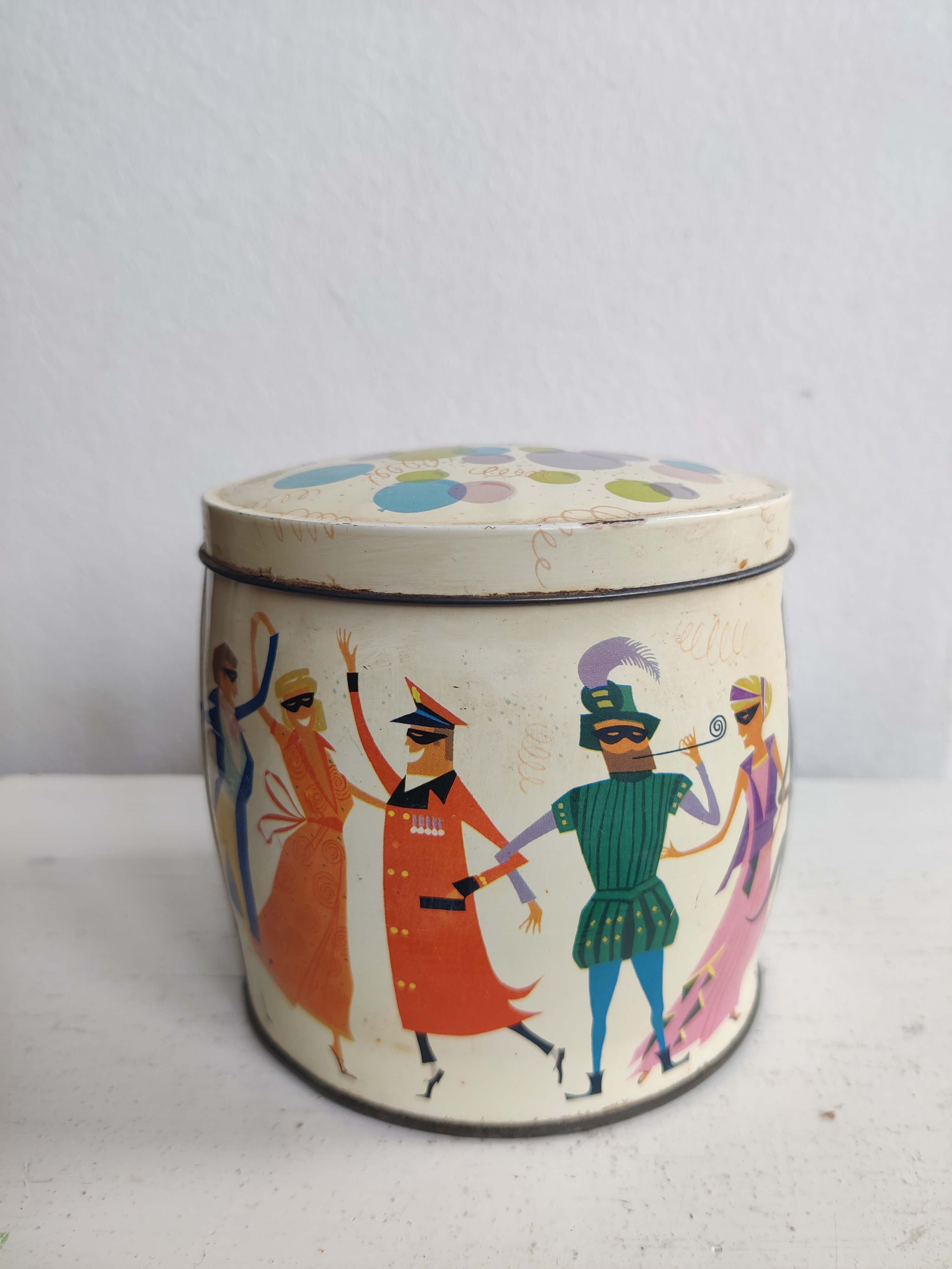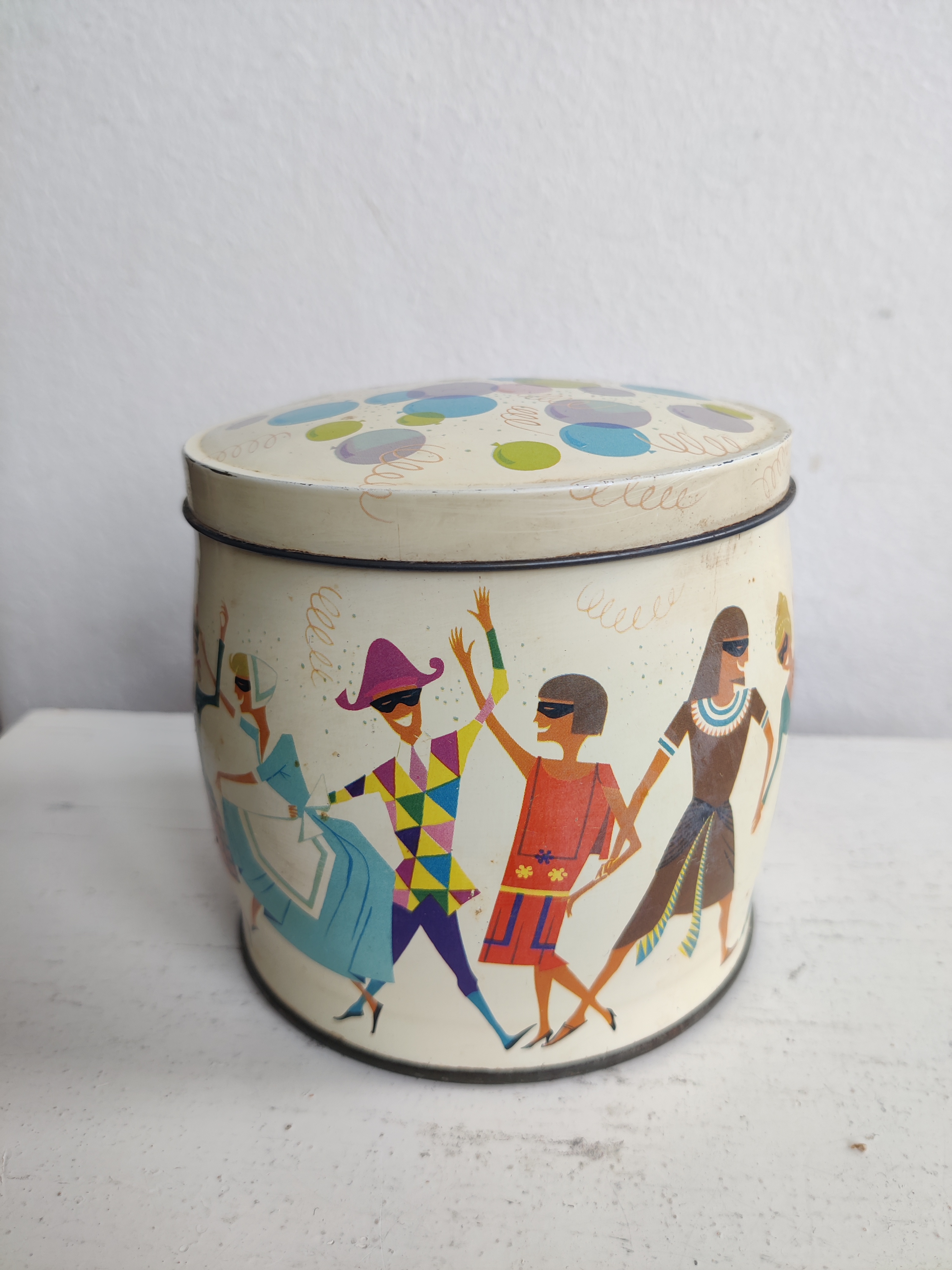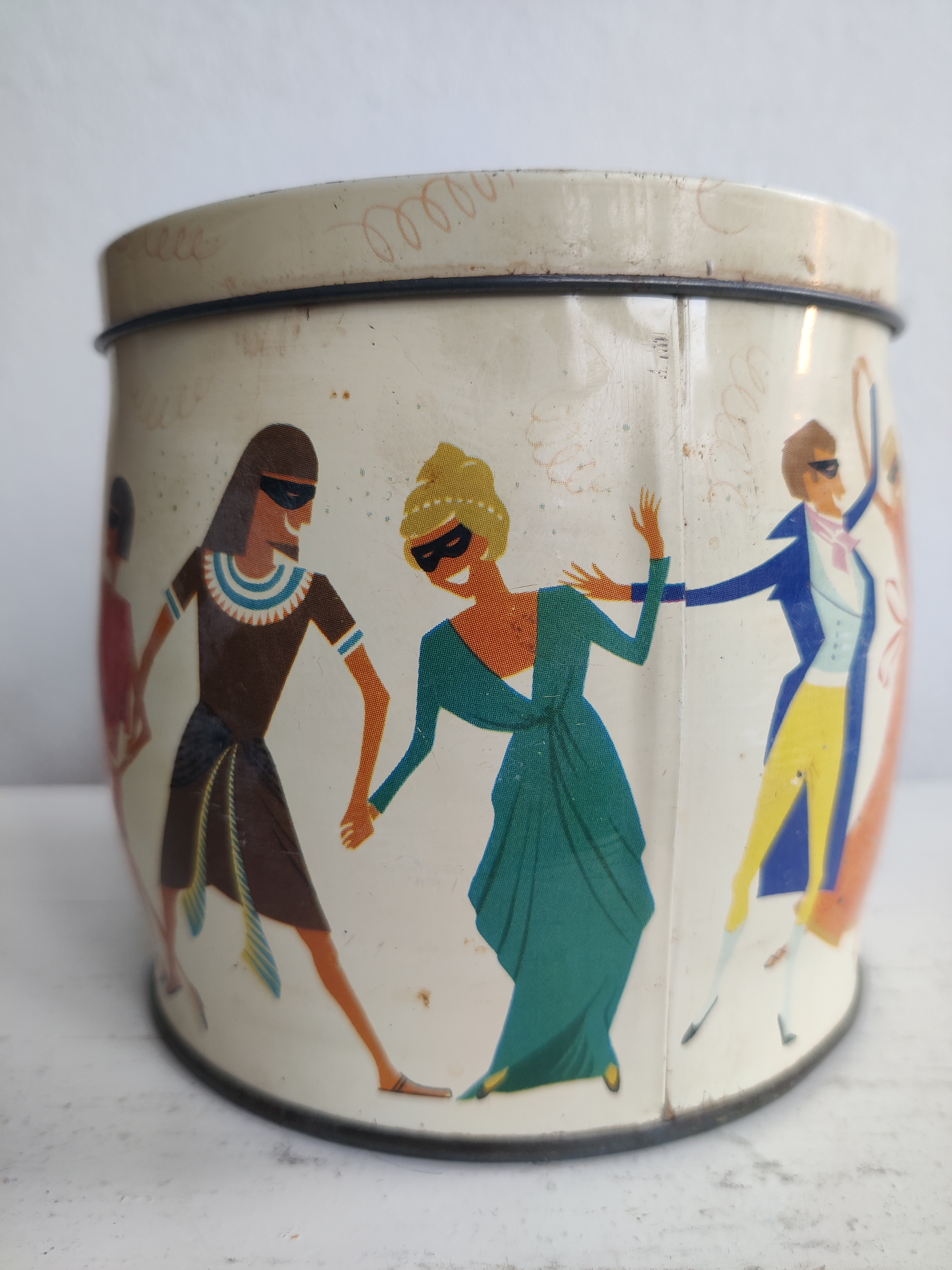 Fineste vintage dåse med dansende karnevals-gæster, udklædt som alt fra farao til skorstensfejer. Perfekt til fastelavn som pynt eller som gave til en, der holder kostumefest. Mål 11 x 11 cm.