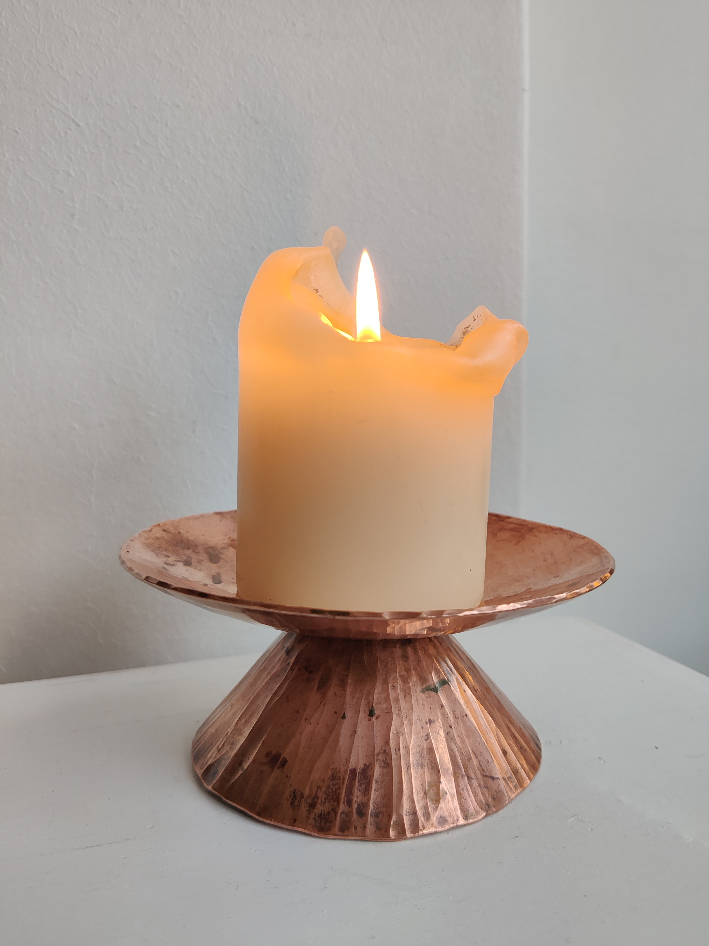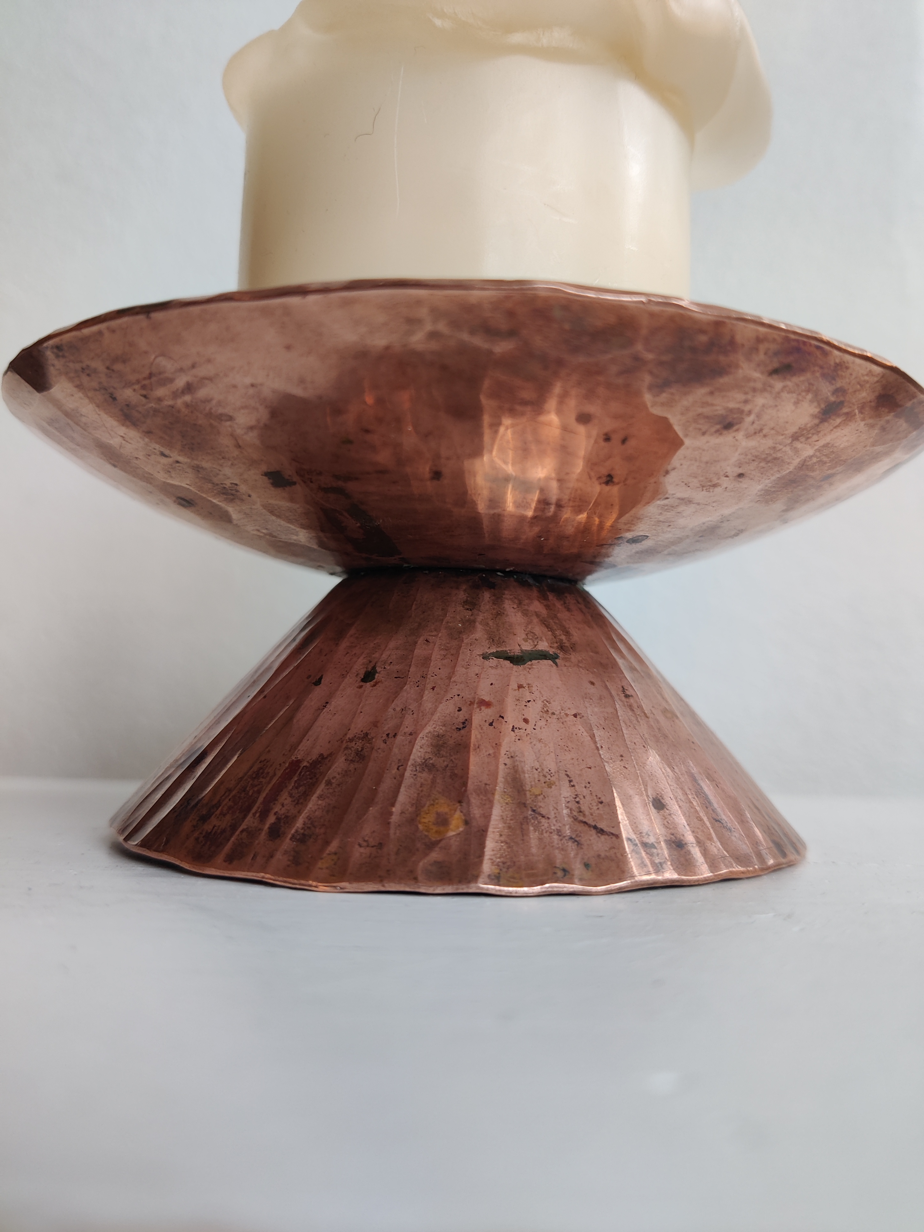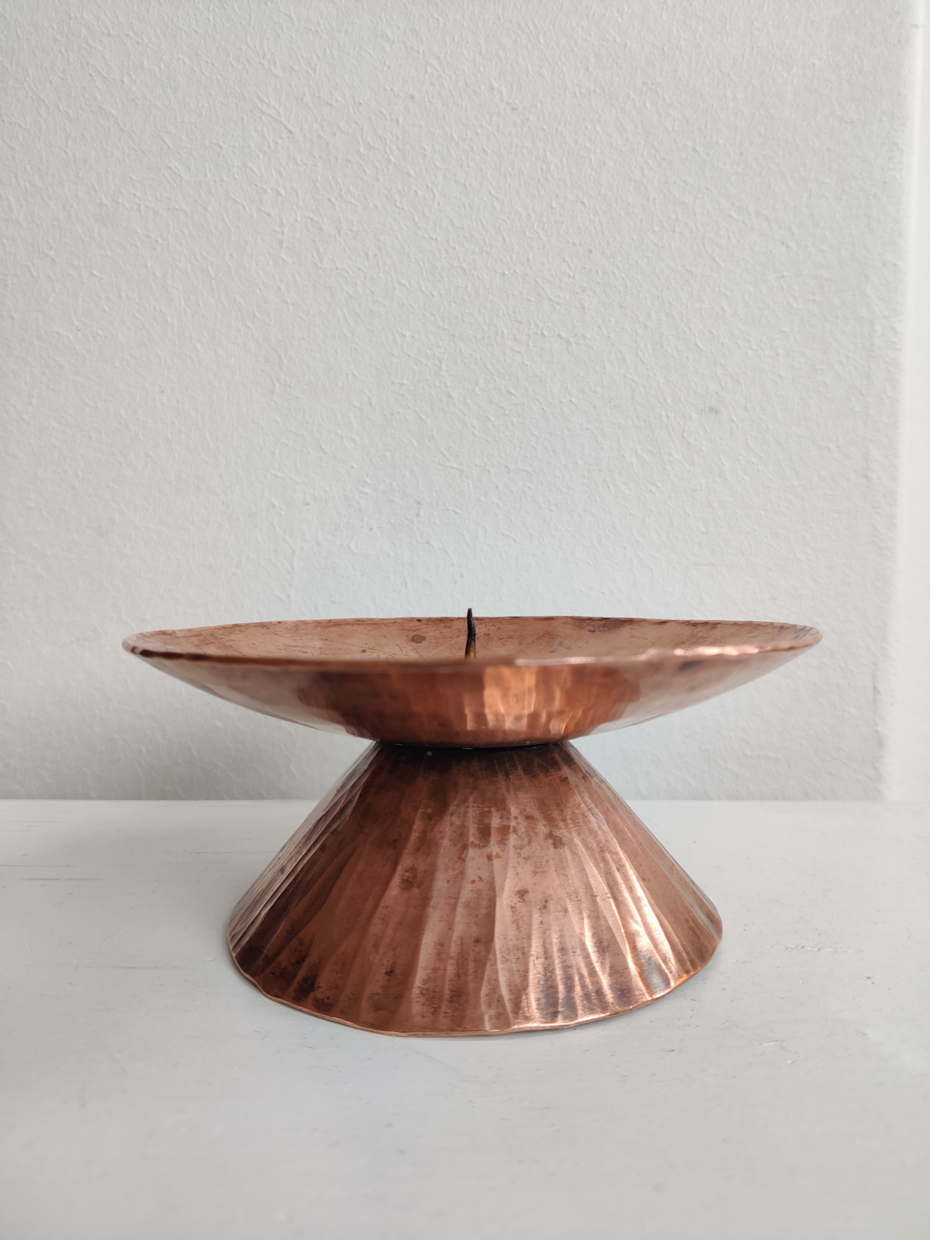 Bred og blæret hammerslået kobberstage med spir, så et bloklys kan stå uden at vælte. Helt vildt meget fra 1960'erne. Mål 13 x 6 cm.