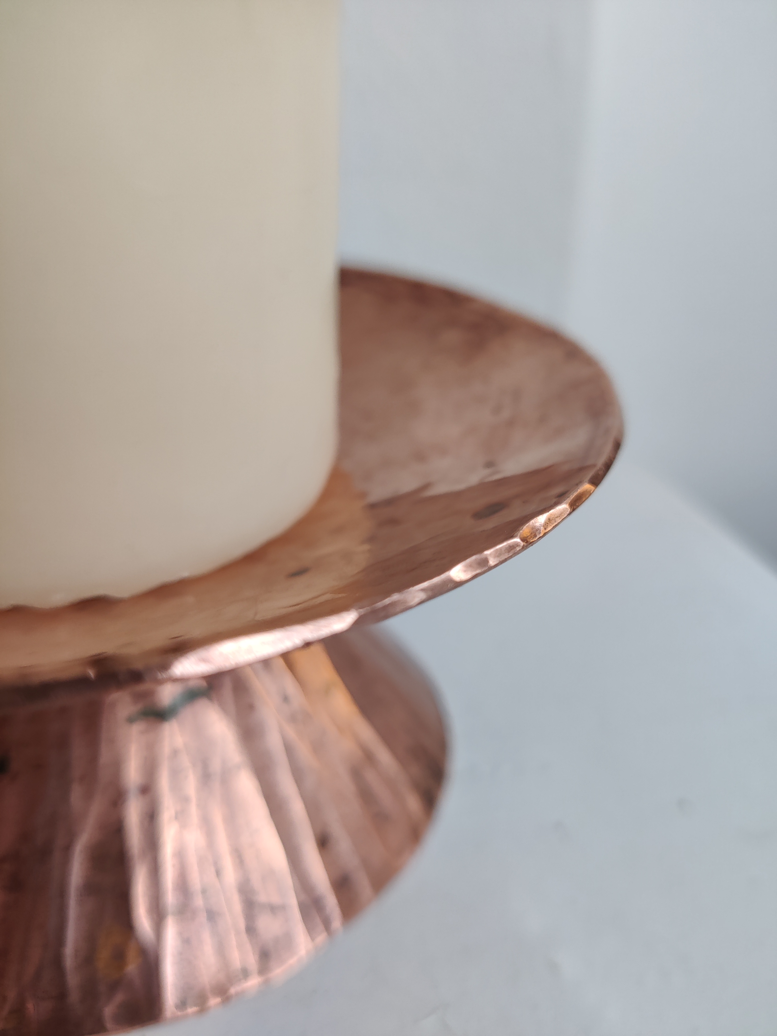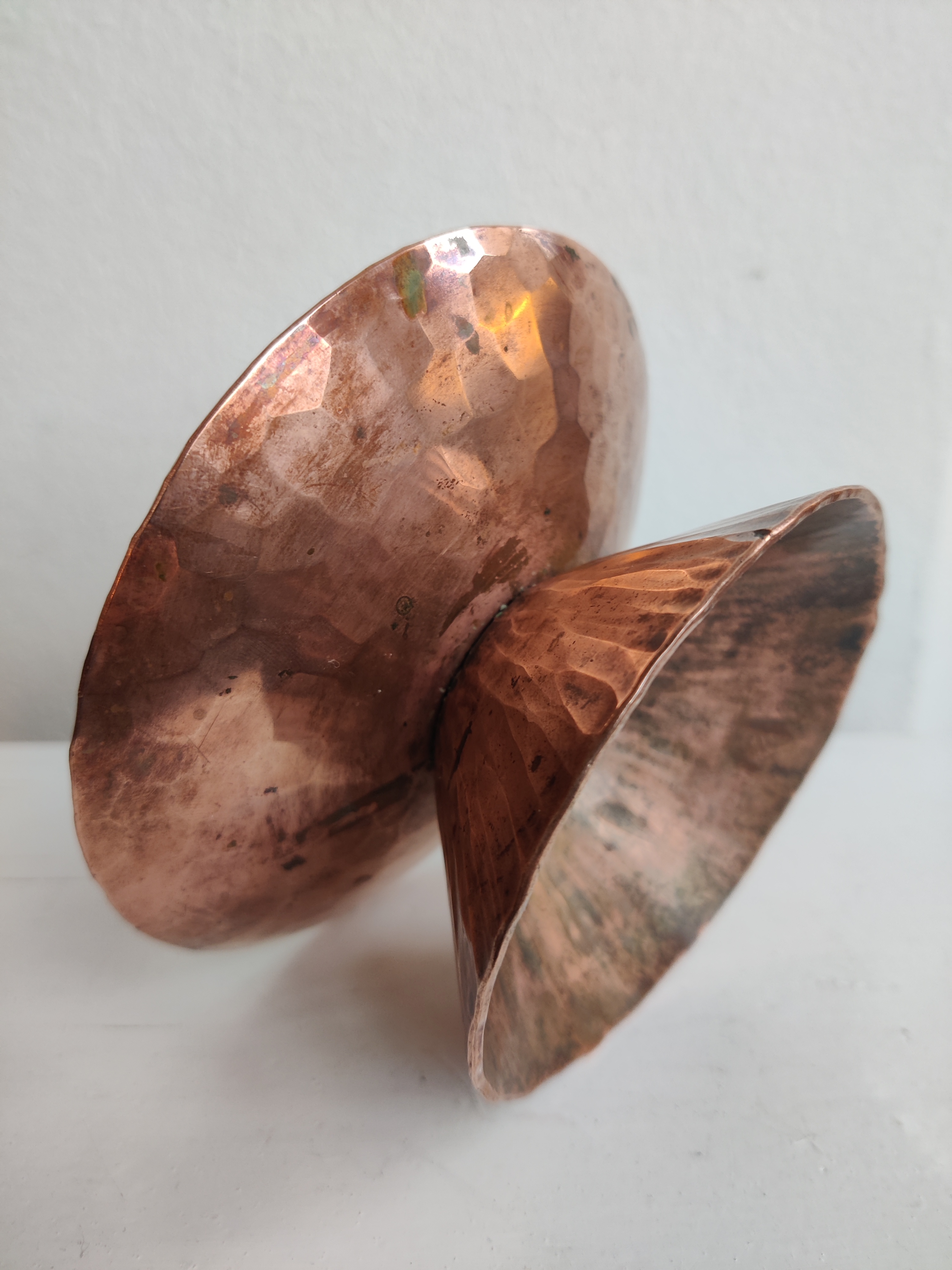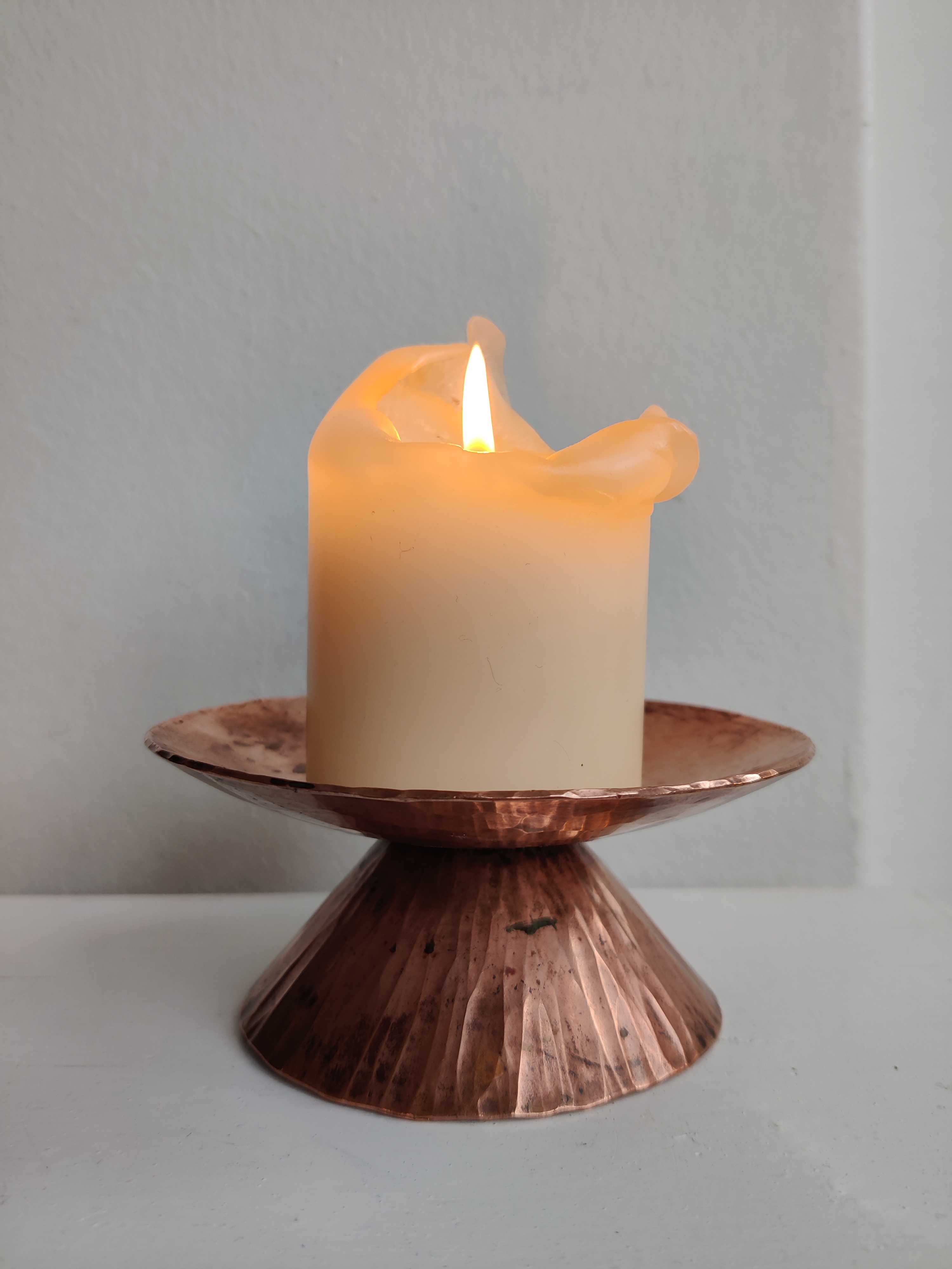 Bred og blæret hammerslået kobberstage med spir, så et bloklys kan stå uden at vælte. Helt vildt meget fra 1960'erne. Mål 13 x 6 cm.