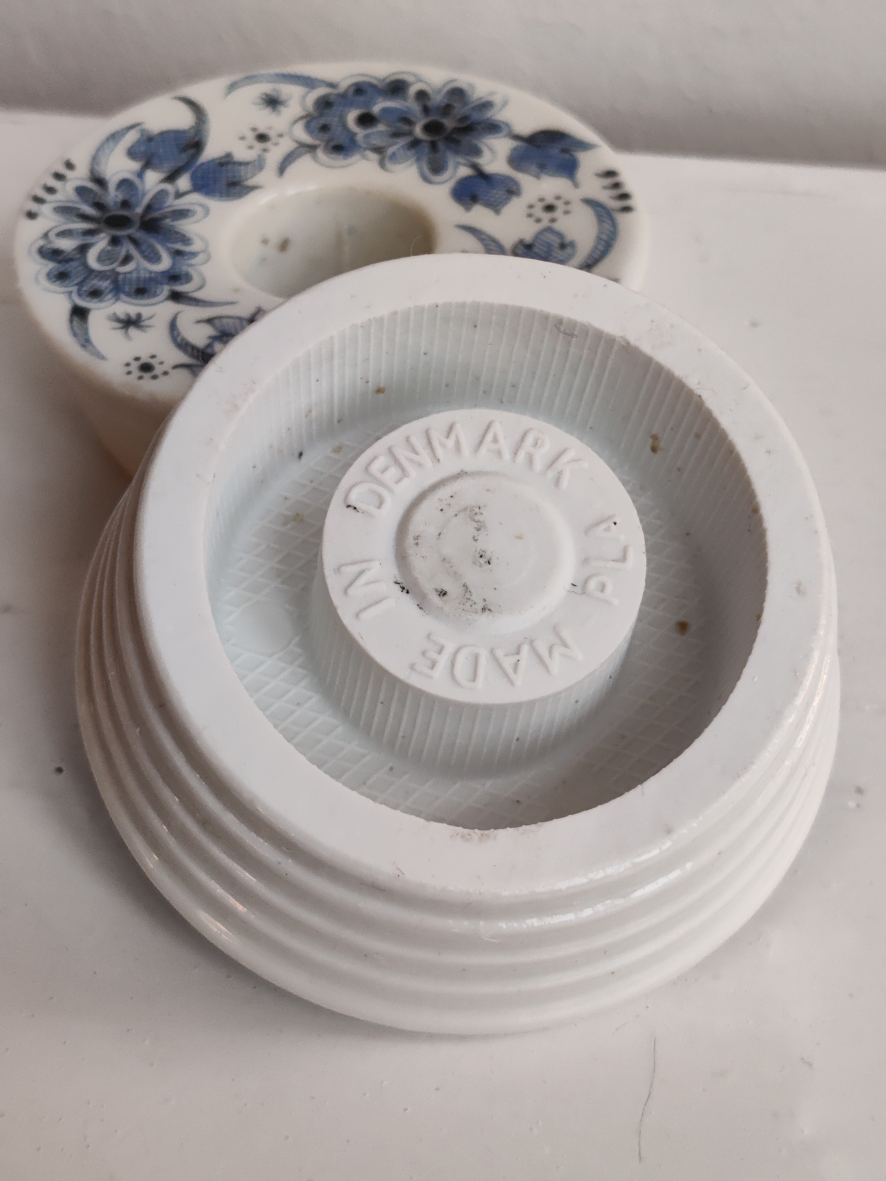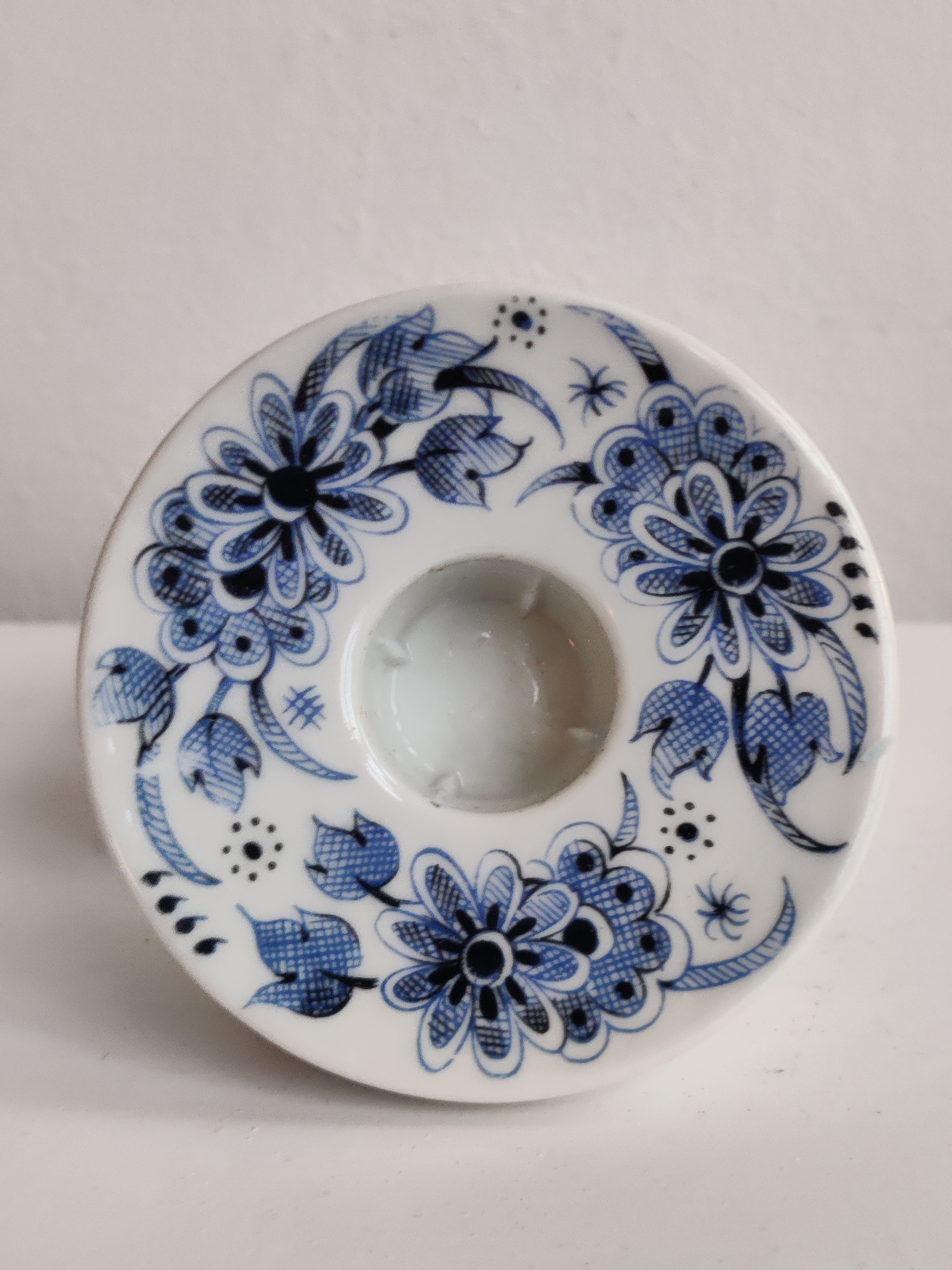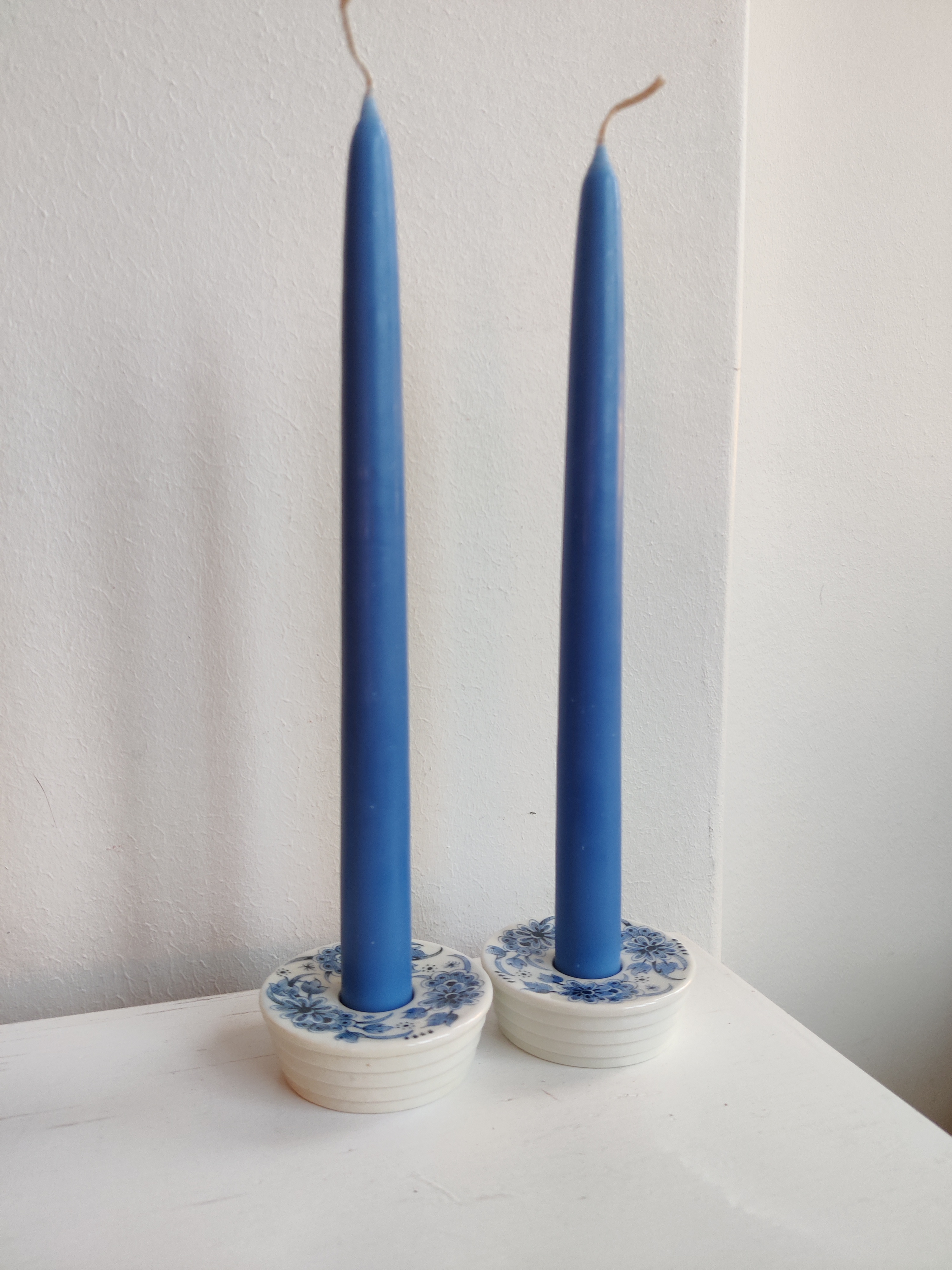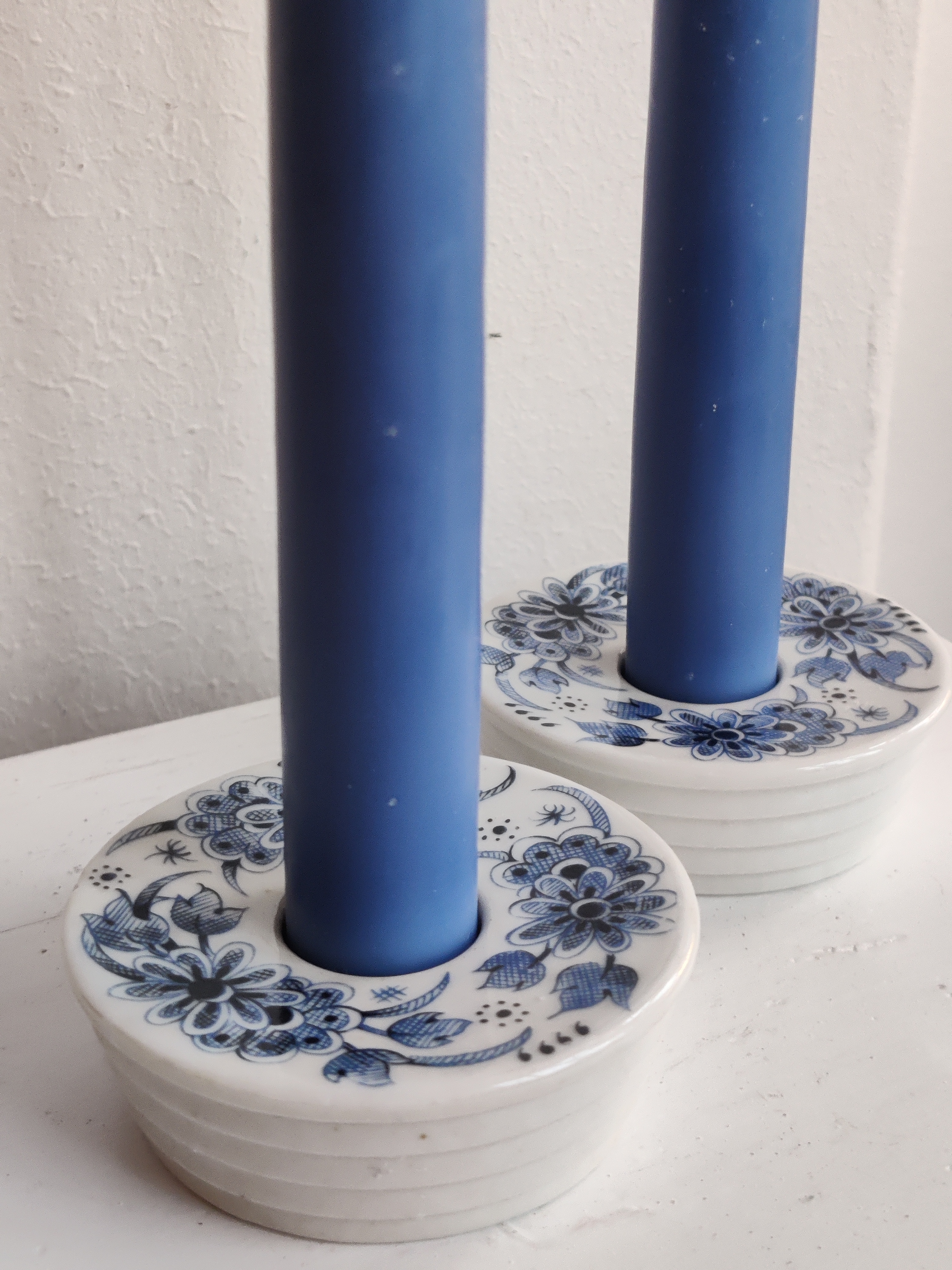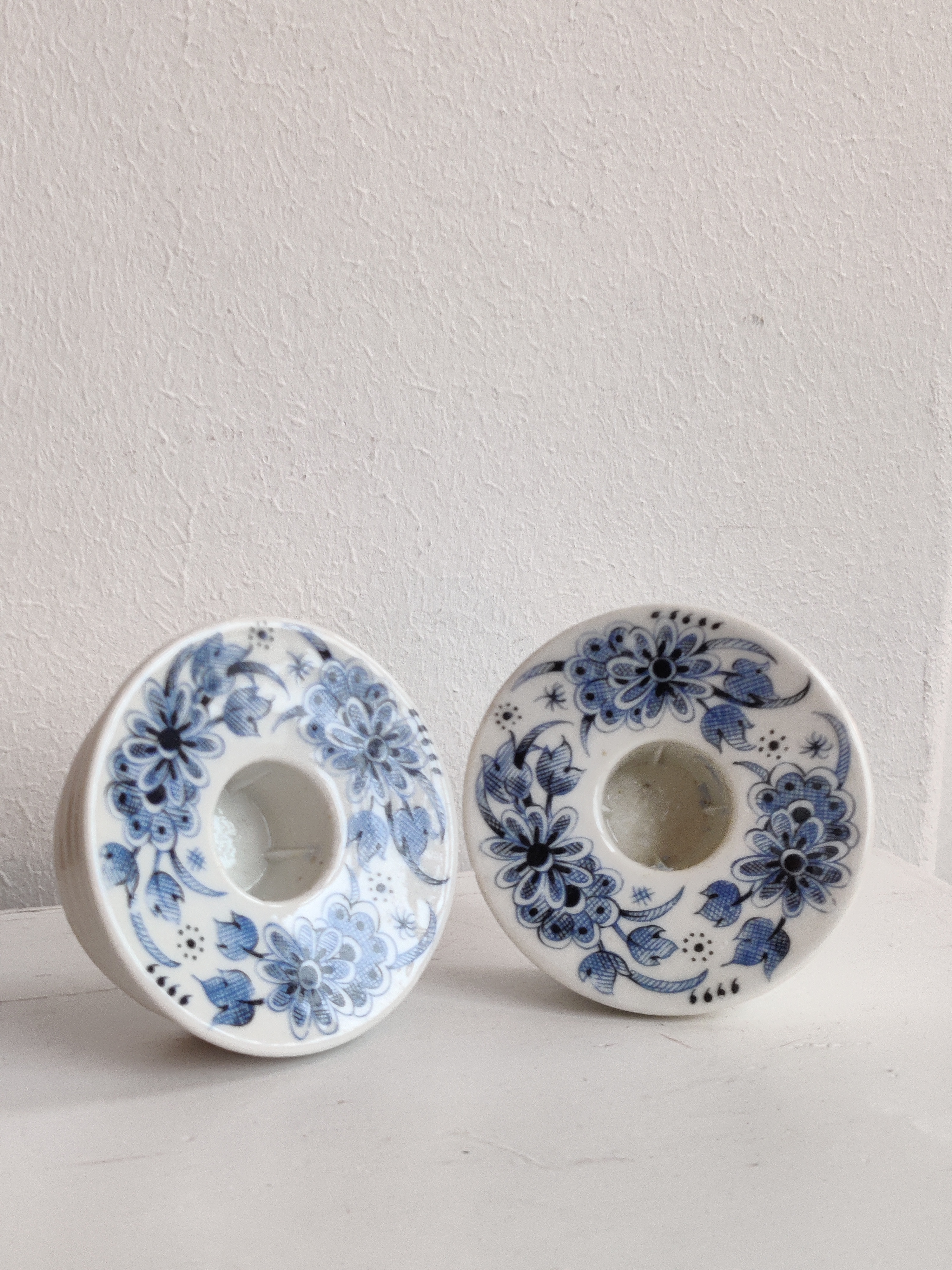 Et par fine stager i porcelæn, dekoreret med blå blomster. Passer til kronelys.