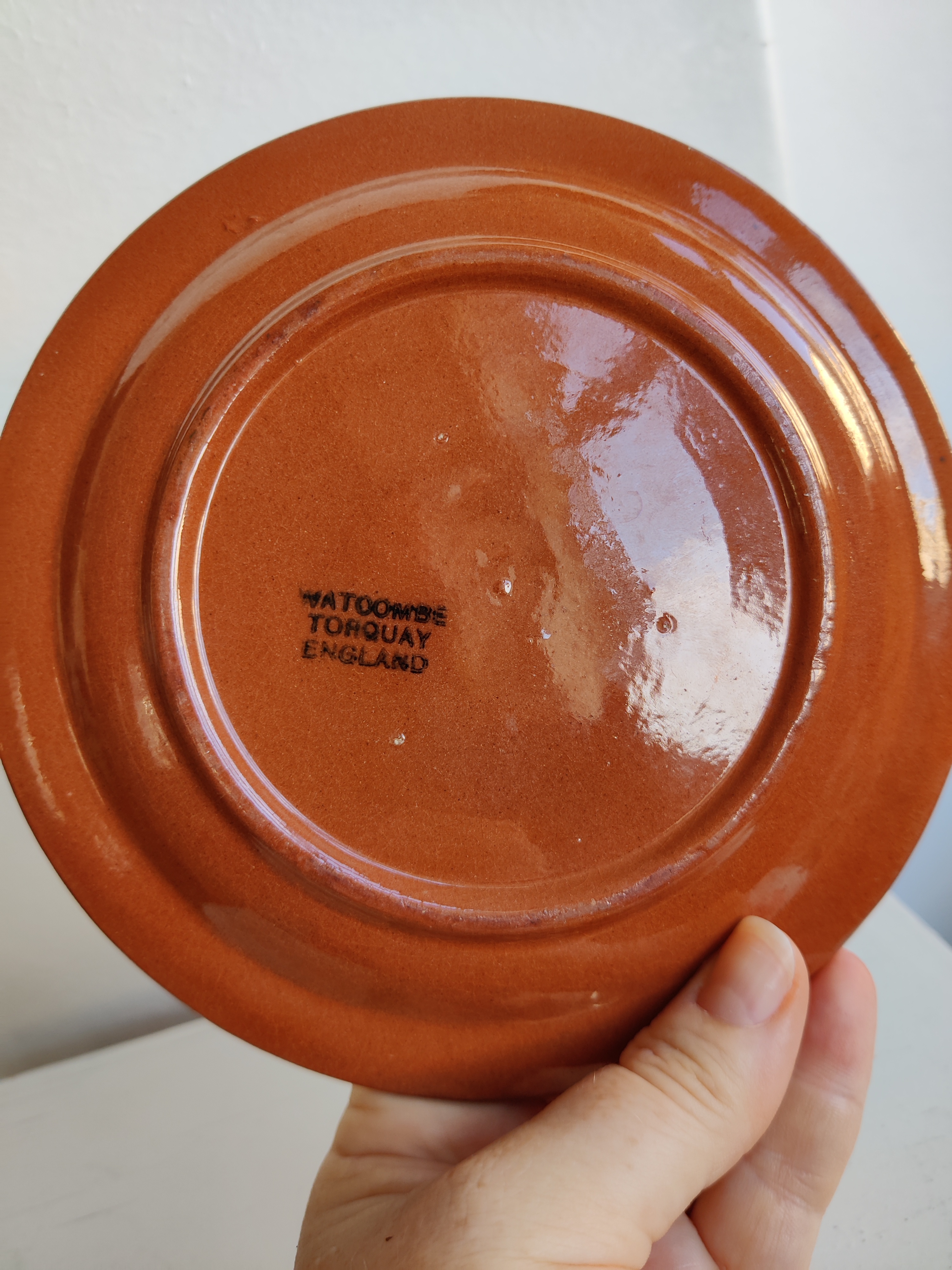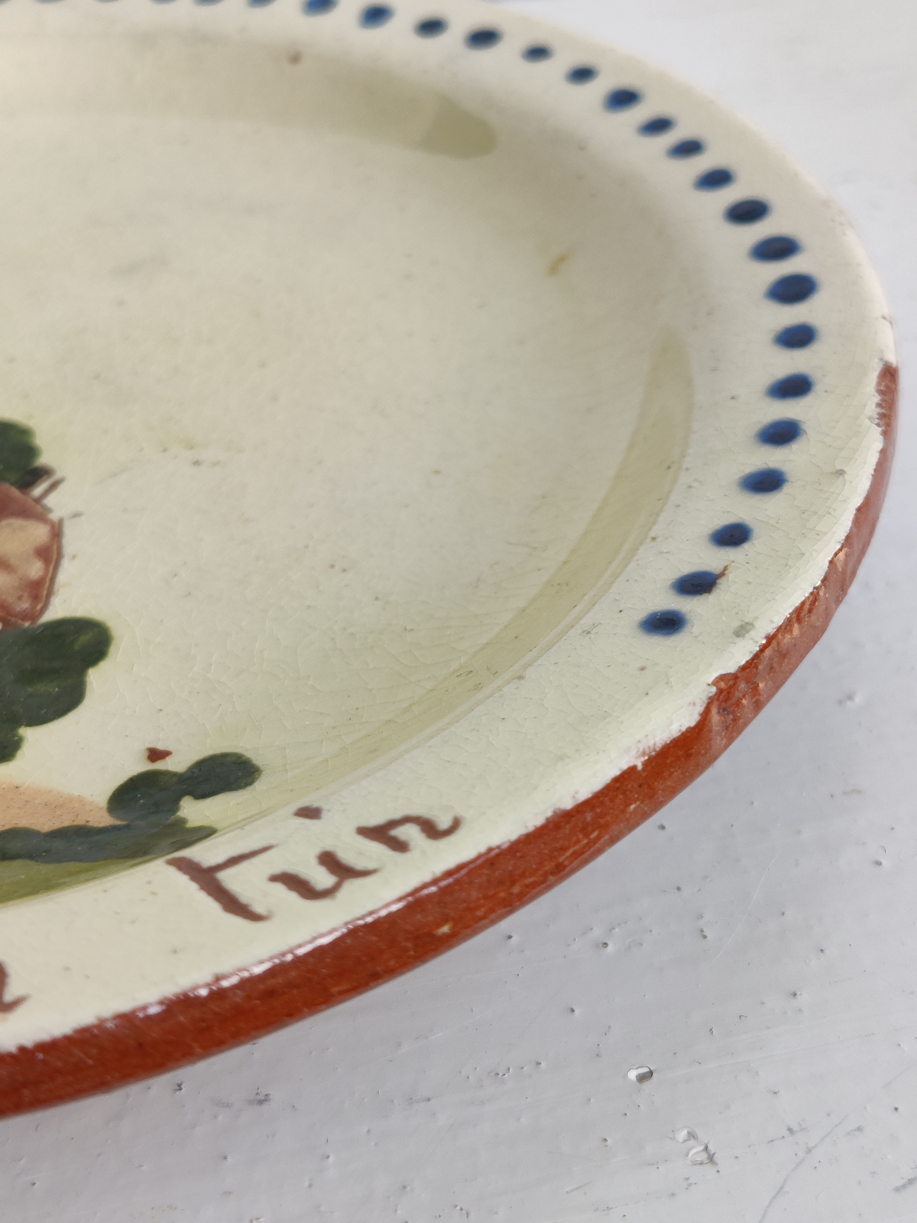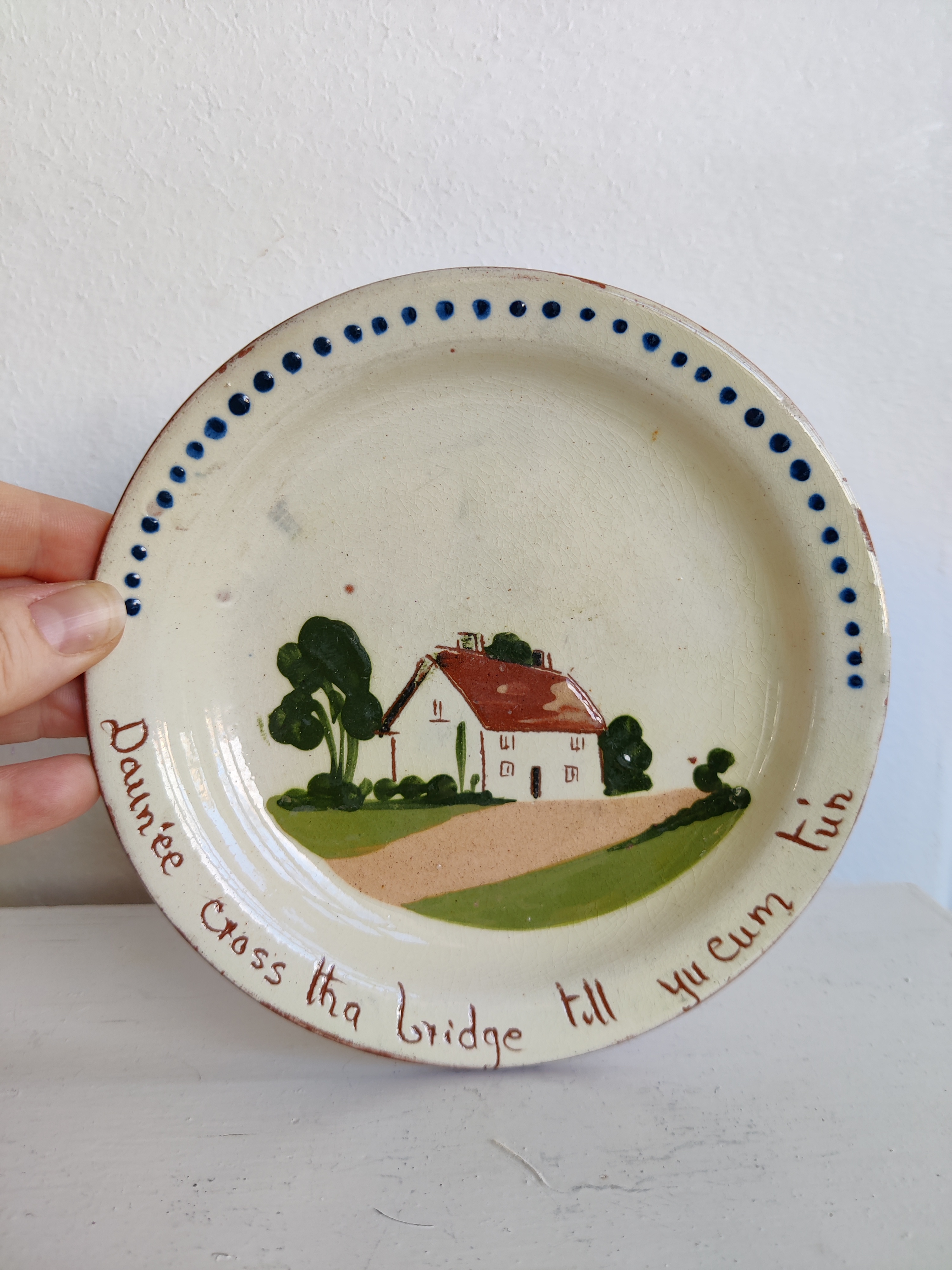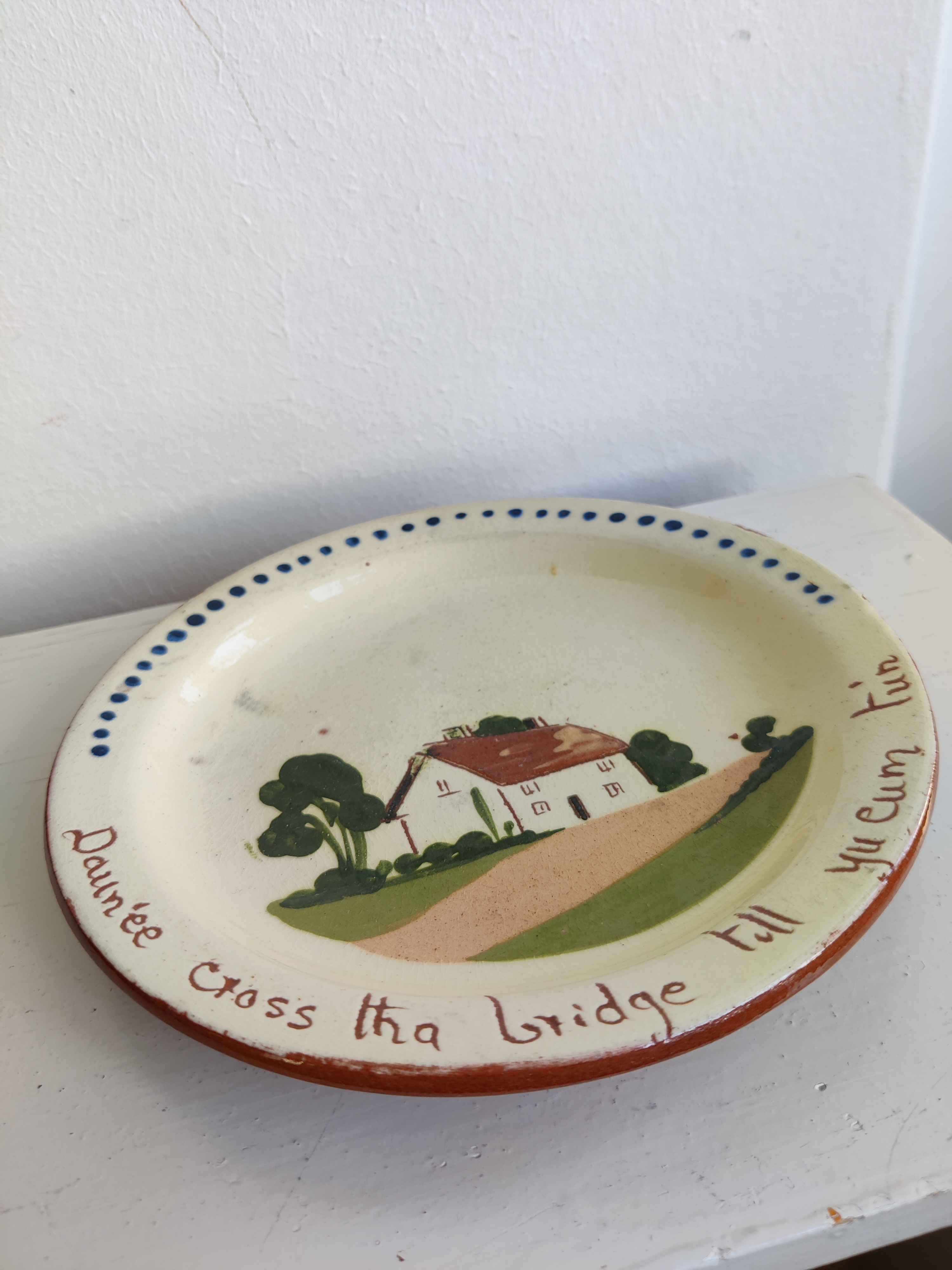 Keramiktallerken fra Devonshire i England. Vi er helt tilbage i 1930'erne, så det er en gammel svend. De lokale pottemagerier var kendt for motto ware, altså alverdens ting til køkkenet med ordsprog på, skrevet på Devon-dialekt. Her har vi "Don't cross the bridge till you get to it", hvilket jo, uanset sprog, er en meget klog leveregel 💡❤️