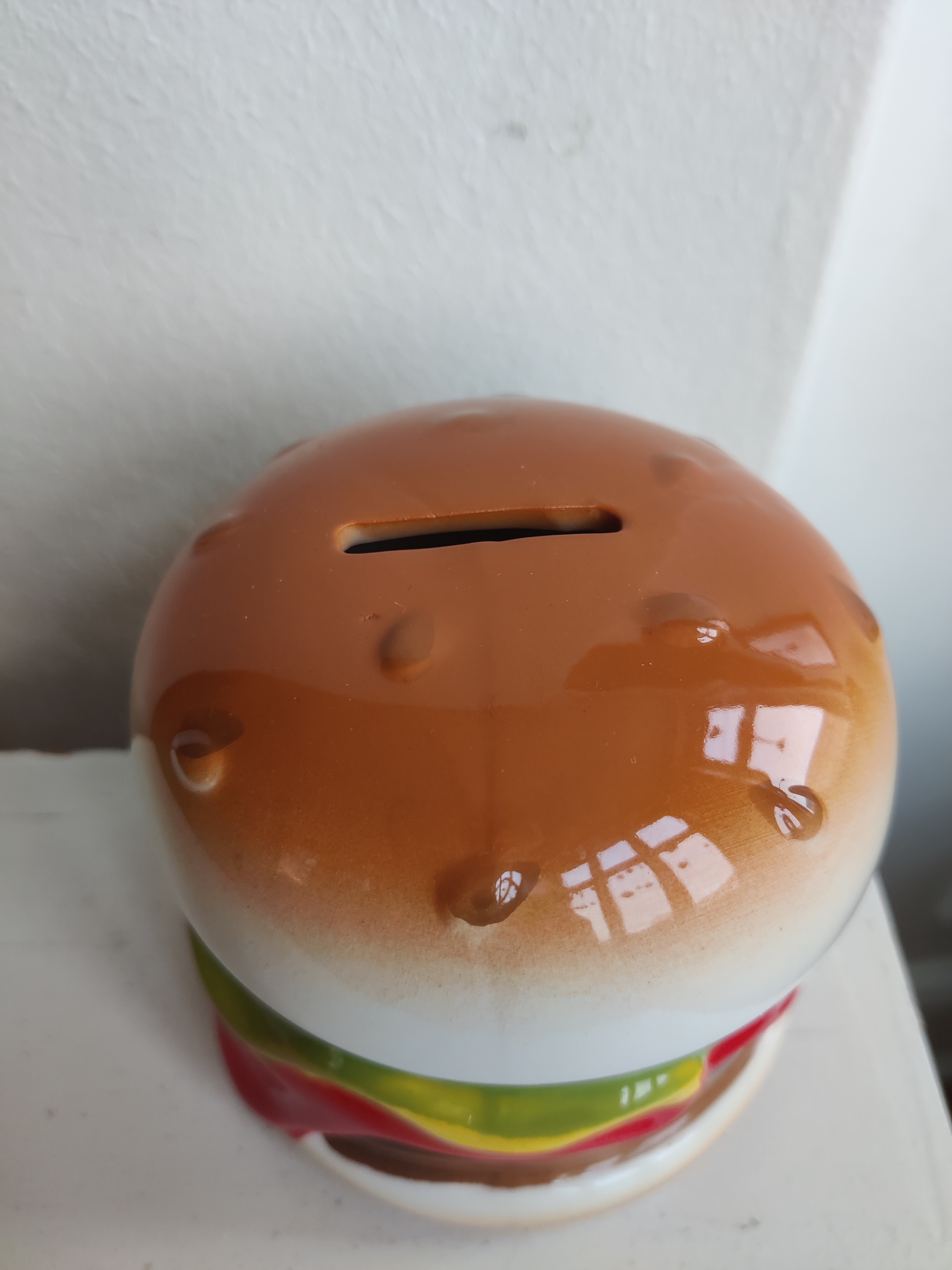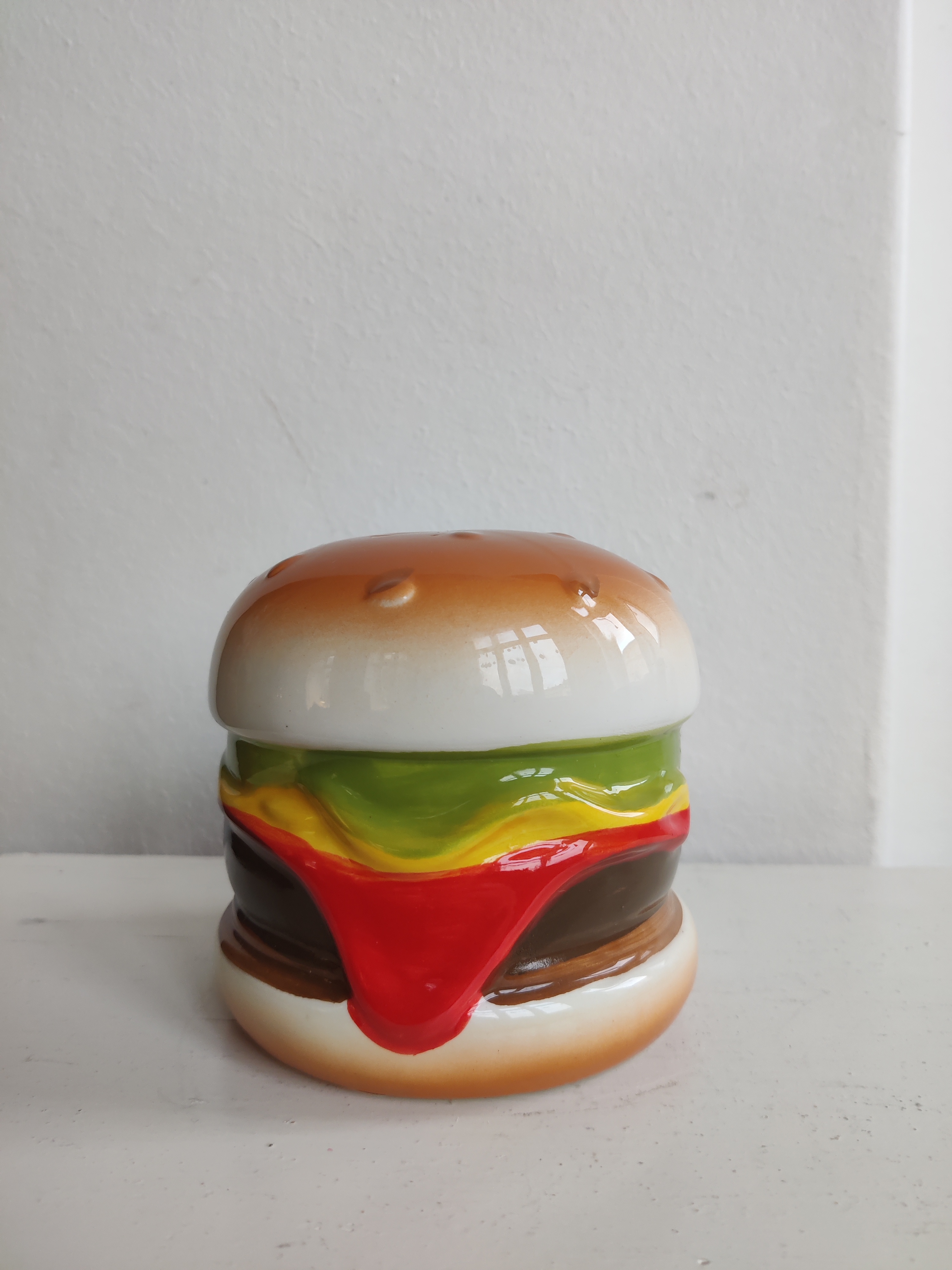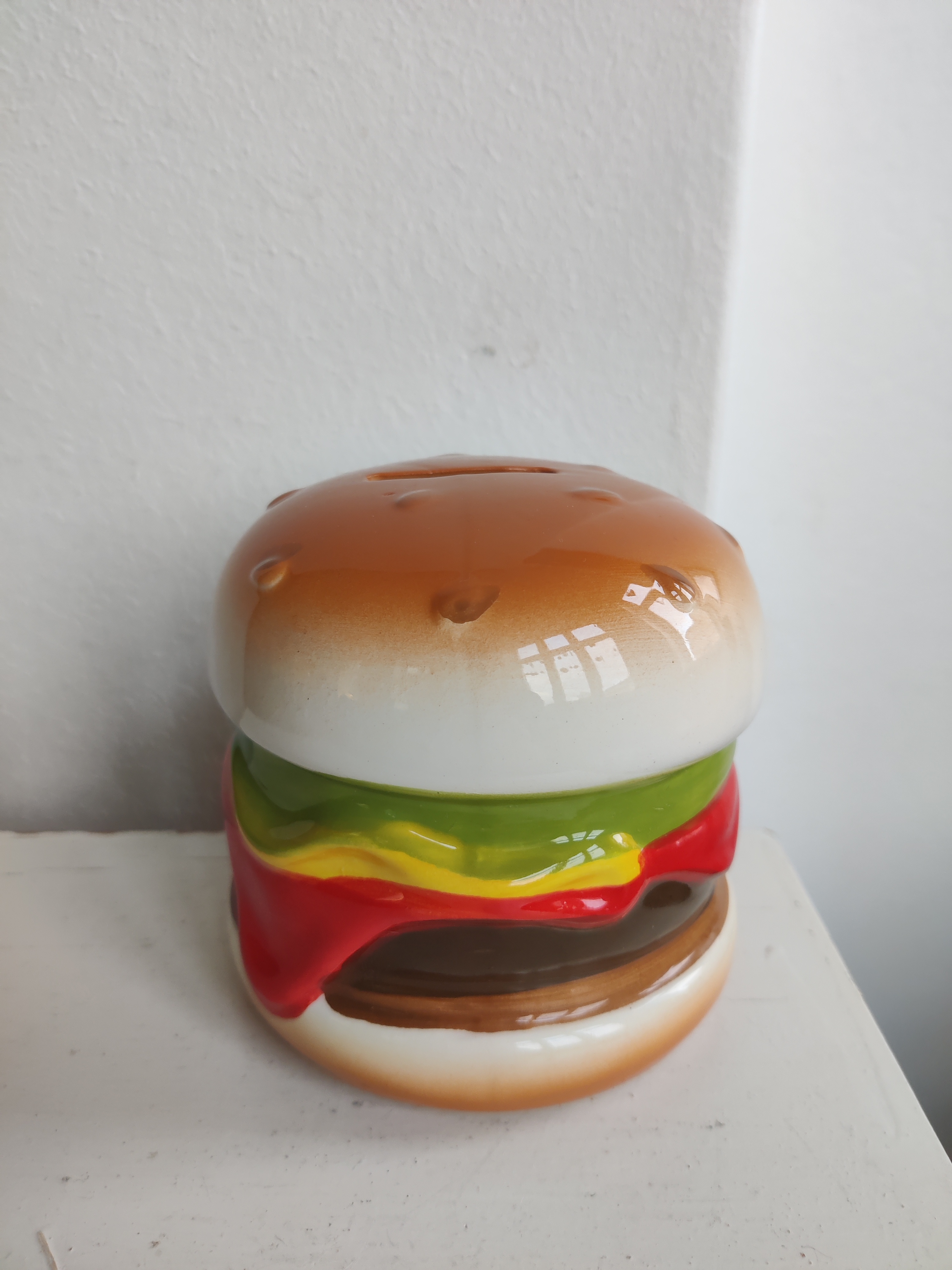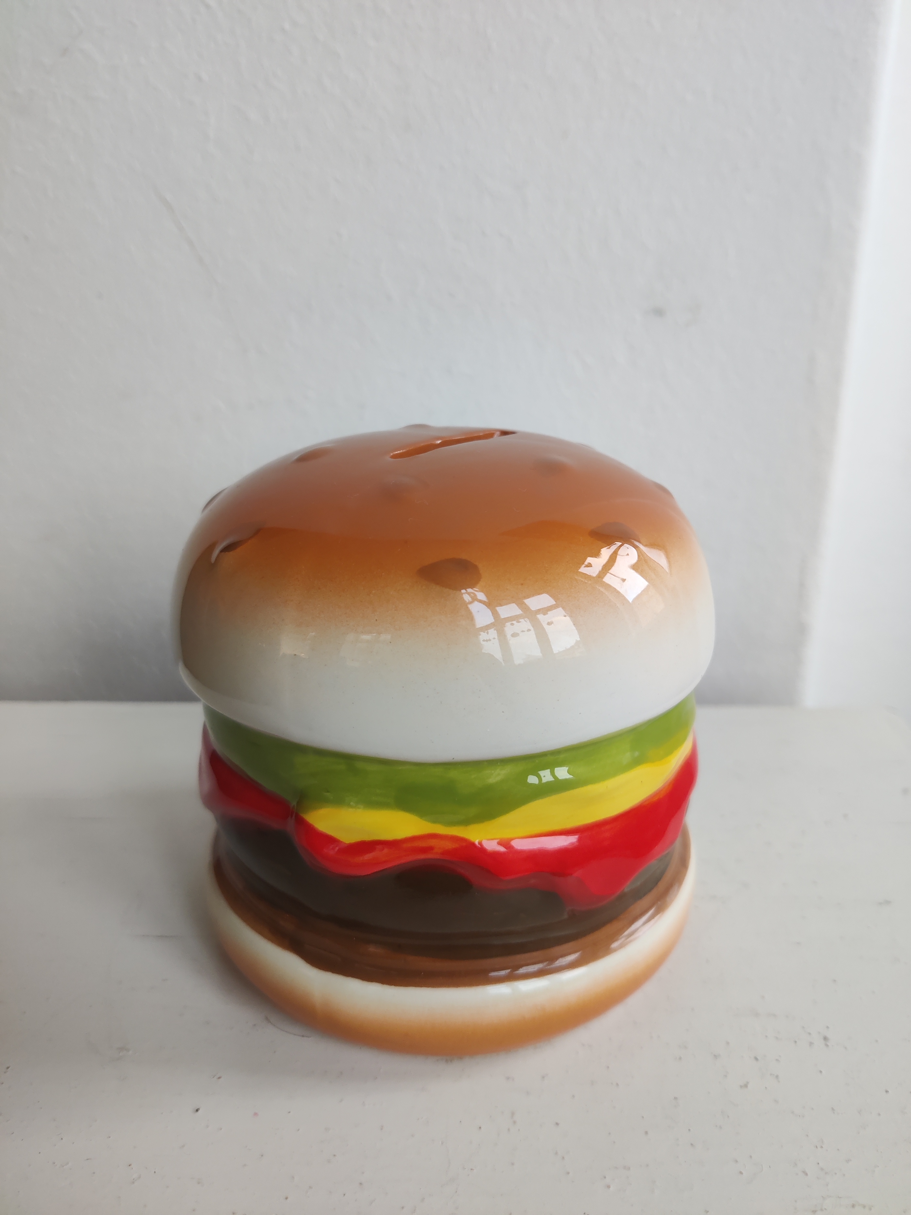 Spar op til en tur på burgerbar? Sjov sparebøsse i keramik med gummiprop. Mål ca 10 x 11 cm.