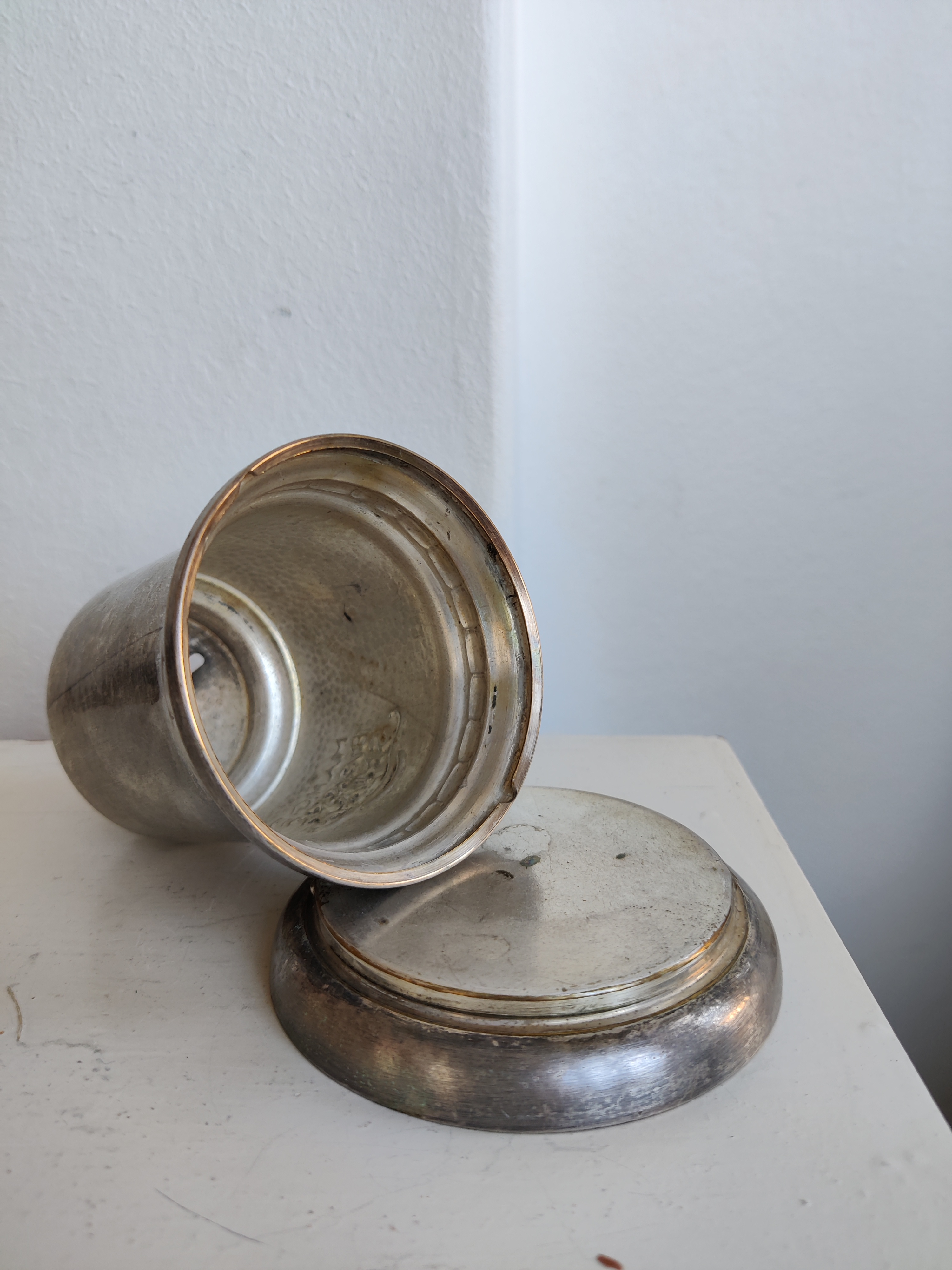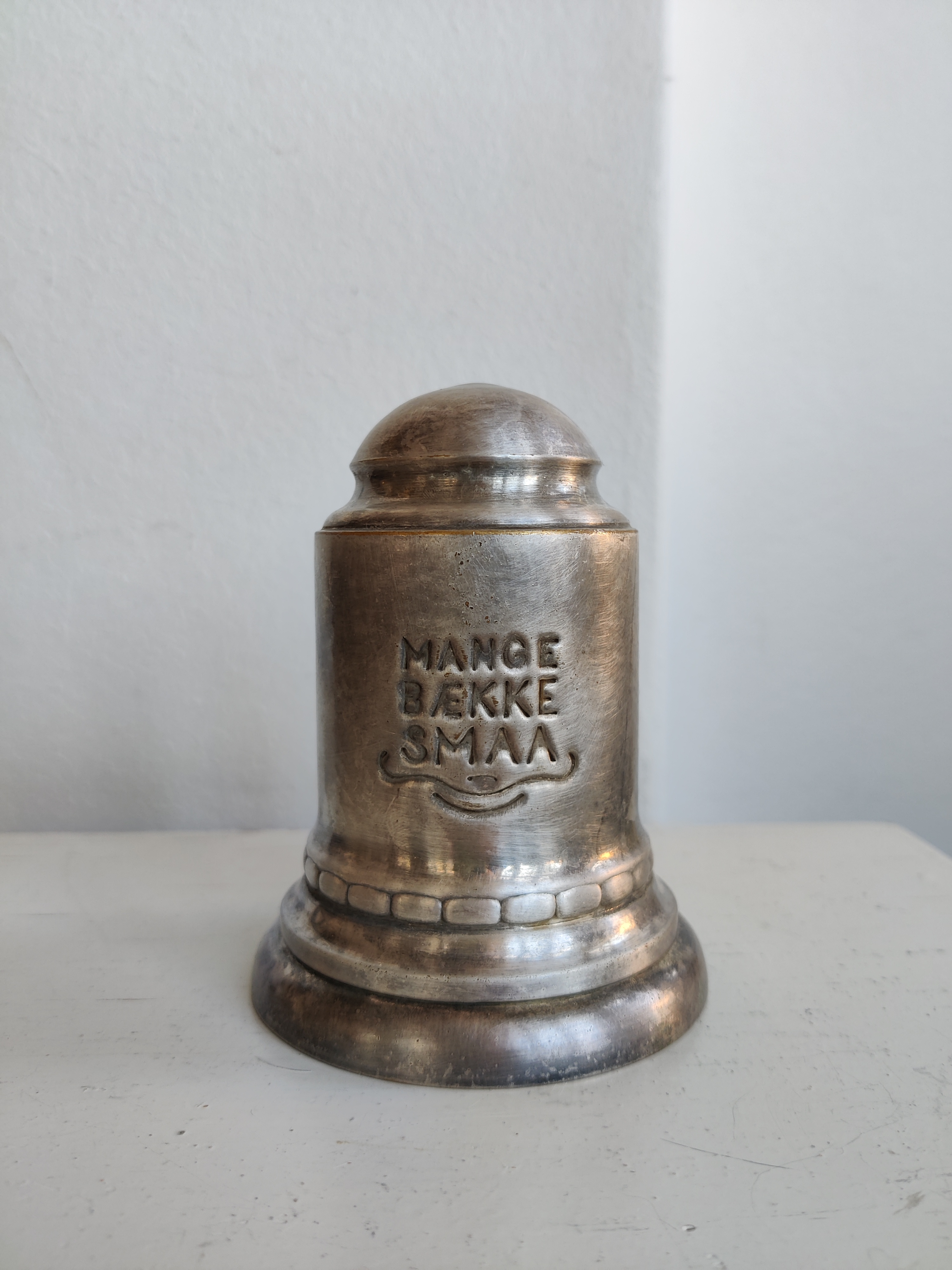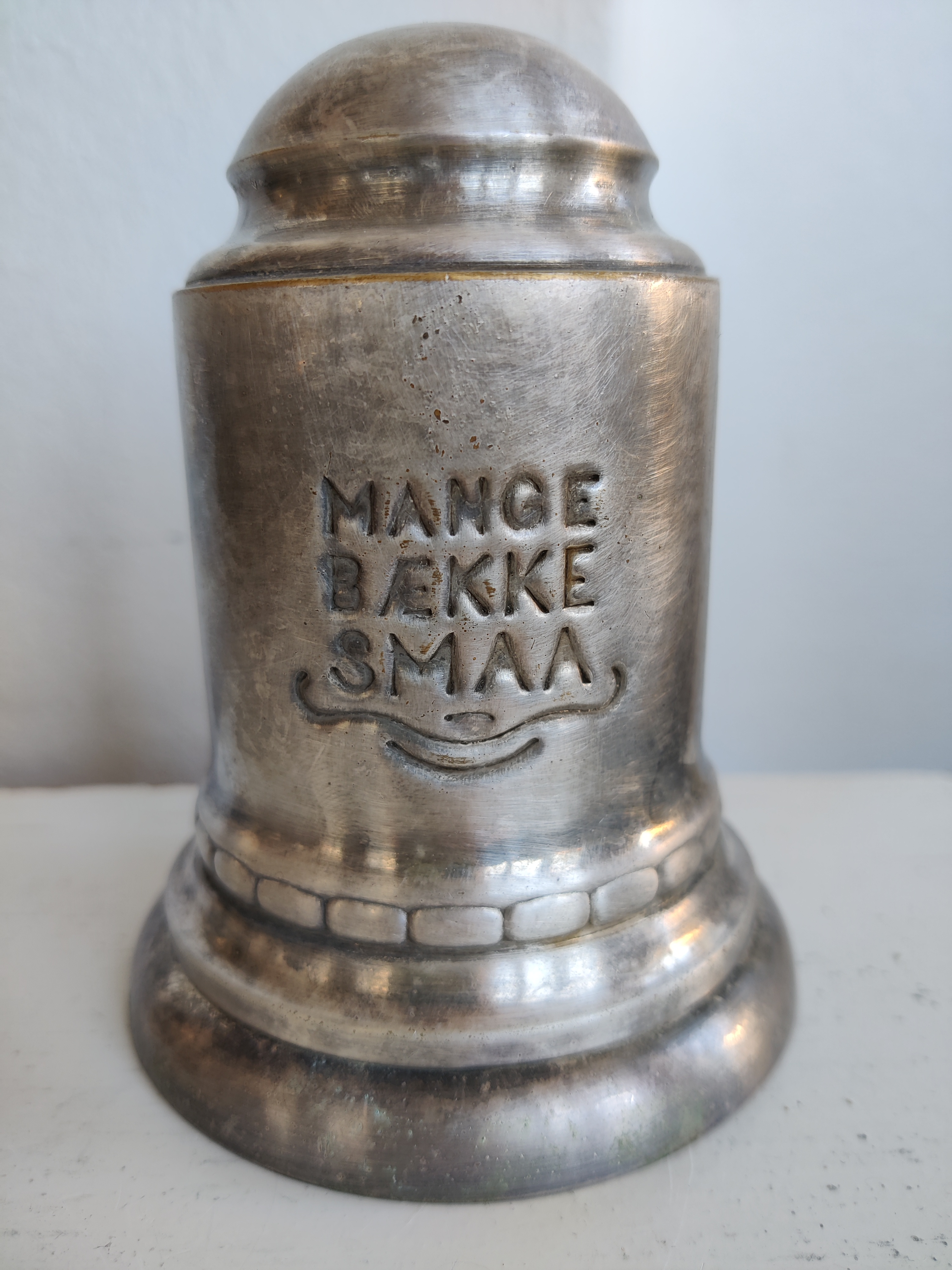 Charmerende sparebøsse i tin med teksten Mange bække smaa. Den er stemplet Fredericia Sølvvare Fabrik, og stammer fra engang før bolle-å blev indført. Kan skilles ad, se billeder. Mål 12 x 9 cm.
