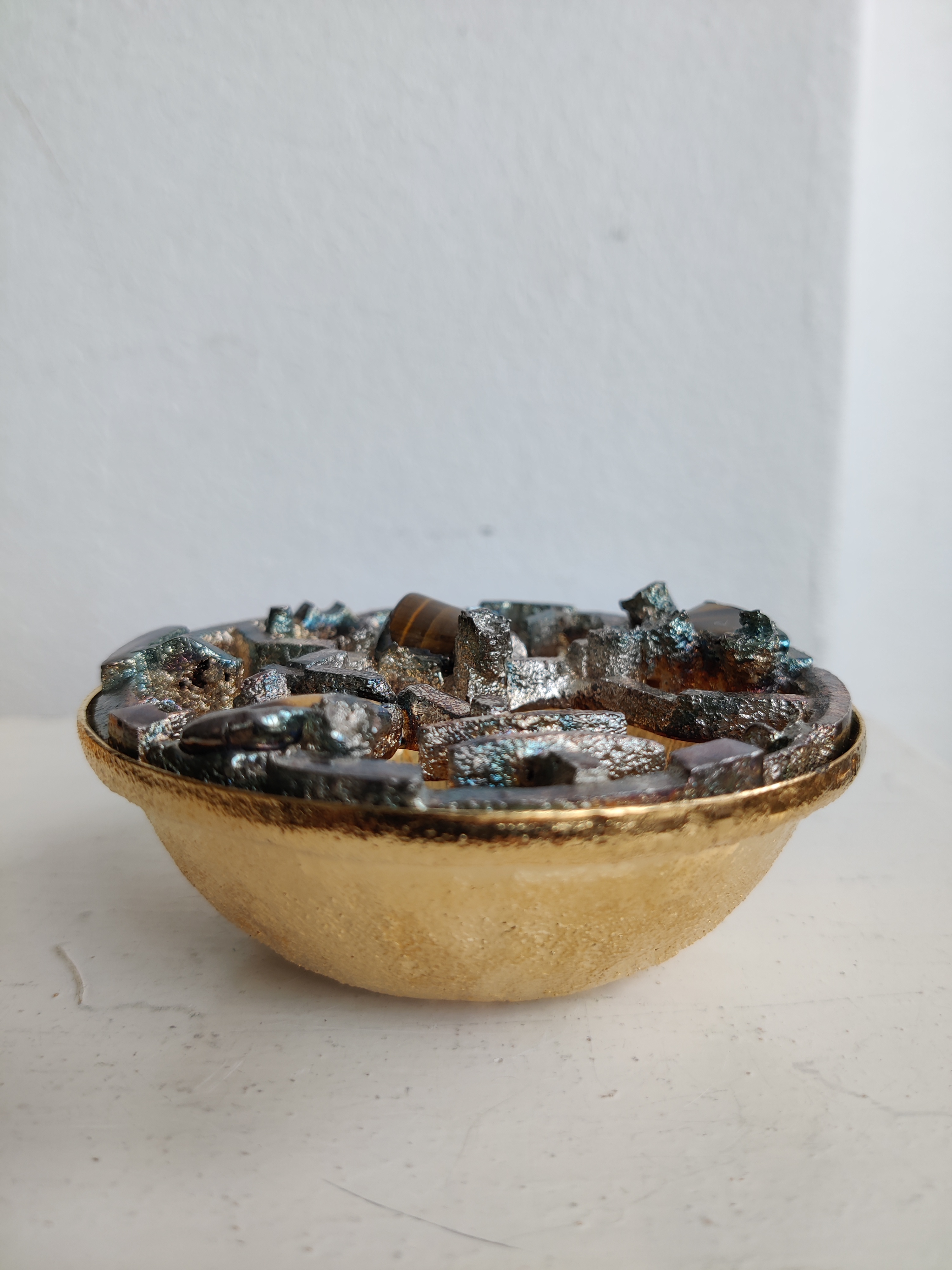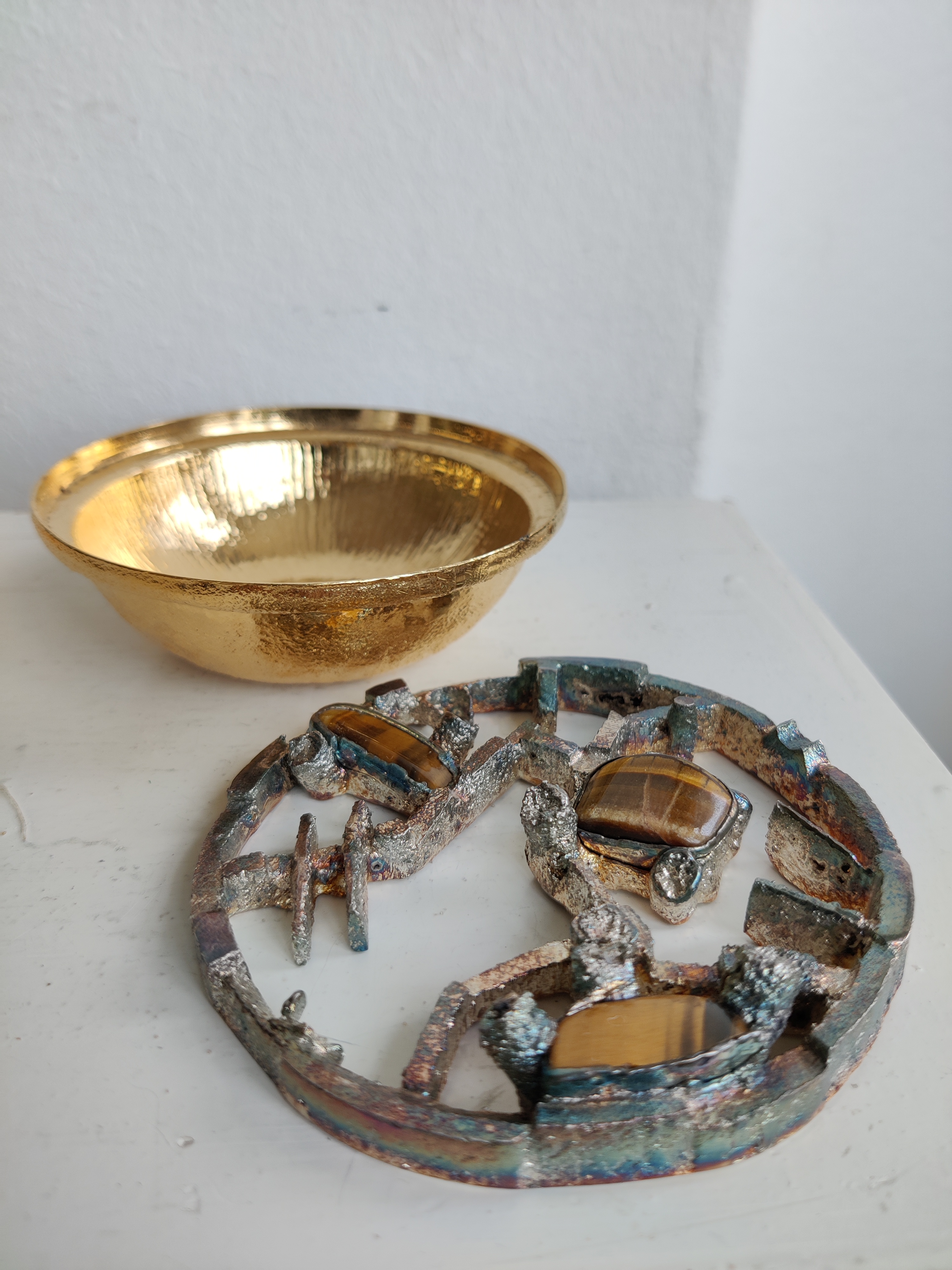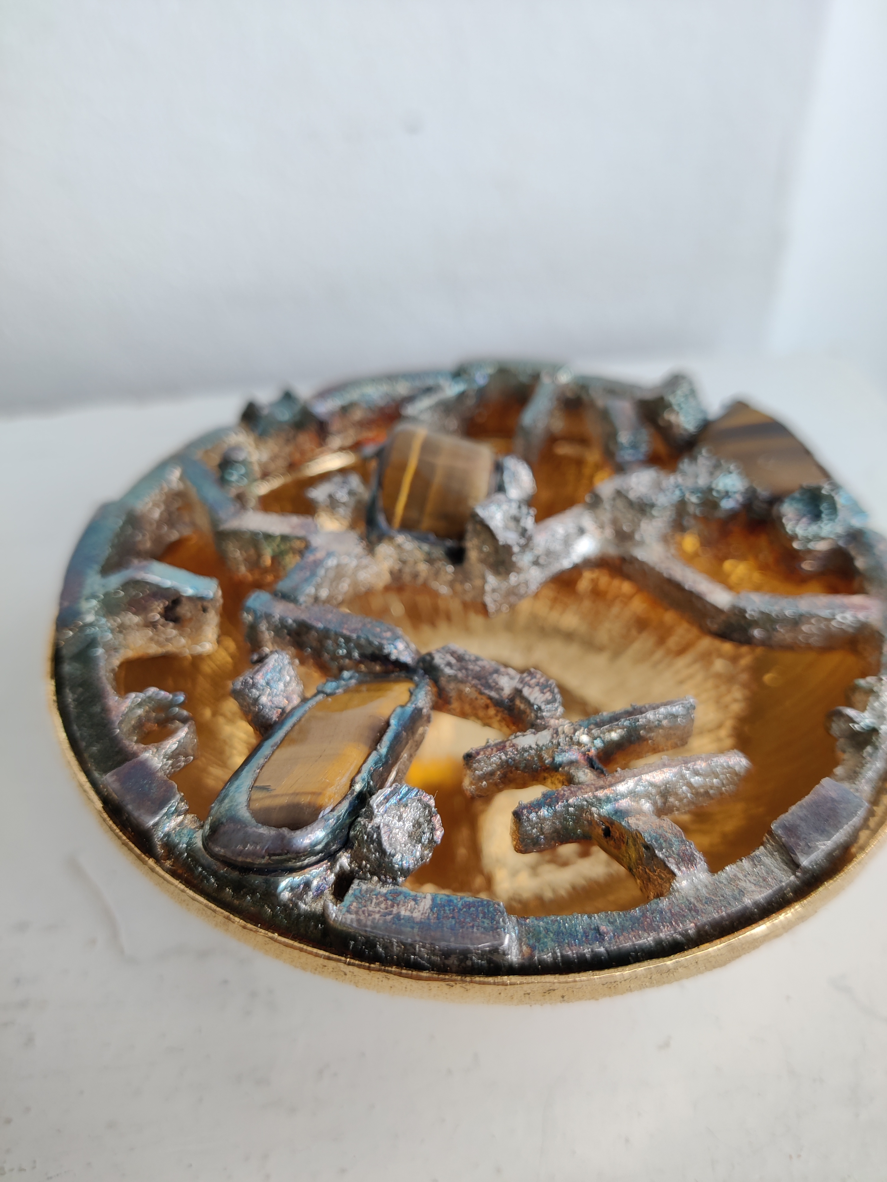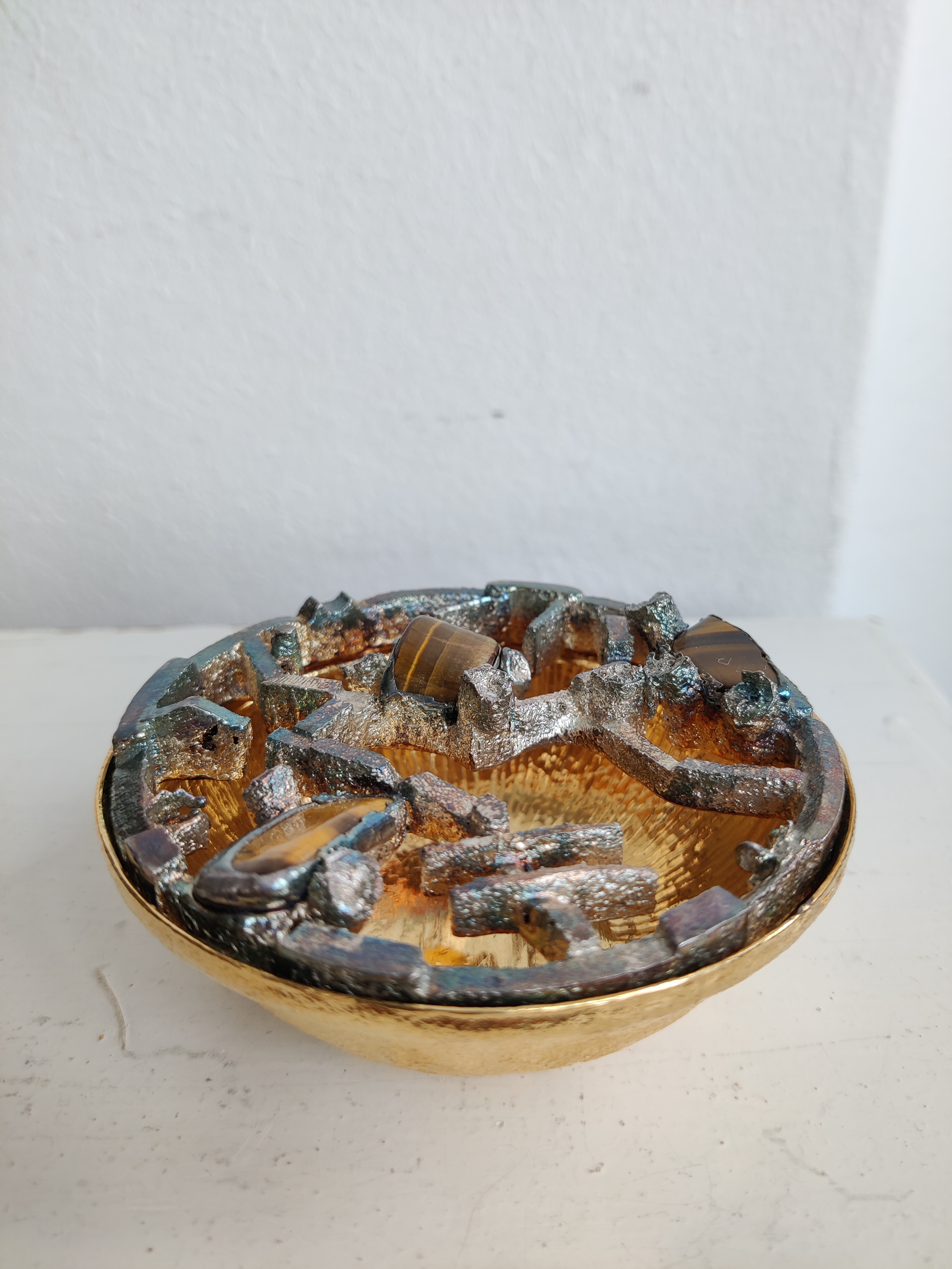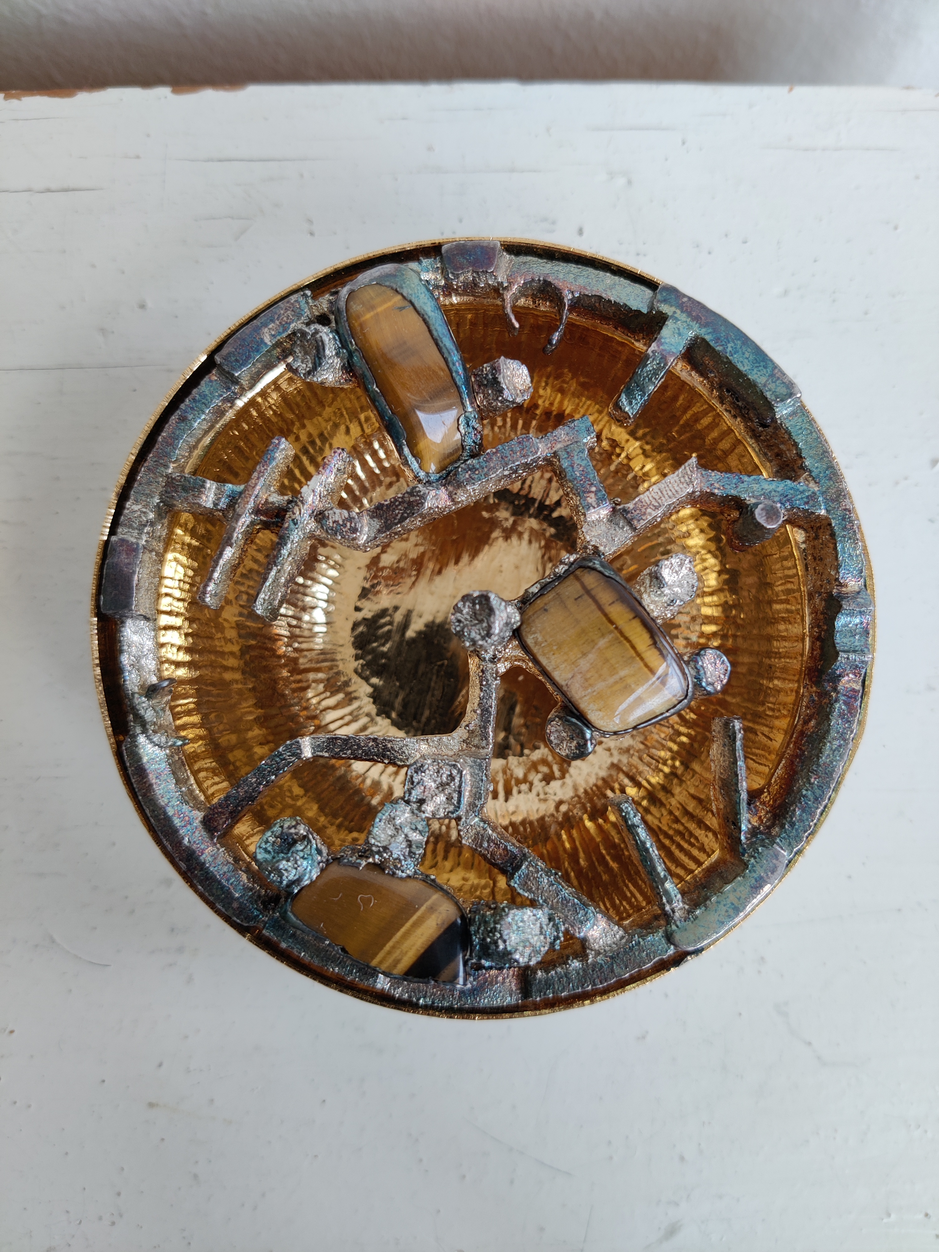Unika potpourriskål i moderne, brutalistisk design fra 1960-1970. Skandinavisk, sandsynligvis finsk. Håndlavet med indlagte tigerøje sten og forsølvet. Toppen er tung, skålen er let, og målene er 8,5 x 3 cm.