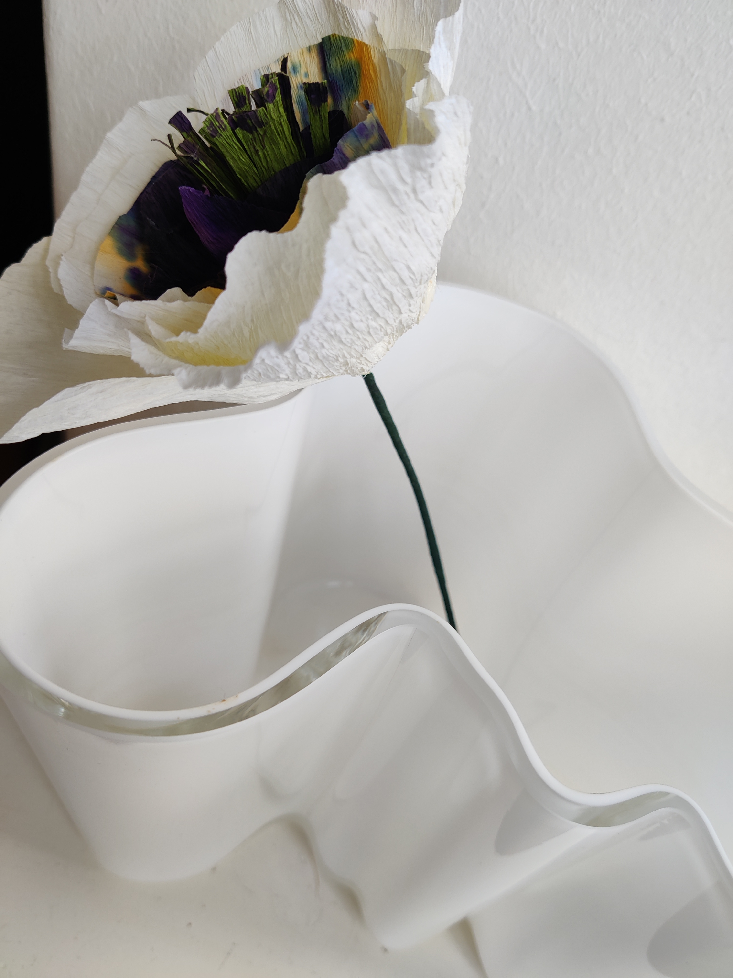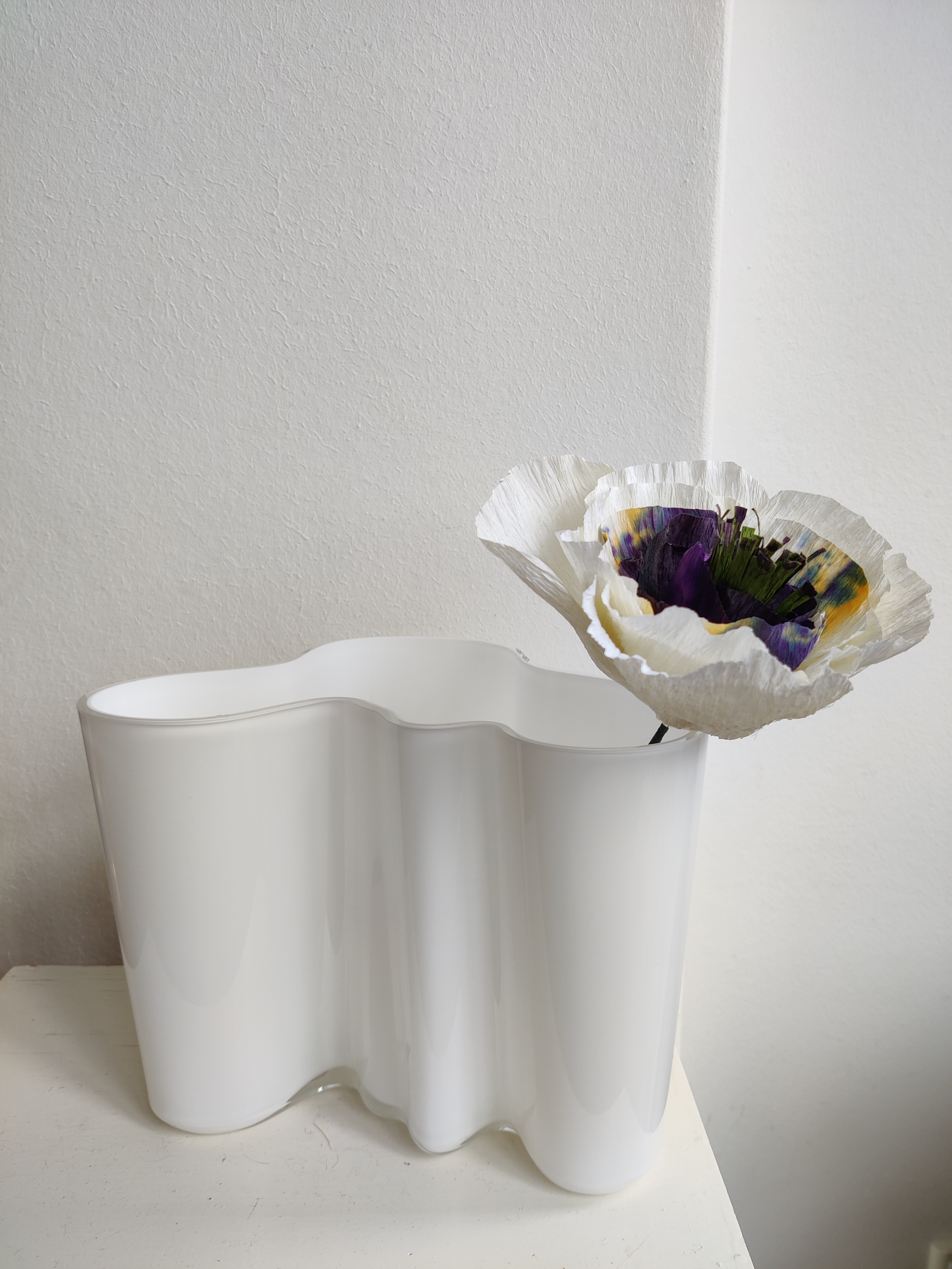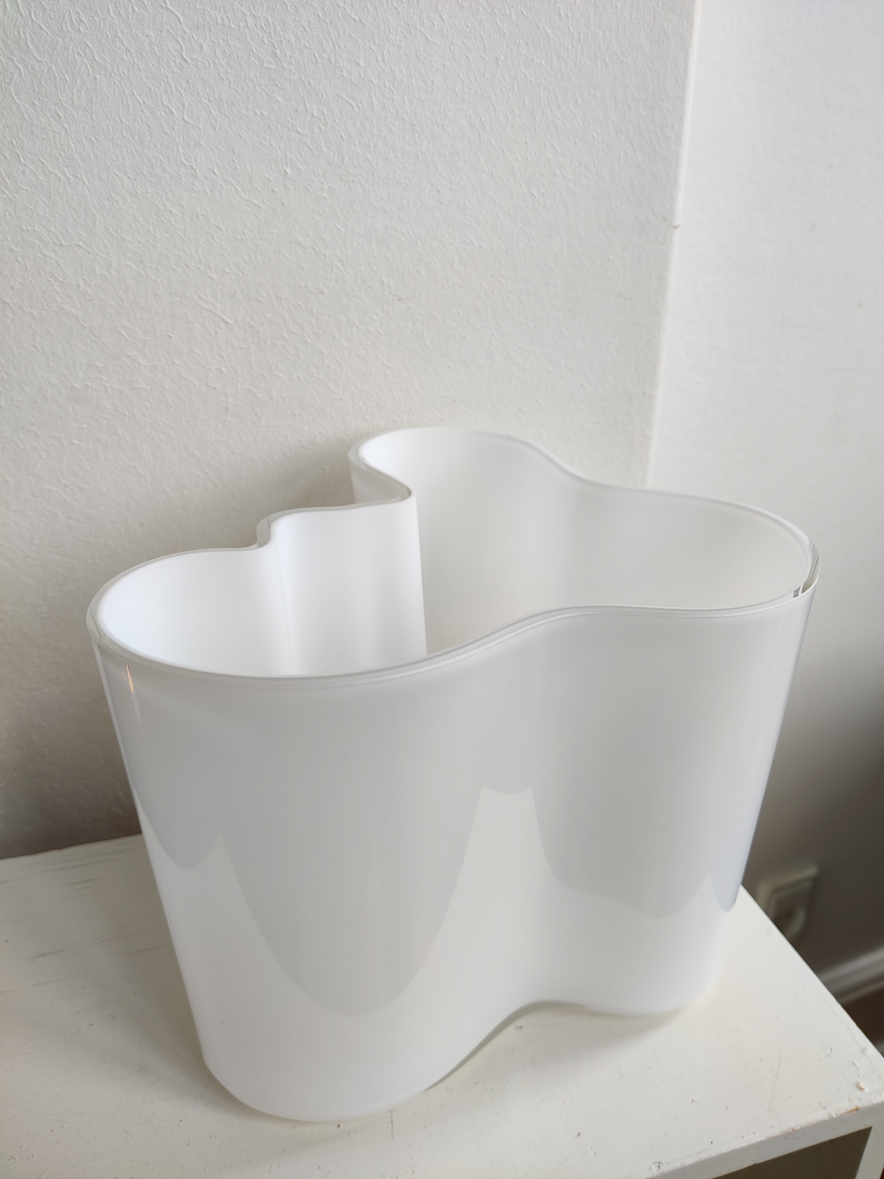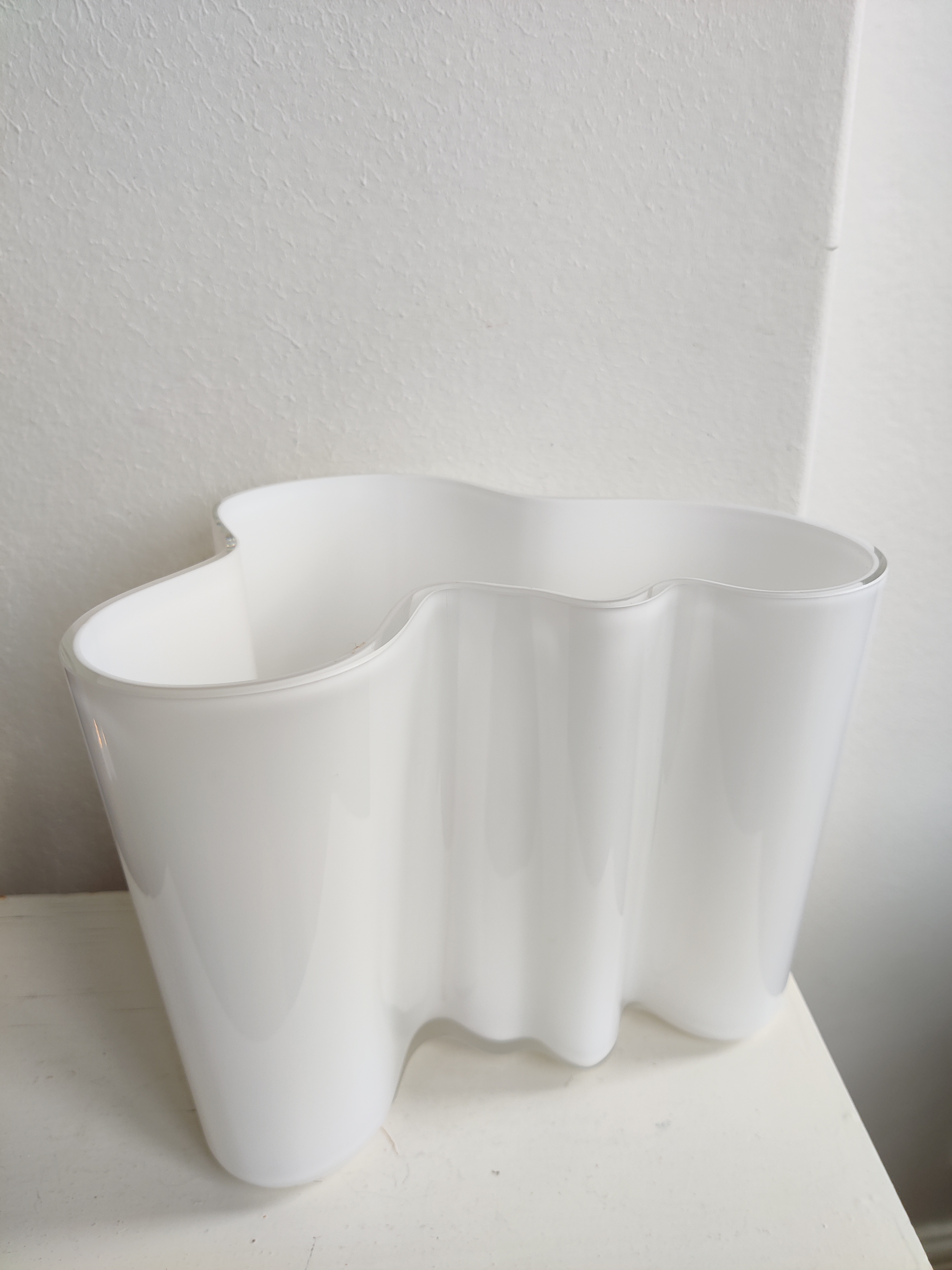 Den klassiske, smukke Savoy vase i hvidt/opal glas. Designet af Alvar Aalto i 1936 (!) - og stadig i produktion hos Iittala i Finland. 16 cm høj og 21 cm på tværs.