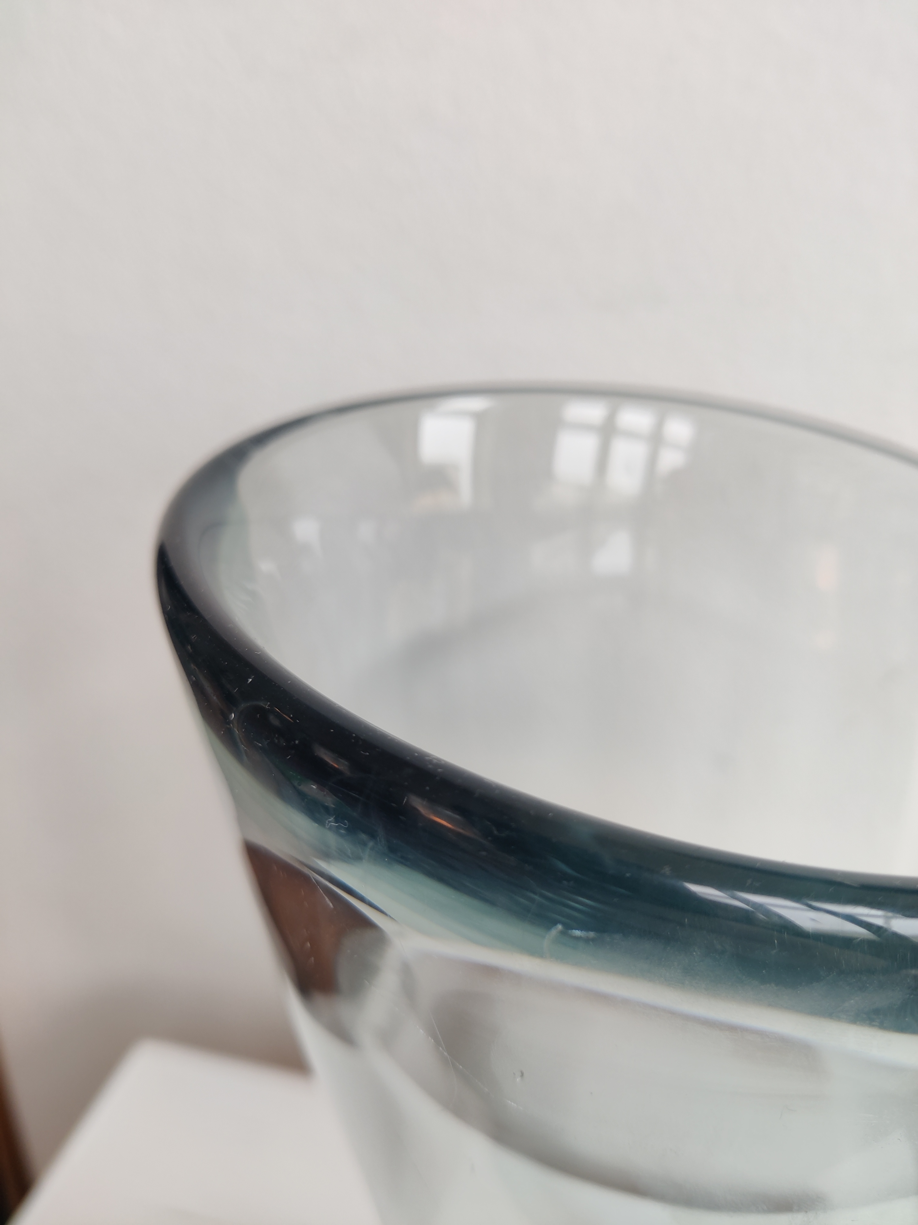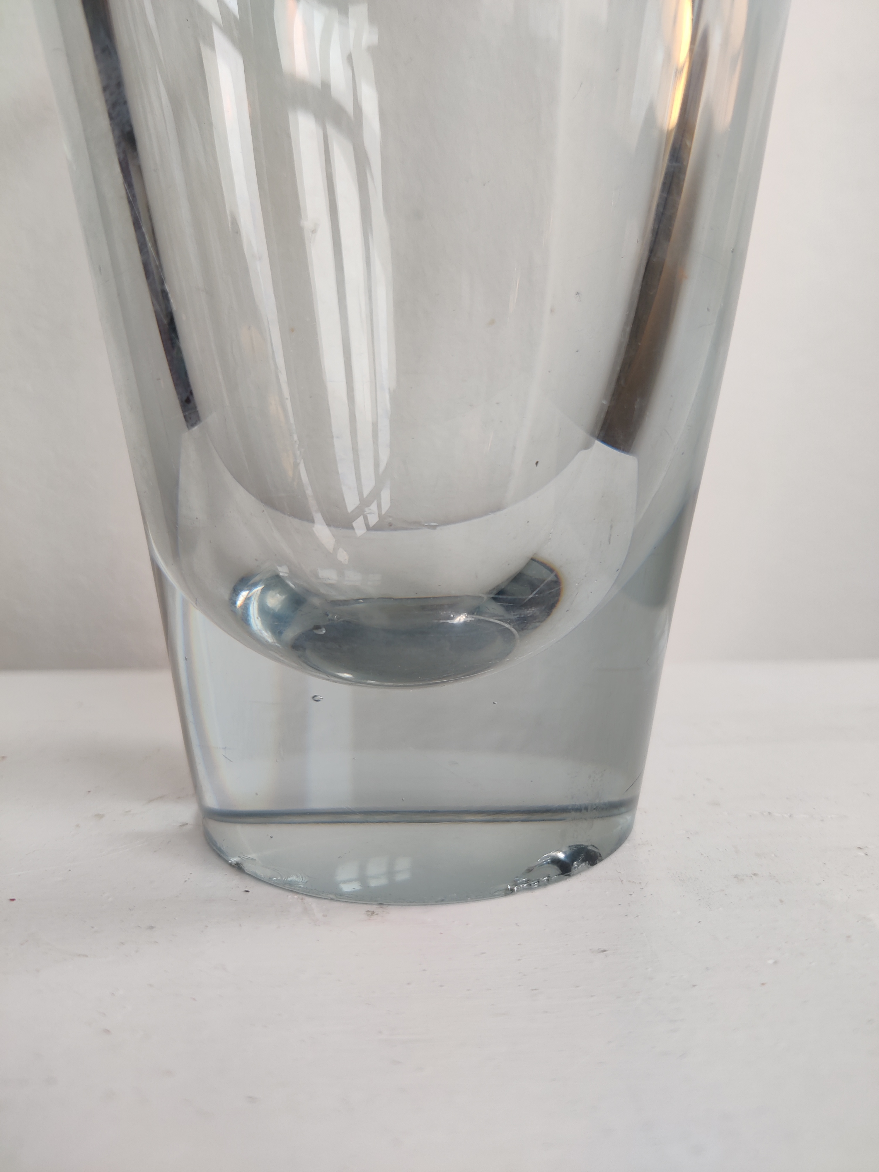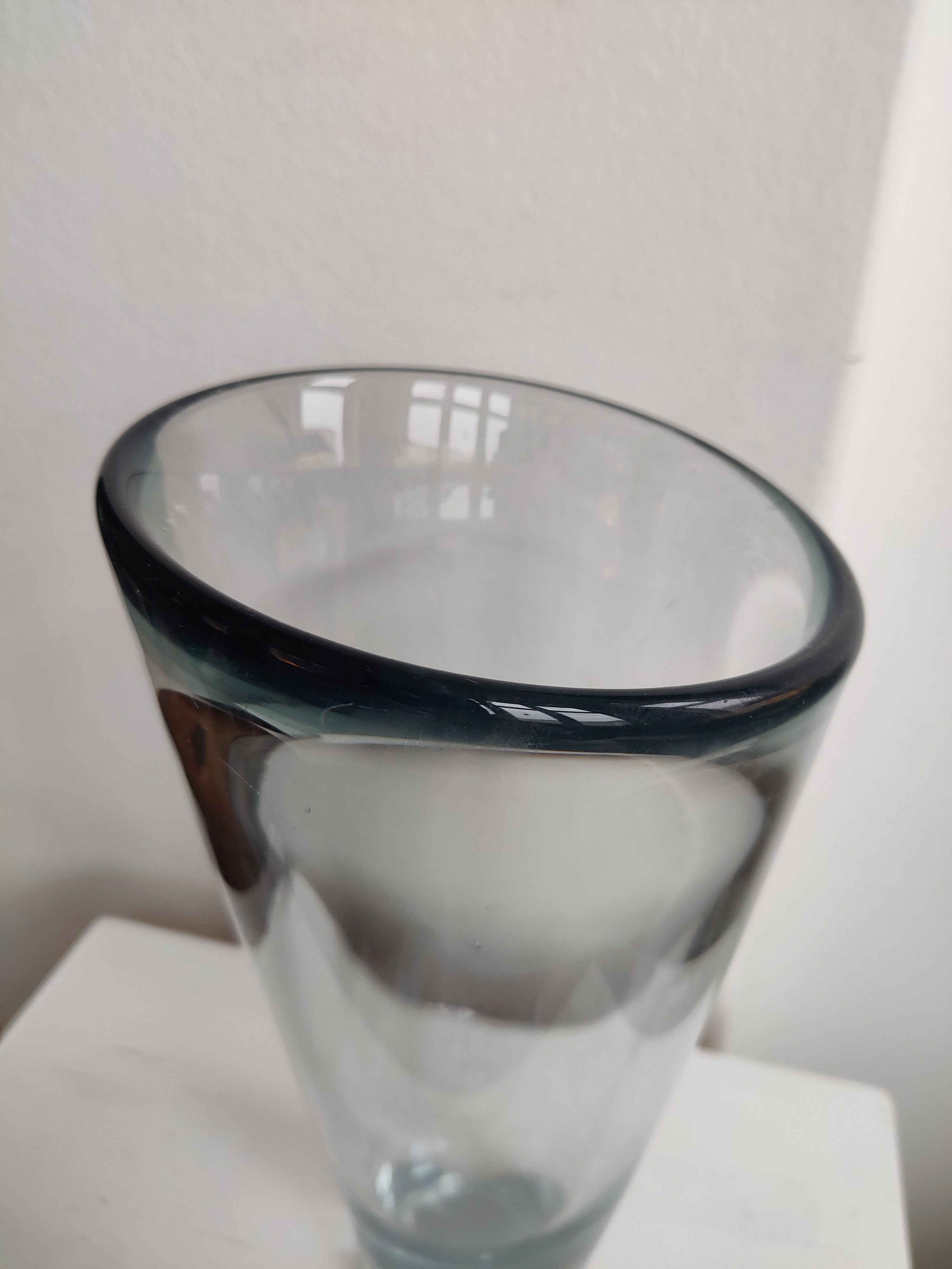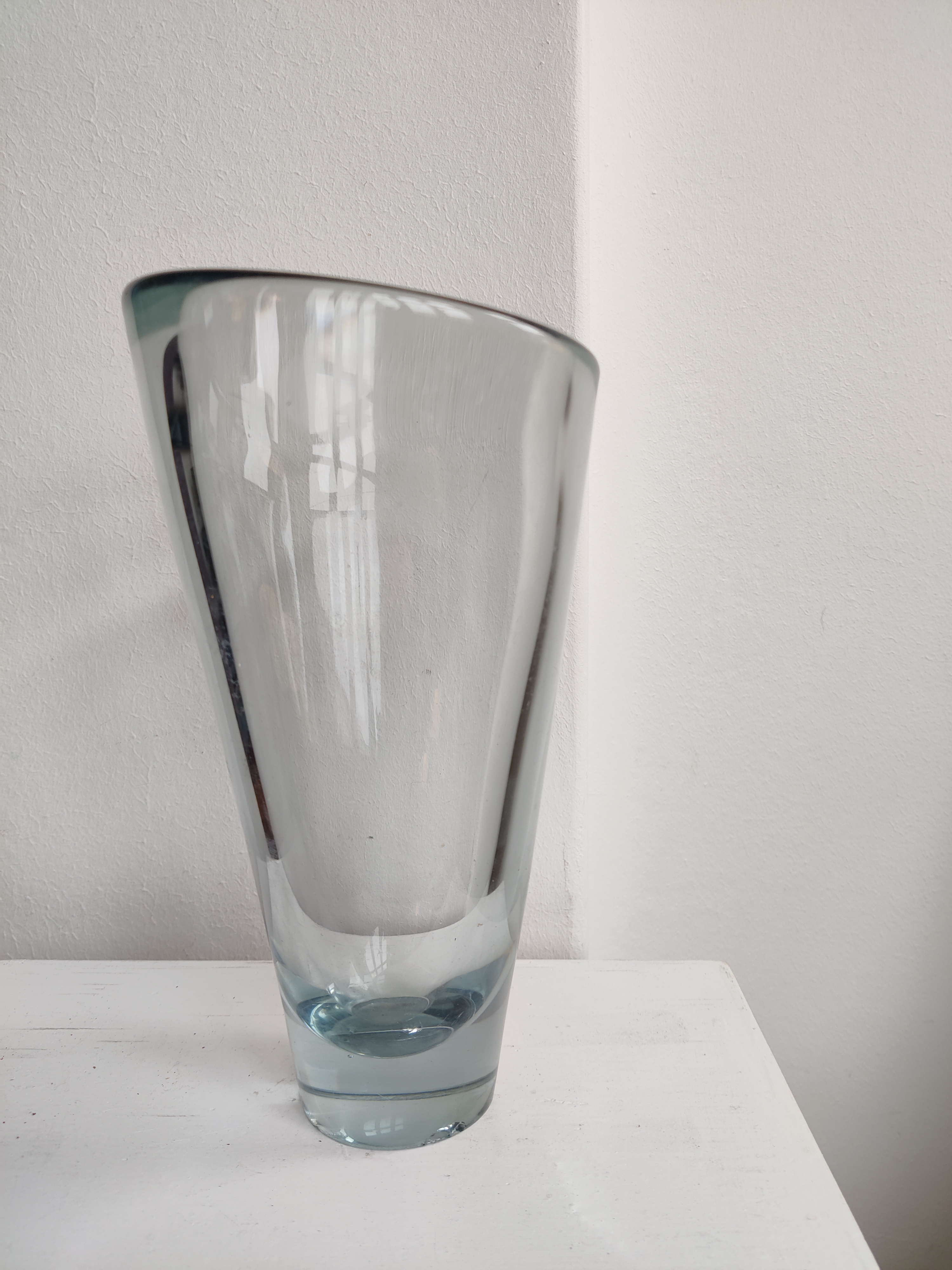 Stor konisk vase af Per Lütken for Holmegaard, 1957. Serien hedder Akva/Thule og er en ægte dansk klassiker - de store vaser ses dog ikke så tit. Den er 24 cm høj og 13 cm øverst. Den er markeret II s for 2. sortering og har to afslag i bunden.
