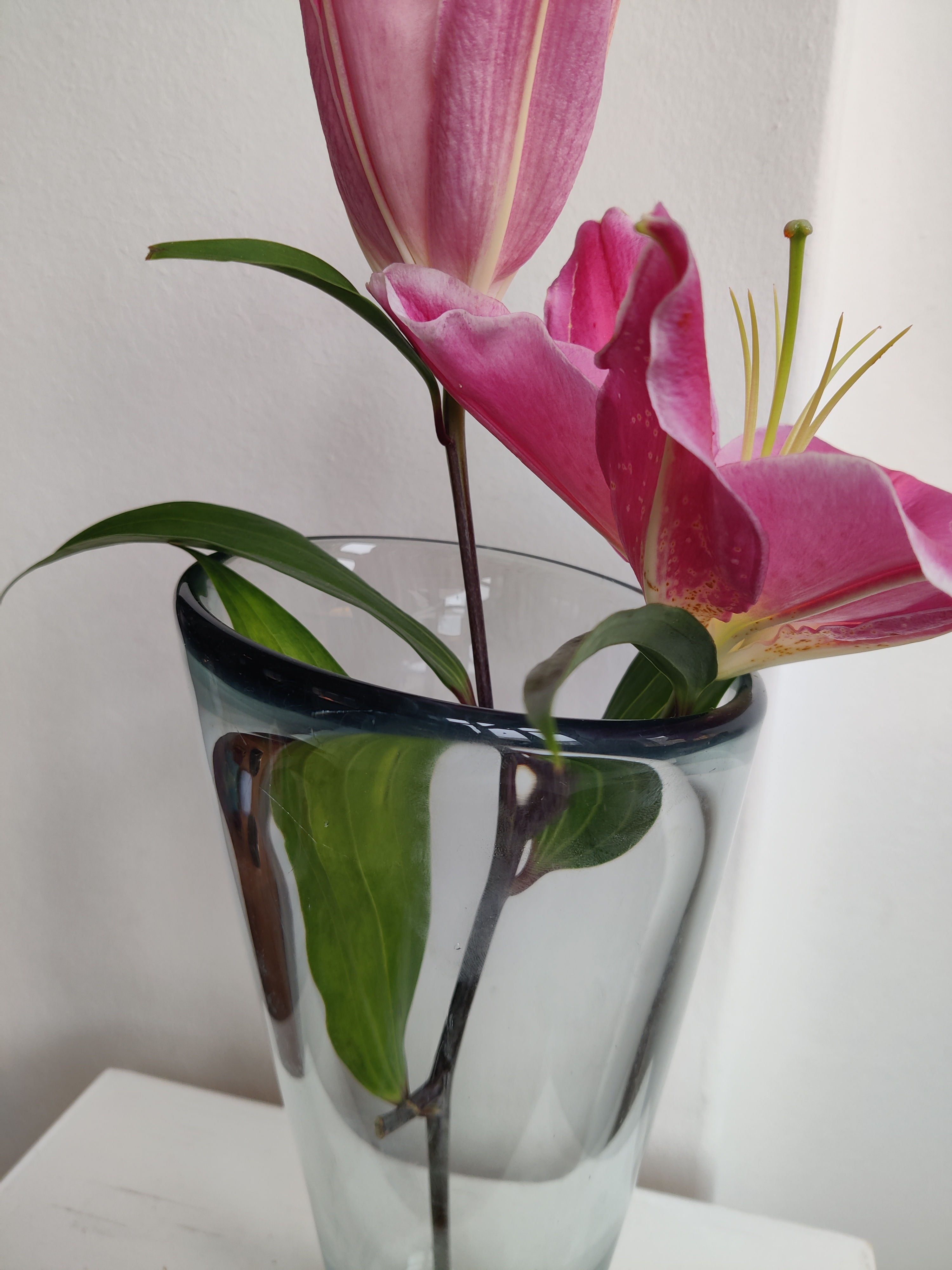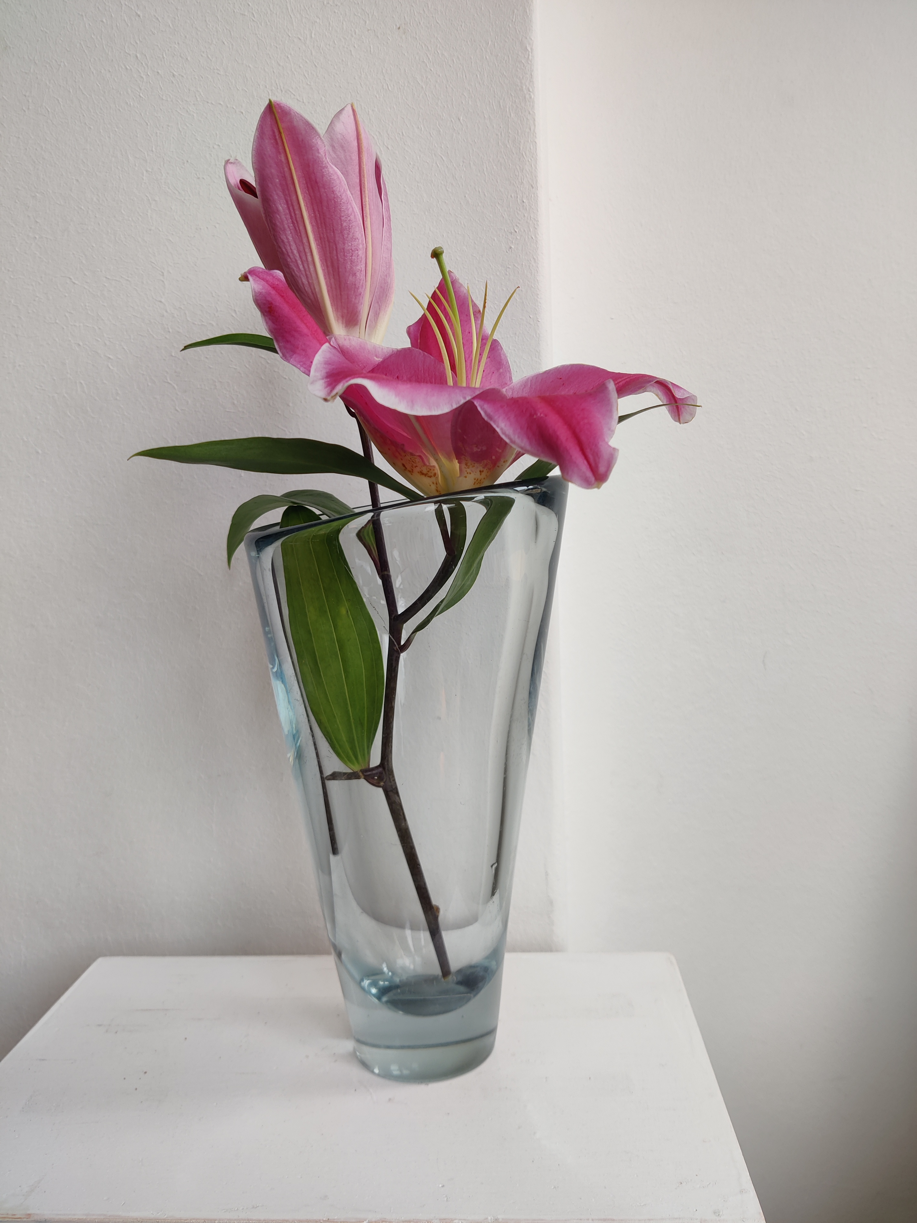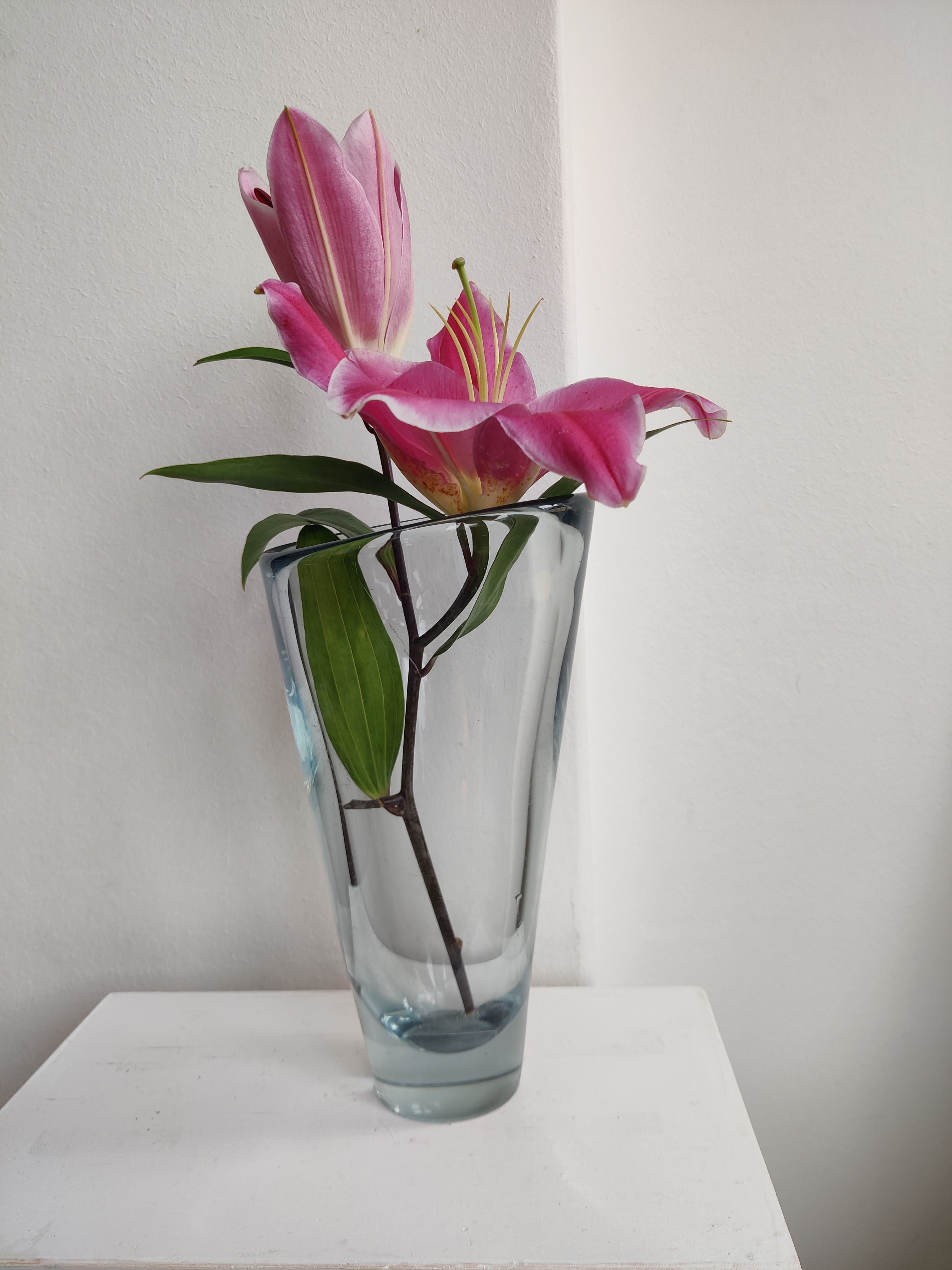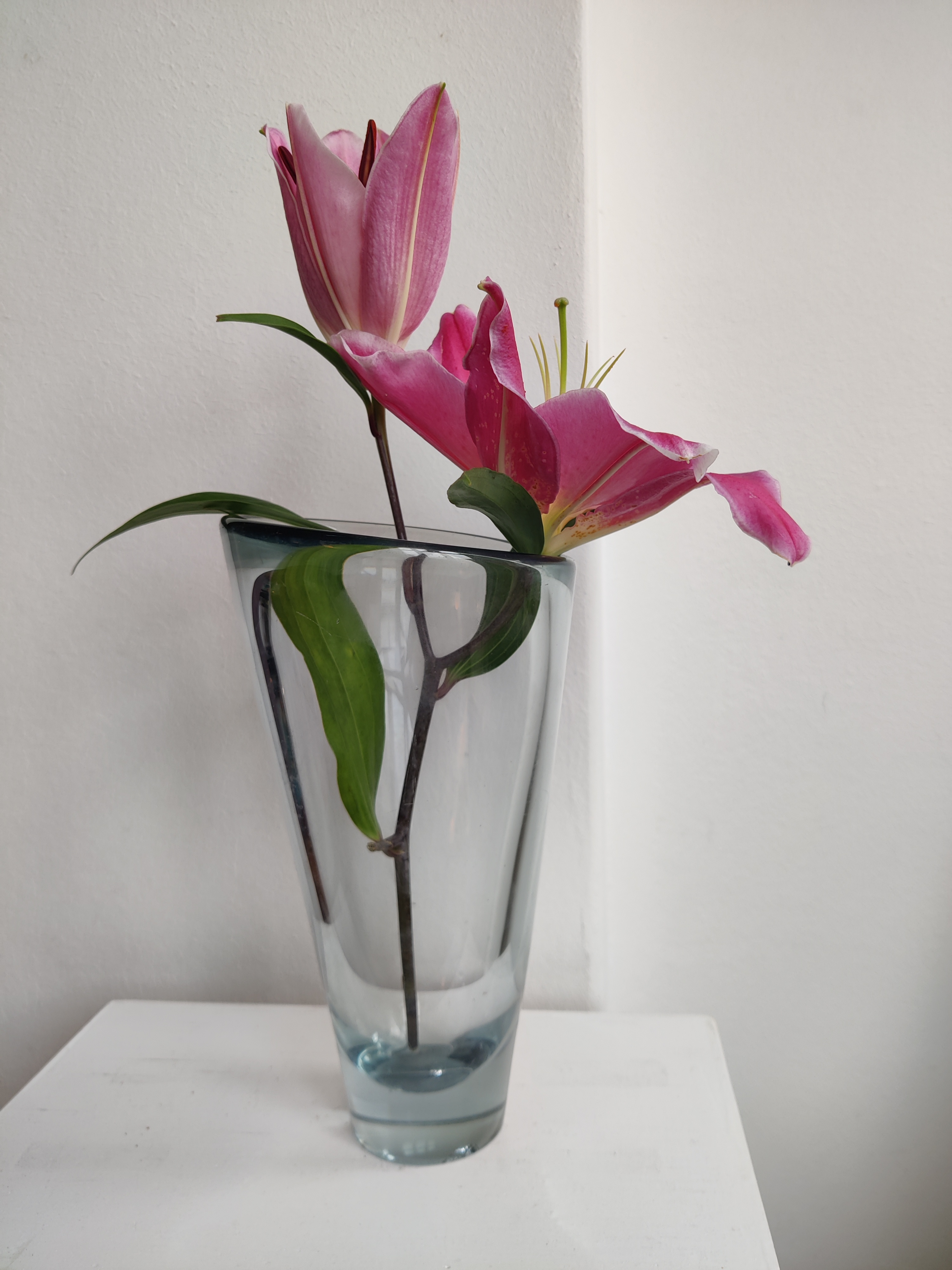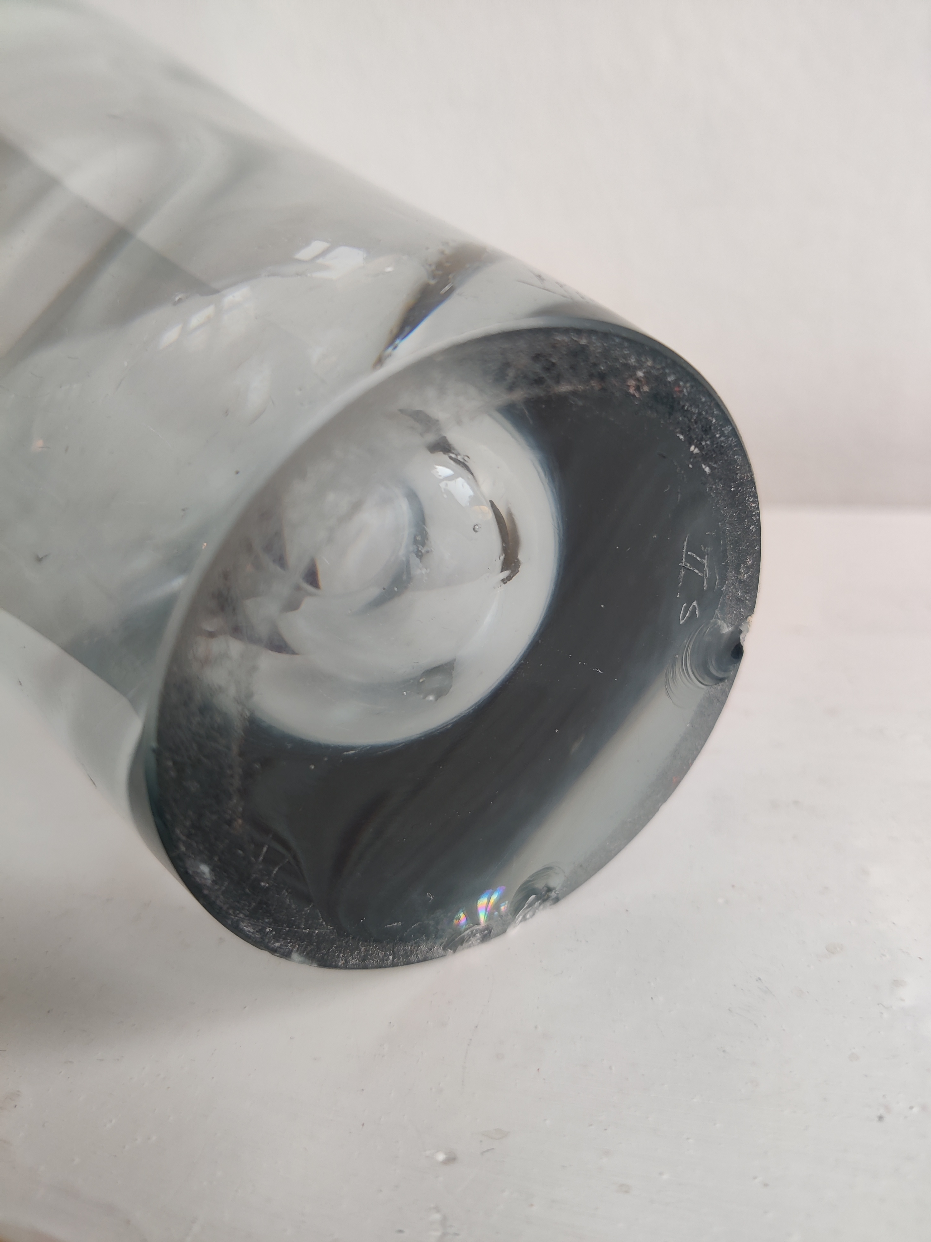 Stor konisk vase af Per Lütken for Holmegaard, 1957. Serien hedder Akva/Thule og er en ægte dansk klassiker - de store vaser ses dog ikke så tit. Den er 24 cm høj og 13 cm øverst. Den er markeret II s for 2. sortering og har to afslag i bunden.