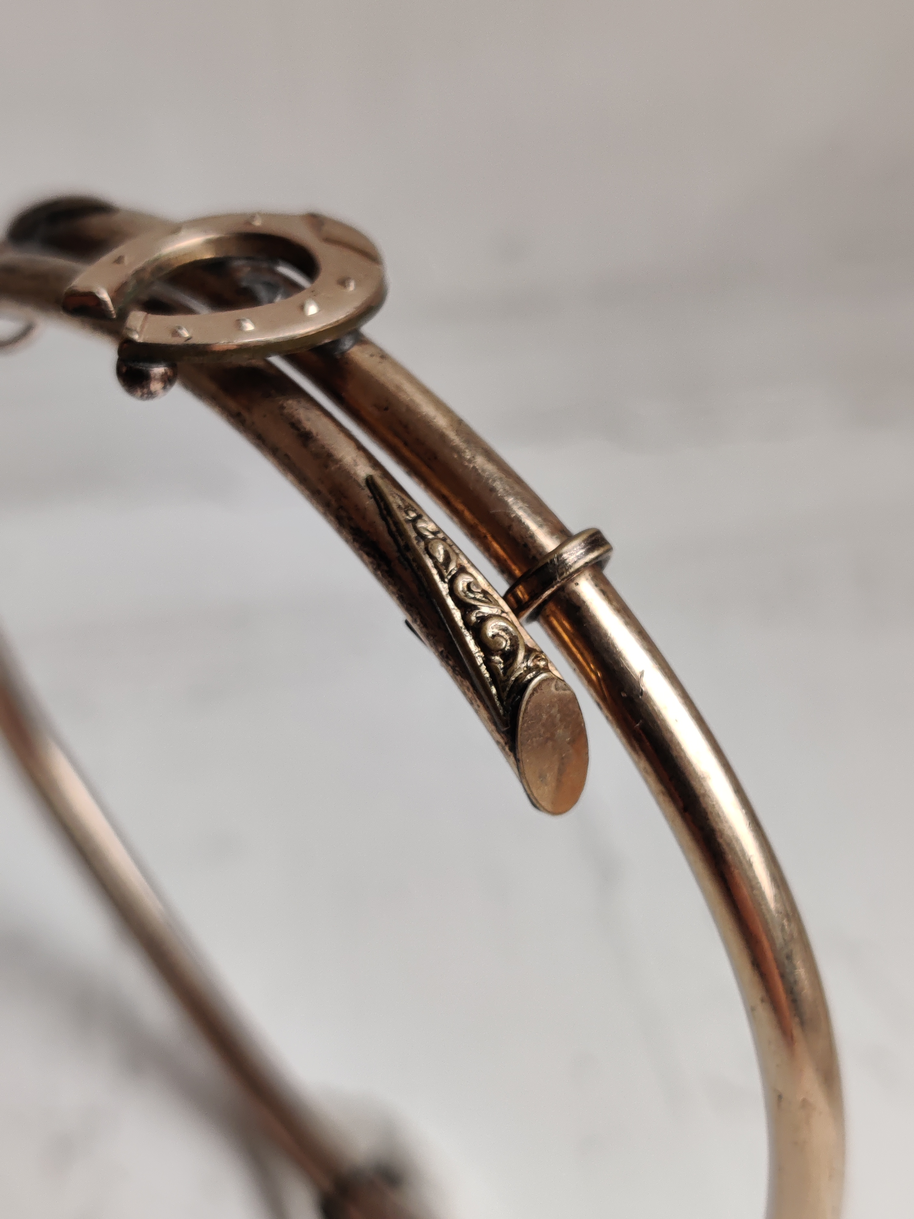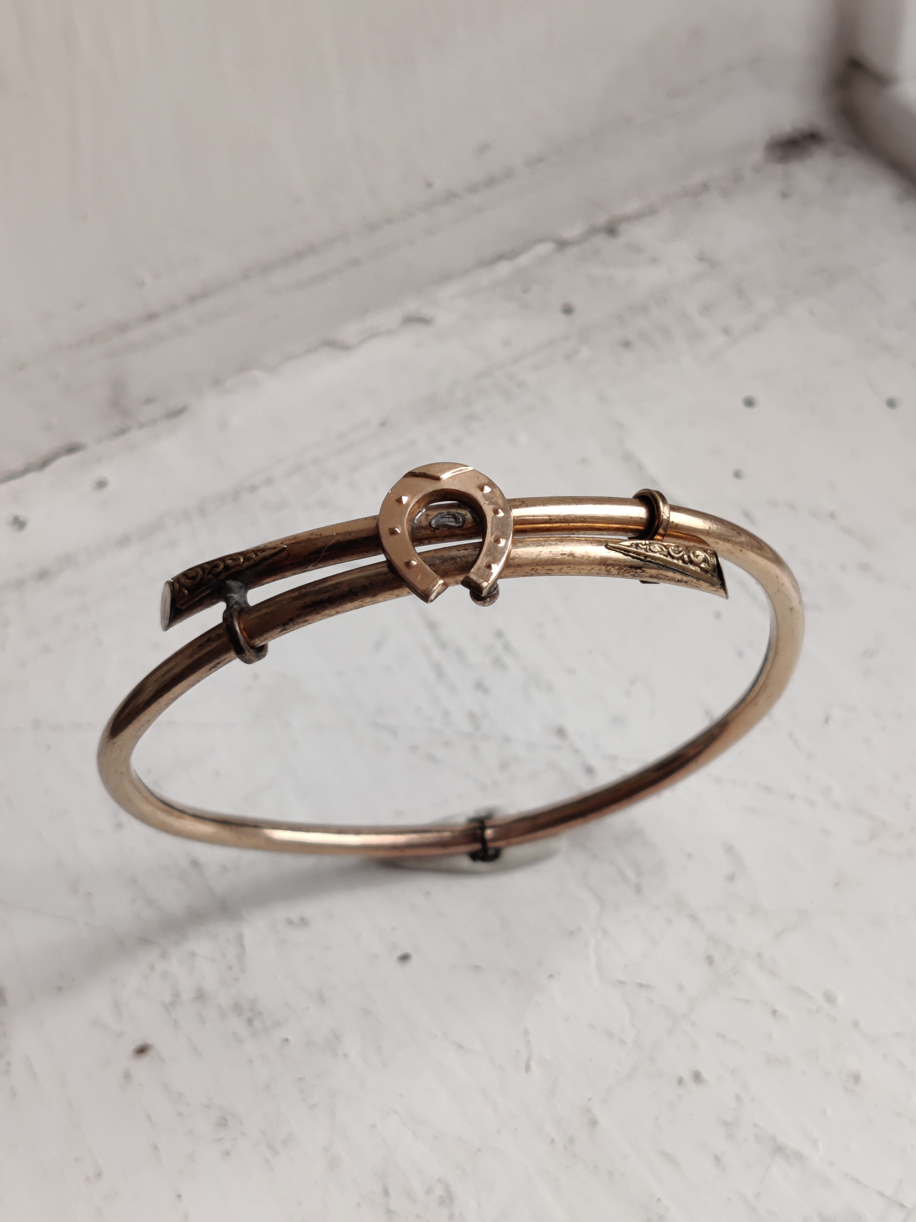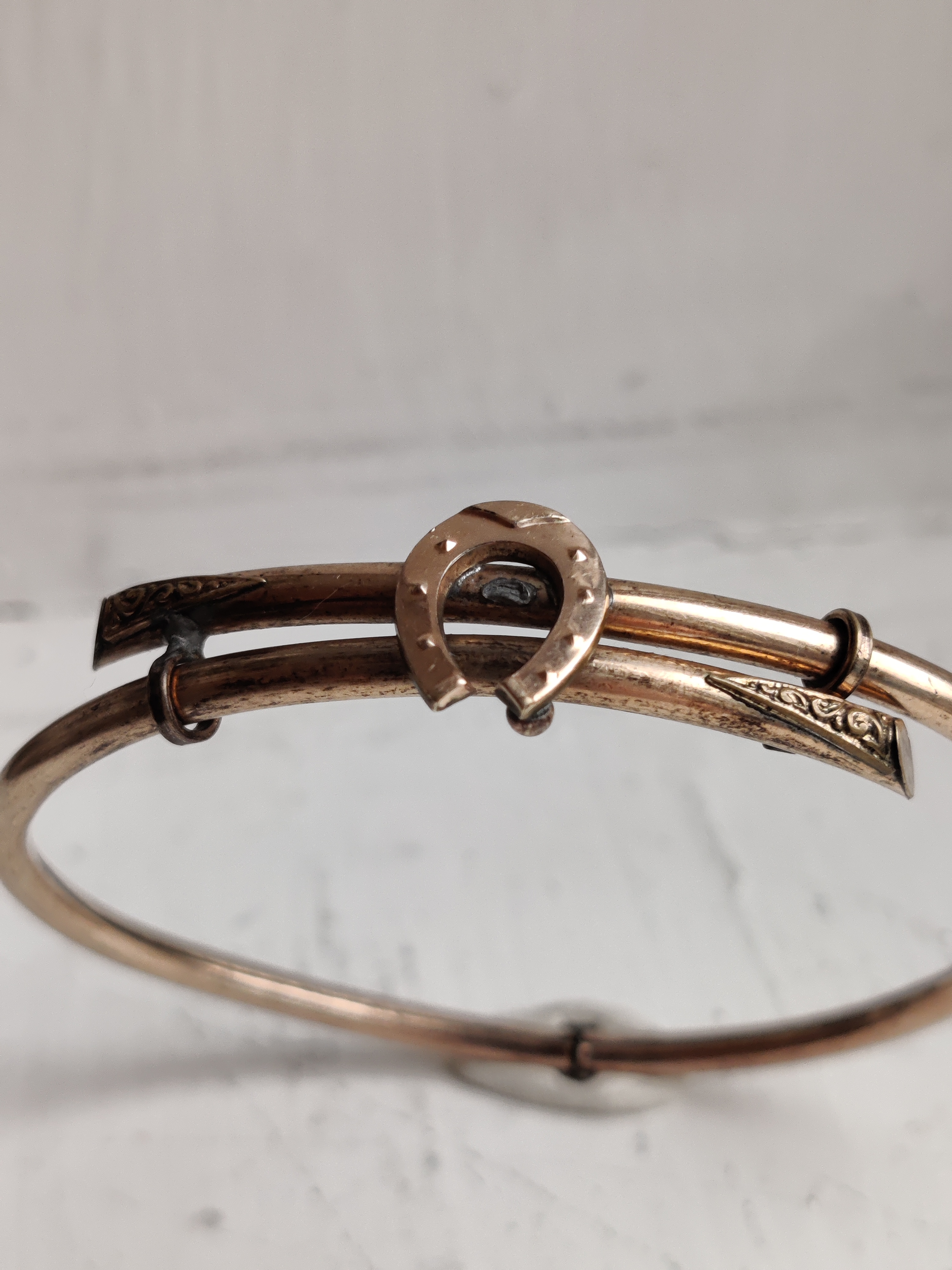 Den fineste gamle forgyldte armring med en hestesko og små ornamenteringer. Guldet har overraskende lidt slitage. Snedigt konstrueret -det kan bøjes frem og tilbage, så man kan trække det over hånden. Indre bredde er 5,5 cm, når det er lukket, men 7 cm, når det er trukket helt ud,
