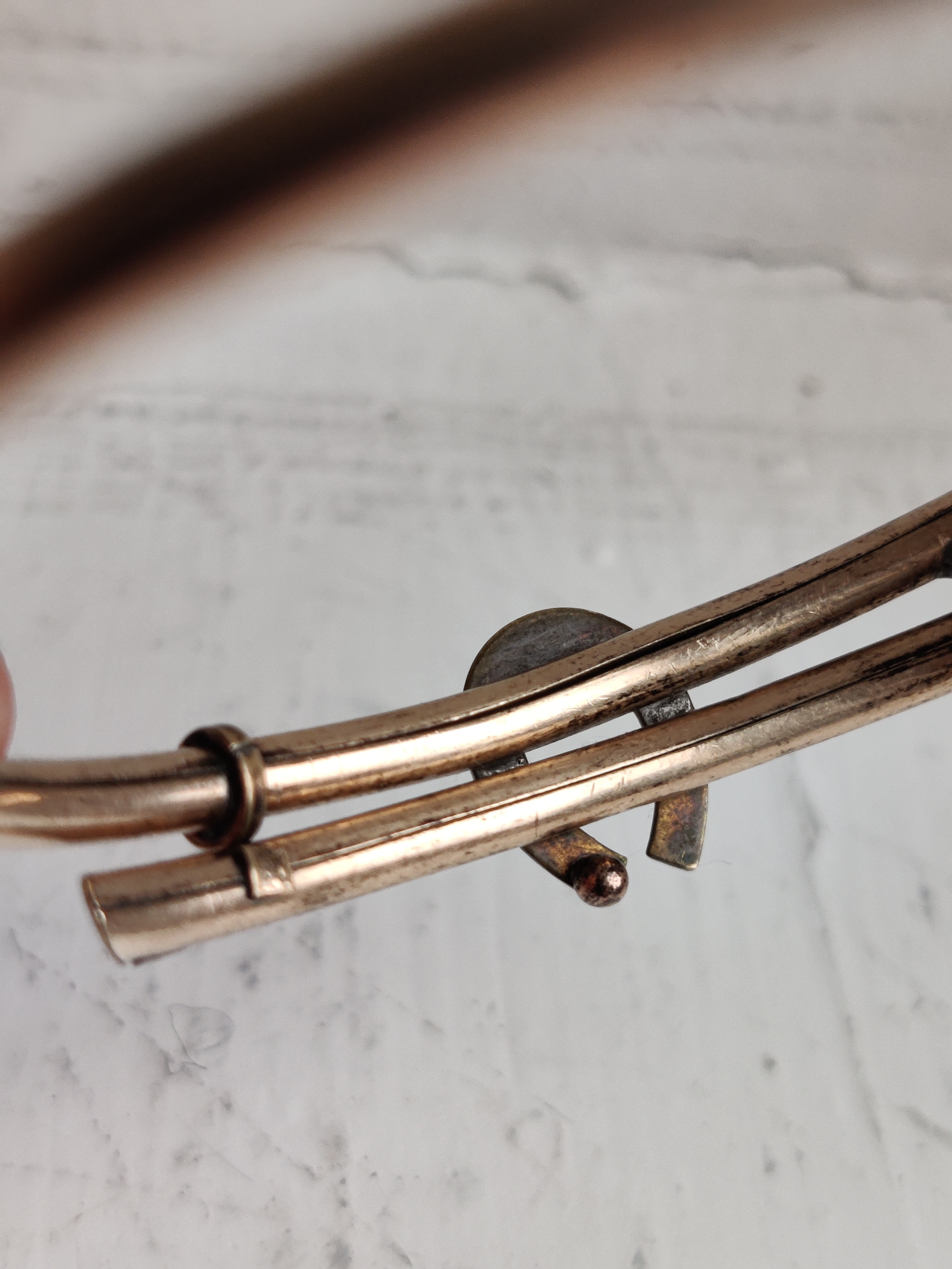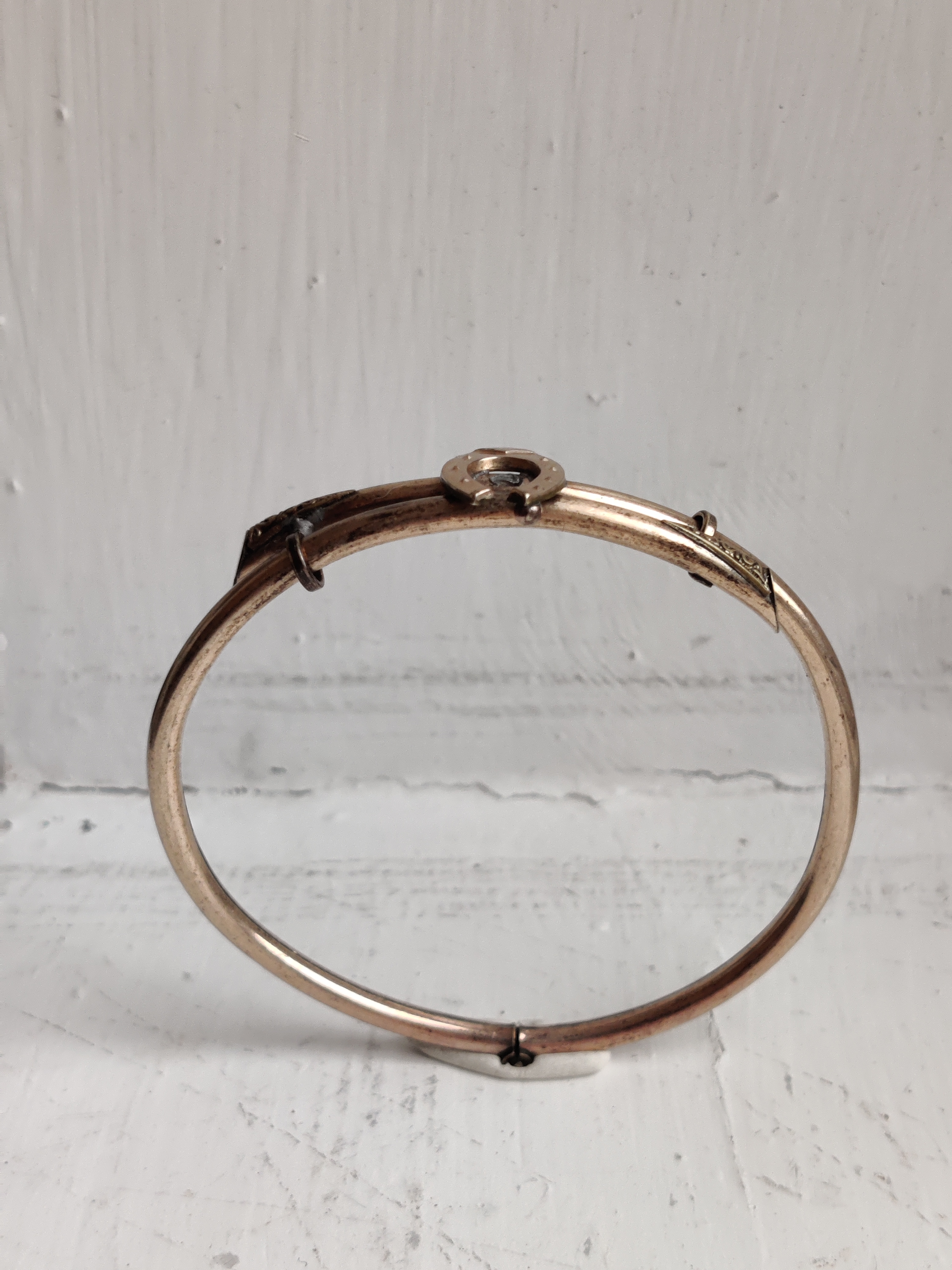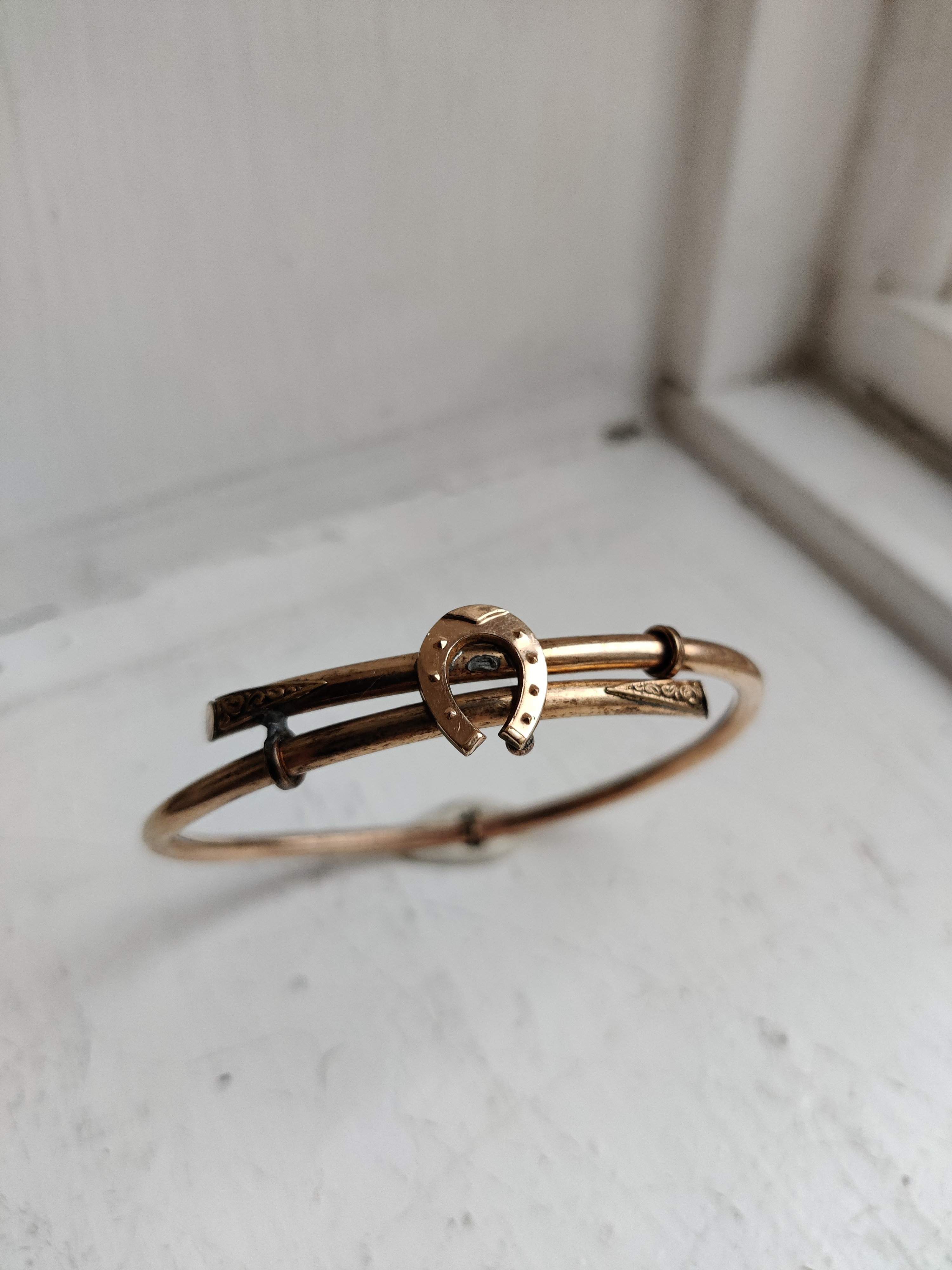 Den fineste gamle forgyldte armring med en hestesko og små ornamenteringer. Guldet har overraskende lidt slitage. Snedigt konstrueret -det kan bøjes frem og tilbage, så man kan trække det over hånden. Indre bredde er 5,5 cm, når det er lukket, men 7 cm, når det er trukket helt ud,