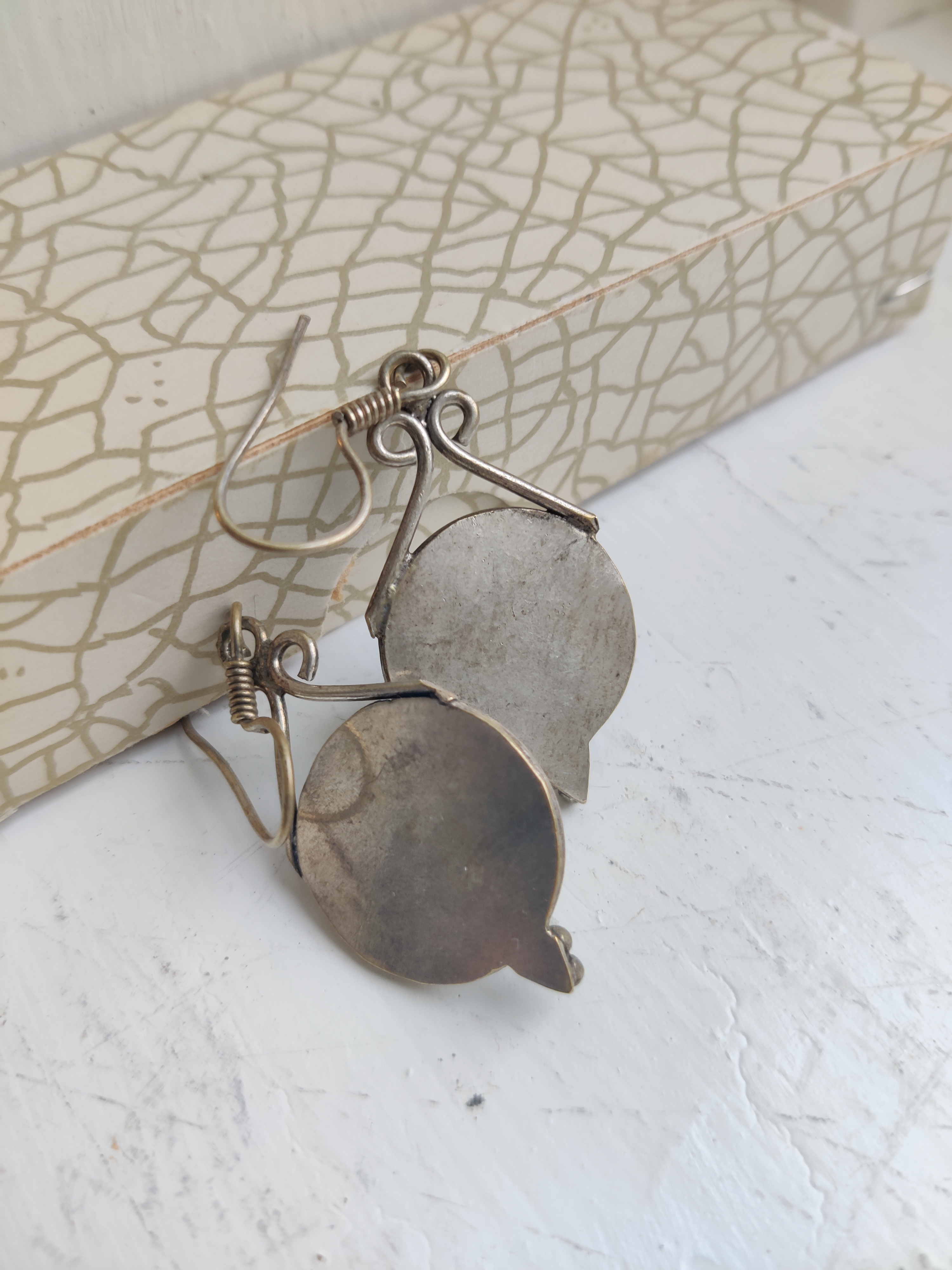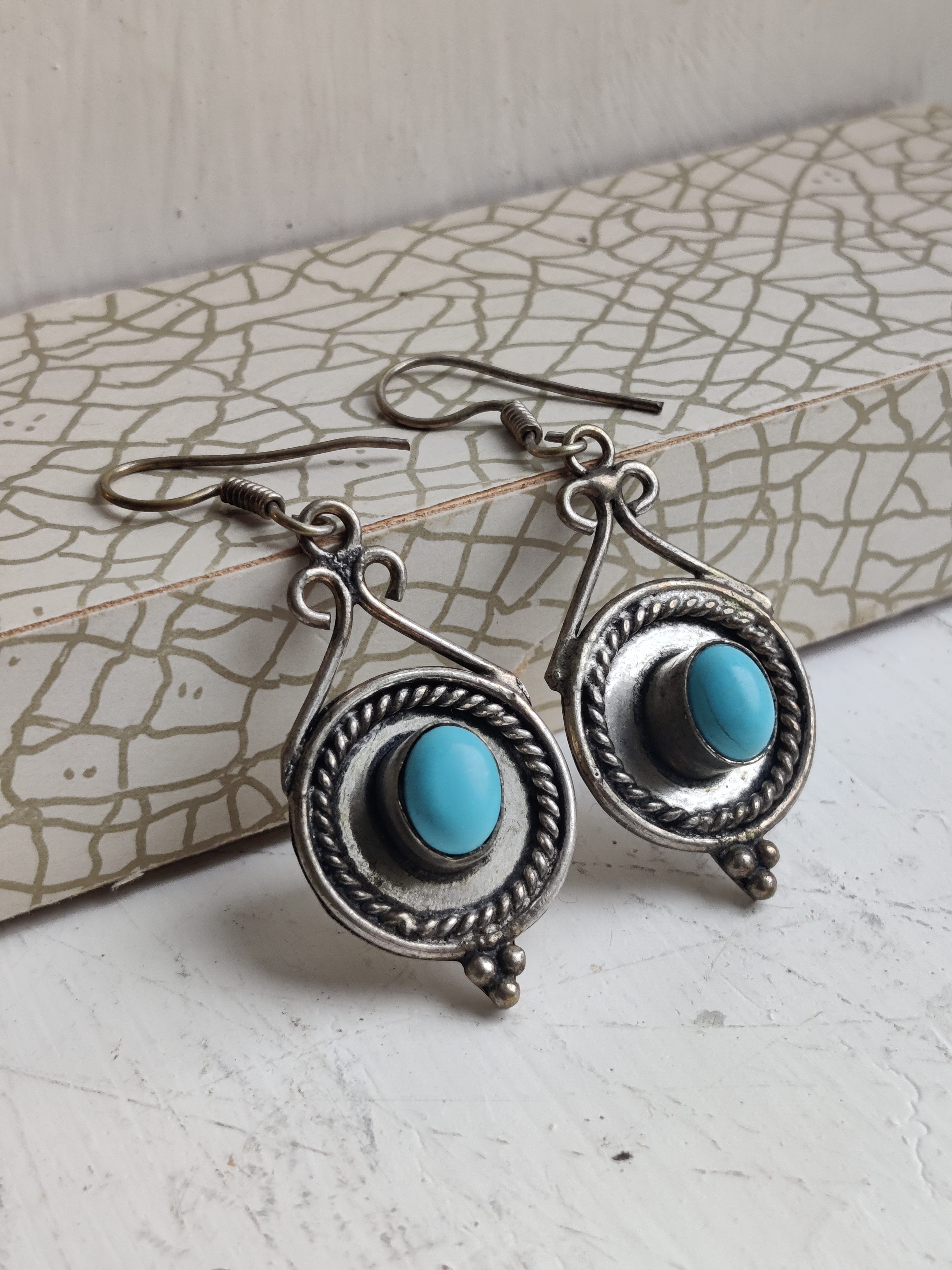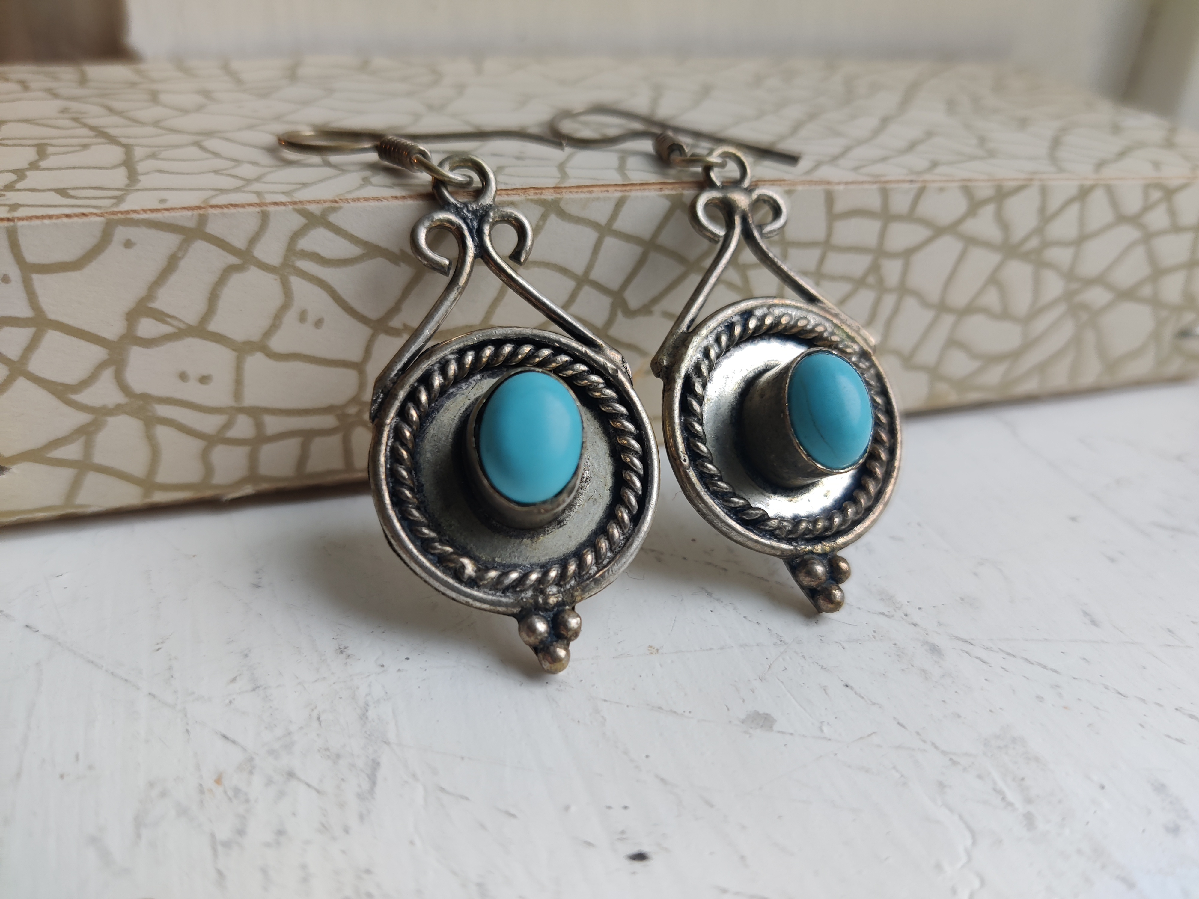 Fineste vintage ørehængere med turkiser - mit gæt er, at de er fra 1980'erne og vil gå godt sammen med noget pjusket hår, et partisanertørklæde og måske en tur på højskole. Det er ikke sølv. Mål 5,5 cm inkl. krog.