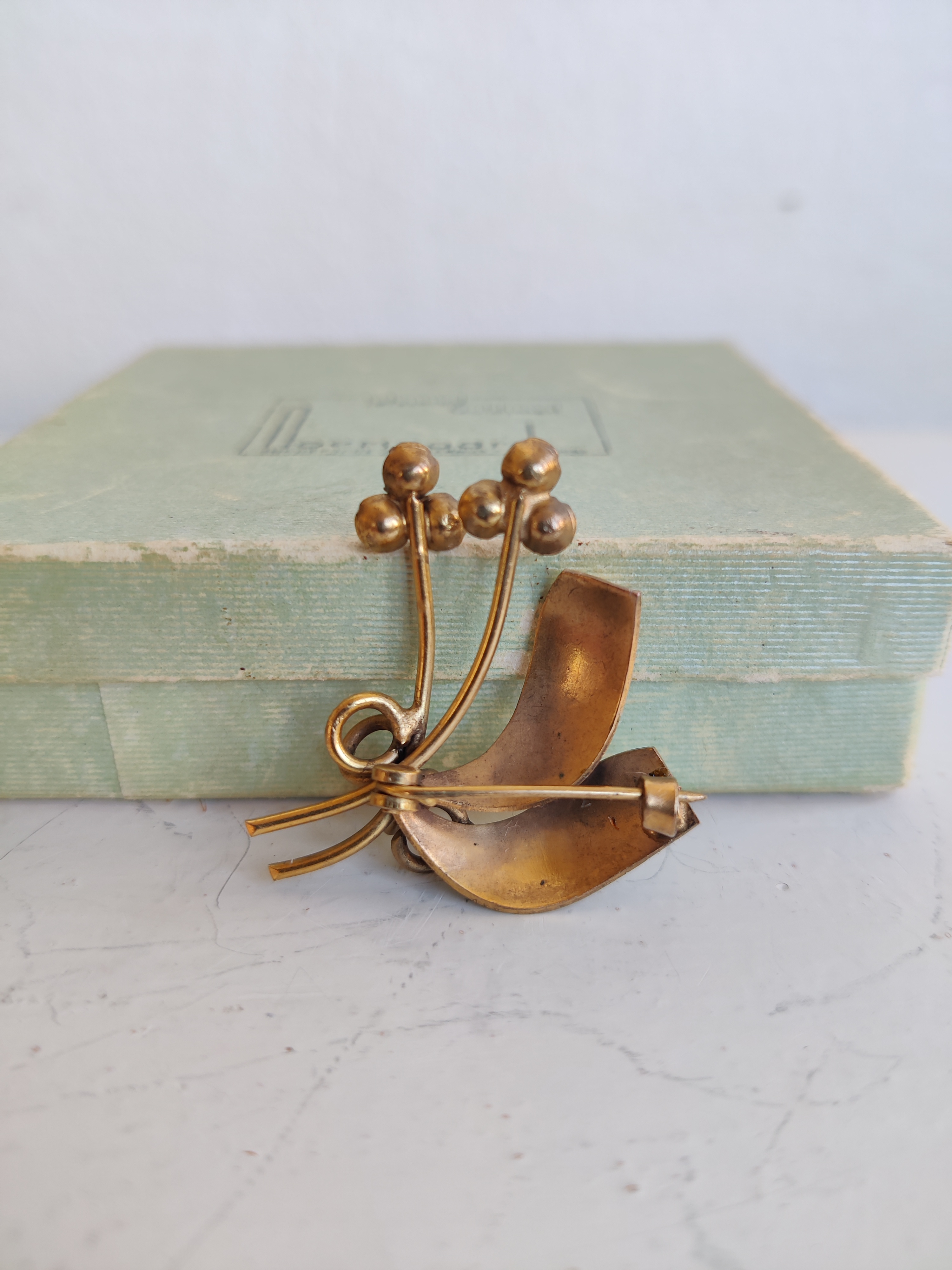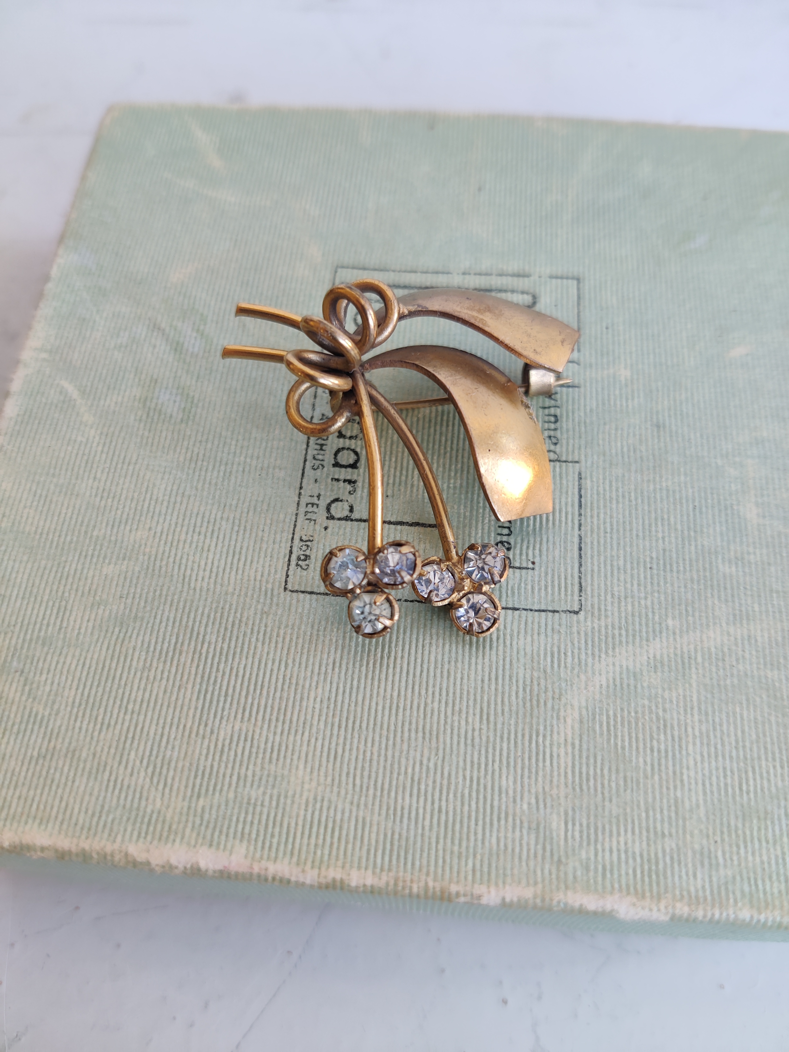 Elegant og enkel blomster-broche fra 1950'erne af messing og små krystaller. Meget fin og velholdt. Måler 4 x 3,5 cm.