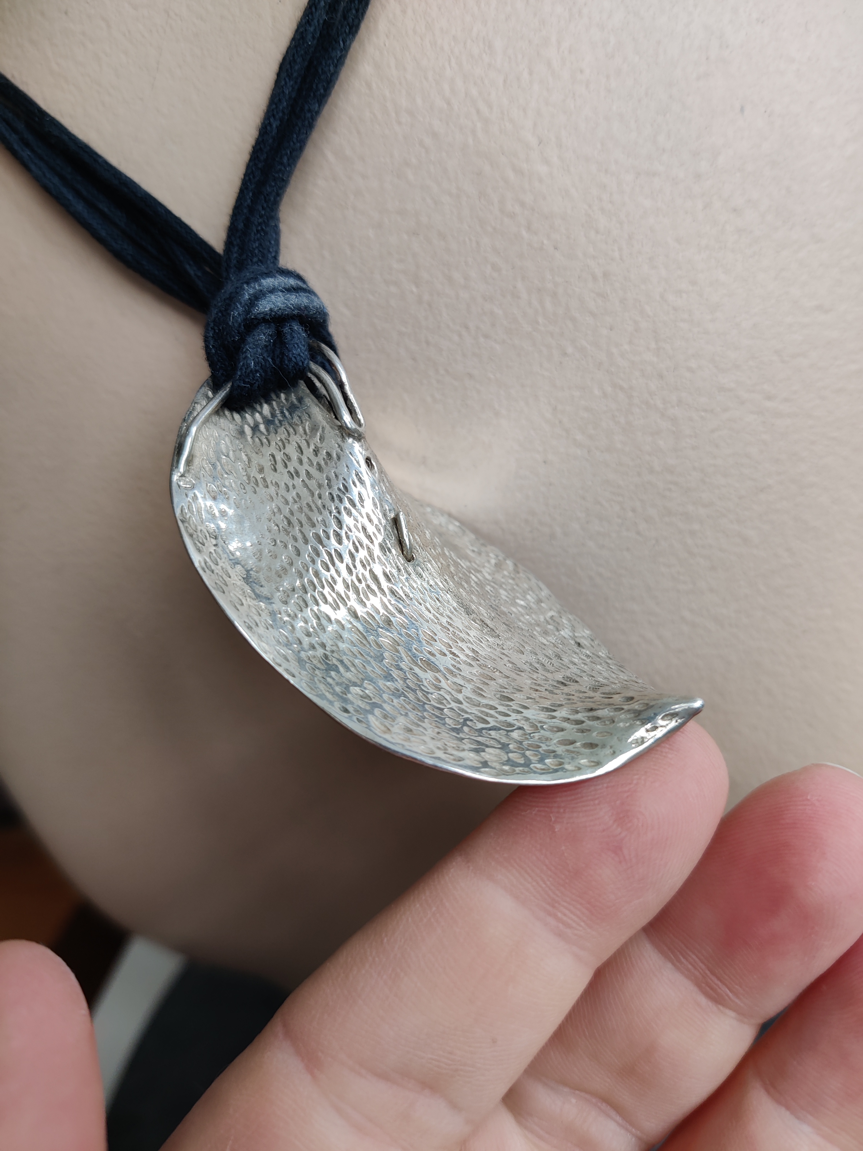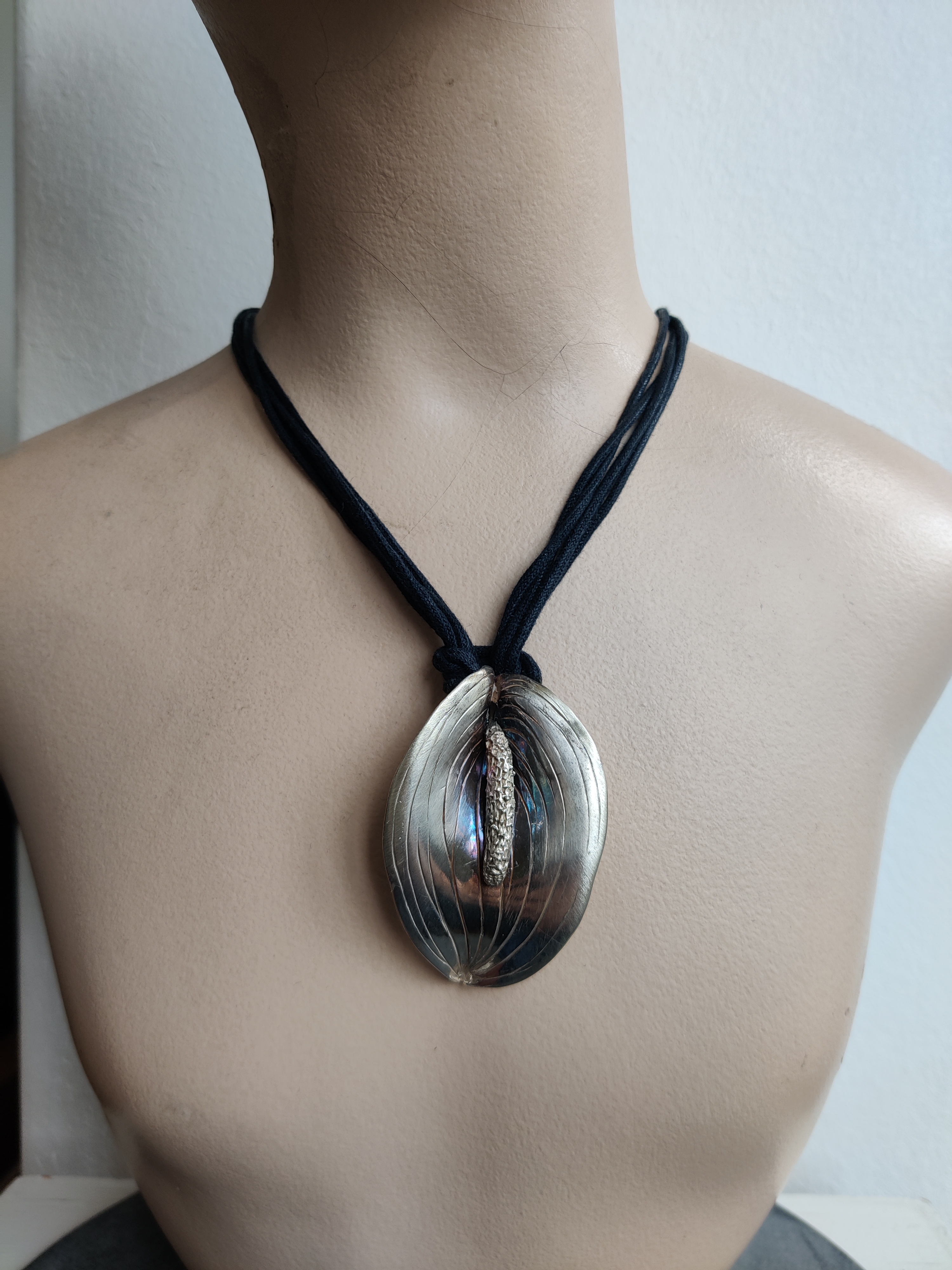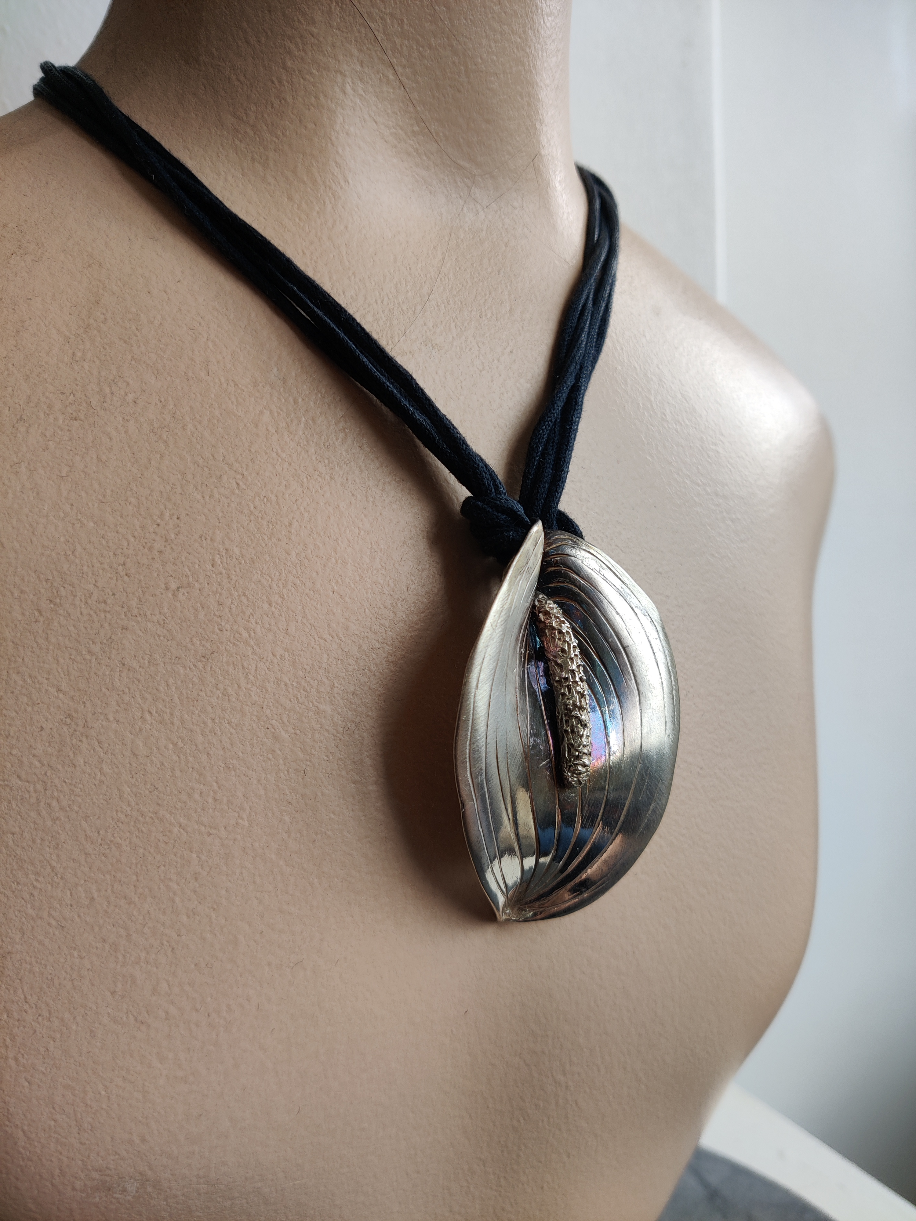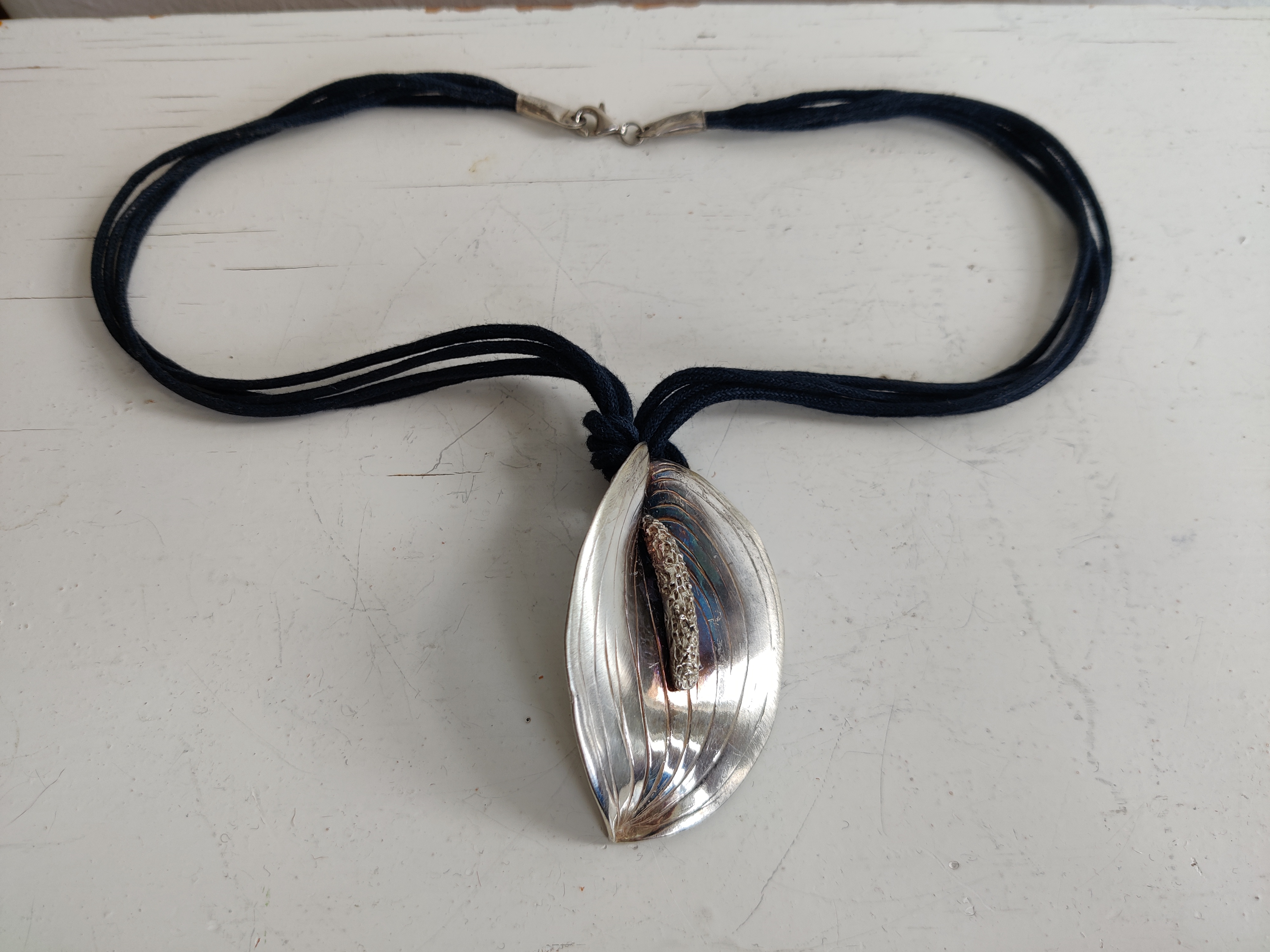 Fantastisk flot halssmykke af ukendt oprindelse, med kraftige sorte bomuldssnore og et stort blad, måske en slags lilje? Forsølvet. Mål længde 45 cm, bladet er 6 x 4 cm.