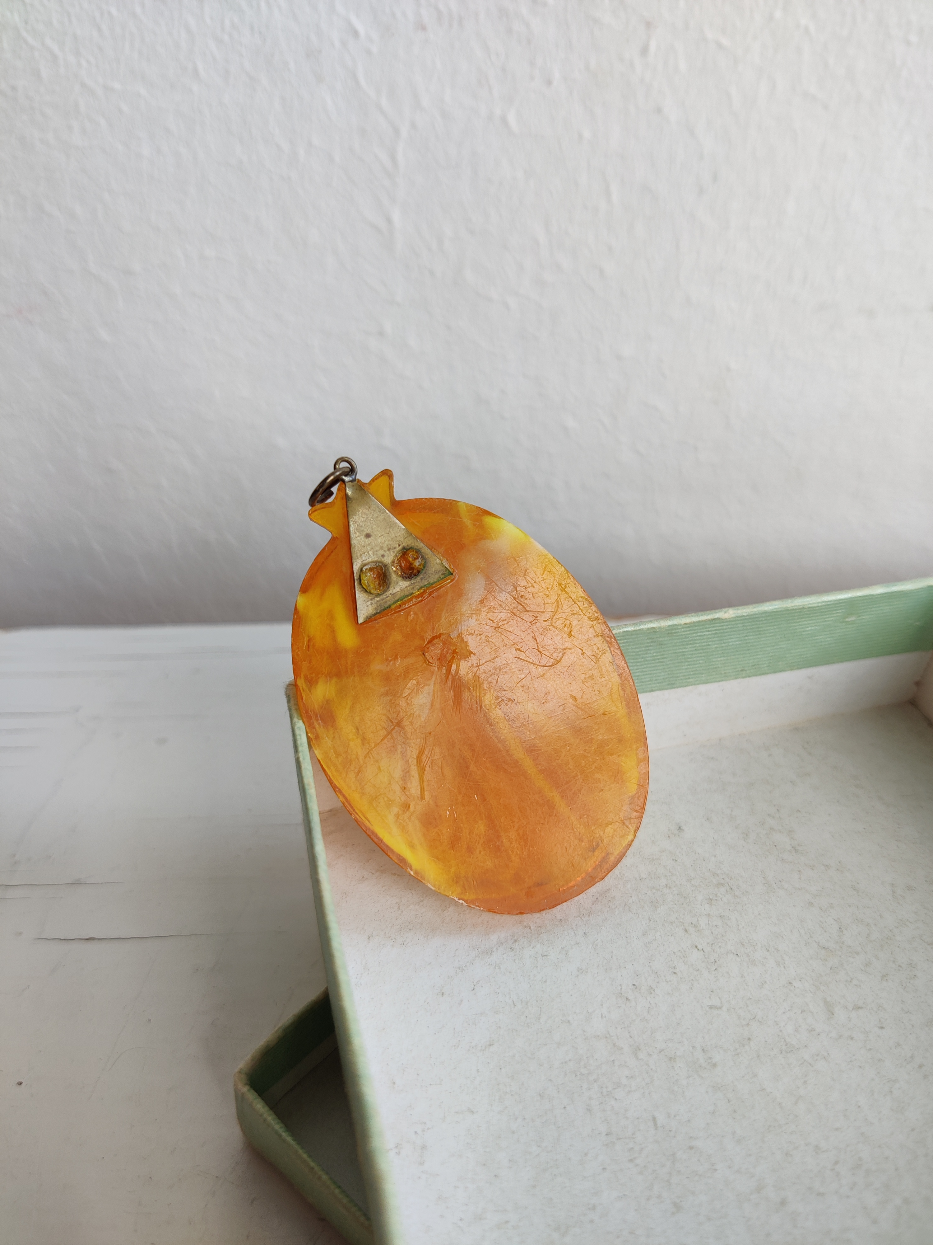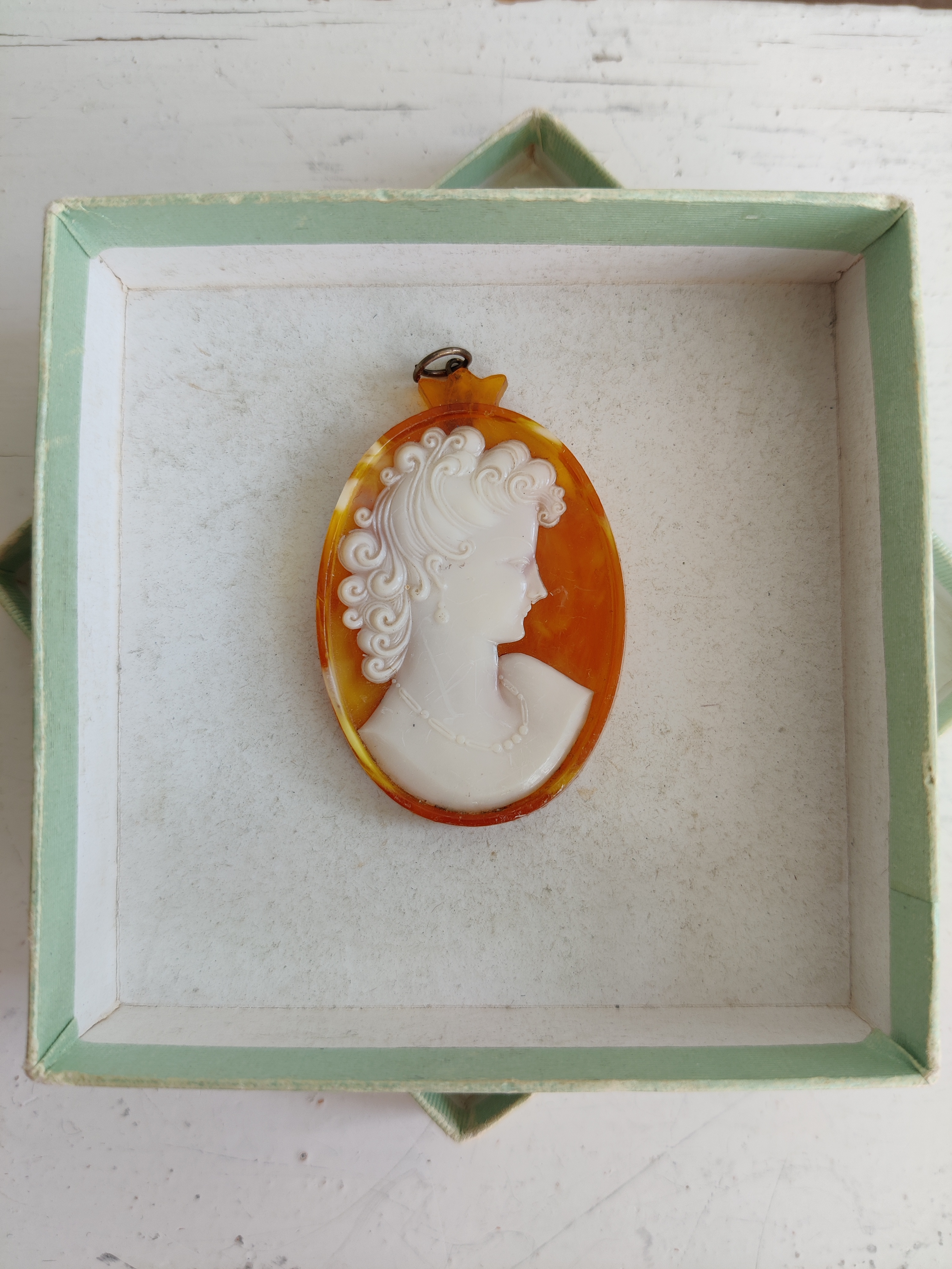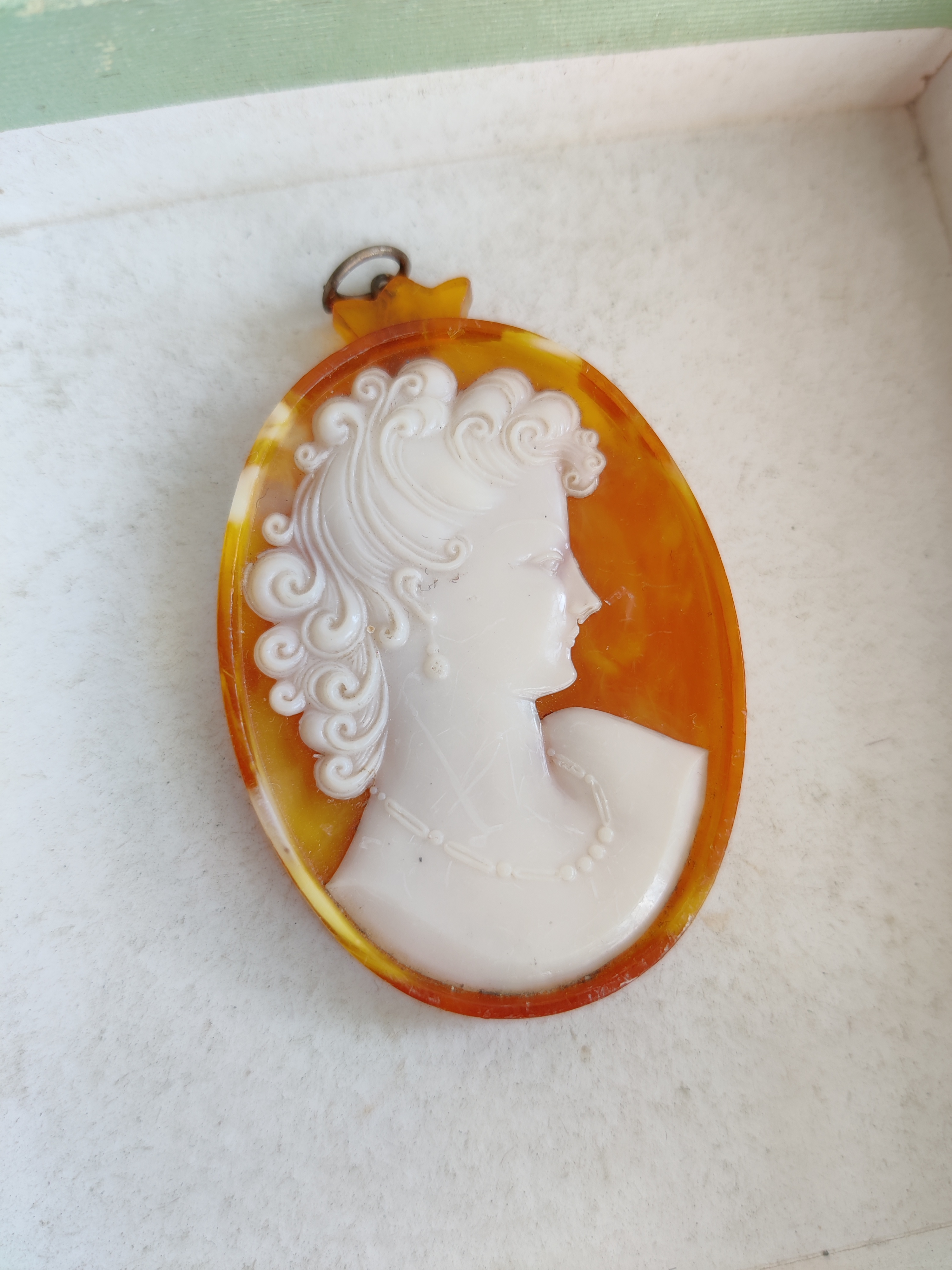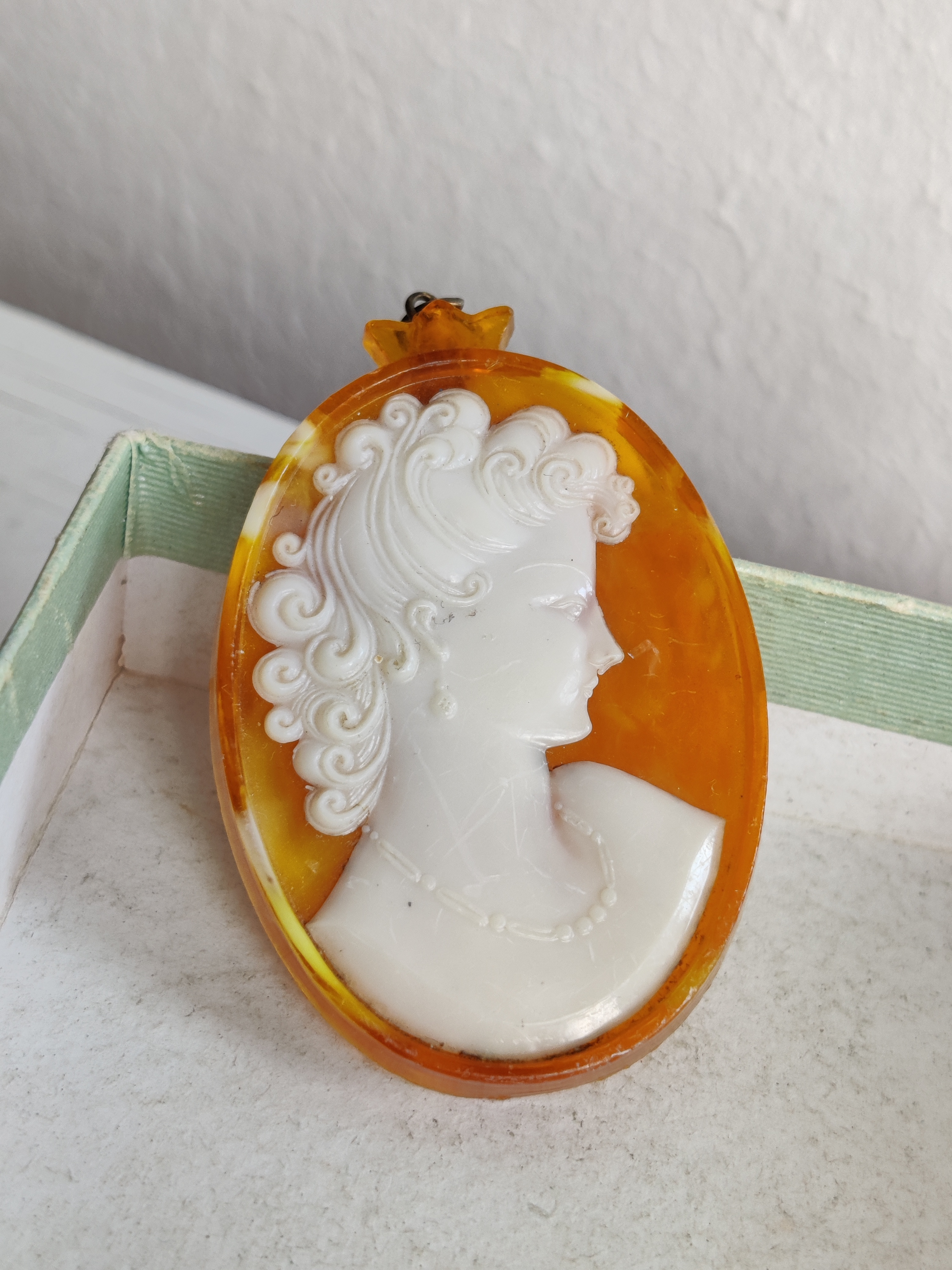 Stor oval camé fra 1960'erne. Hun er vældig yndig, men ikke skrøbelig - hun er nemlig lavet af resin. Lav din egen choker eller brug hende i en kæde efter eget valg. Måler 5 x 3,5 cm.