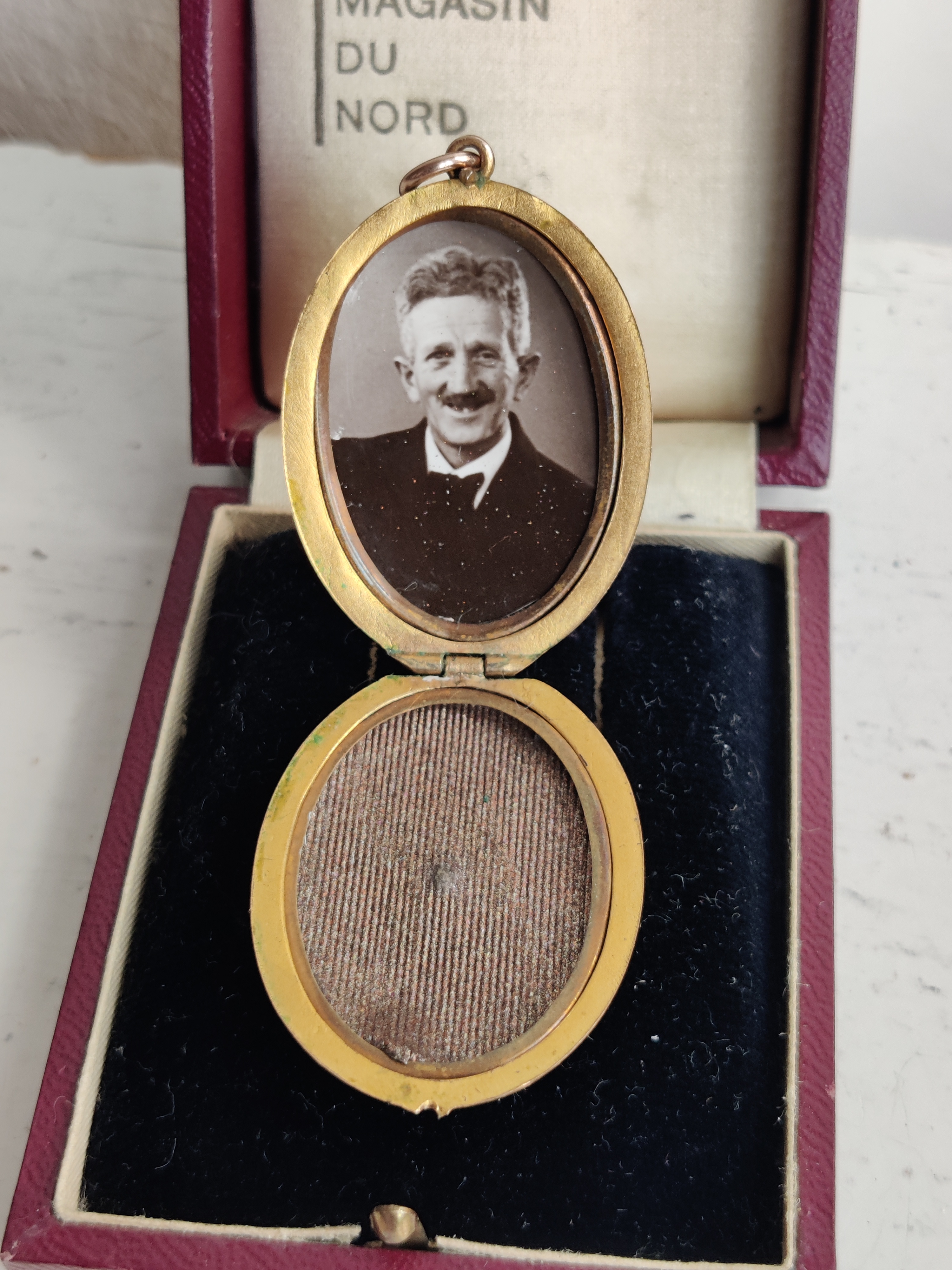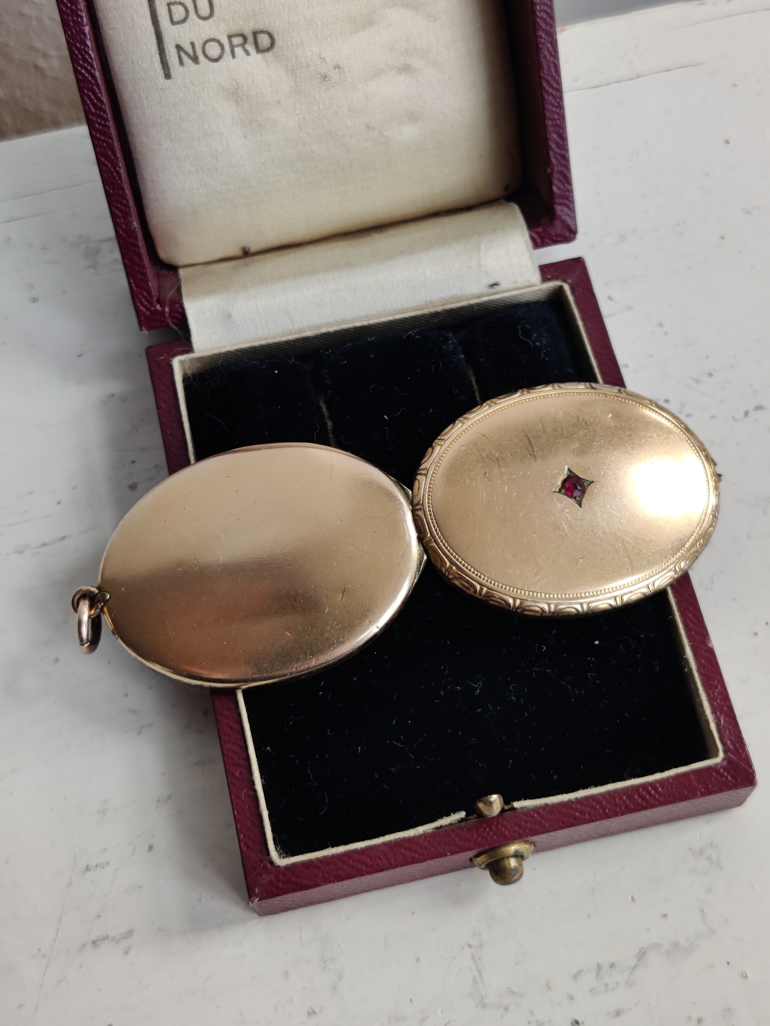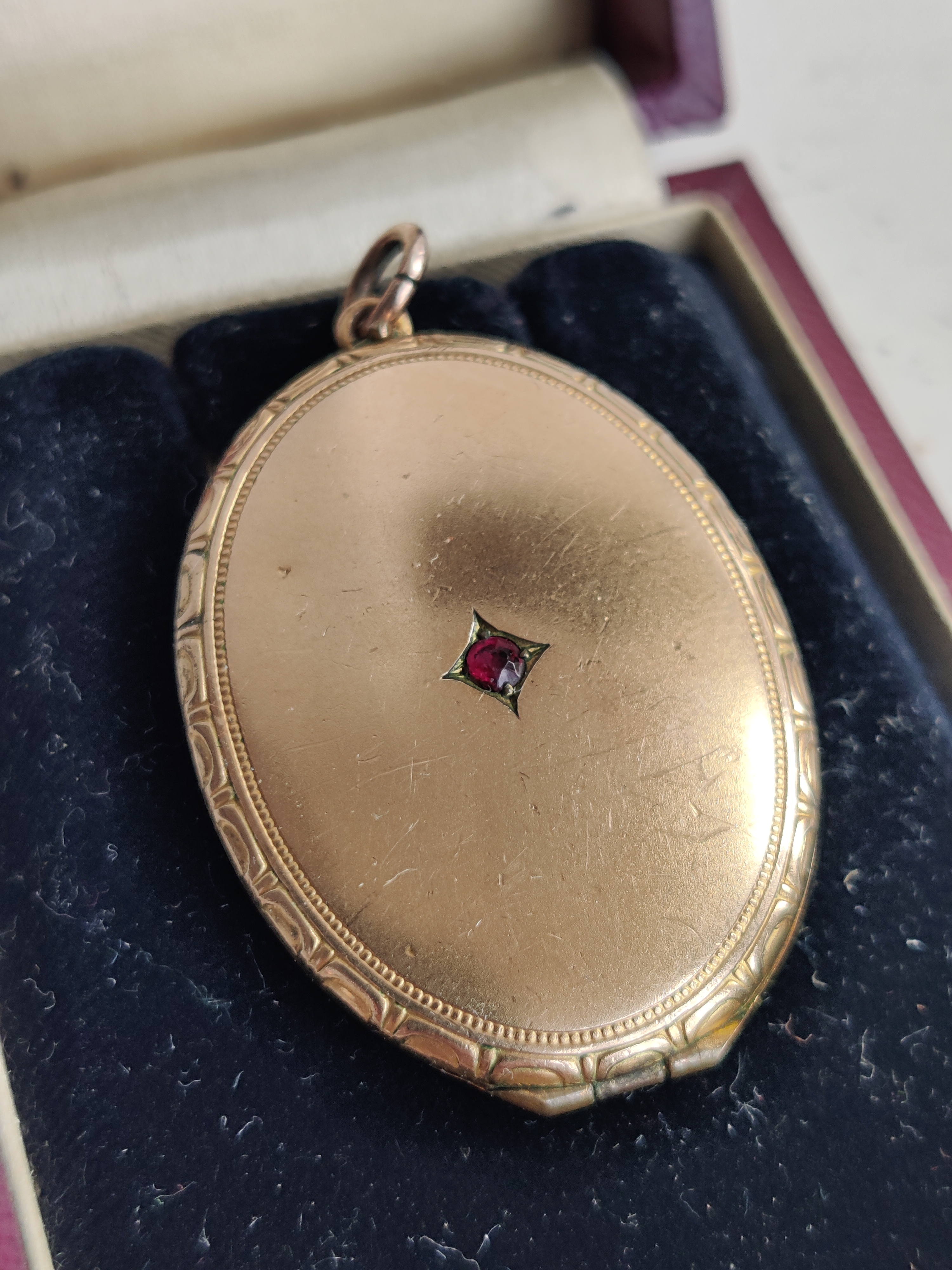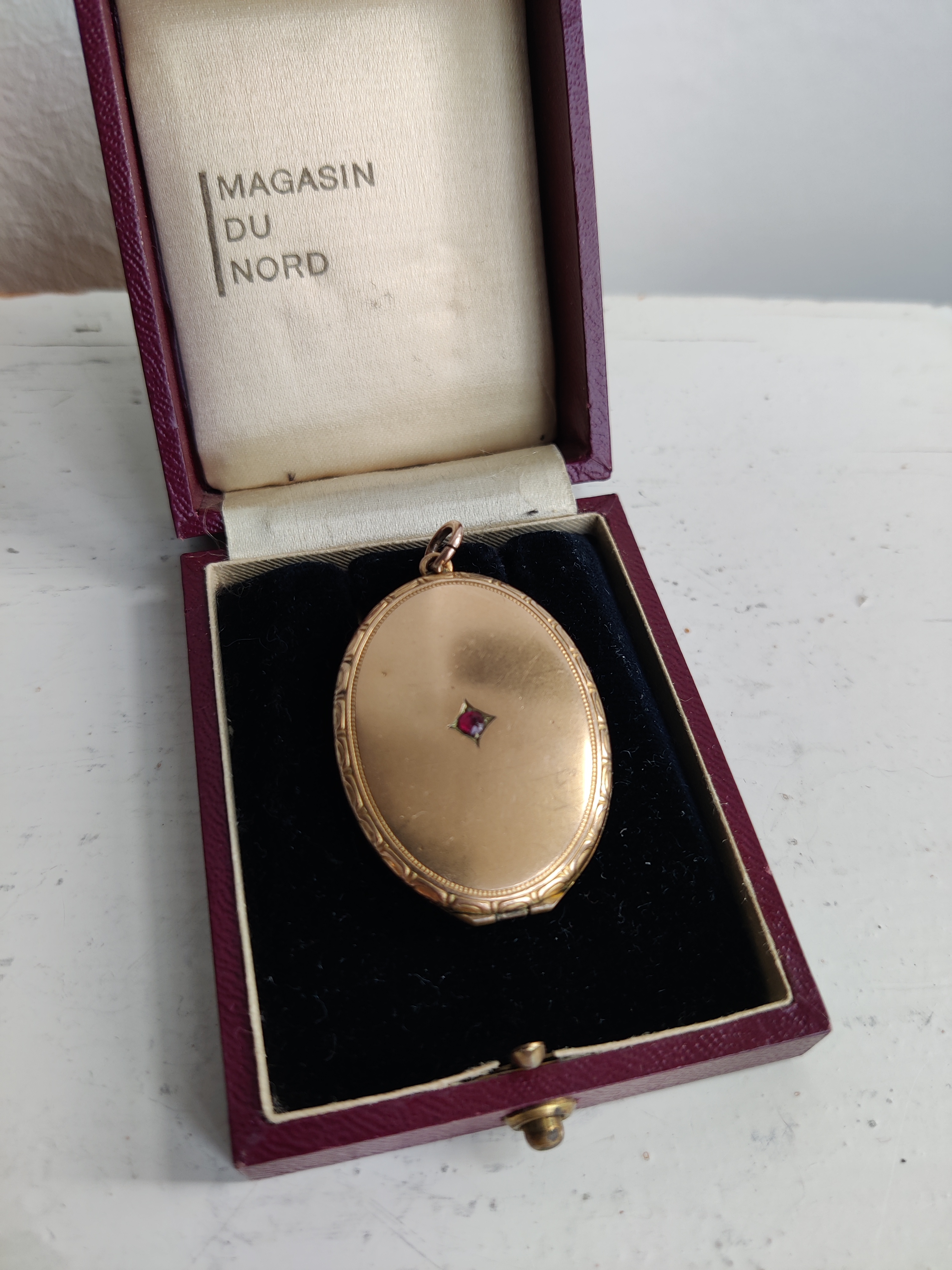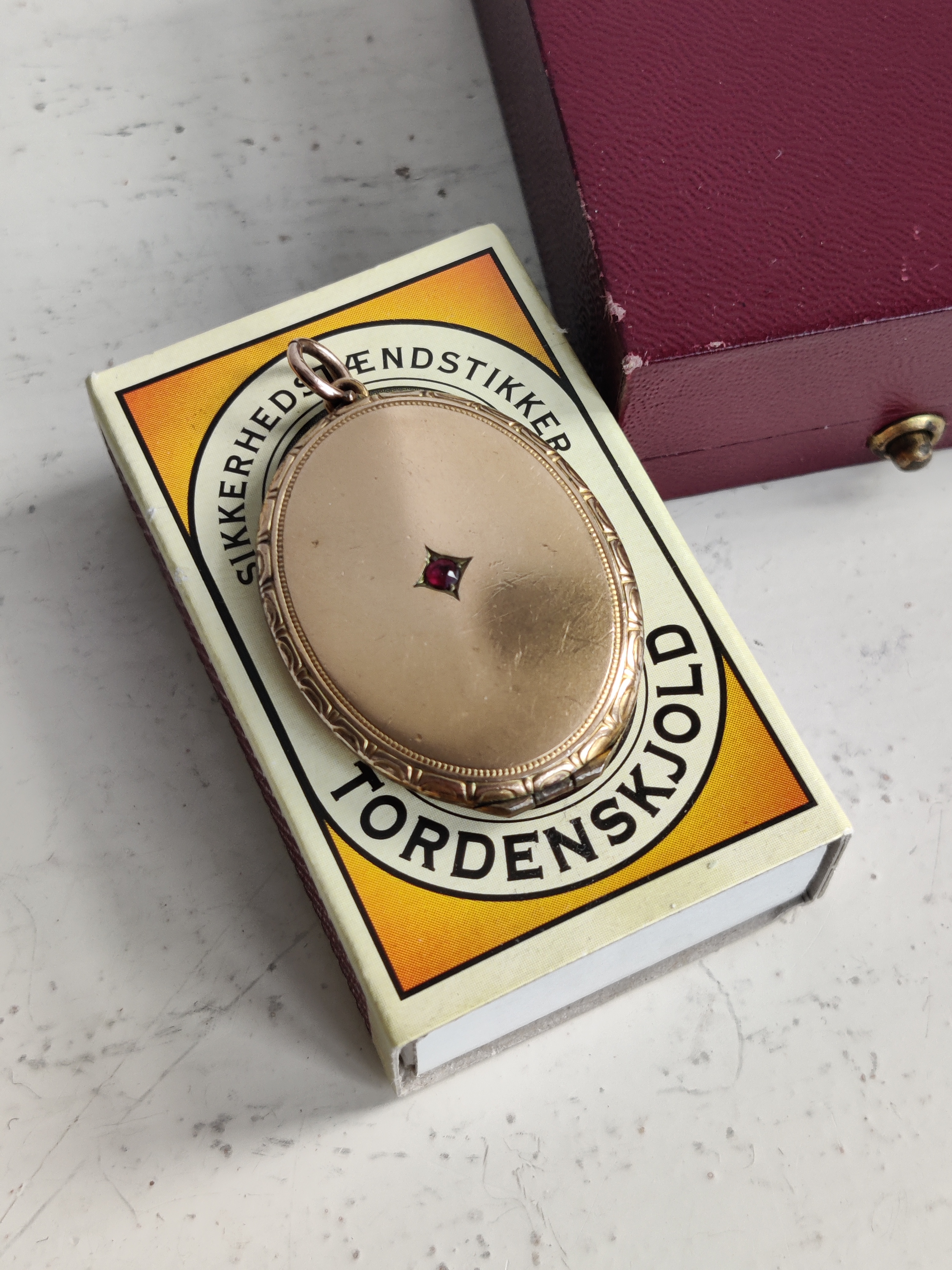 Smuk gammel gylden medaljon med en rød sten. Den er i meget flot stand og lige til at bruge til små fotos af dine nærmeste - hvad end du har to kærester, to børn eller to hunde. Den er næsten dobbelt så stor som de typiske gamle medaljoner - se billedet med tændstikæsken for ar få en fornemmelse. Mål 3,5 x 2,5 cm uden øsken.