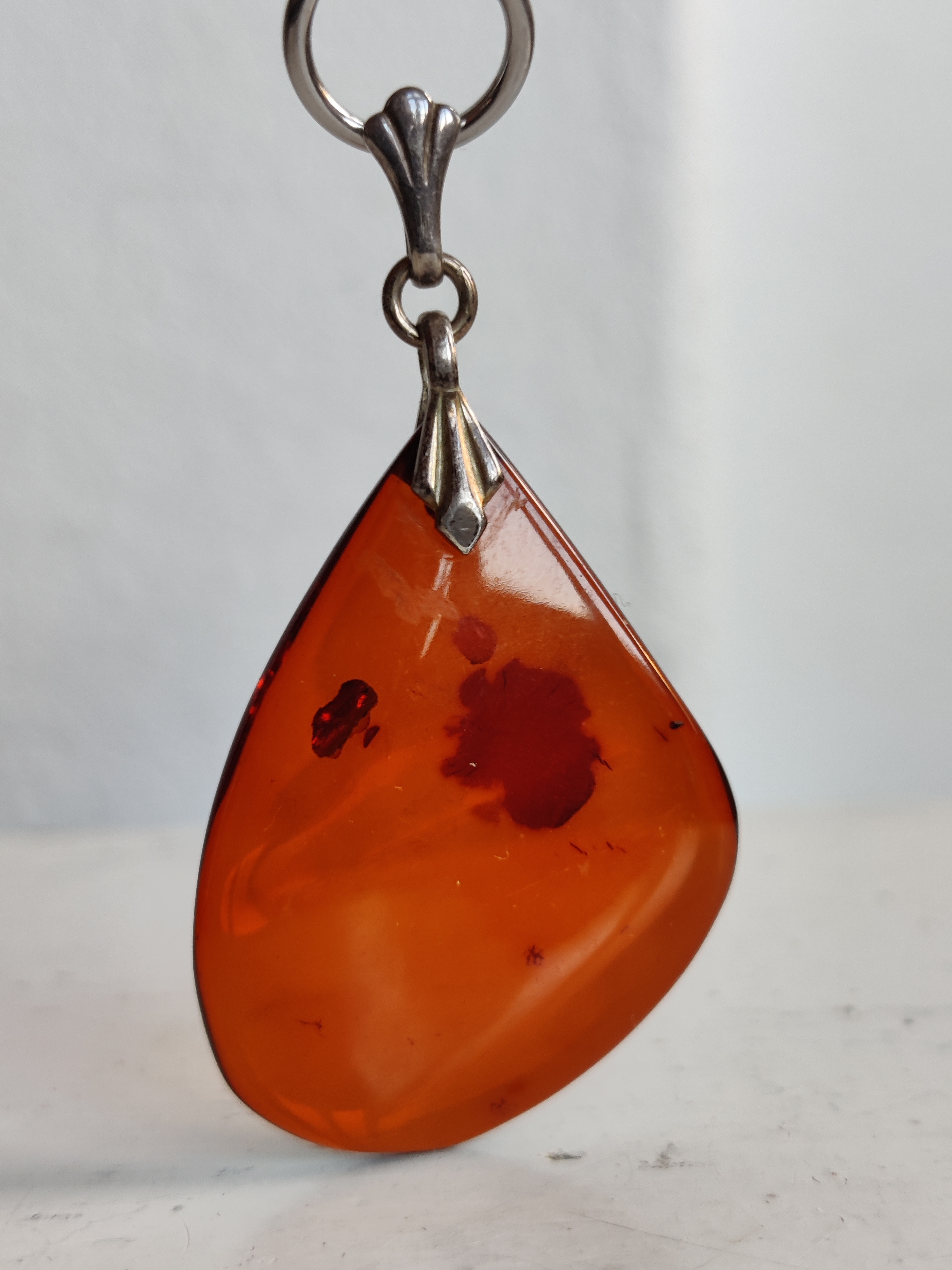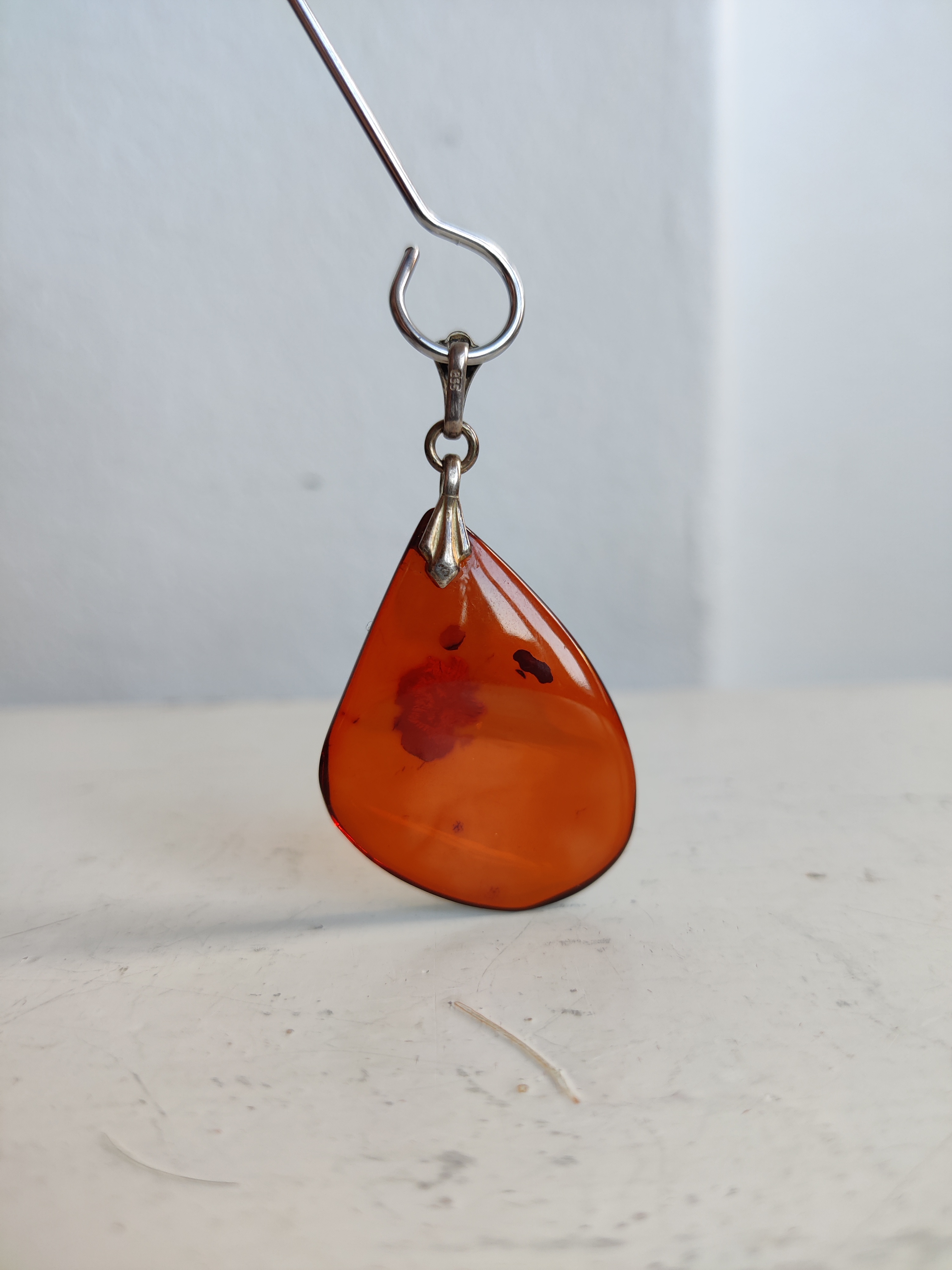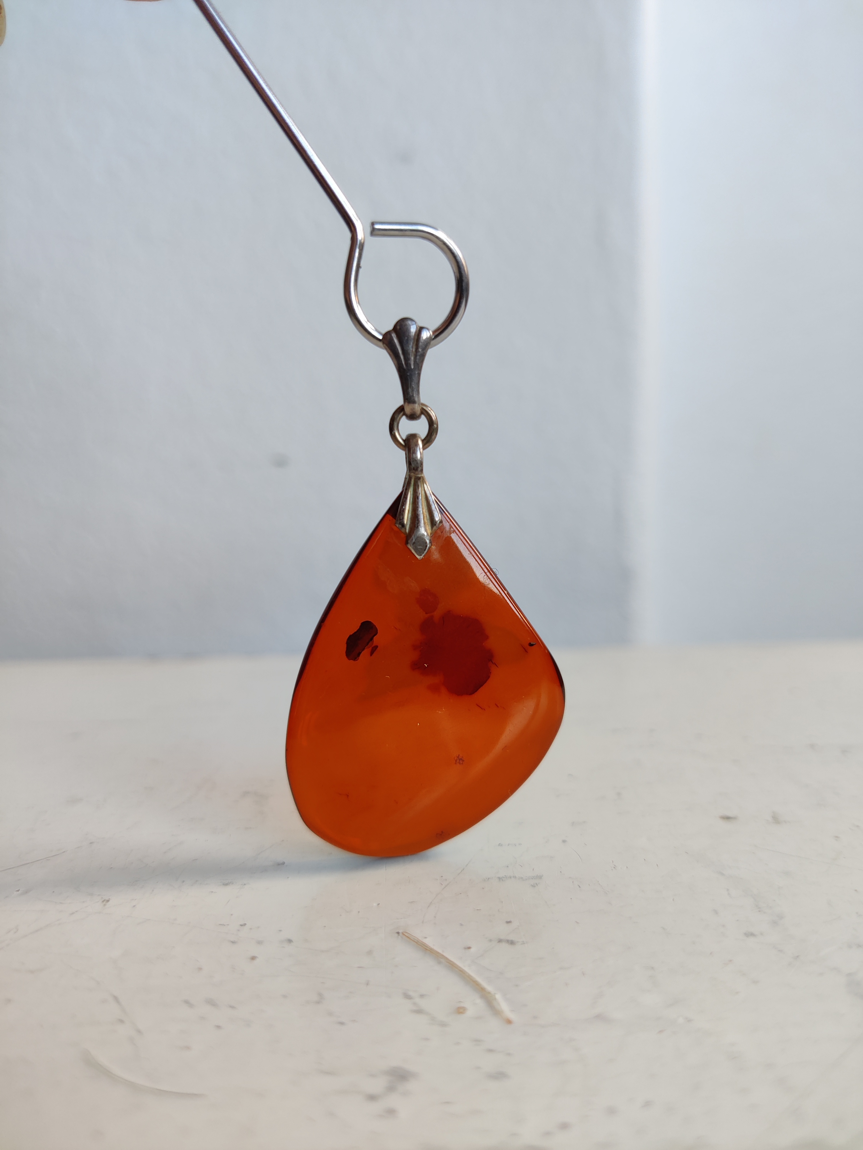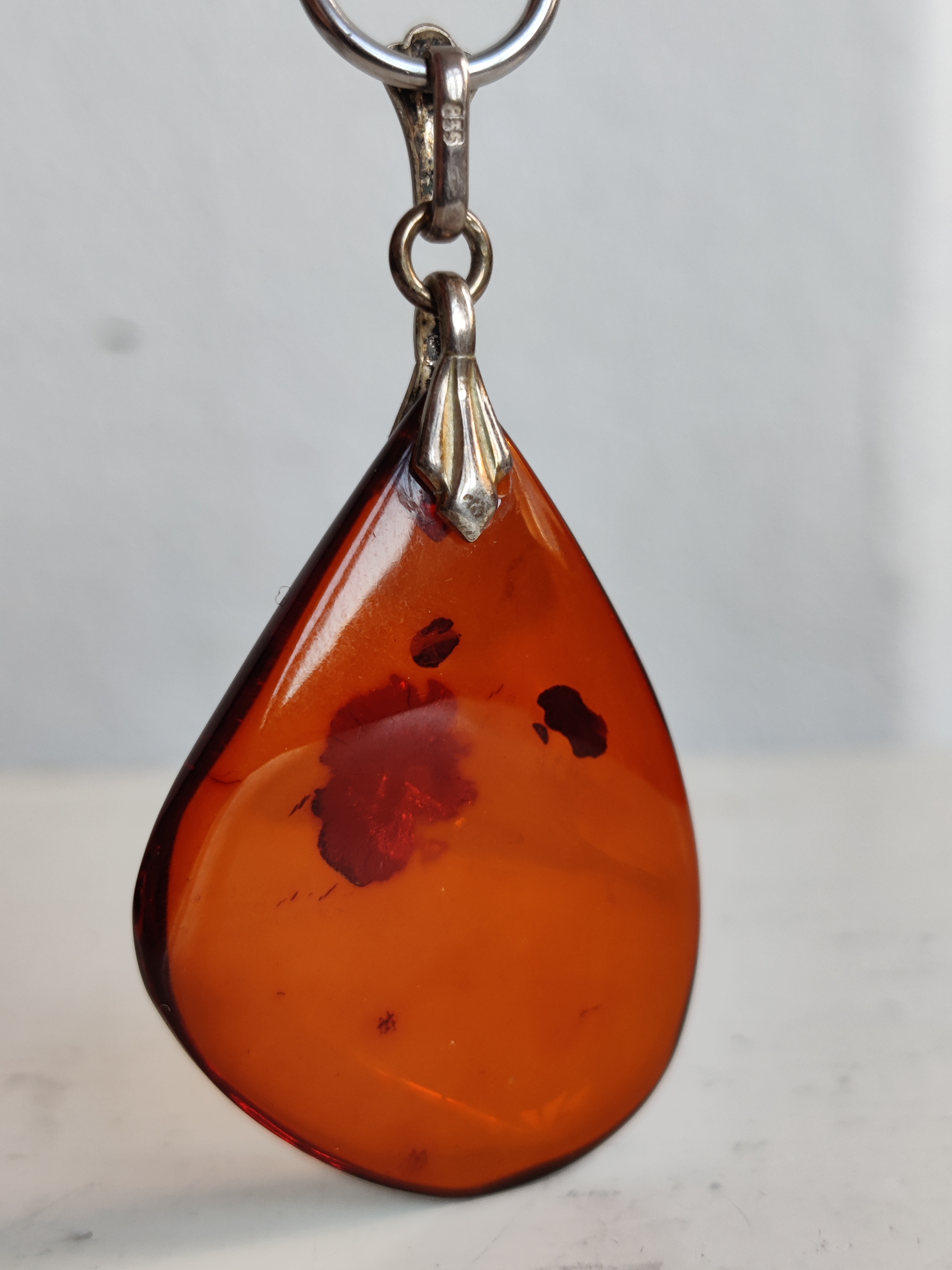 Fint poleret vedhæng af gyldent rav med små plantedele - og øsken af sølv. Meget delikat. Mål 4 x 2,5 cm uden øsken.