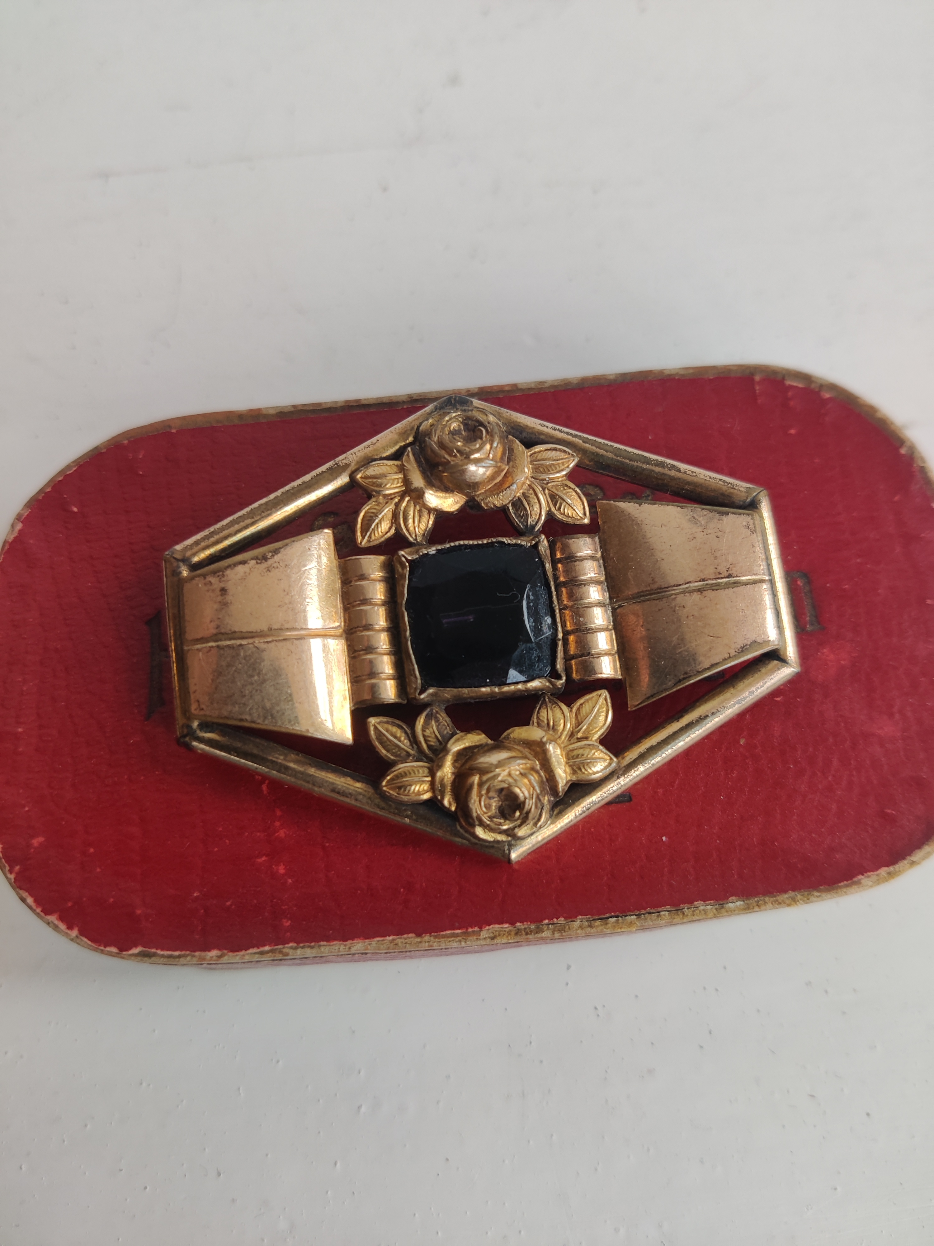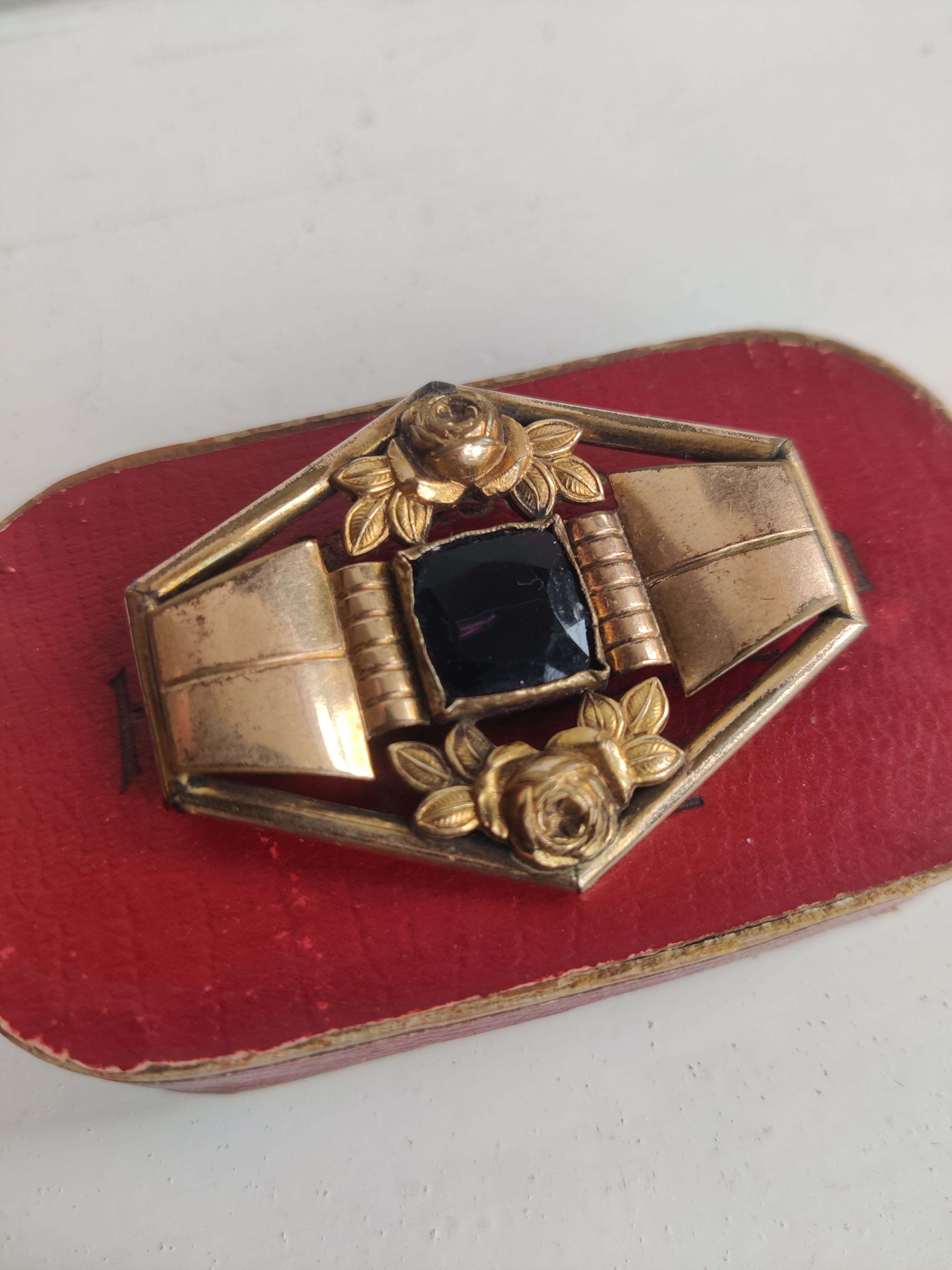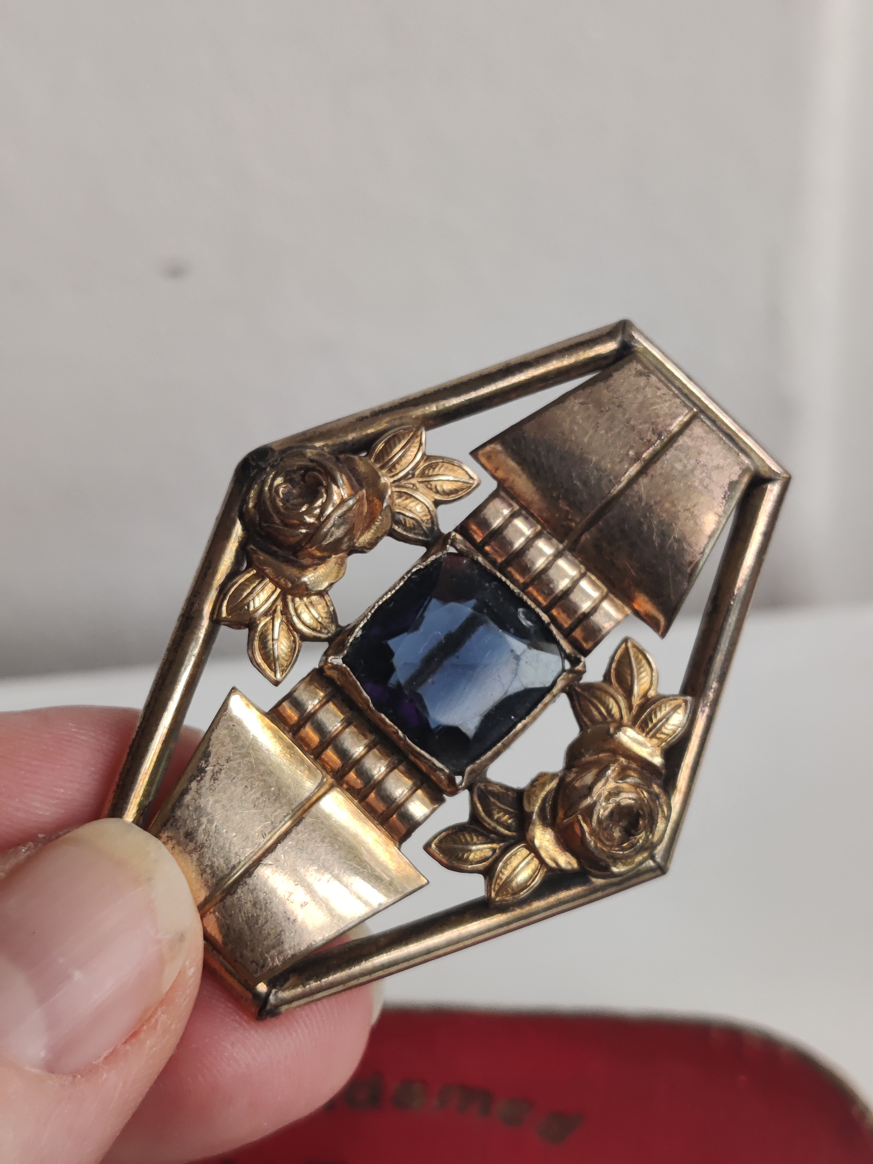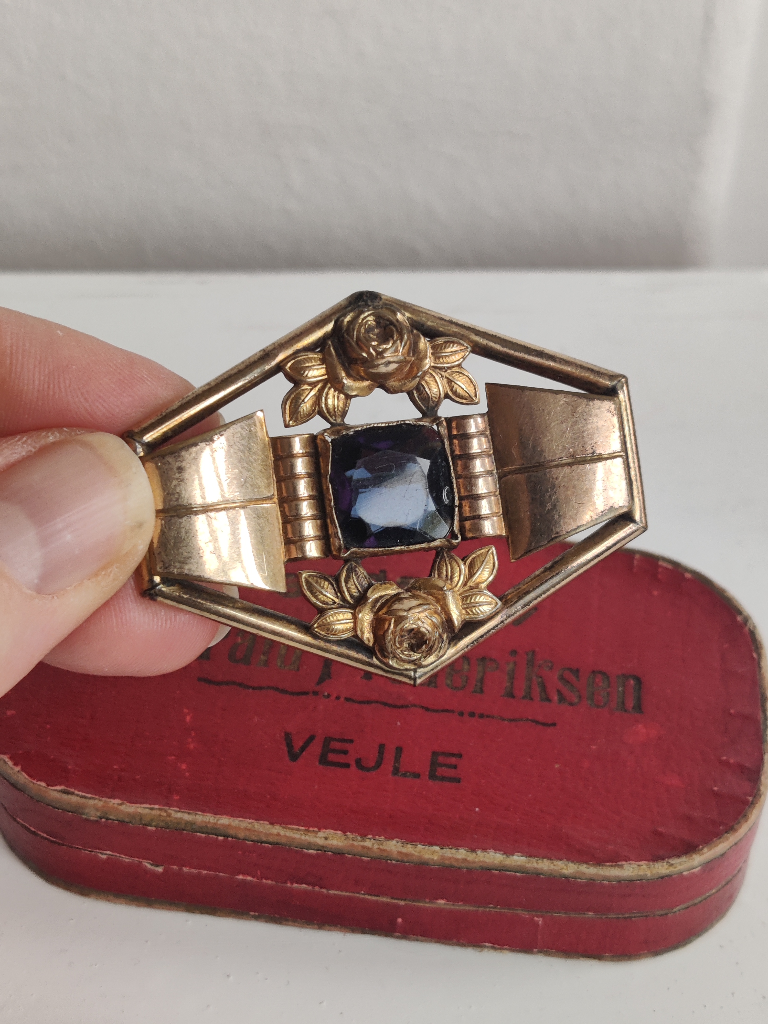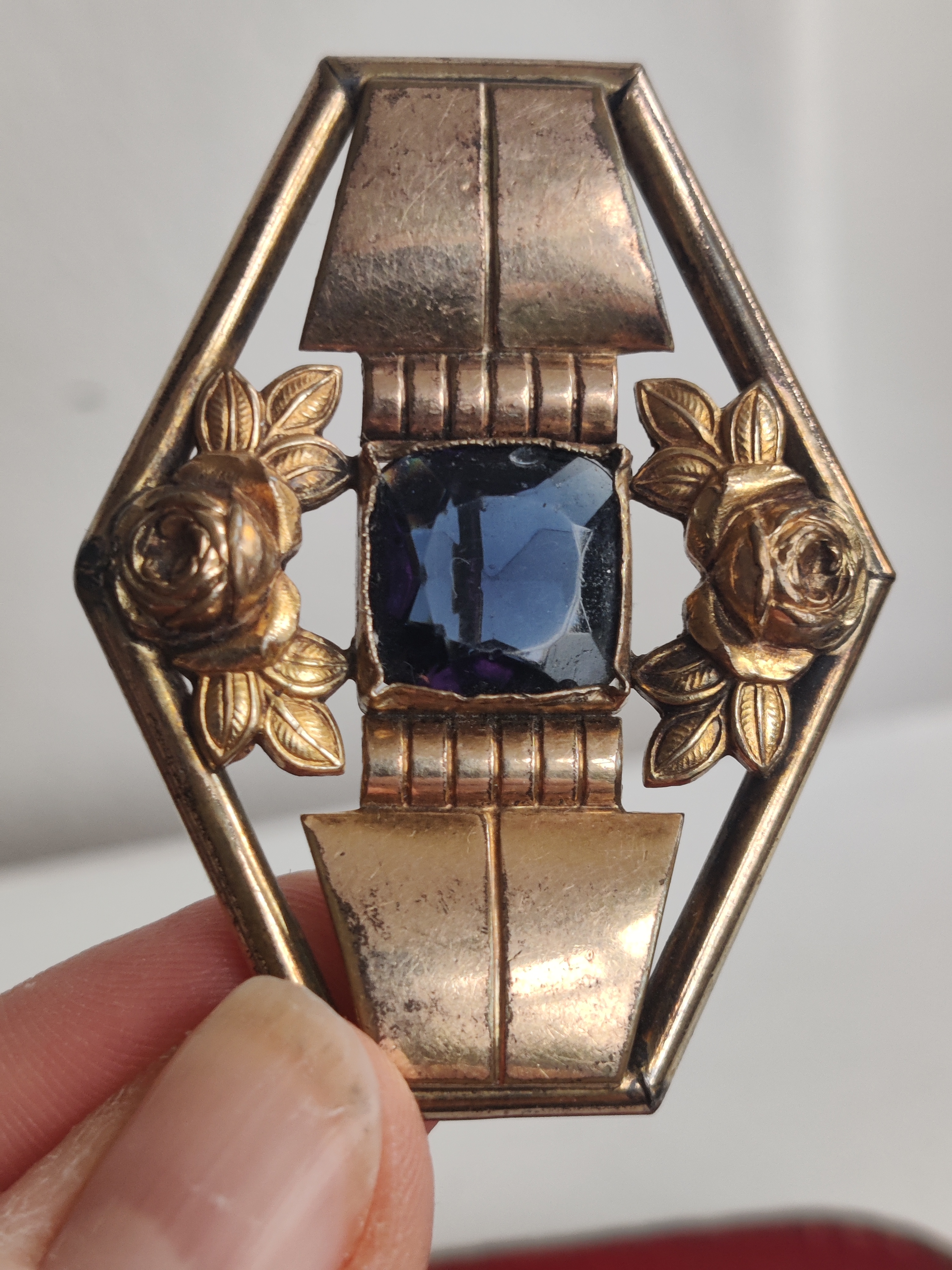 Stor og ekstravagant antik broche med roser og blåt glas i midten. Den er fransk og har siddet midt i kraven på en velklædt mademoiselle omkring år 1900. Mål 5 x 4 cm.