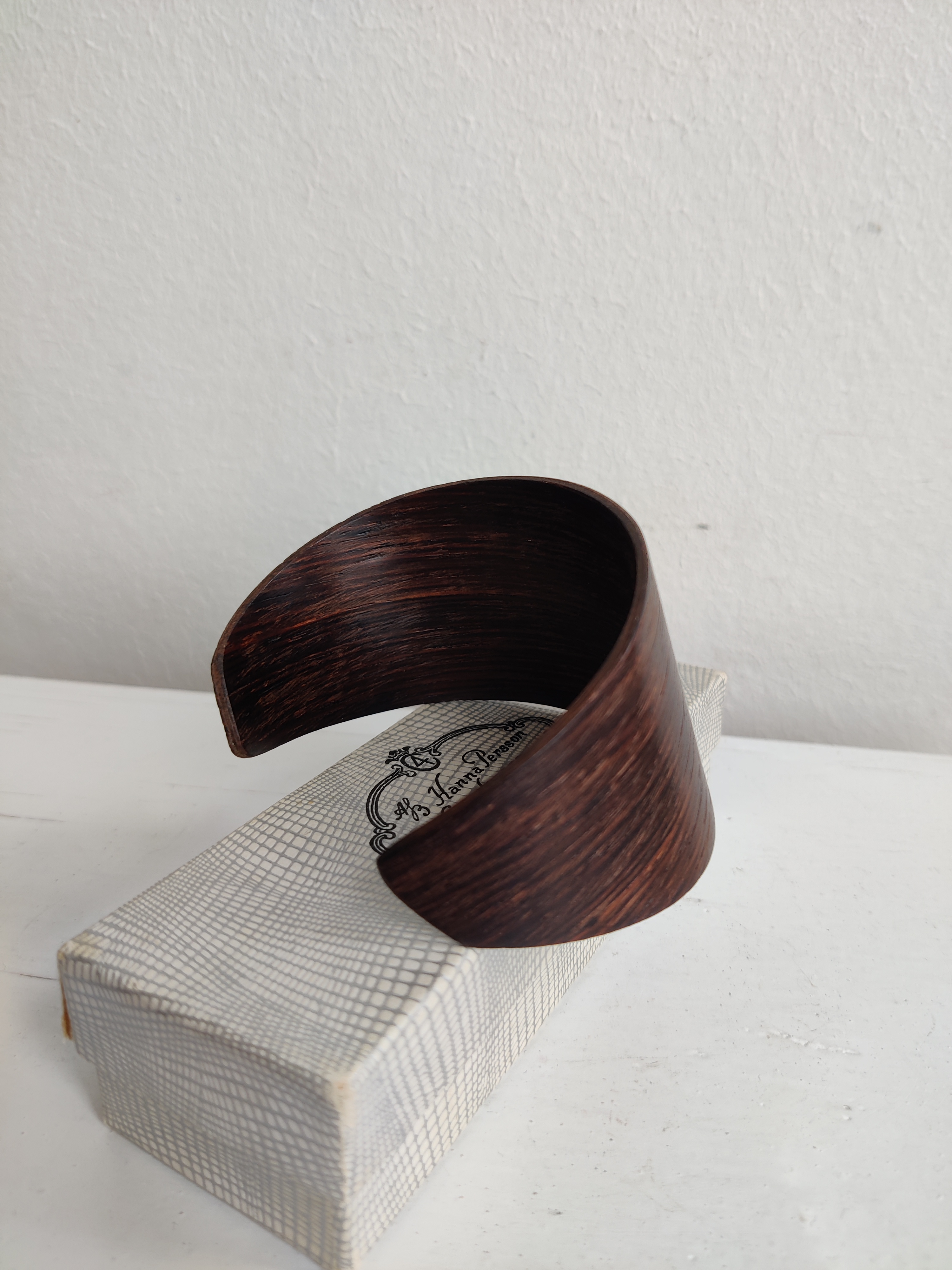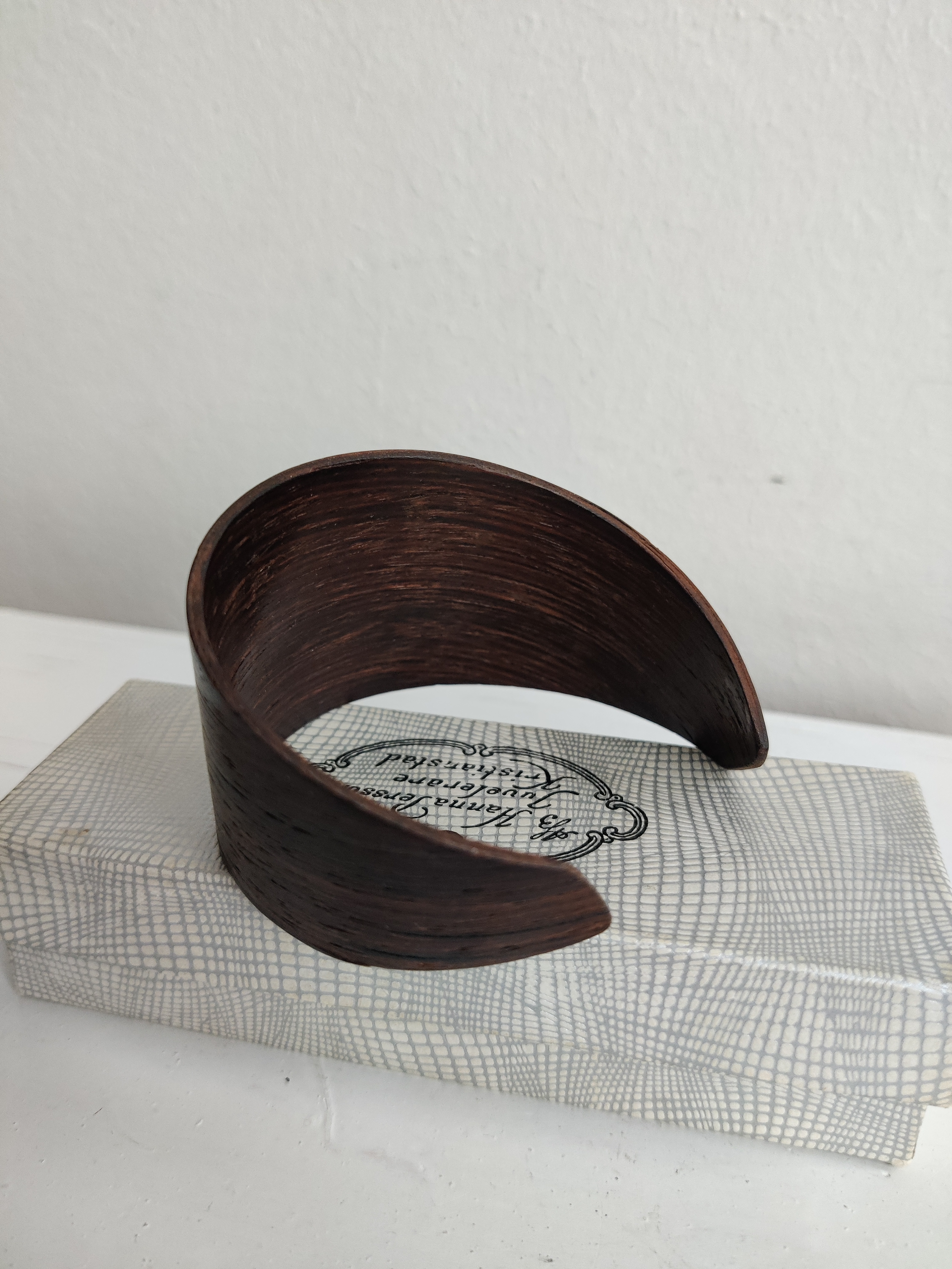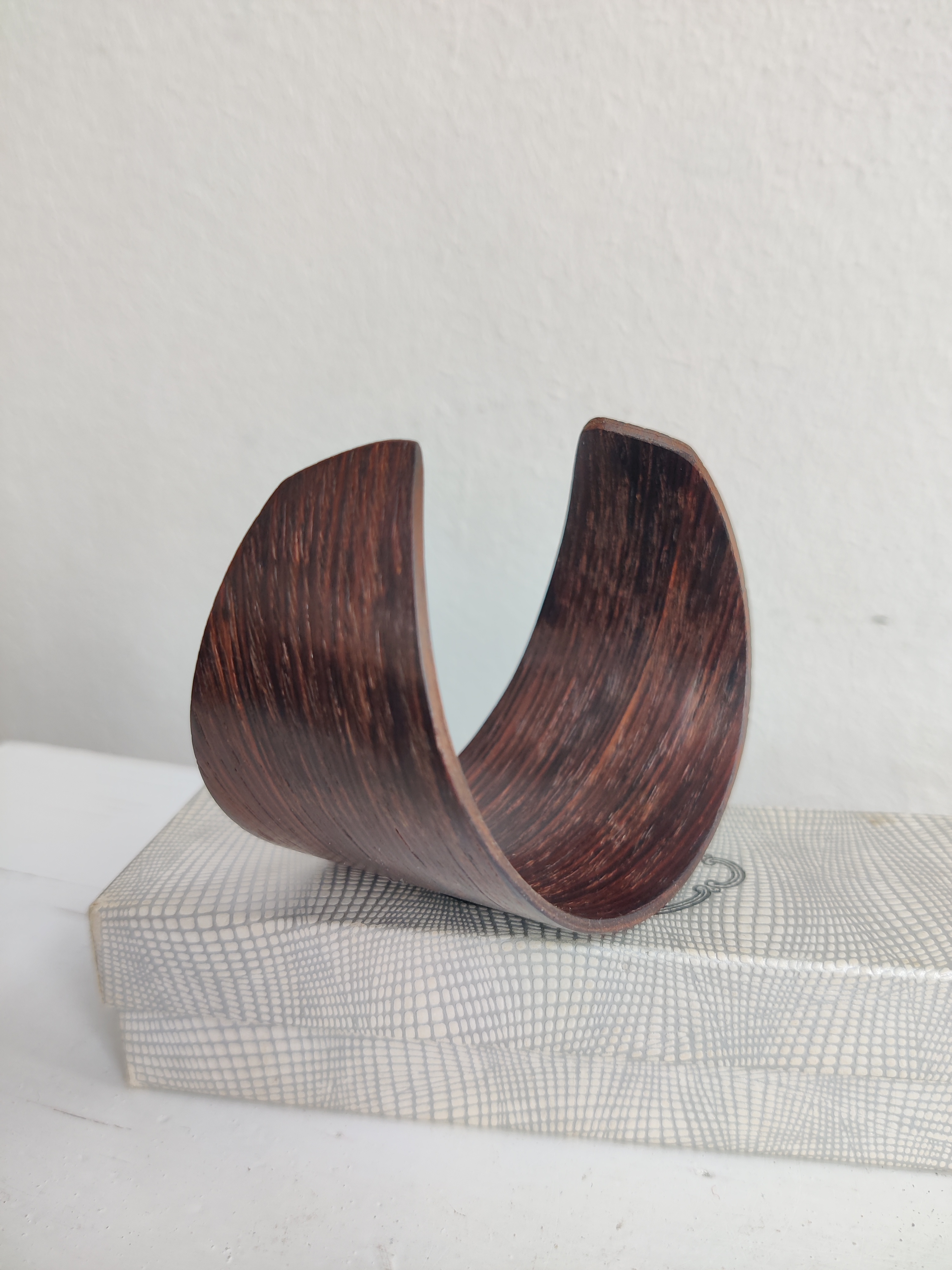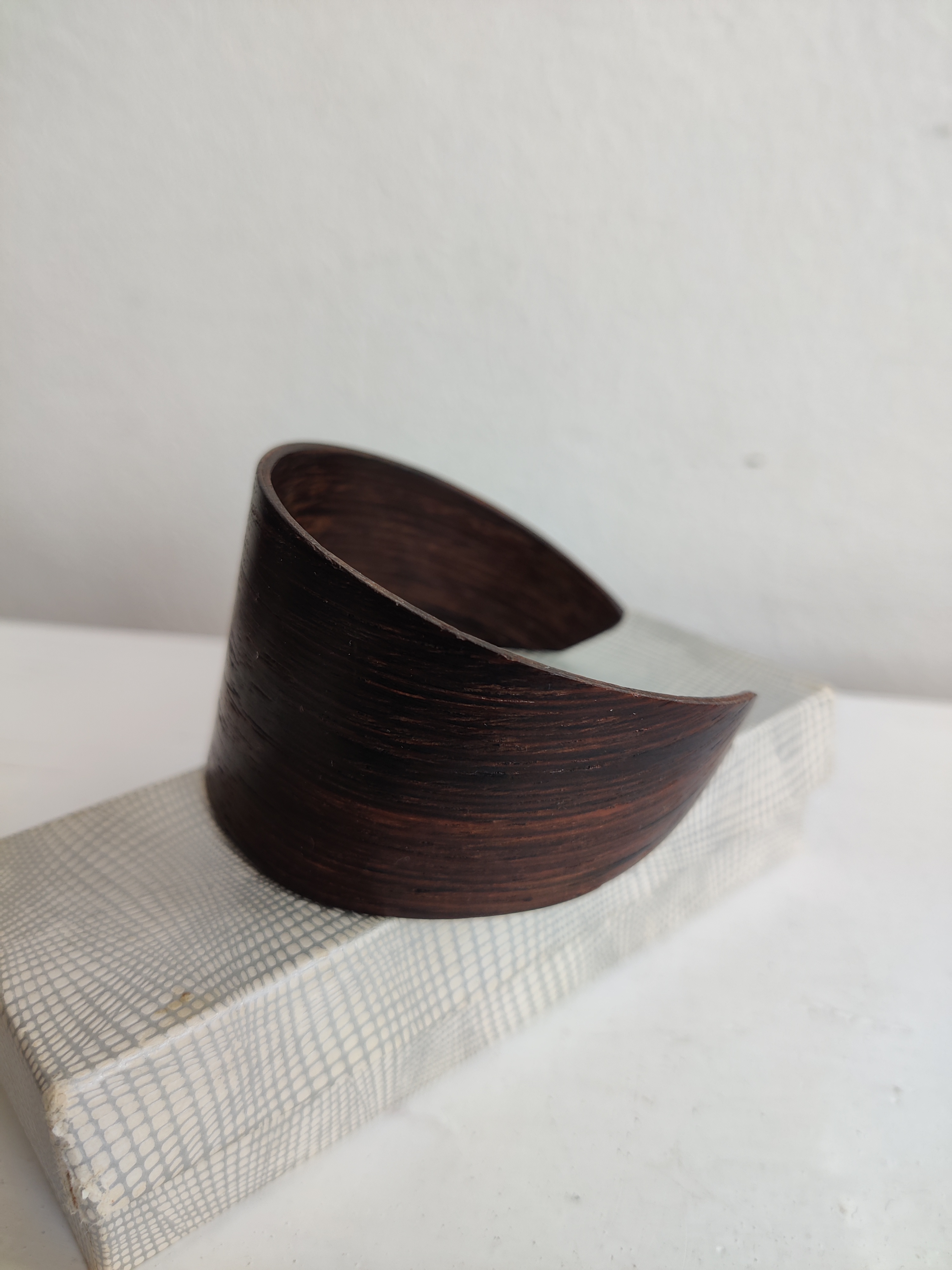 Modernistisk vintage armbånd af mørkt træ. Asymmetrisk og åbent i formen. Det er meget let og nemt at bære for mange forskellige størrelser. Bredde 4,5 cm.