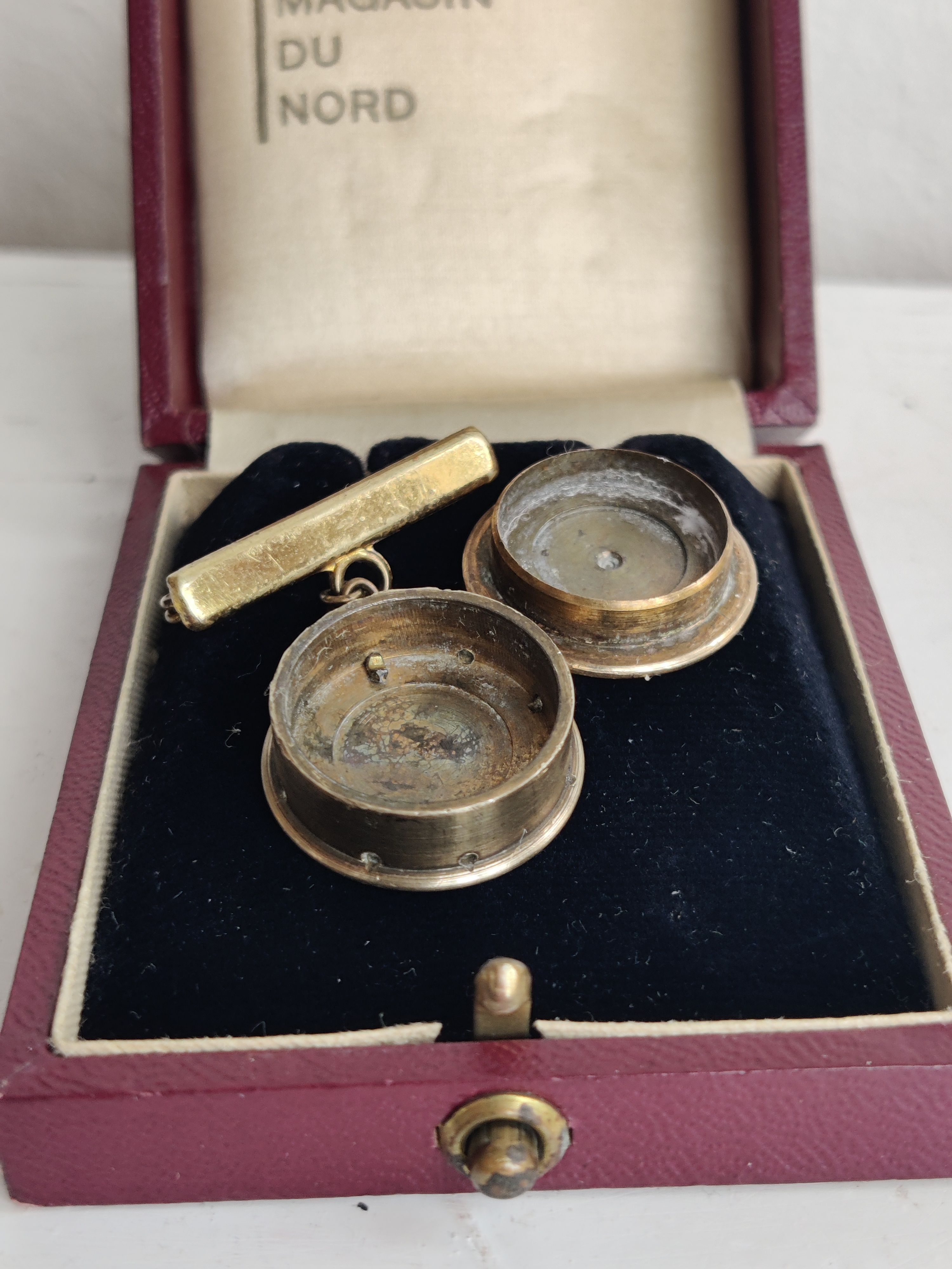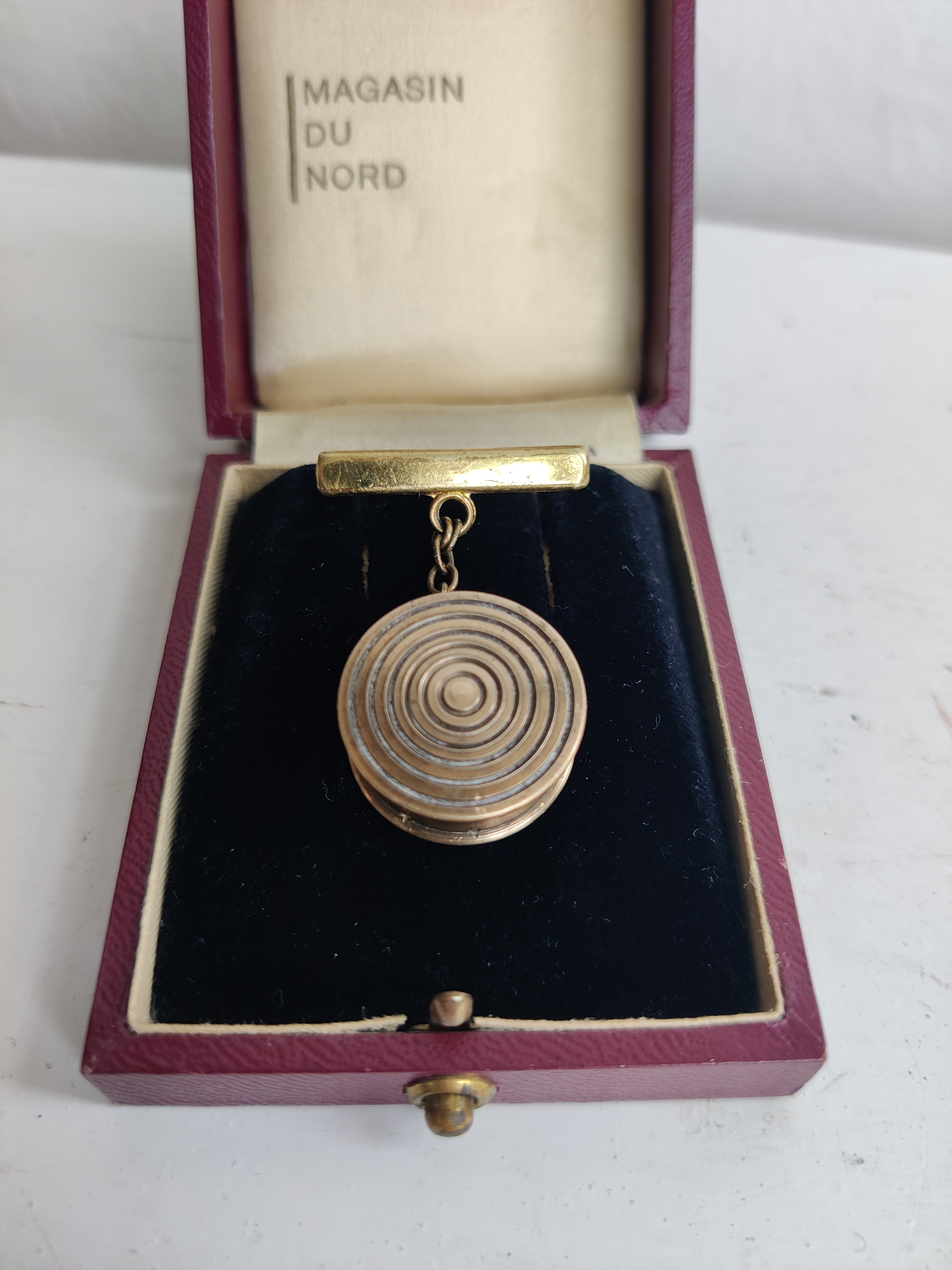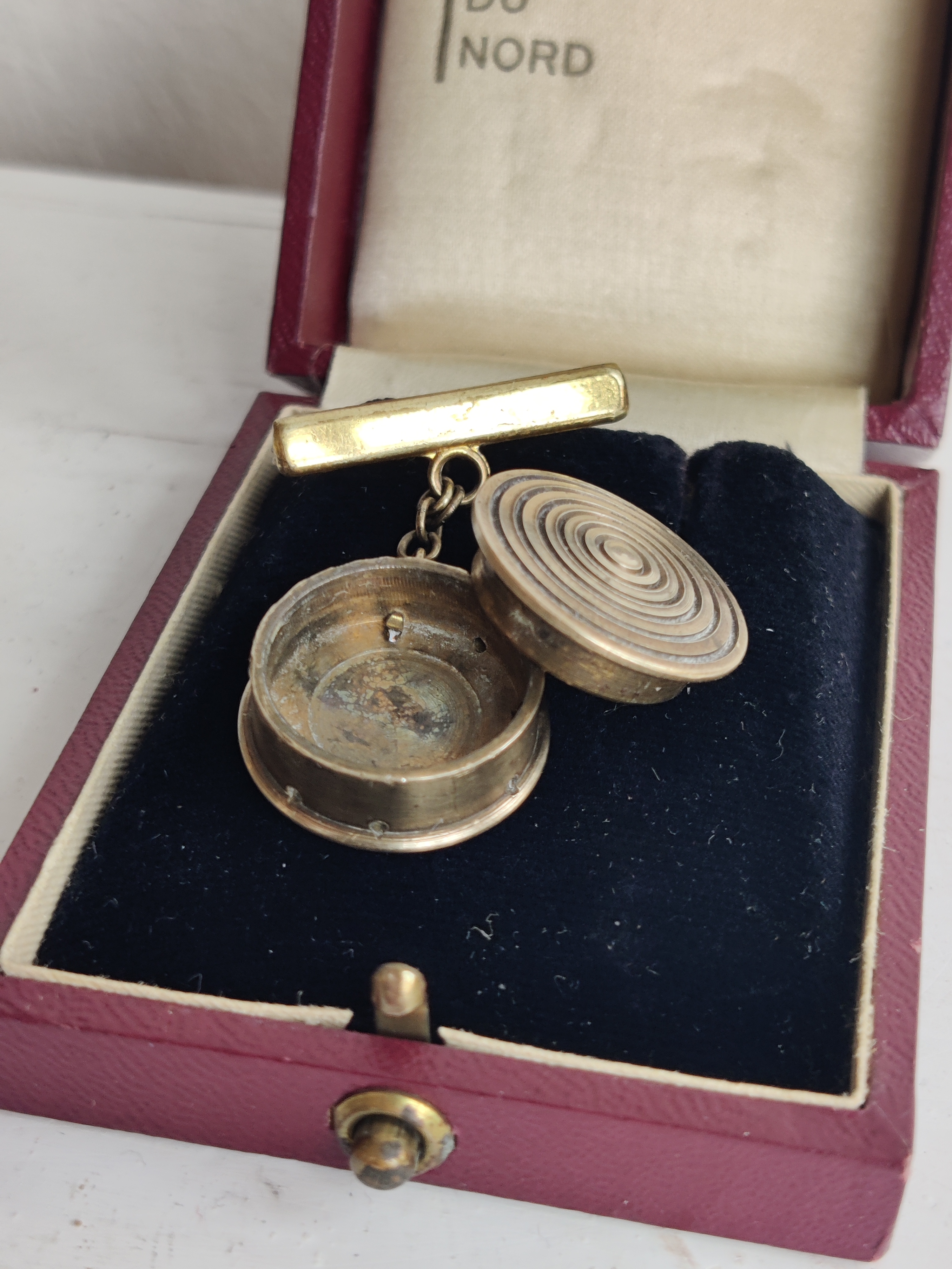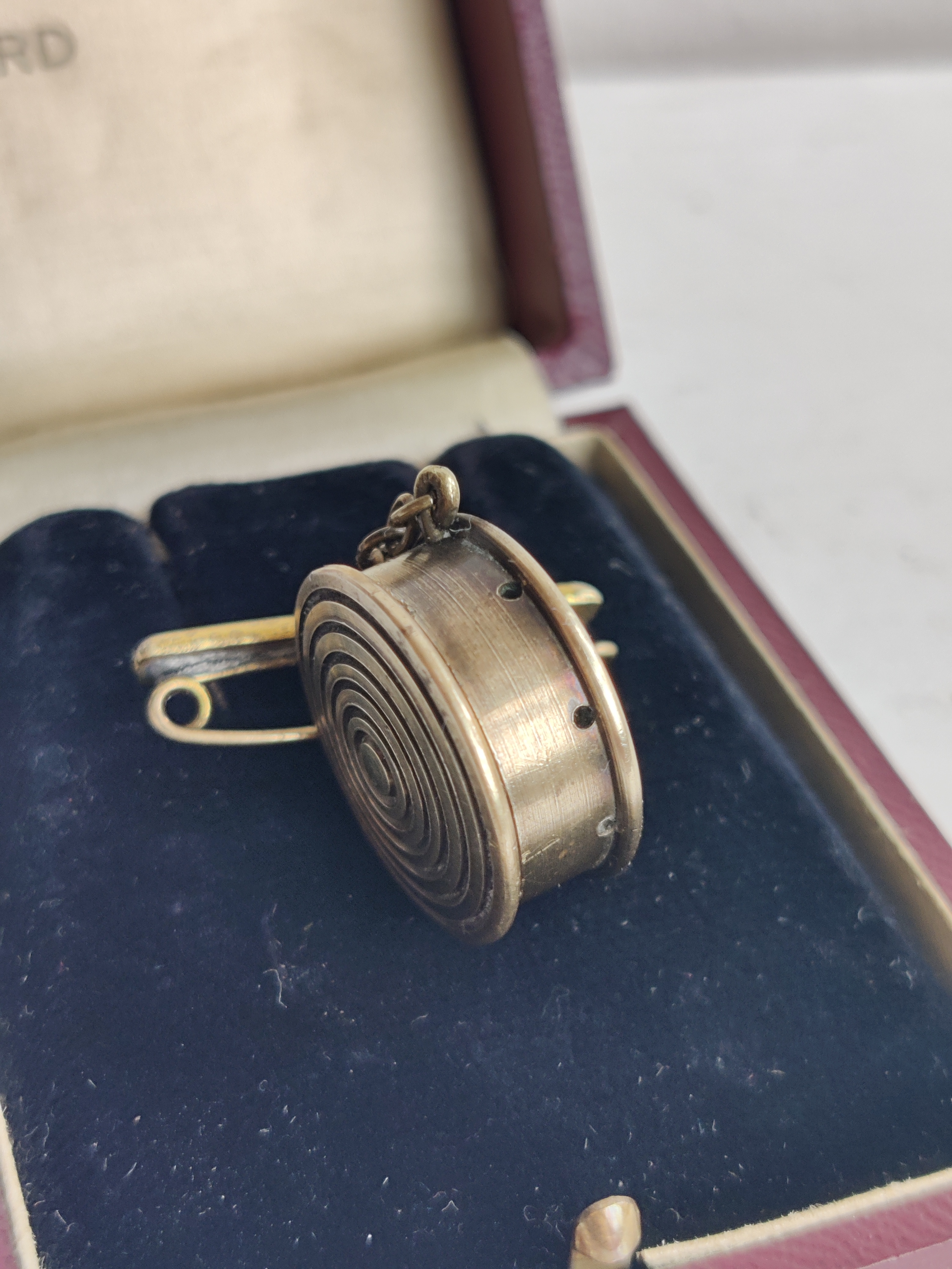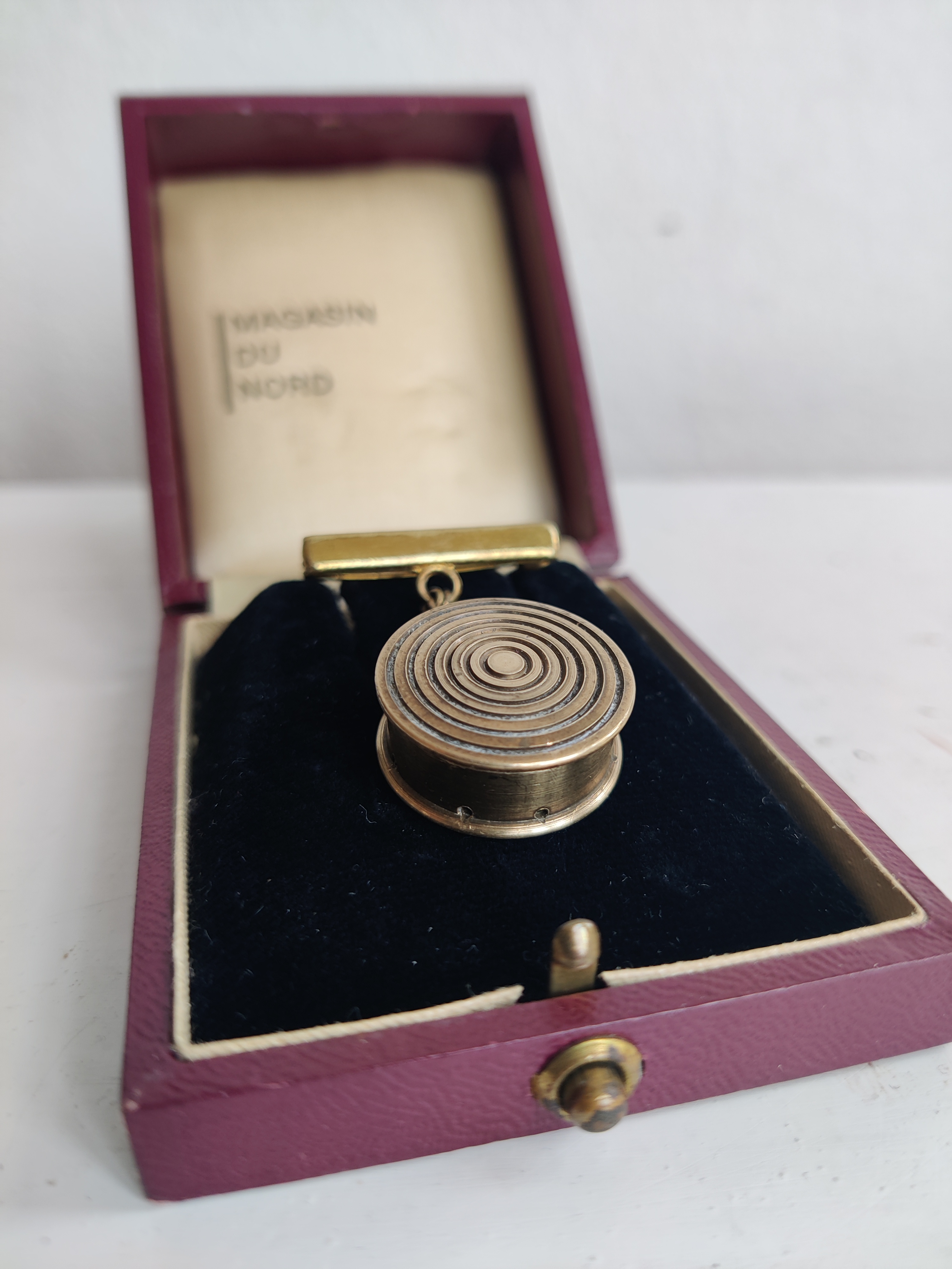 Fineste parfumebroche fra 1940-1950, som kan åbnes og rumme et lille stykke vat dryppet med din yndlingsparfume. Duftsmykker som dette kendes langt tilbage i tiden - de kunne fx bruges, når man ikke ville have parfume på huden eller sit fine tøj, eller når man bare gerne ville strække duften længere. Og det gælder jo sådan set endnu. Brochen er lavet af messing og selve rummet måler 2 x 2 cm, inkl. kæde og barre er den 3,5 cm.