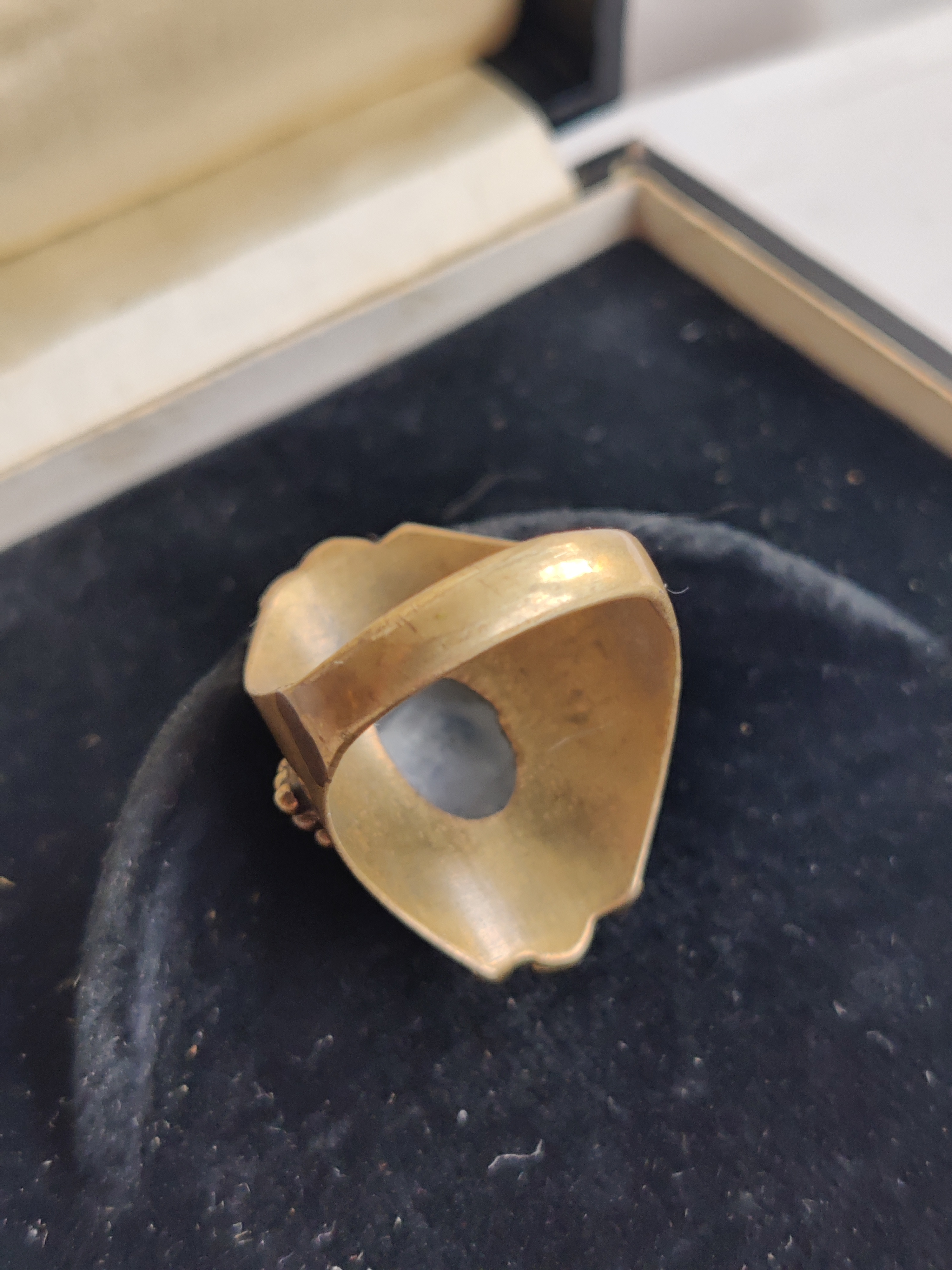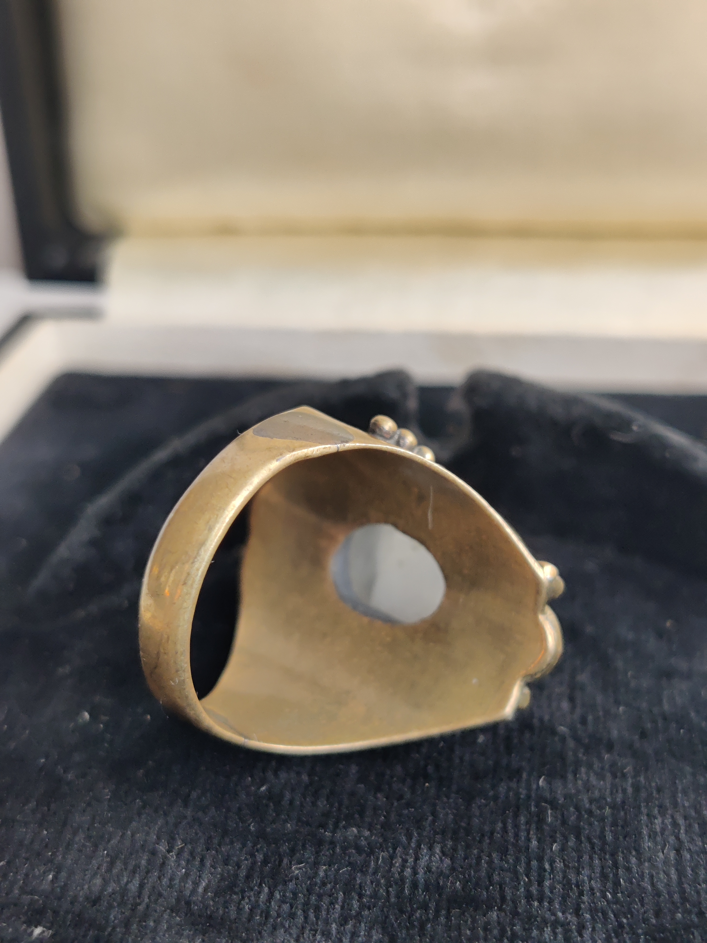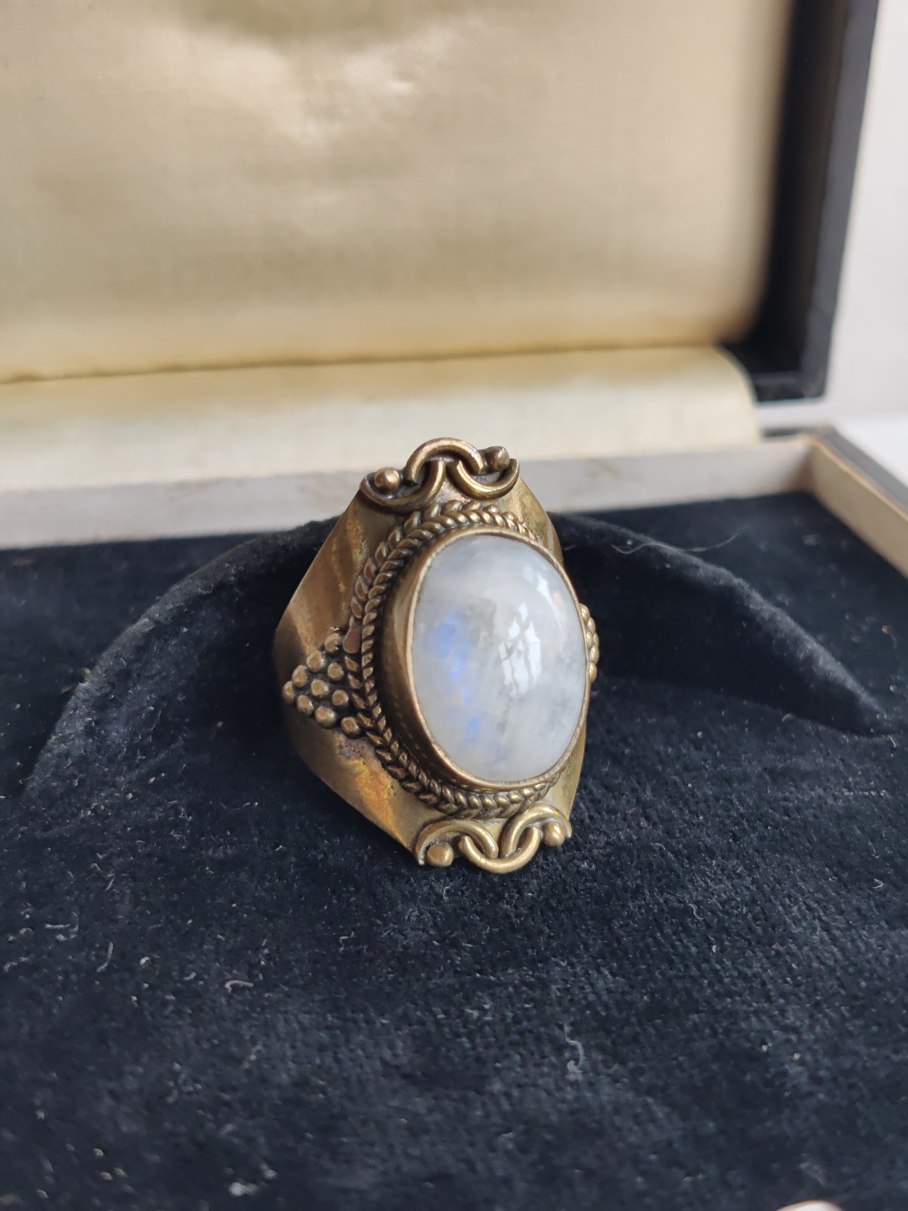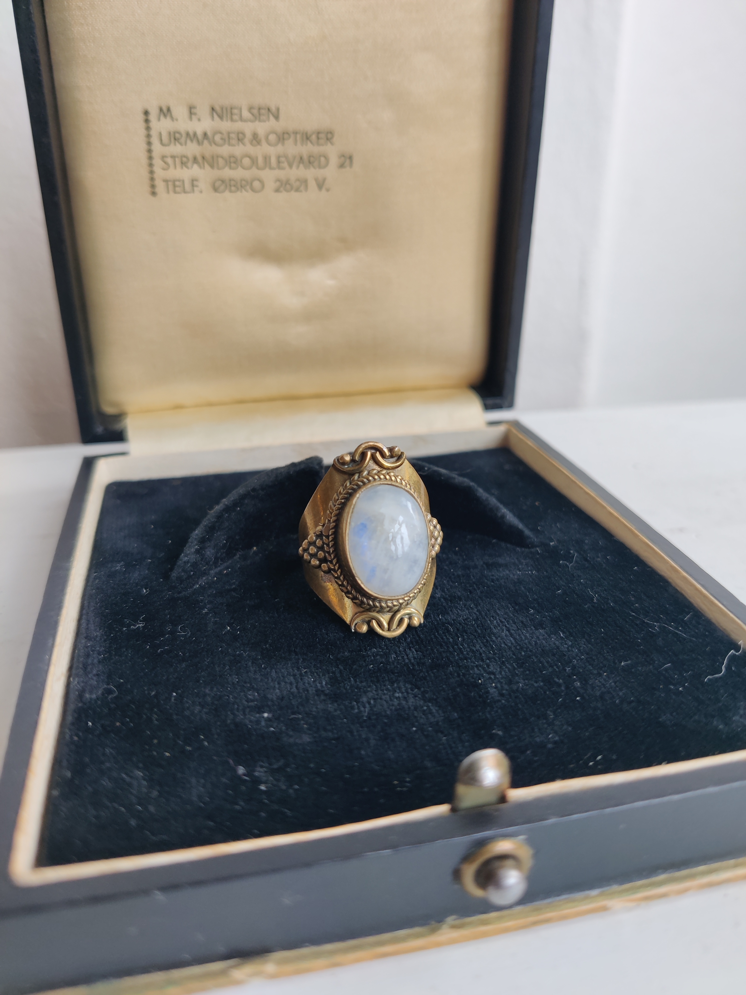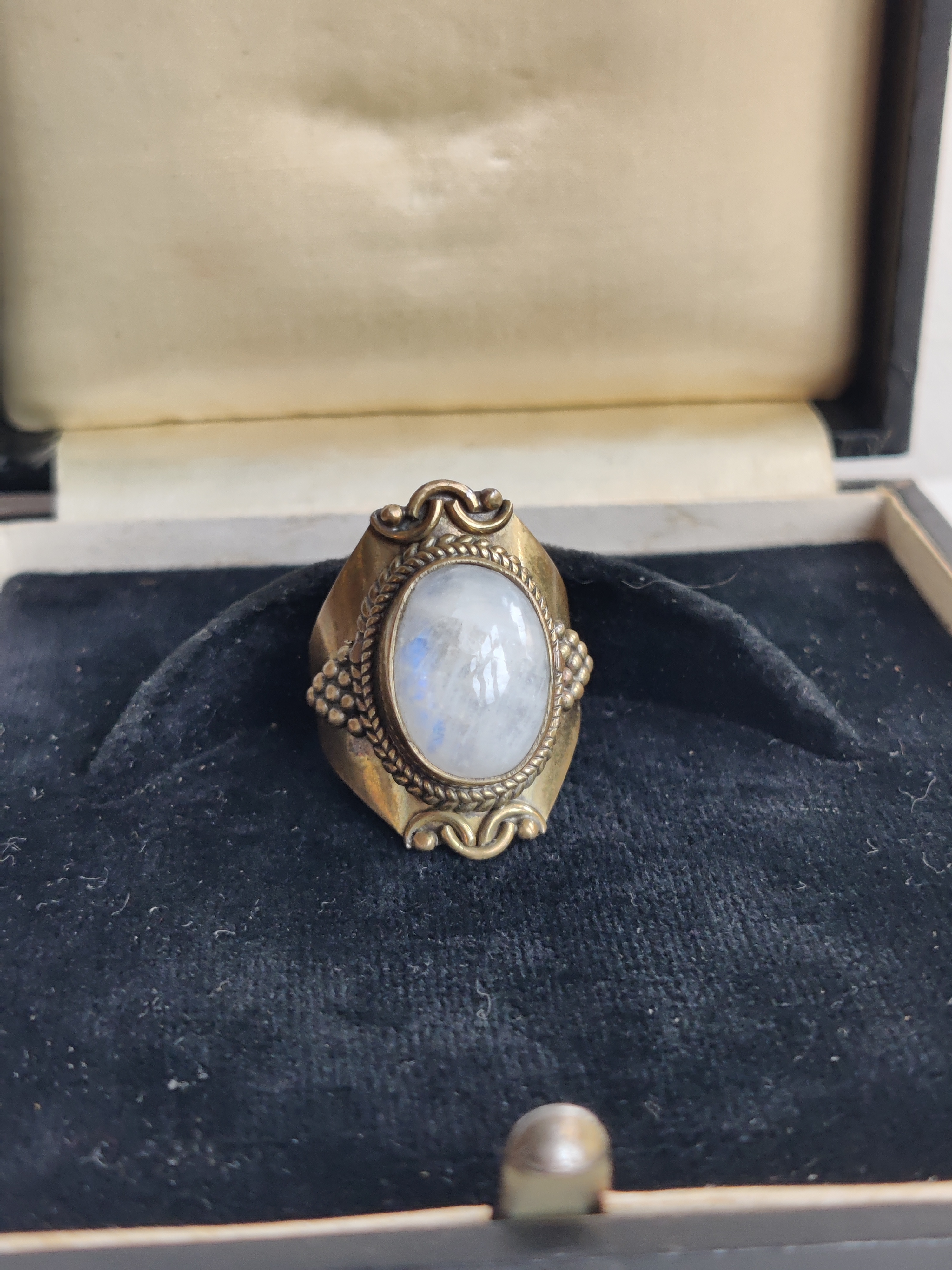 Meget smuk ring af messing med en cabochon af månesten, der har et fantastisk blåt skær i sig. Den er str. 54.